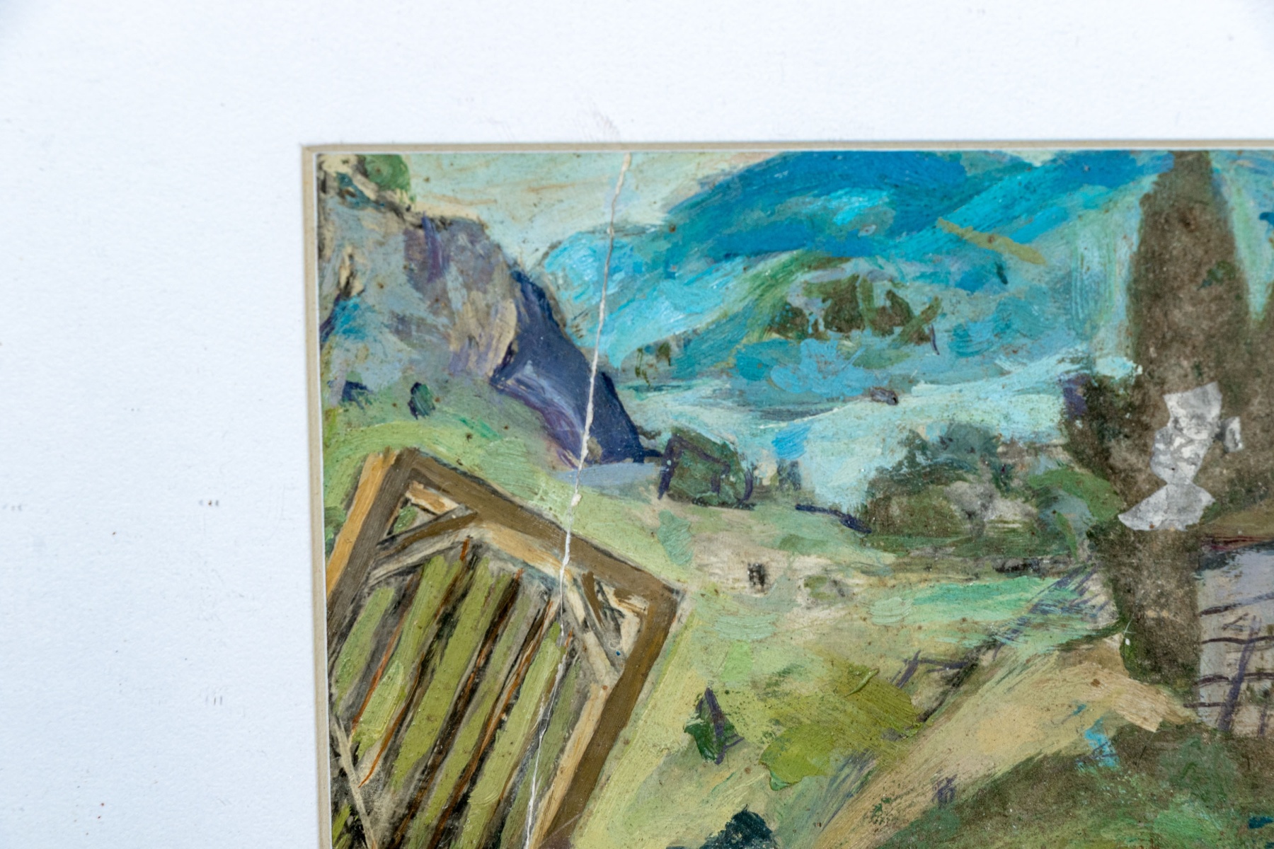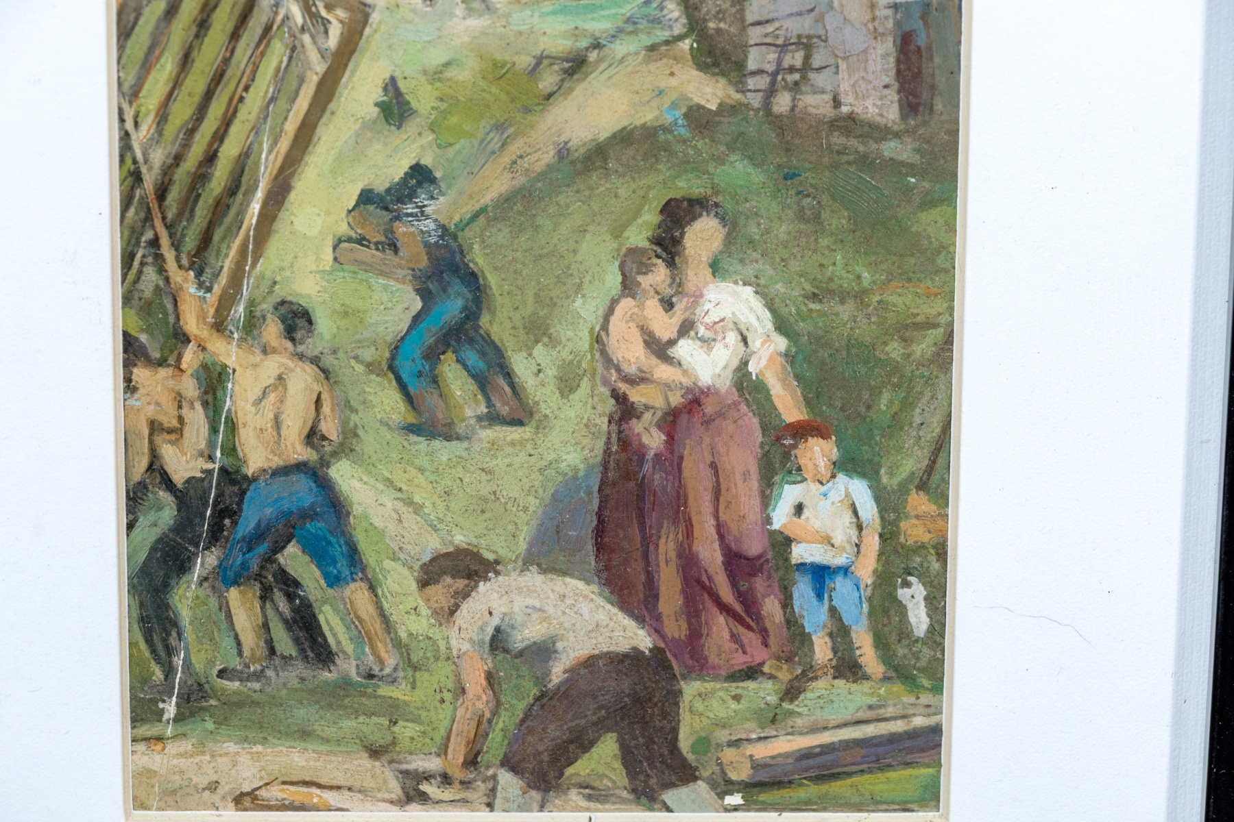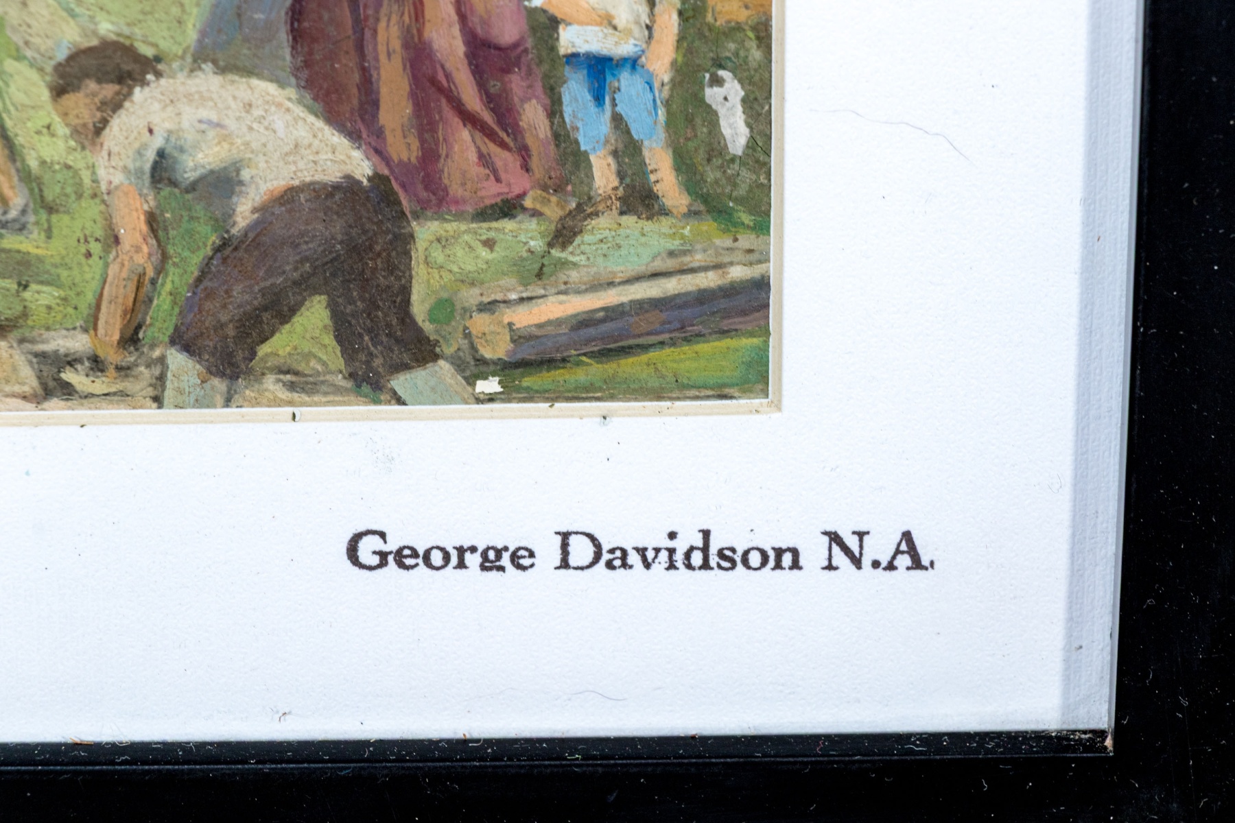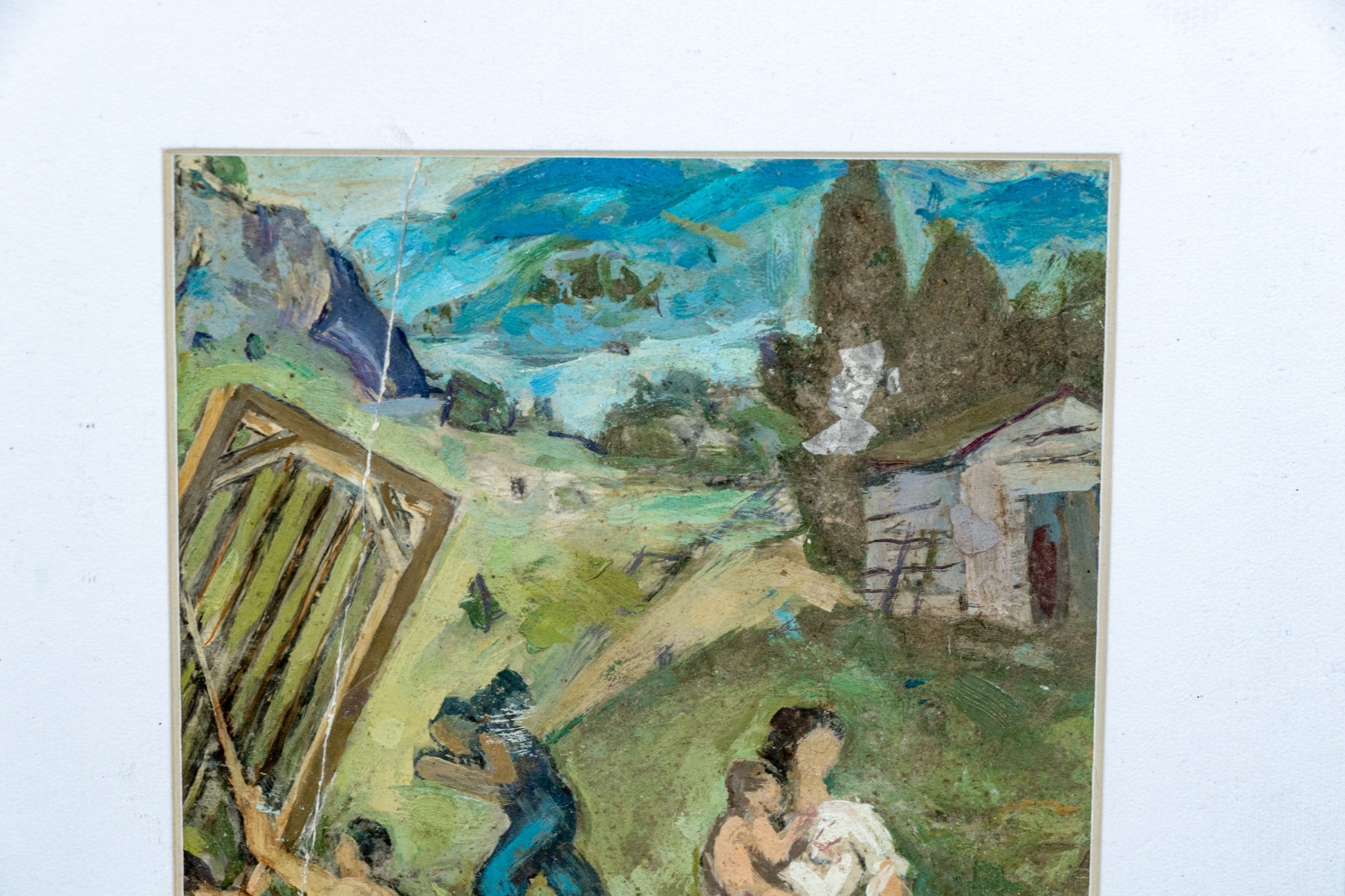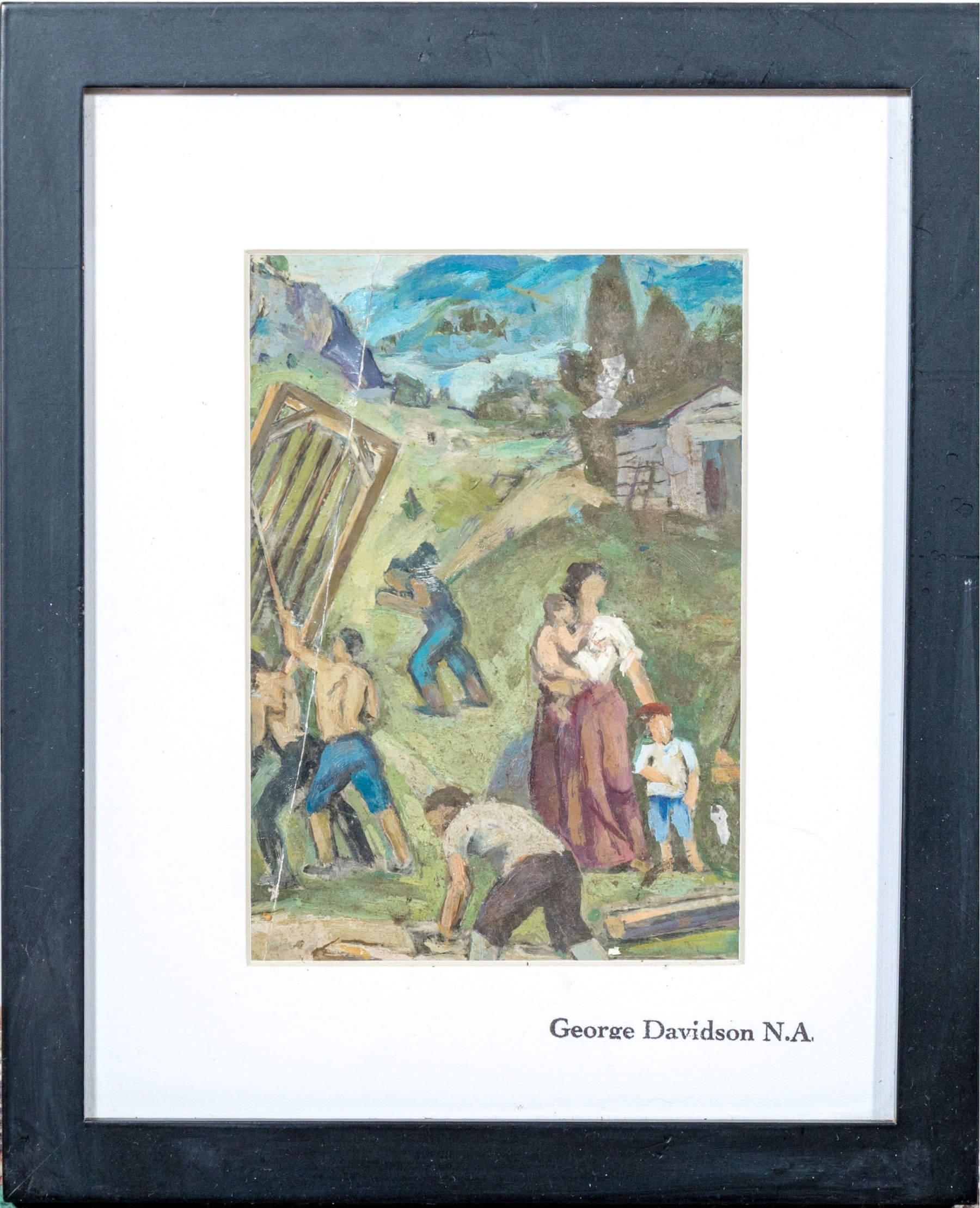 George Davidson (Polish-American, 1889-1965) painting on paper depicting A woman with two children looking on as a group of men build a house along grassy hills with a view of an outbuilding leading up to blue mountains in the distance. Artist's name mechanically printed on the mat.