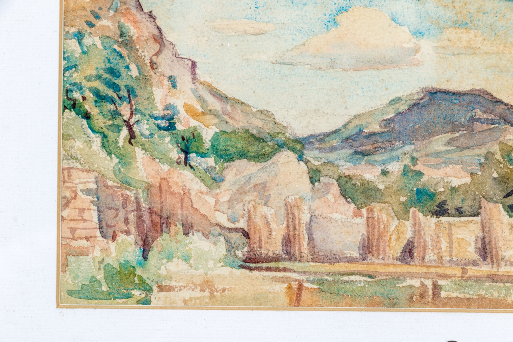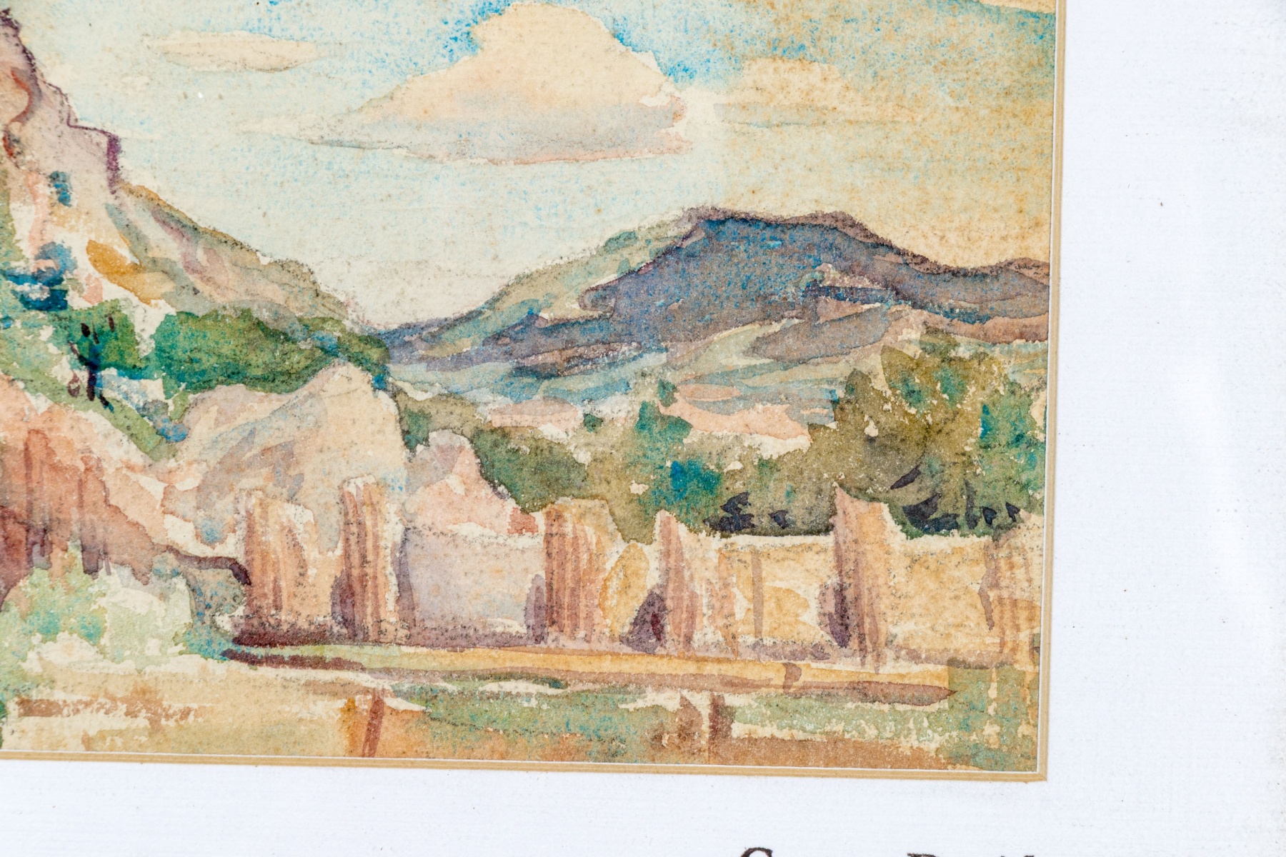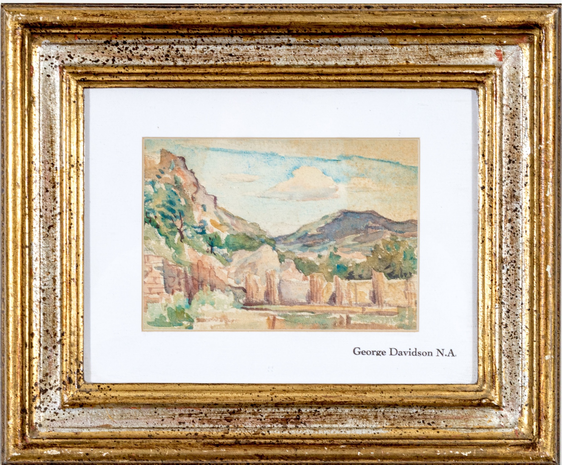 George Davidson (Polish-American, 1889-1965) watercolor painting on paper depicting ruins of a stone building along a natural landscape with sloping forested hills leading to mountains beneath a cloudy sky. Artist name mechanically printed on the mat.