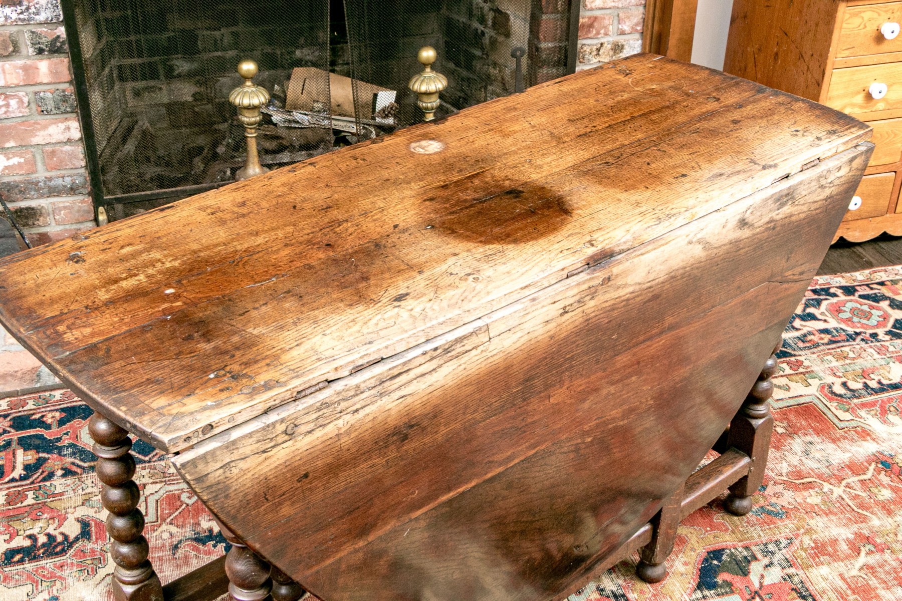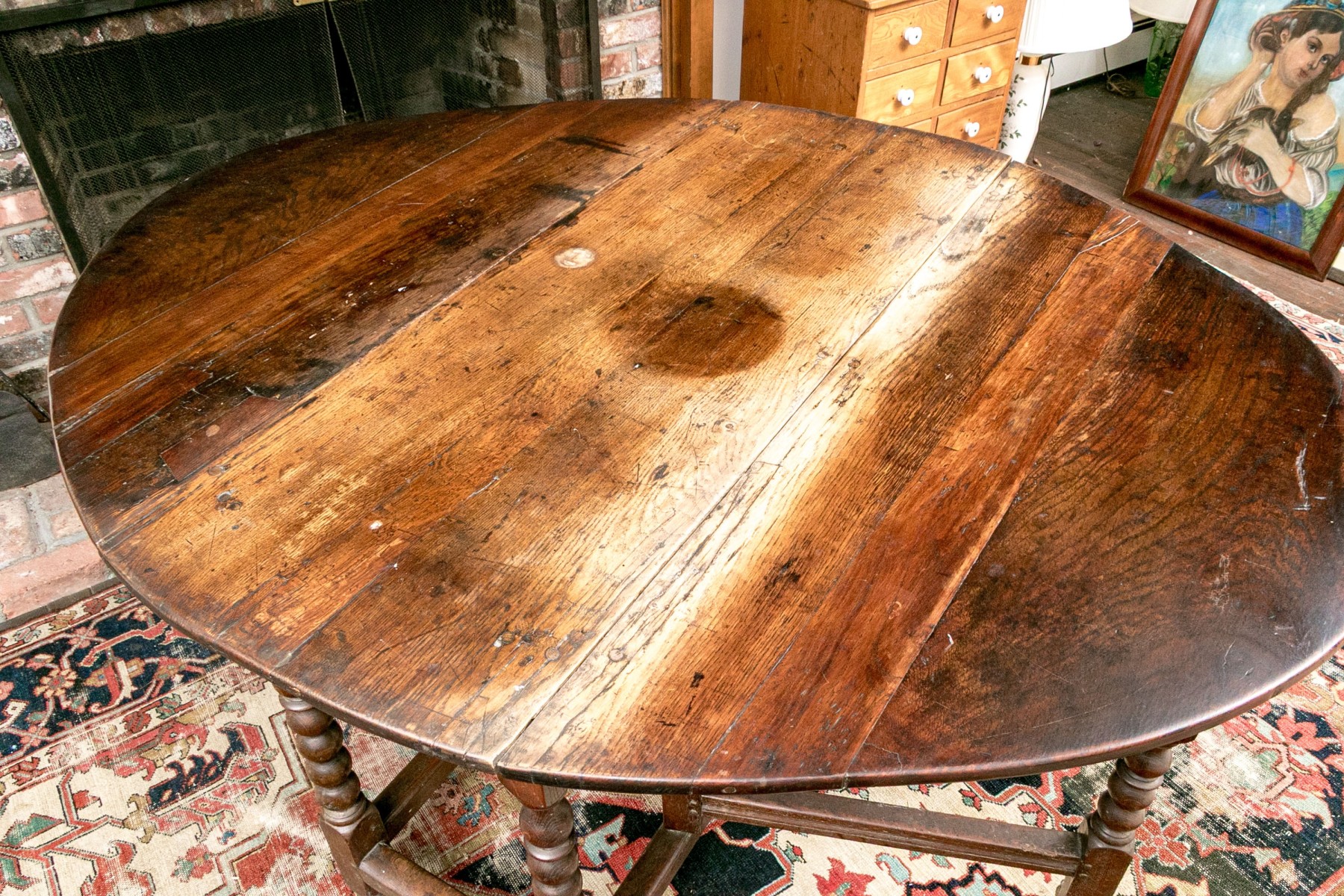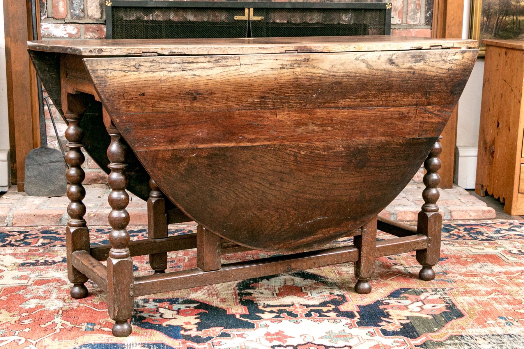 A classic George I oak gateleg table, ca. 1700-1720. The table is designed with bobbin turned legs and stretcher supports above the bun form feet. The table has a large rectangular center flanked by two drop leaves which are supported by hinged legs that extend out to support.