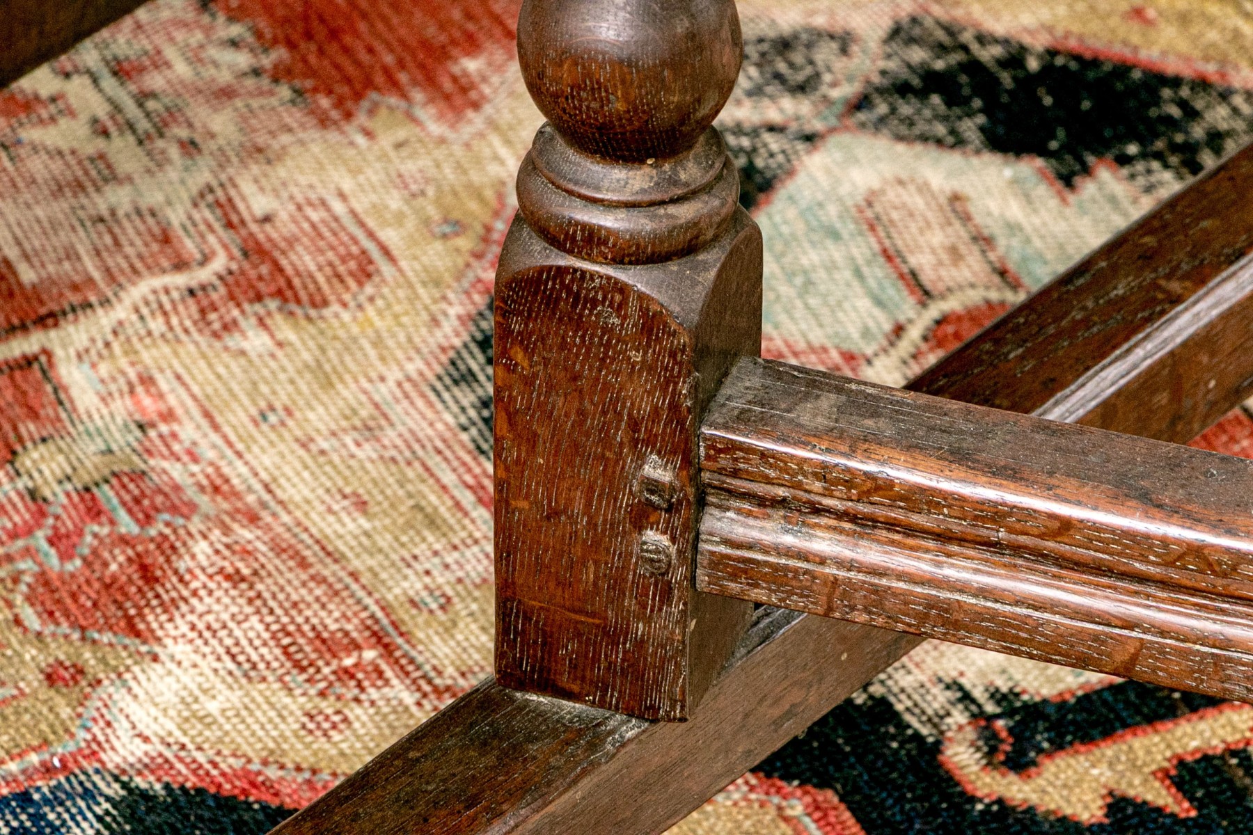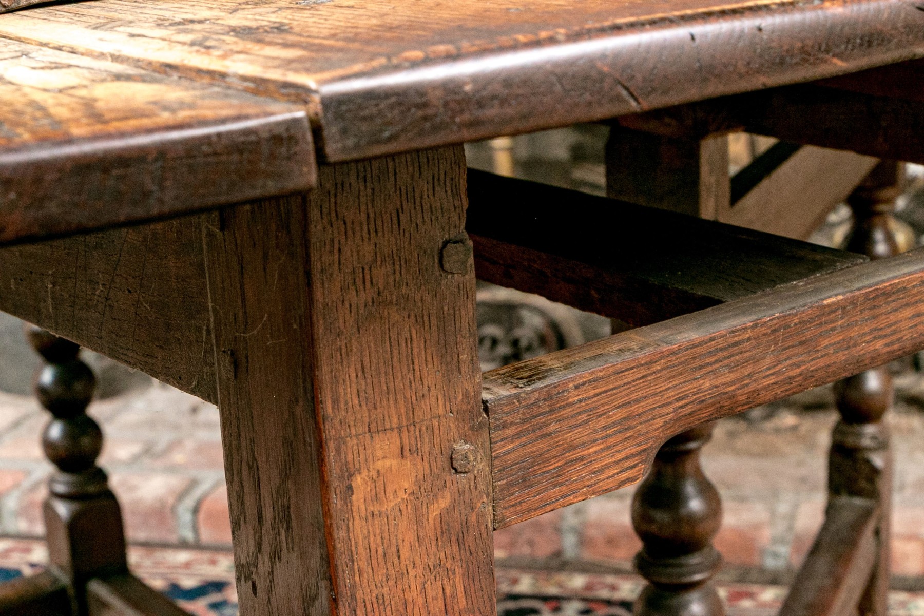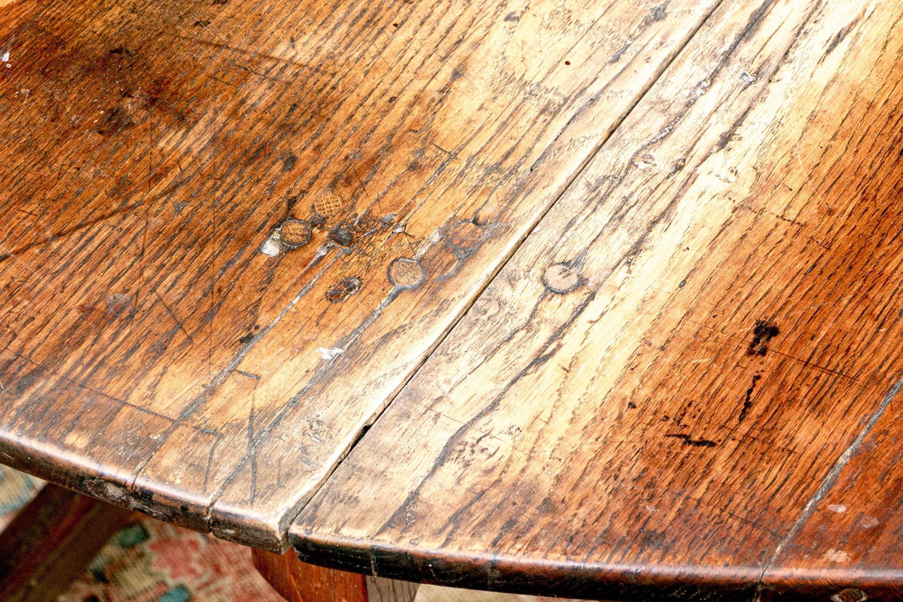 A classic George I oak gateleg table, ca. 1700-1720. The table is designed with bobbin turned legs and stretcher supports above the bun form feet. The table has a large rectangular center flanked by two drop leaves which are supported by hinged legs that extend out to support.