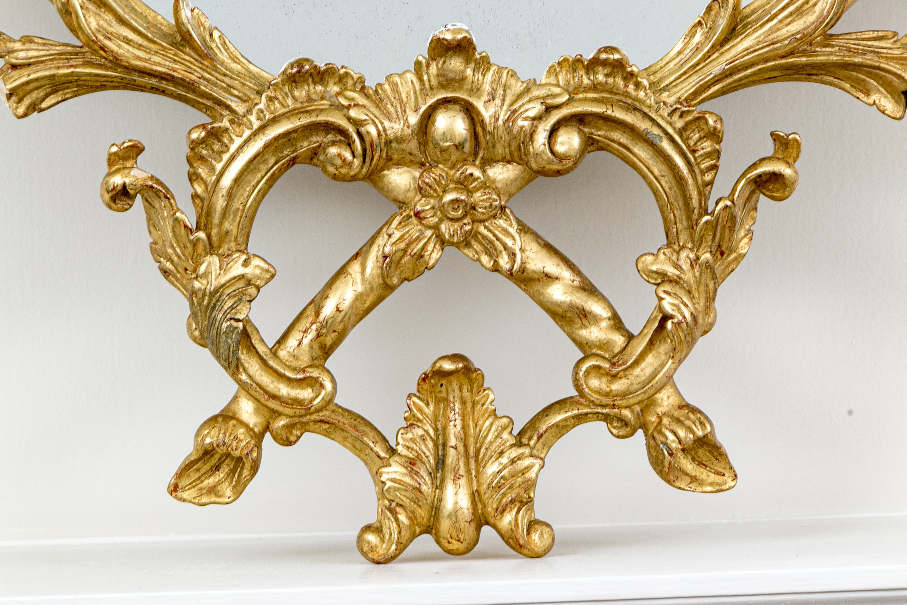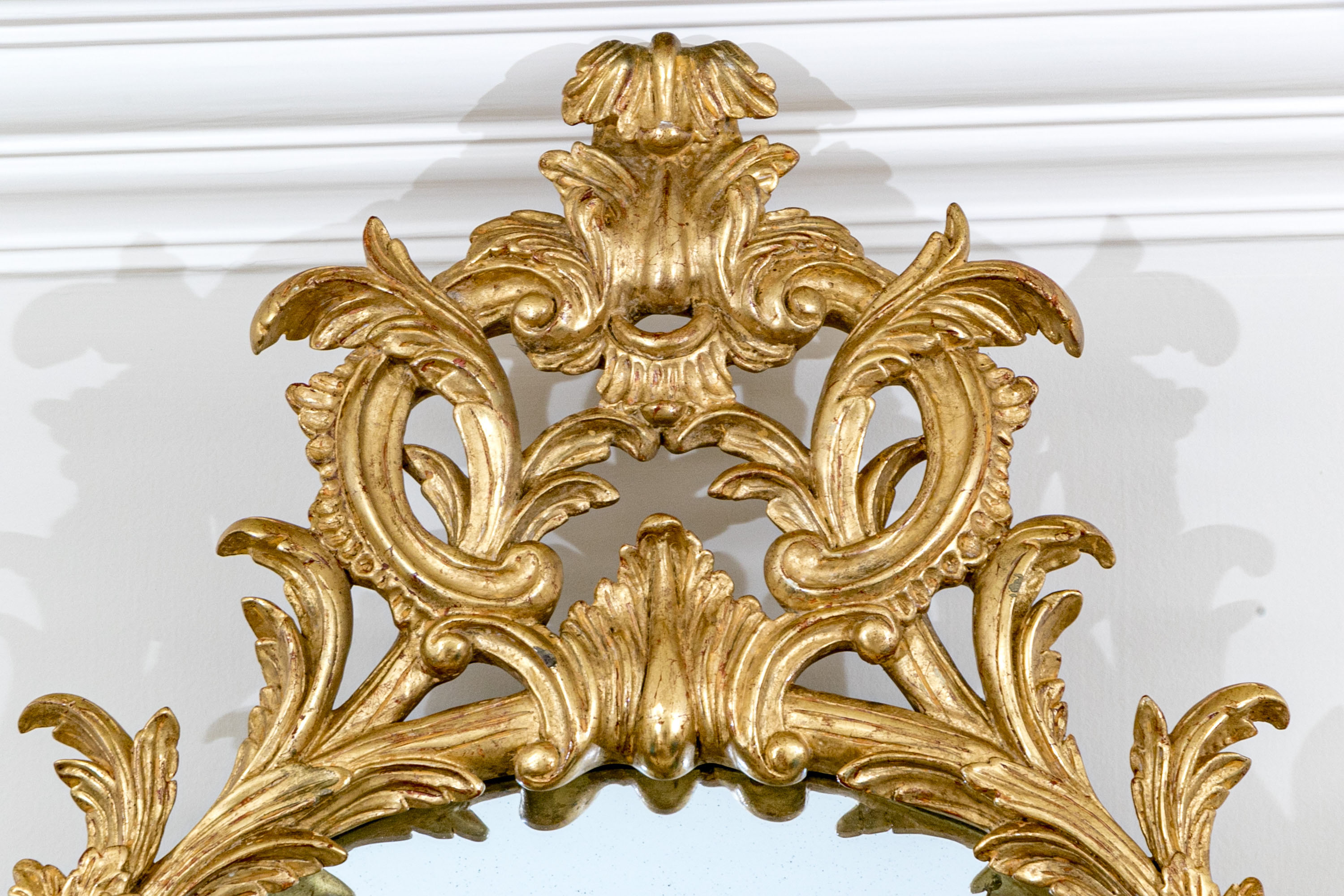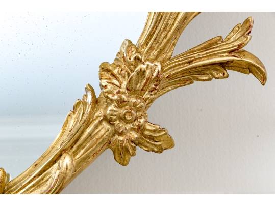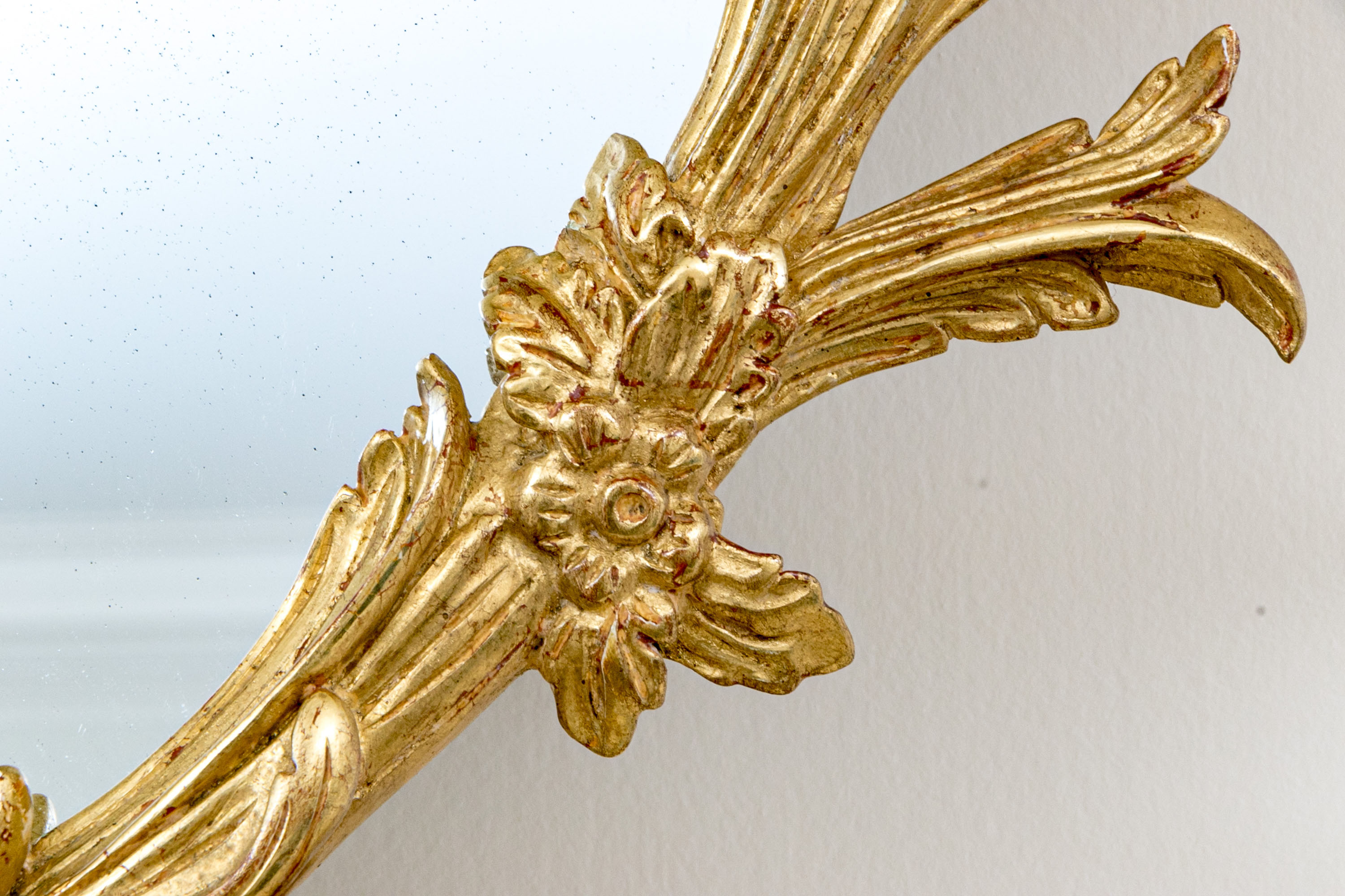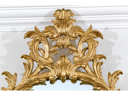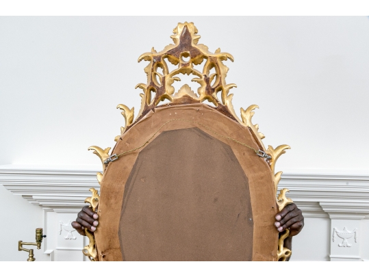 A refined oval mirror in an exceptional George II style gilt frame with an ornate palmier-scrolled pediment with foliate flourishes complimenting a leafy wreath design around the perimeter, accented with crimped ribbon motifs at the sides.
