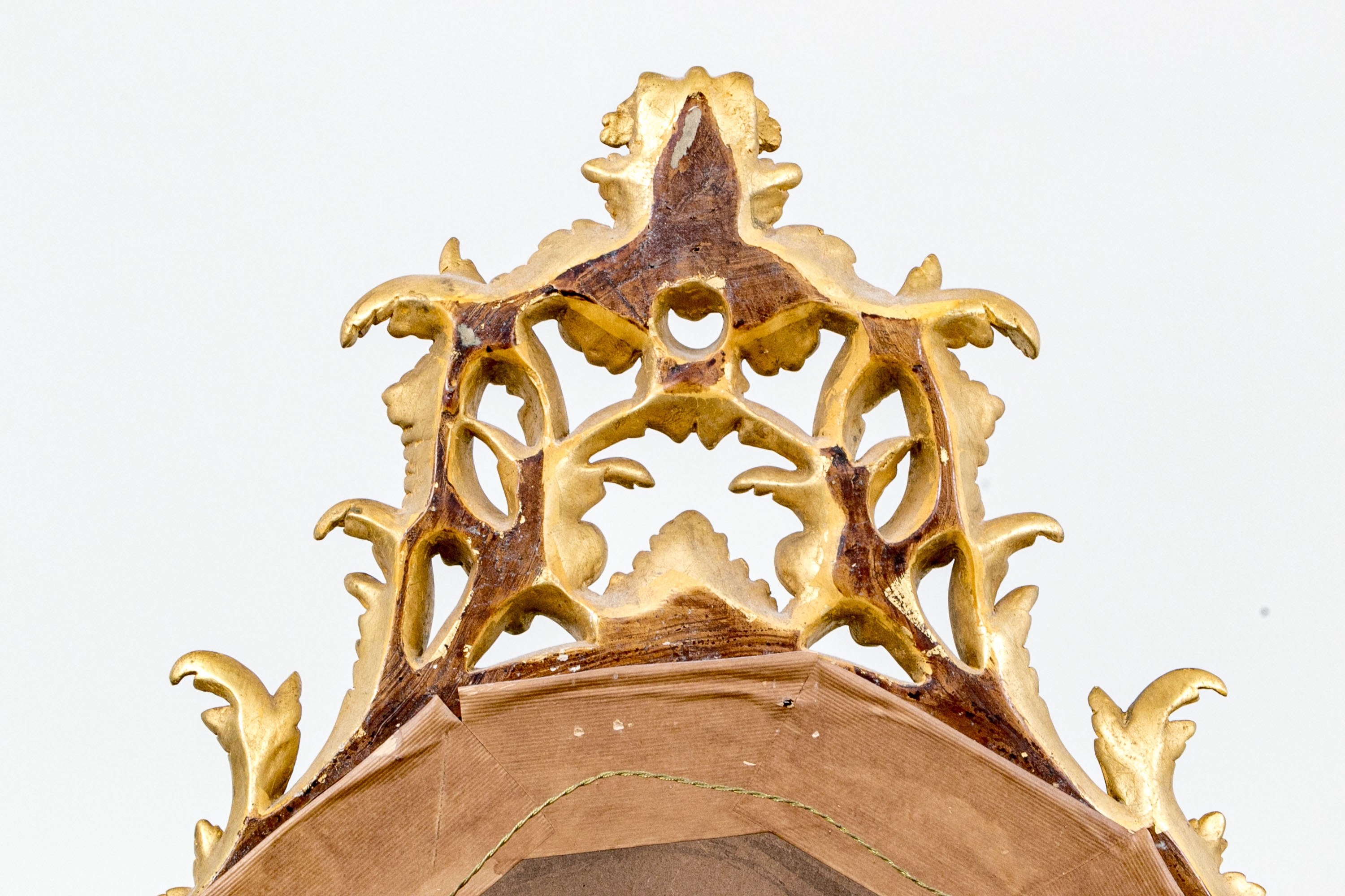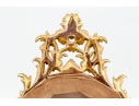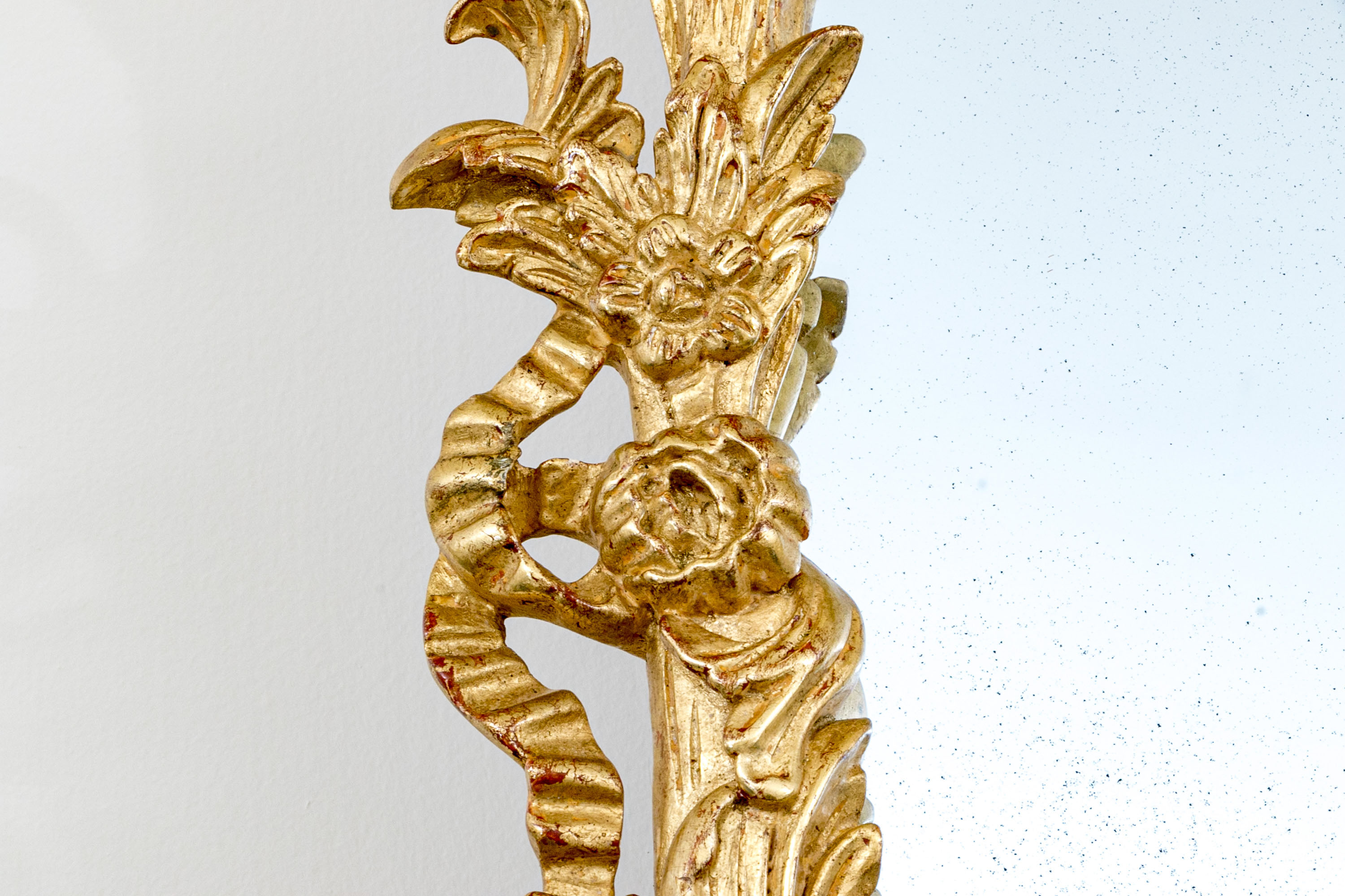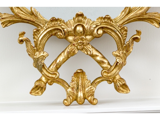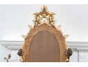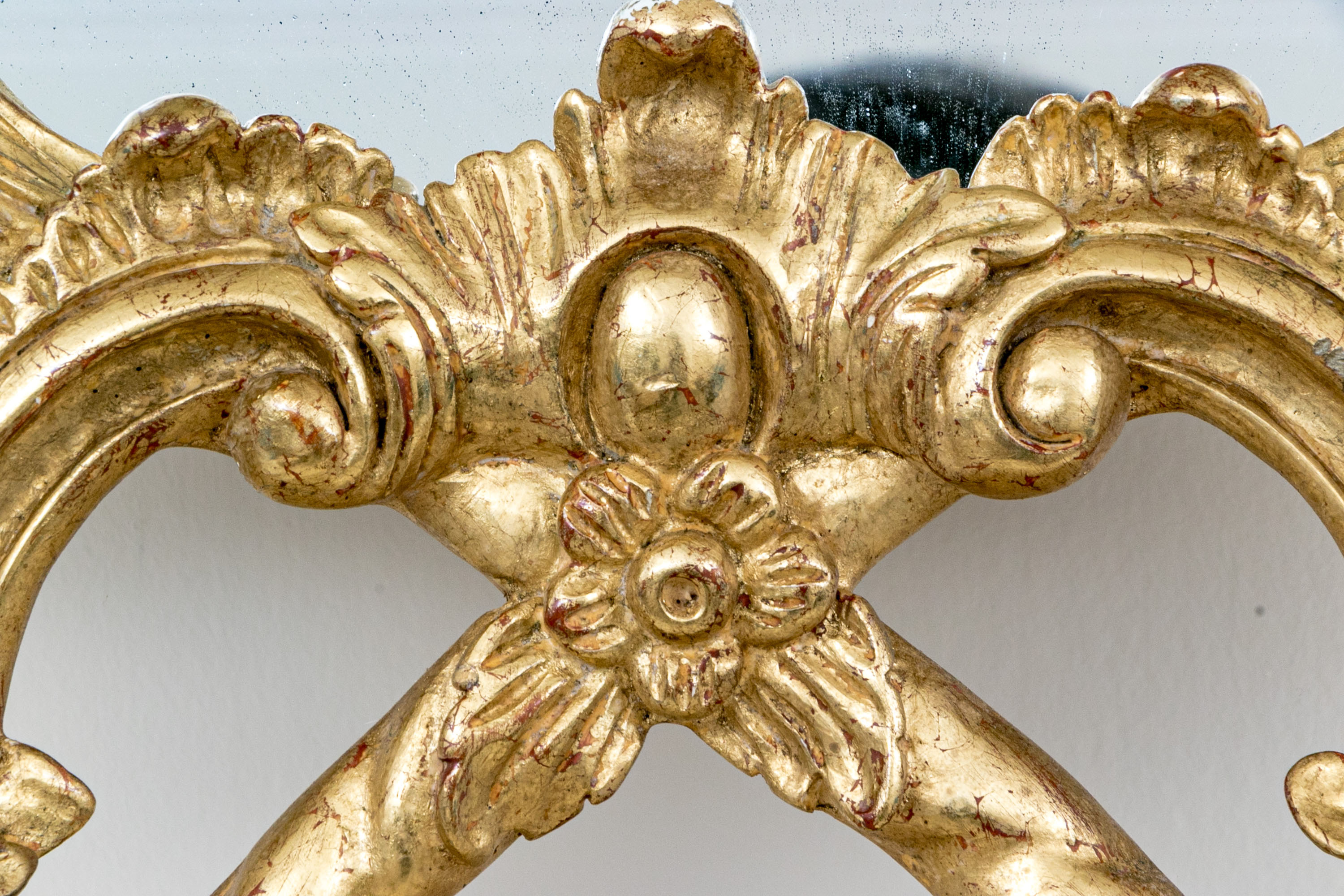 A refined oval mirror in an exceptional George II style gilt frame with an ornate palmier-scrolled pediment with foliate flourishes complimenting a leafy wreath design around the perimeter, accented with crimped ribbon motifs at the sides.