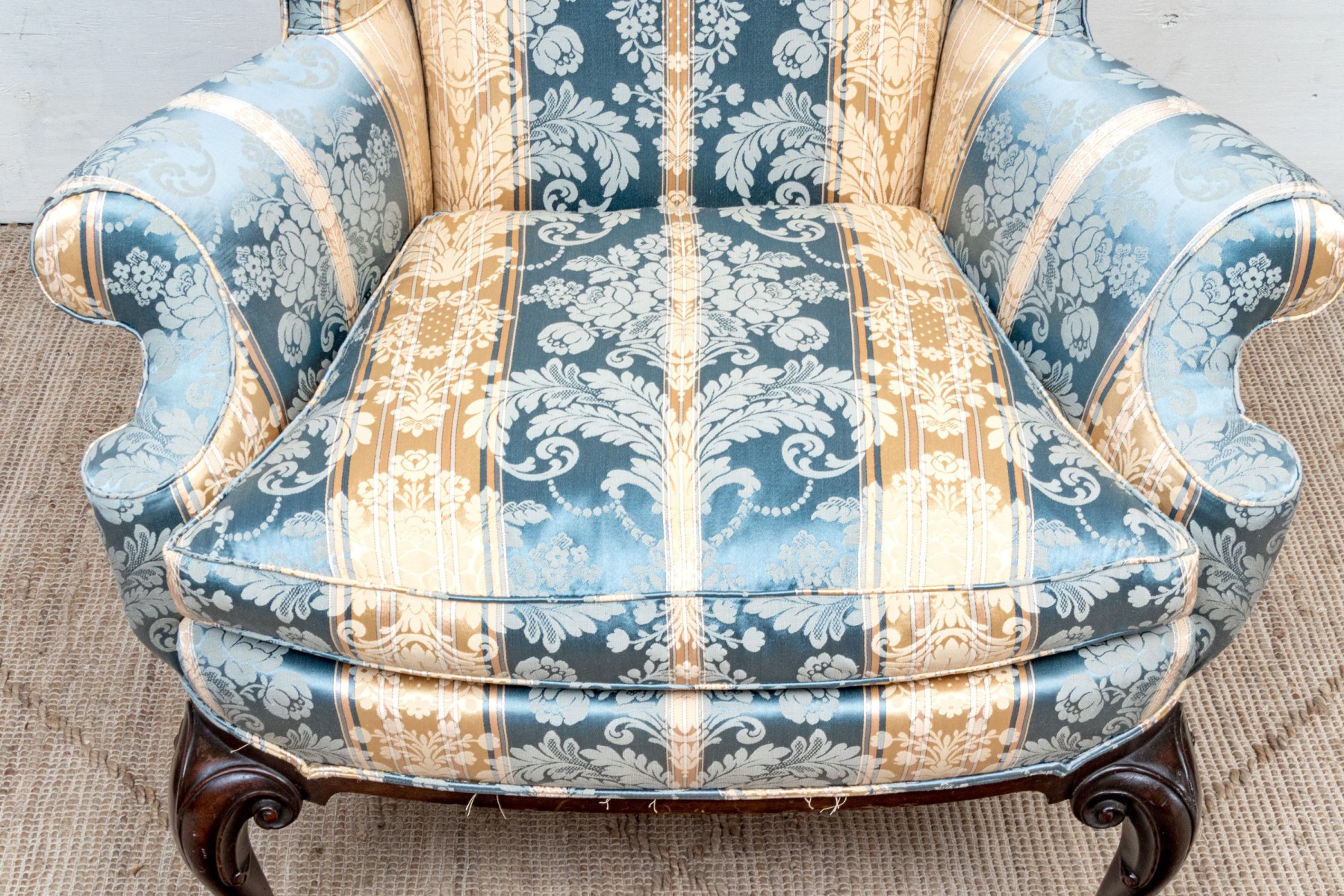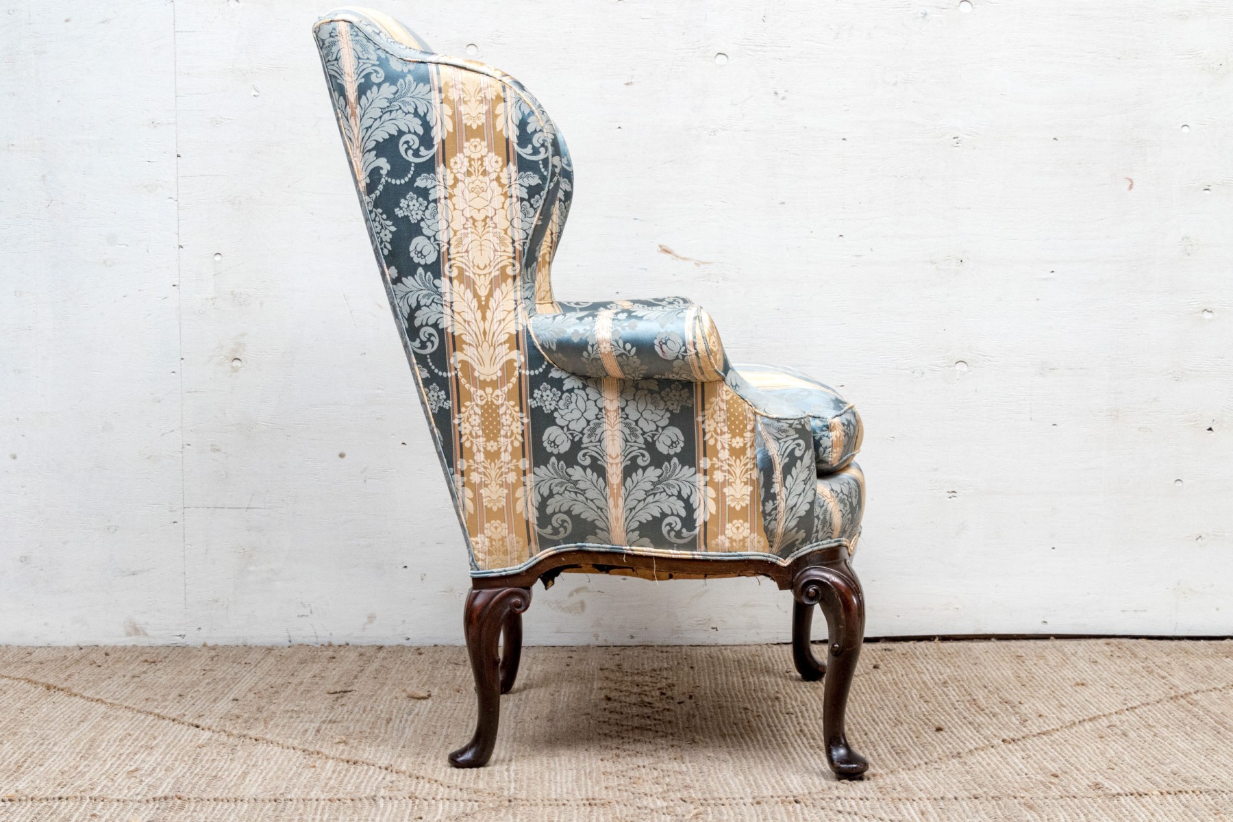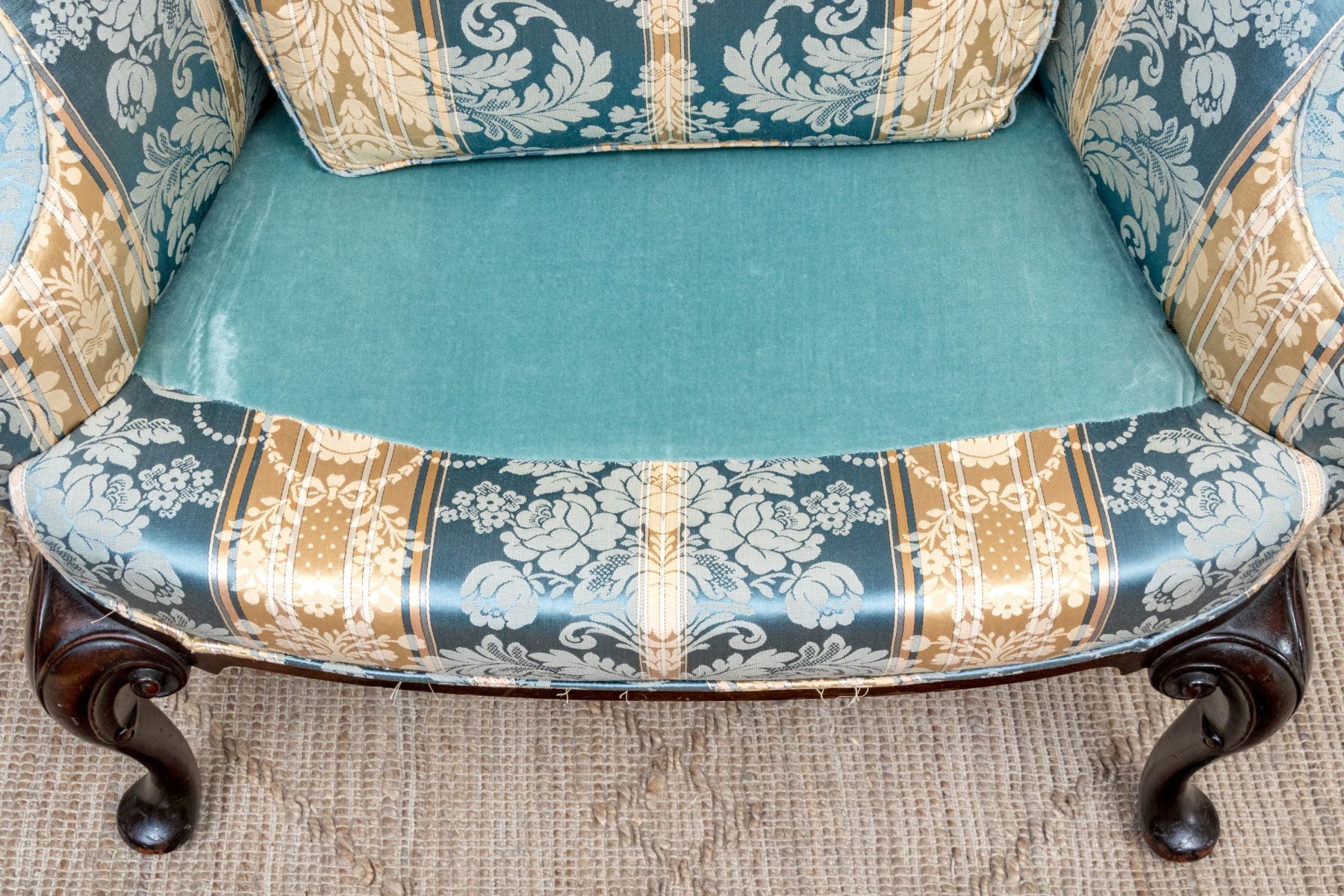 The back flanked by ogival wings and C-scroll arm supports above a bowed front seat rail with loose cushion, on volute-carved cabriole legs ending in pad feet.