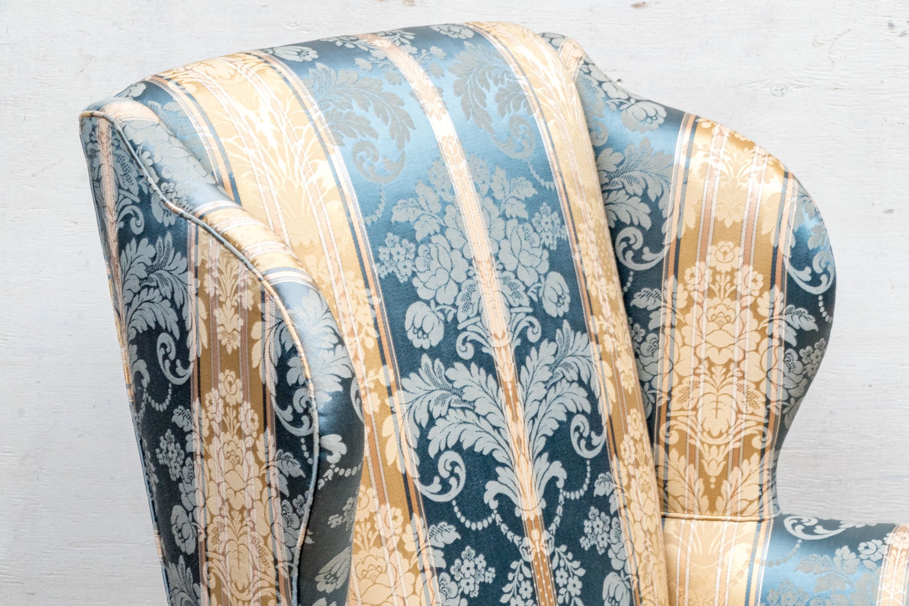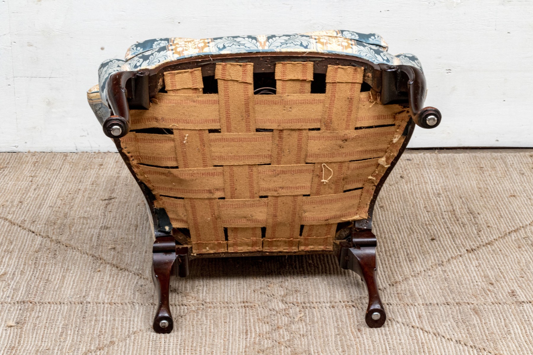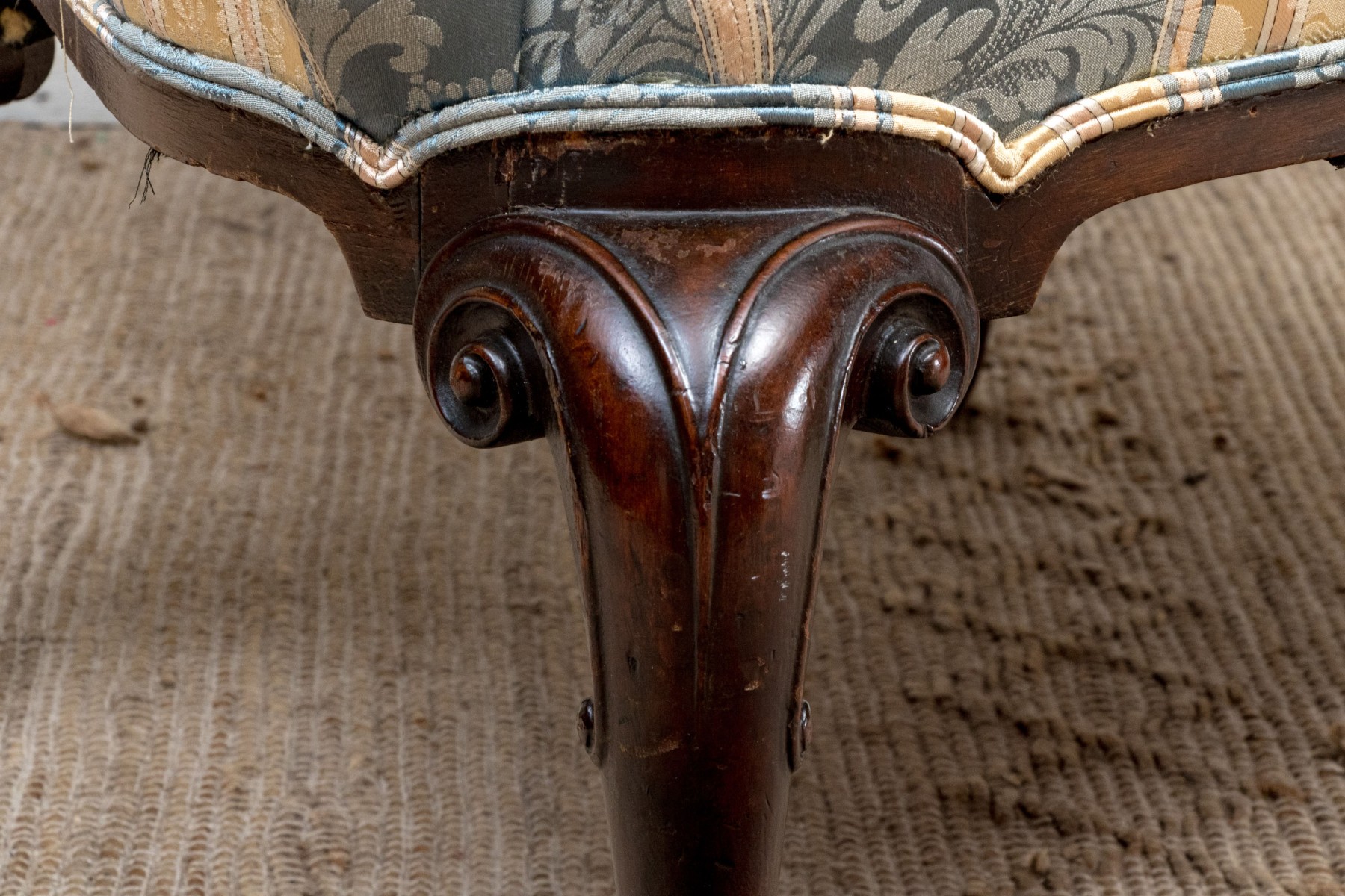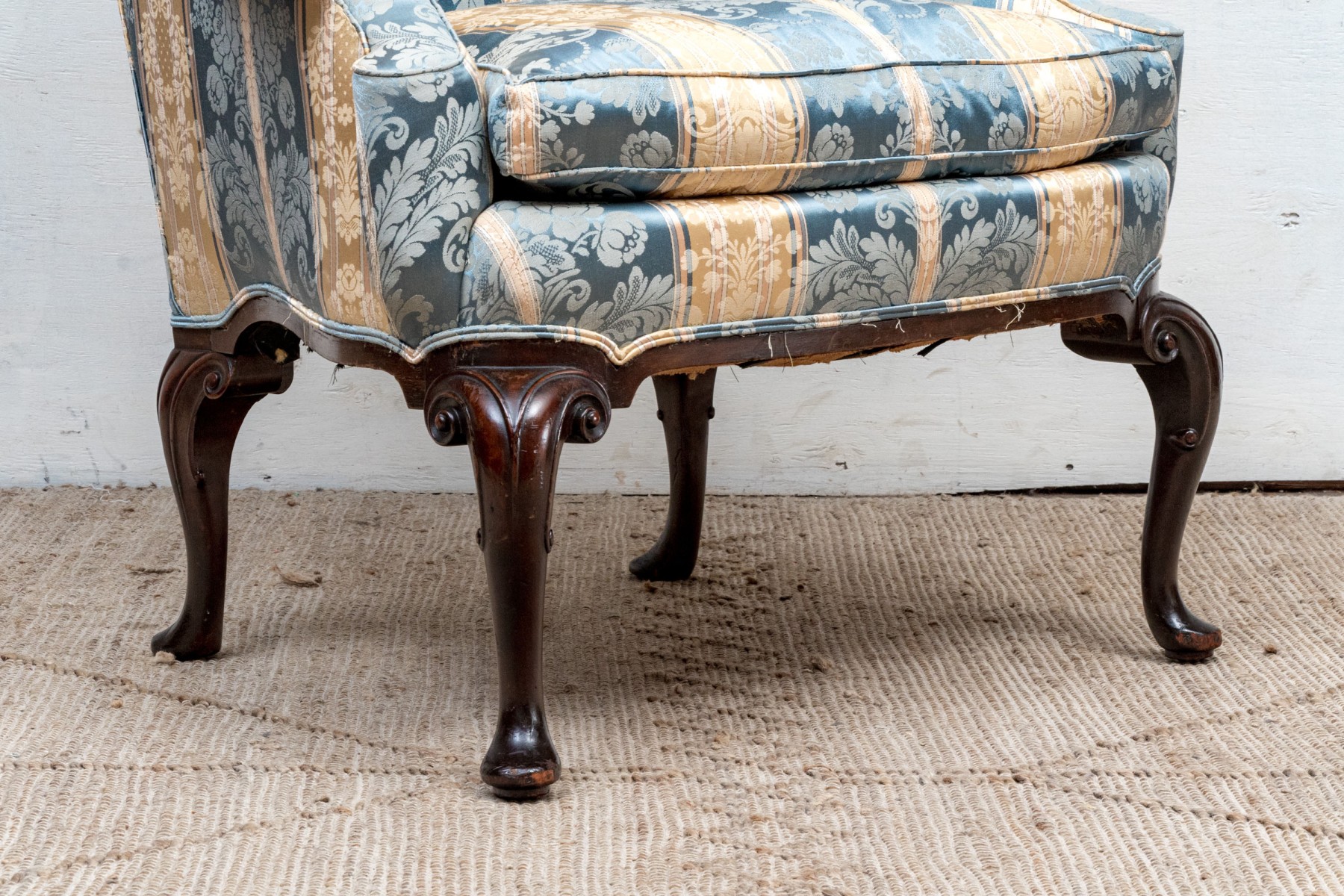 The back flanked by ogival wings and C-scroll arm supports above a bowed front seat rail with loose cushion, on volute-carved cabriole legs ending in pad feet.