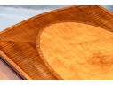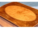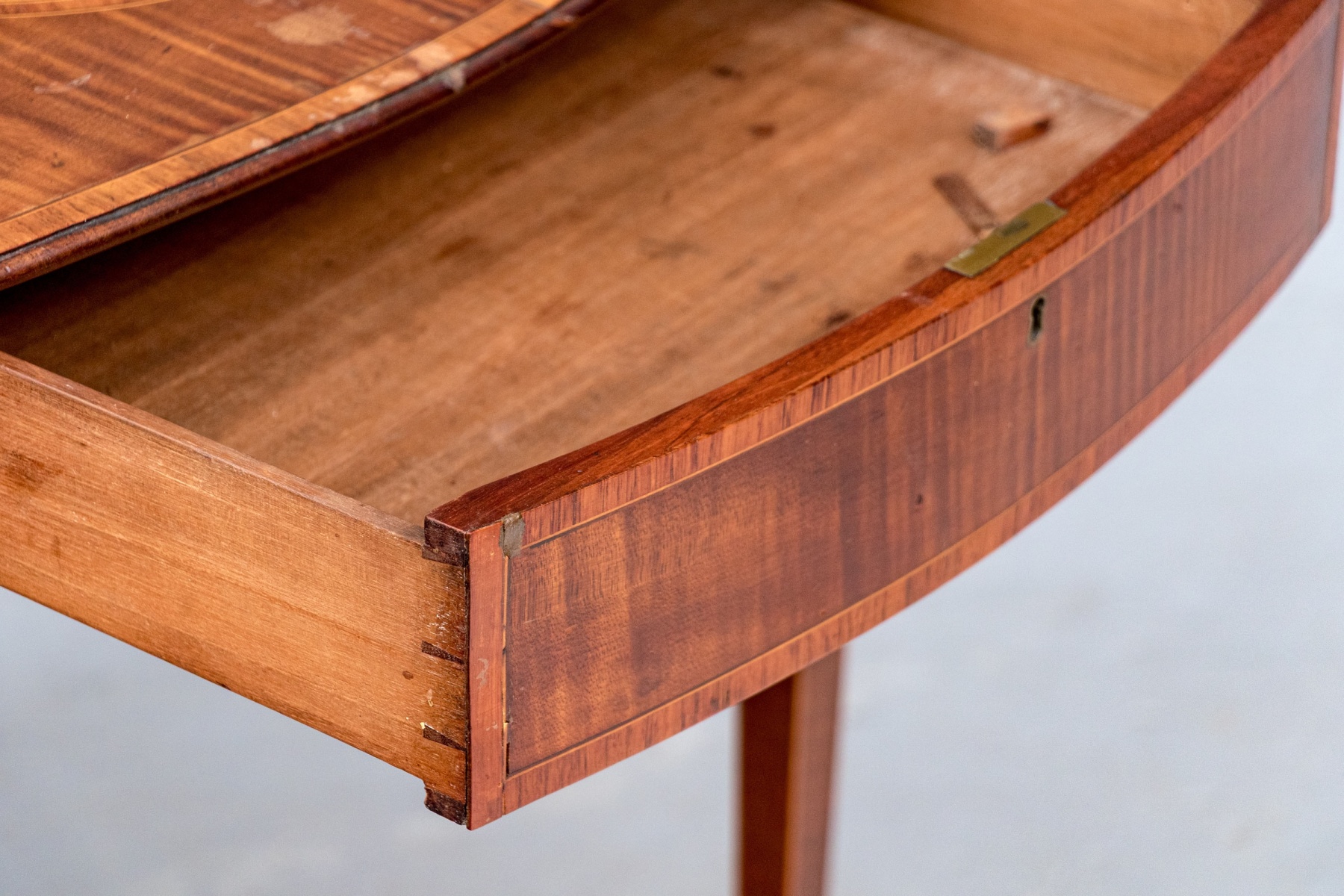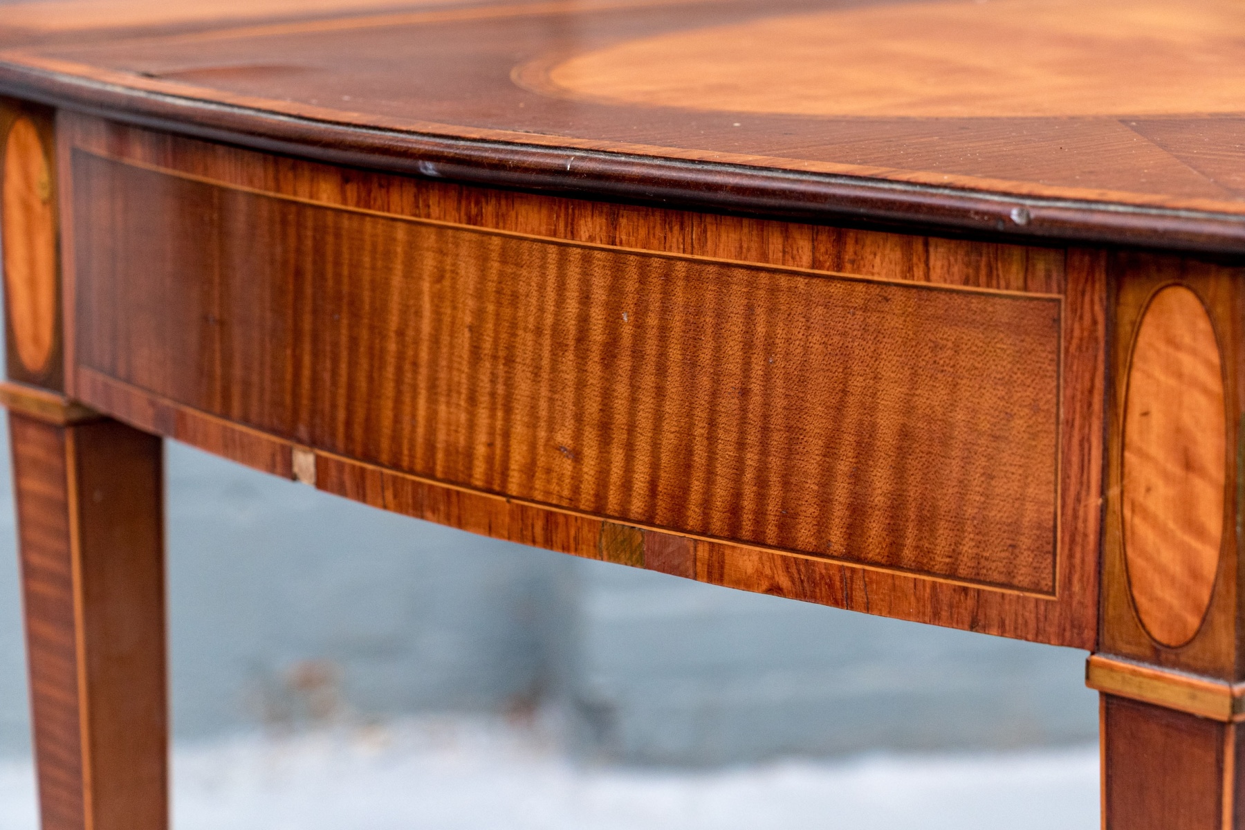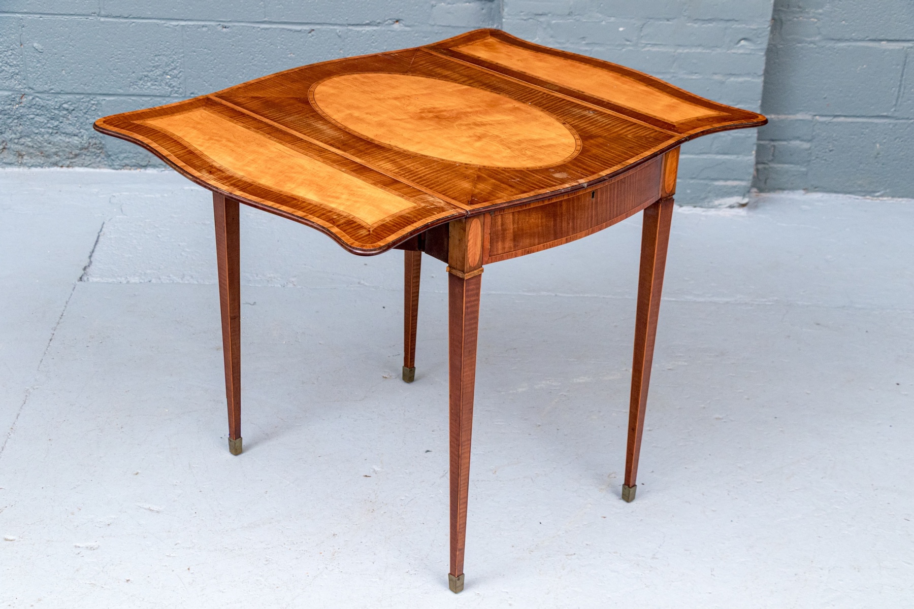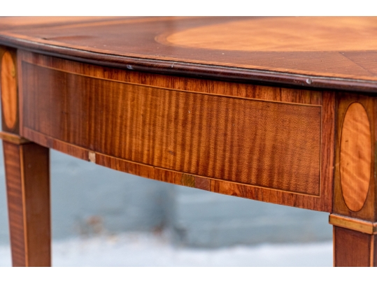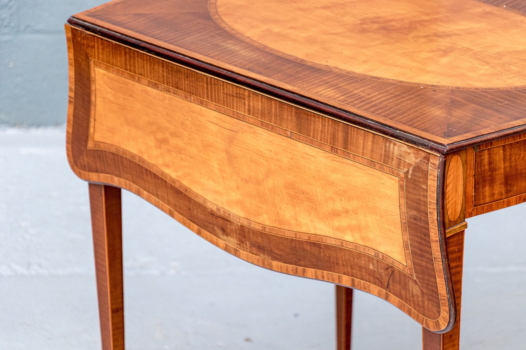 A George III style cross banded pembroke table with oval center medallion and shaped vertical side panels all with inlaid banding, string inlay and cross banding. The table with a single frieze drawer, collared tapering legs and ending in brass capped feet. Each wing held by two bracket supports on each side making for a strong even surface.