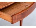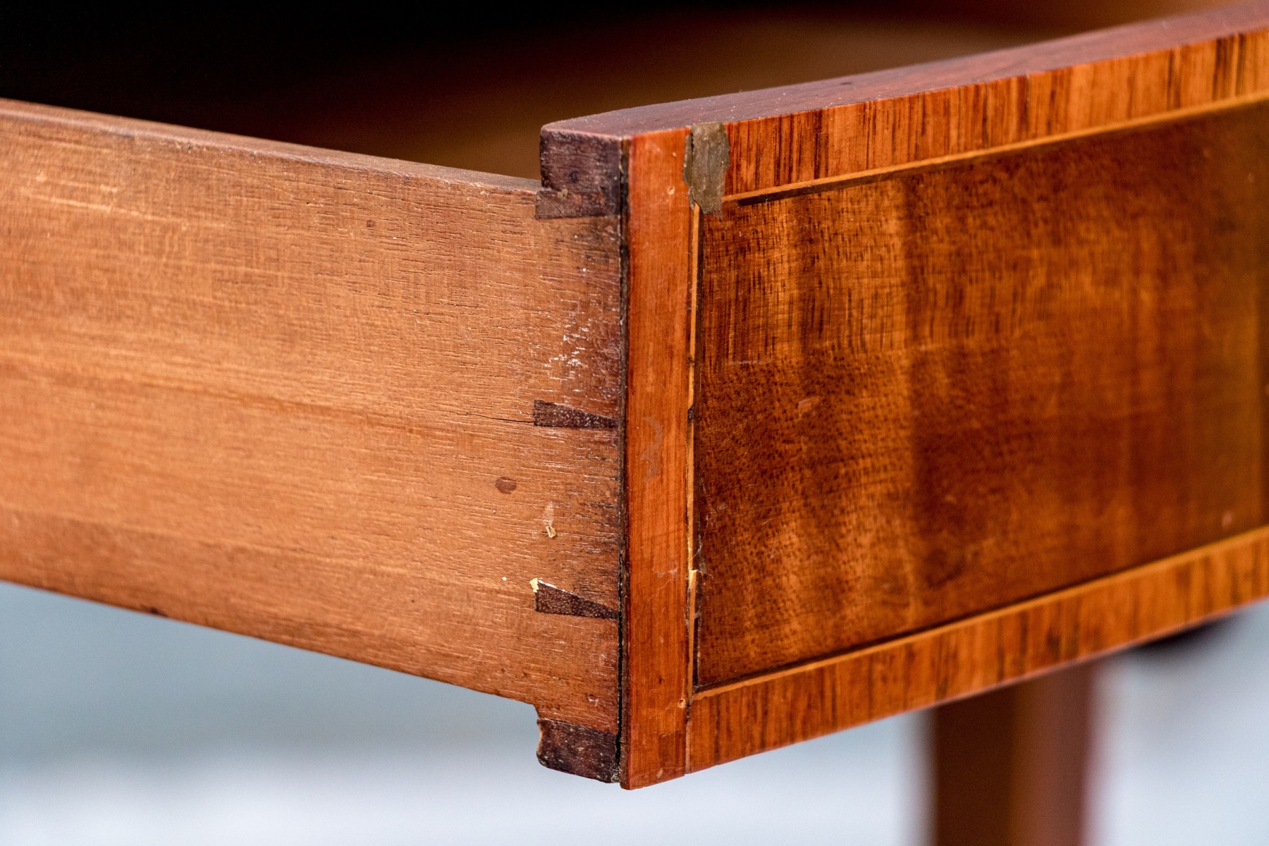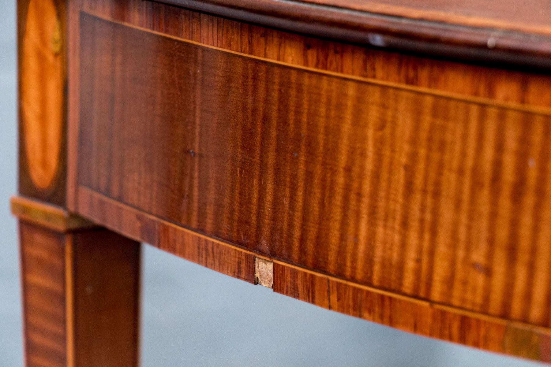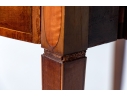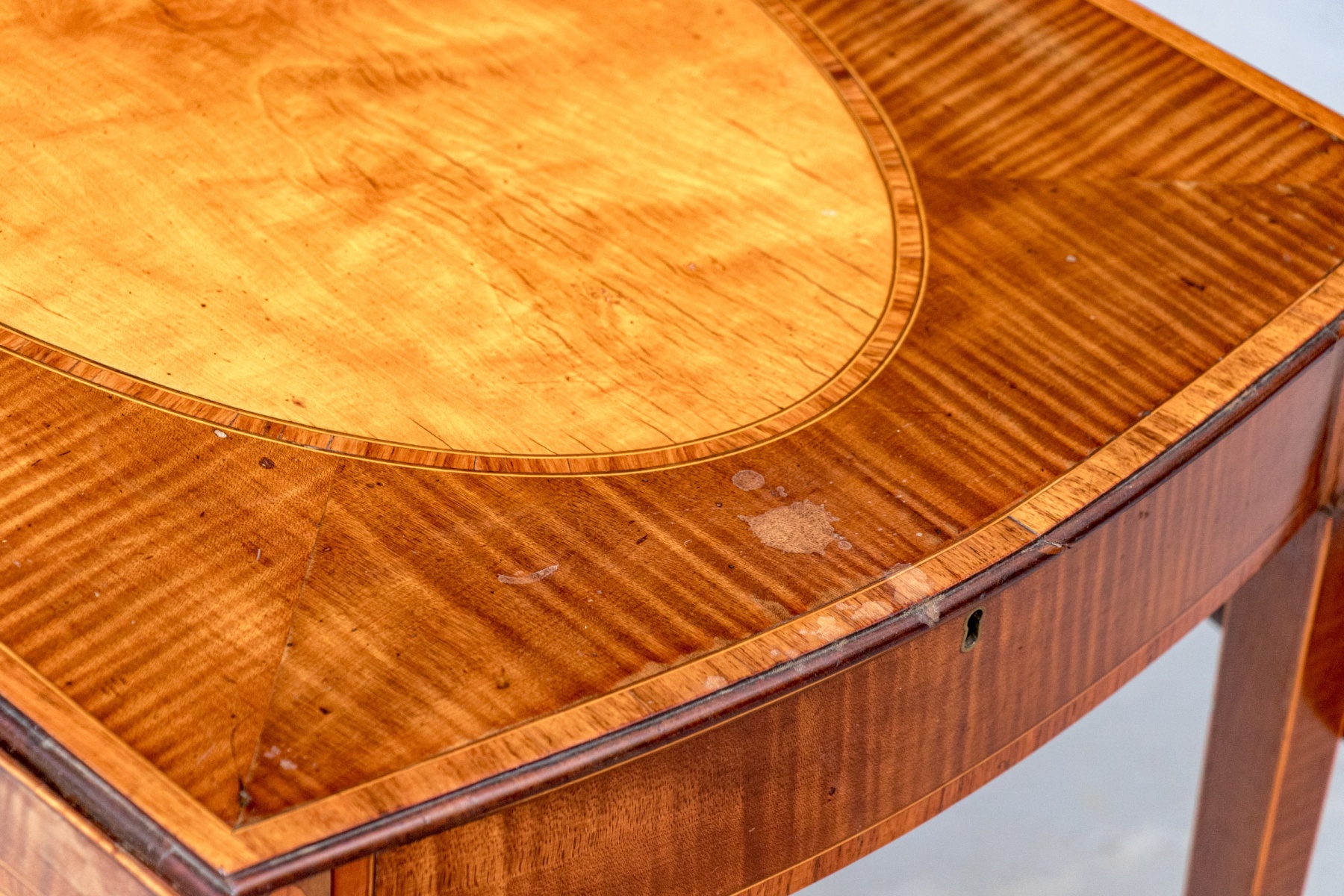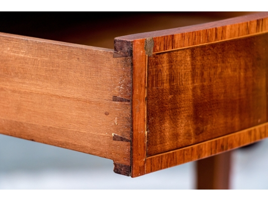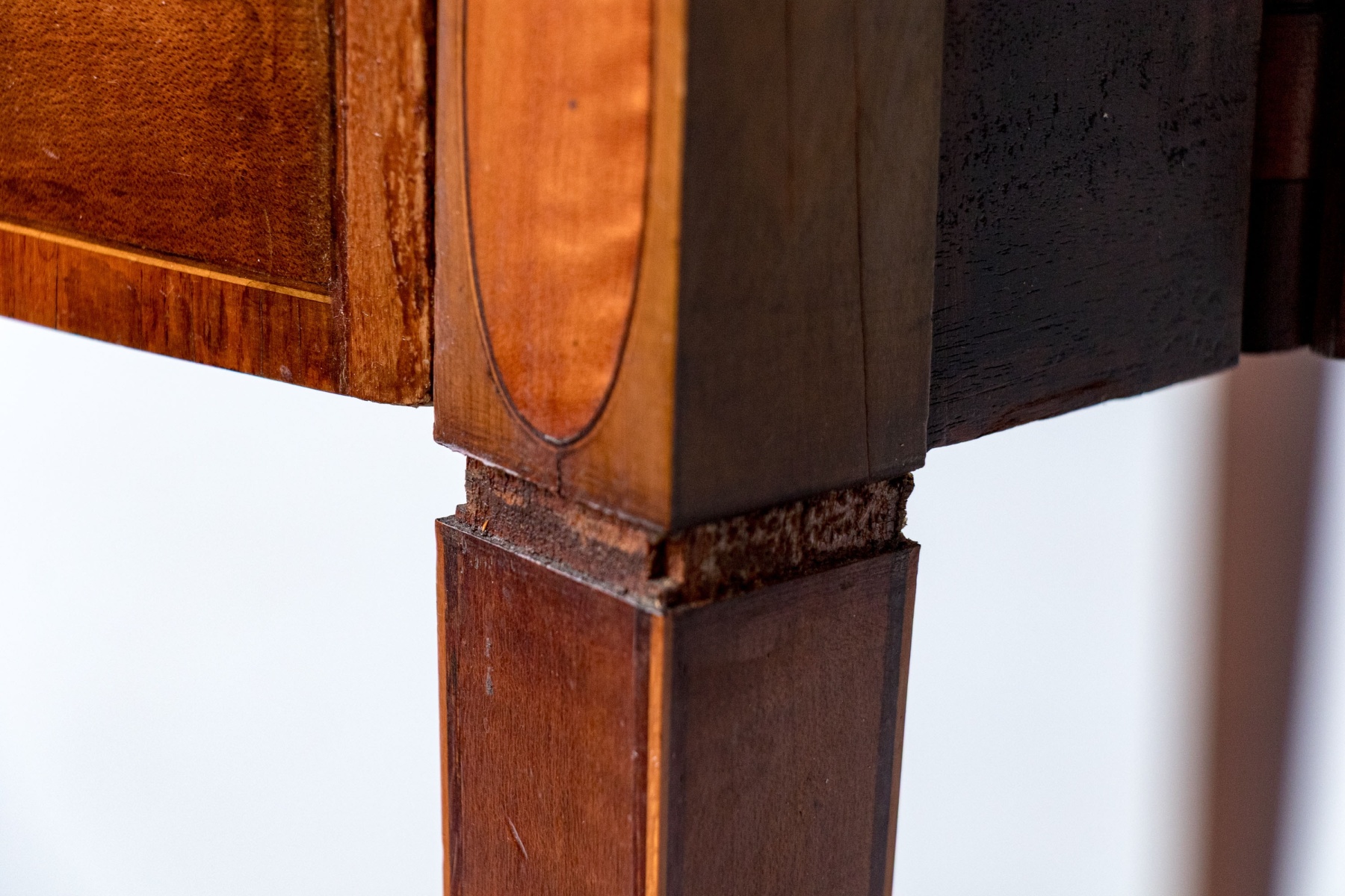 Condition: small veneer loss to back of table, areas of losses to finish, missing 5 inlaid collars around top of legs, no key.