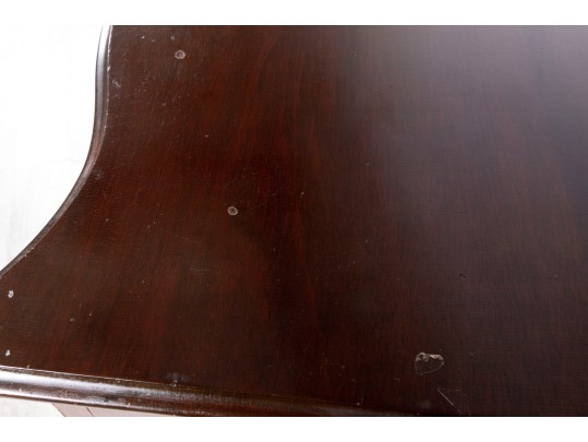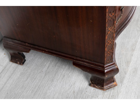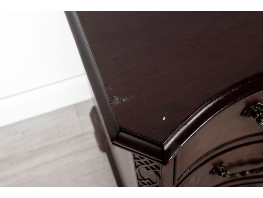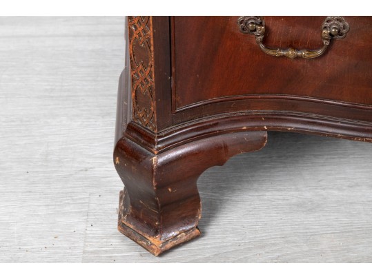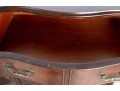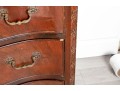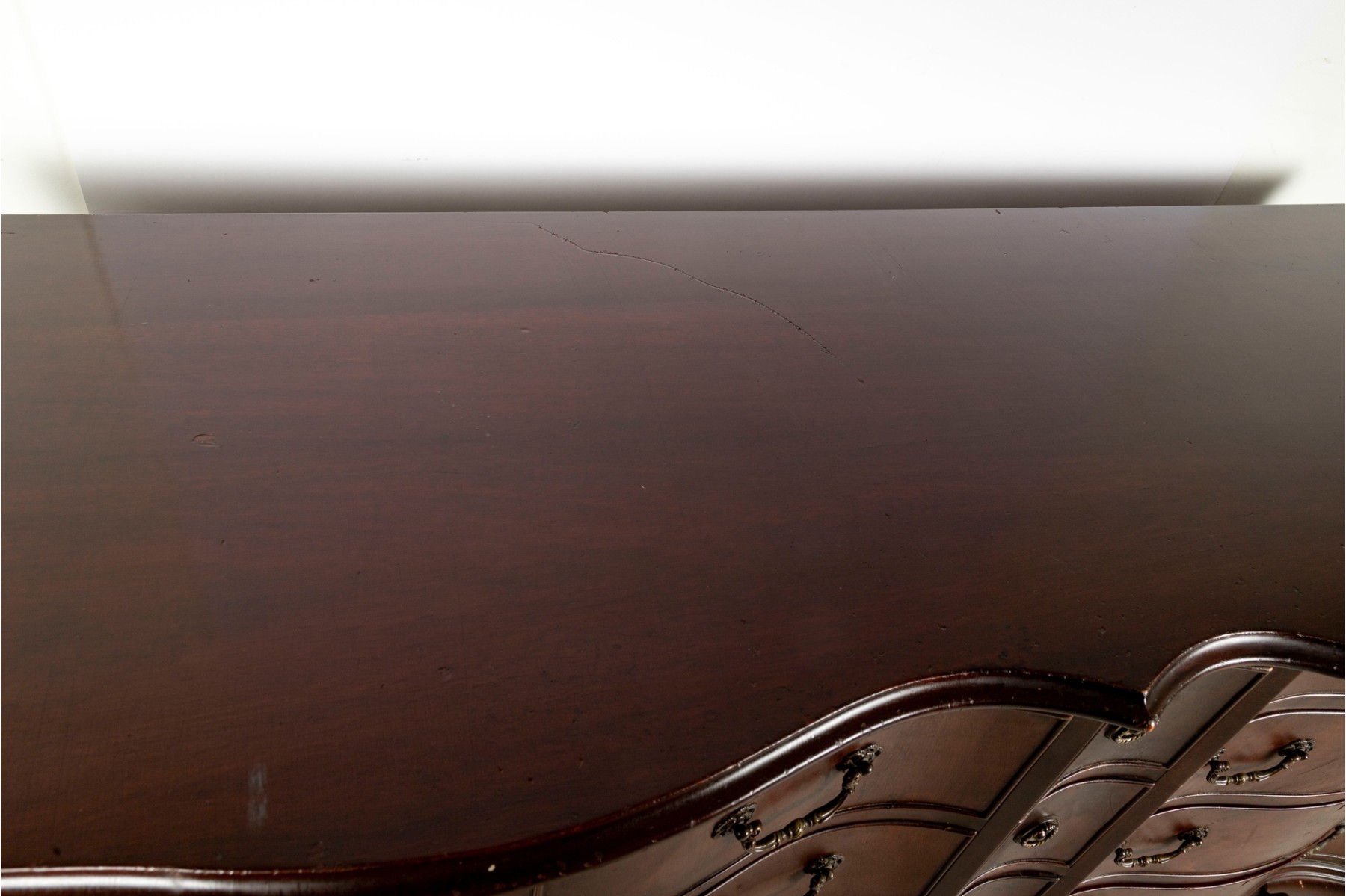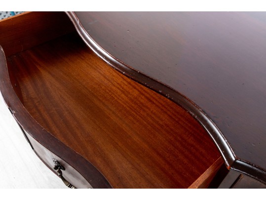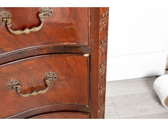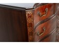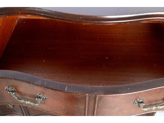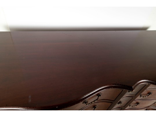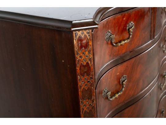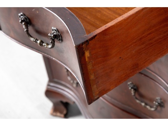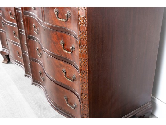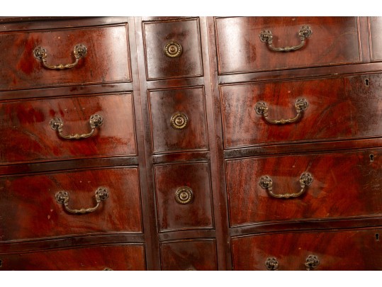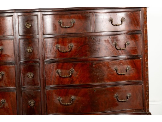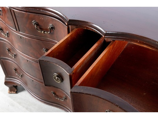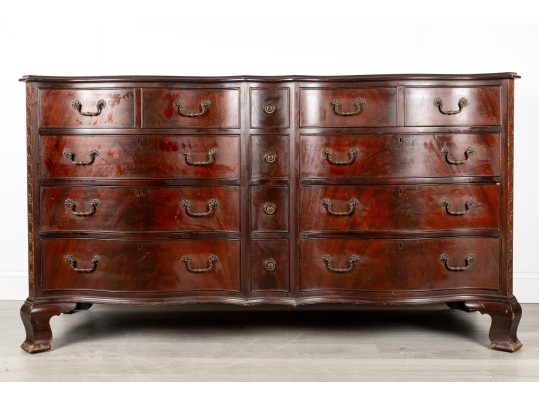 A large vintage serpentine front dresser, crafted in richly grained mahogany veneers and featuring a striking bowed facade, likely dating from the early to mid-20th century in a Georgian Revival style. The piece includes twelve drawers, with the central column accented by round brass rosette pulls, flanked by sets of deeper drawers with ornate bail handles.