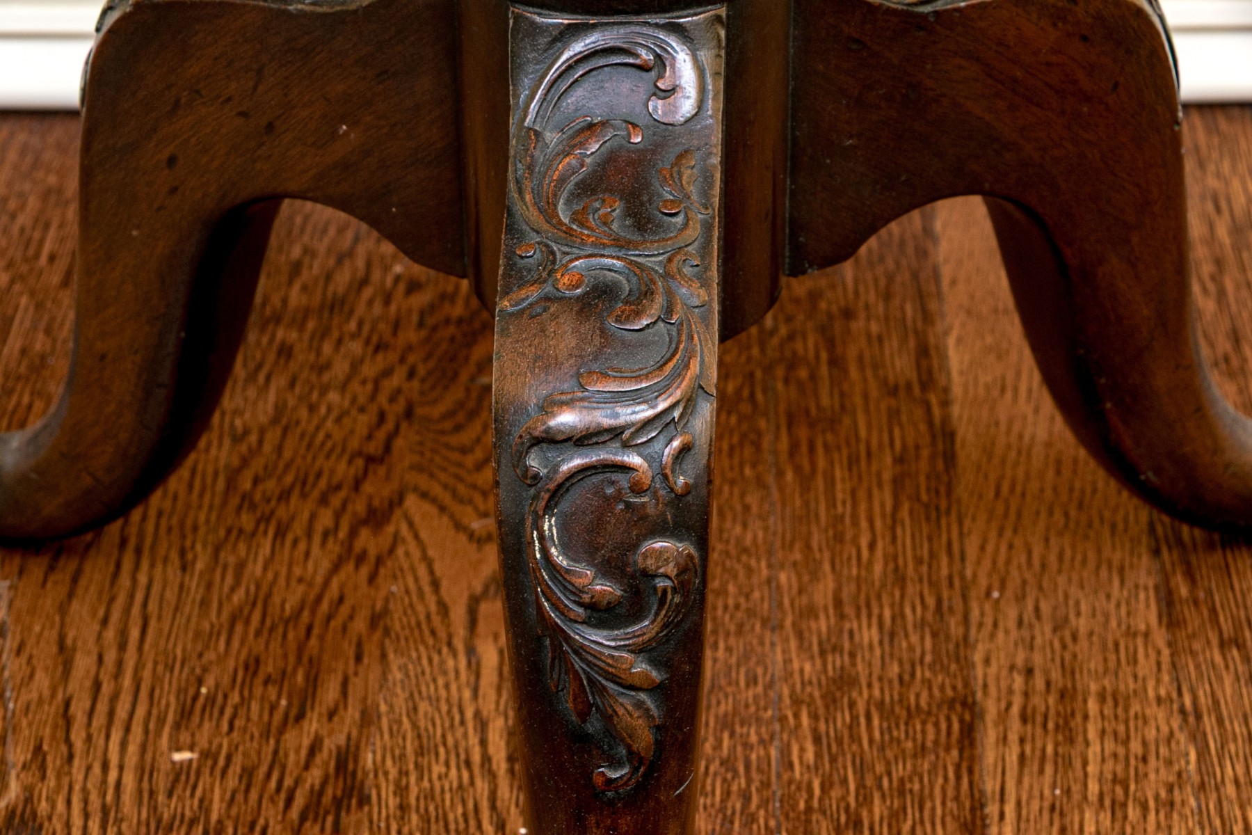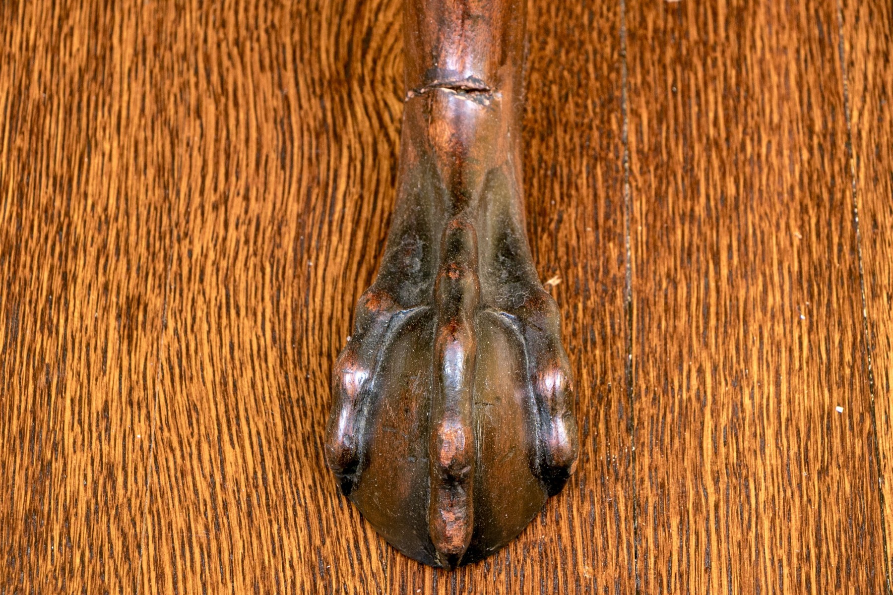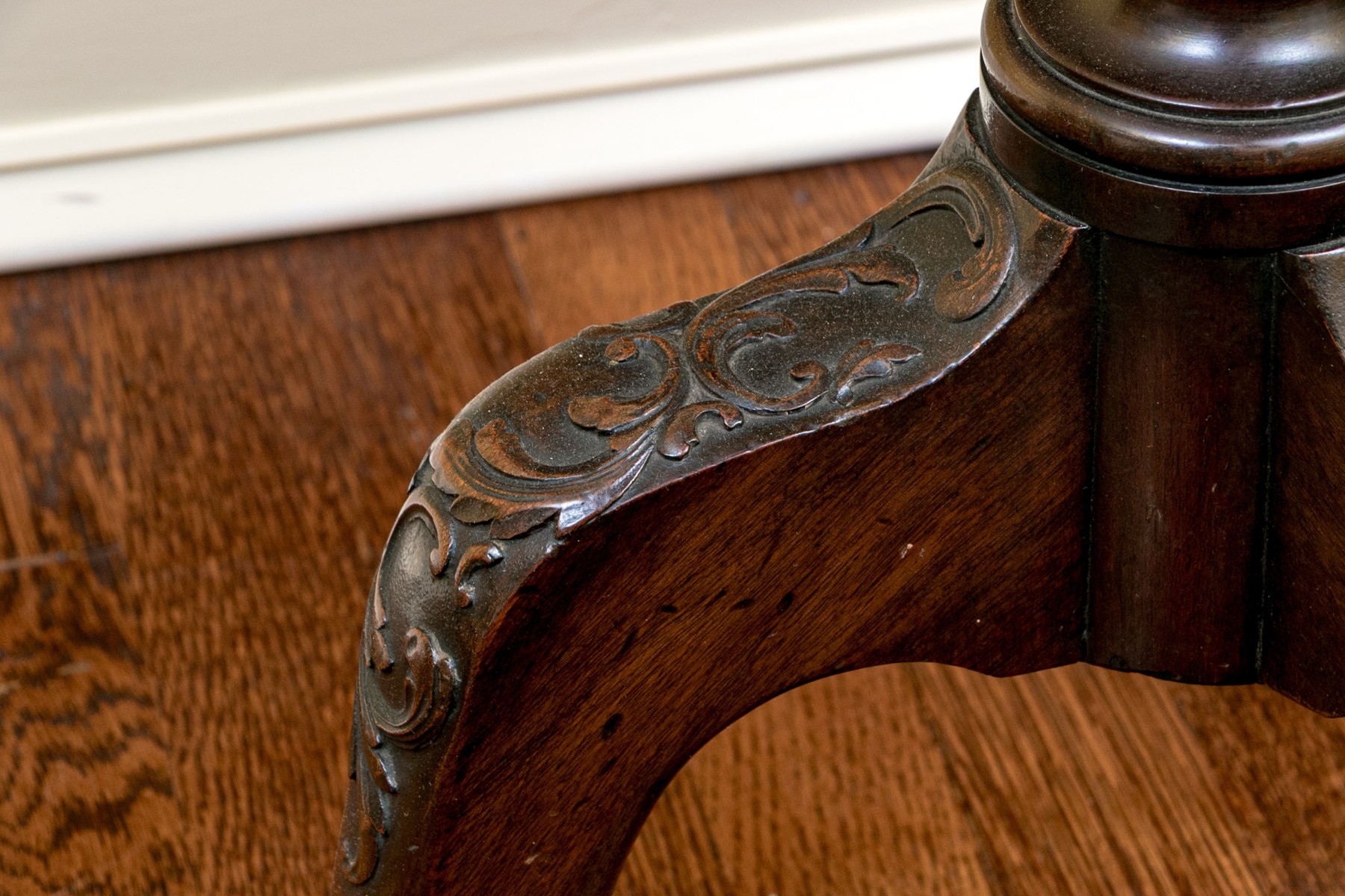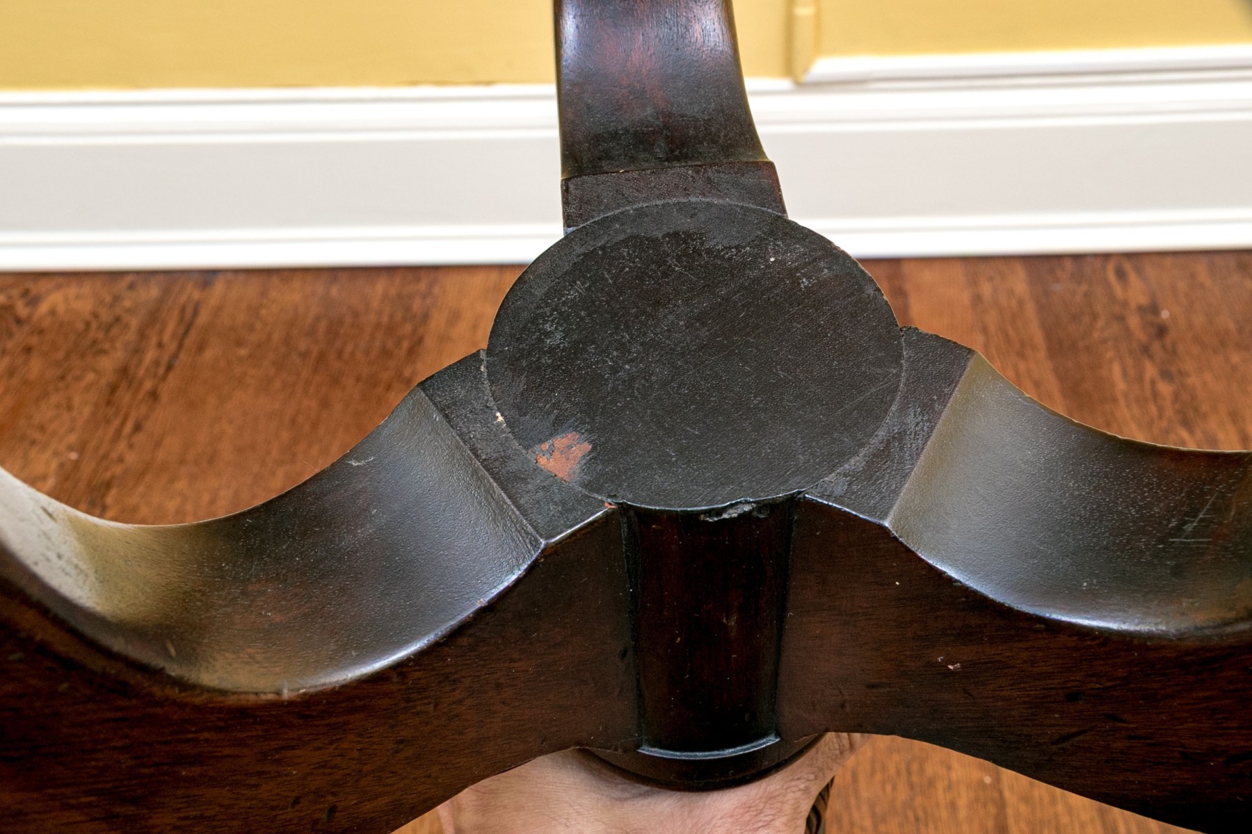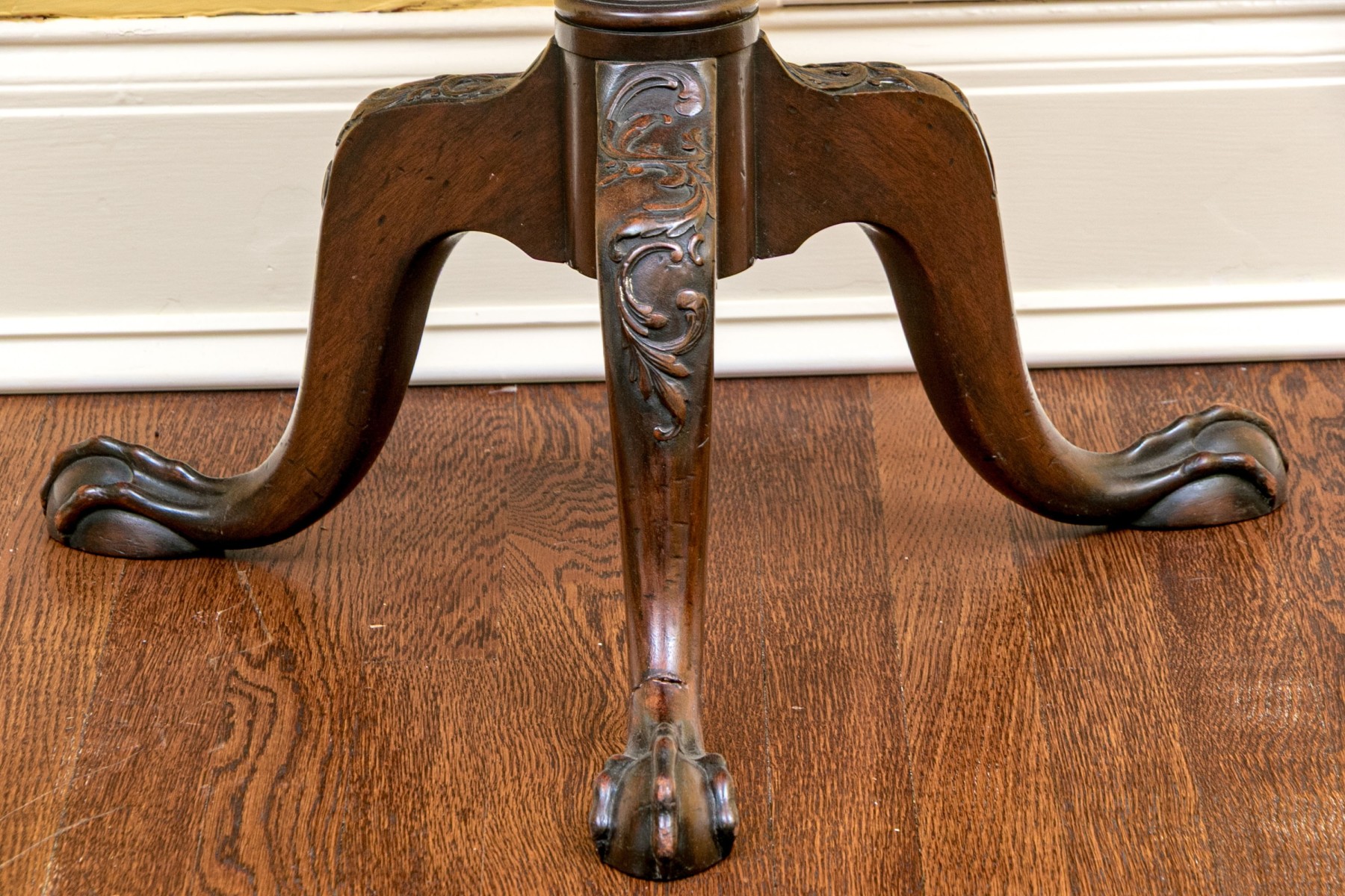Missing locking mechanism and peg to keep table top affixed to the pedestal. A crack or past repair to one foot. Despite wear still a very handsome piece.