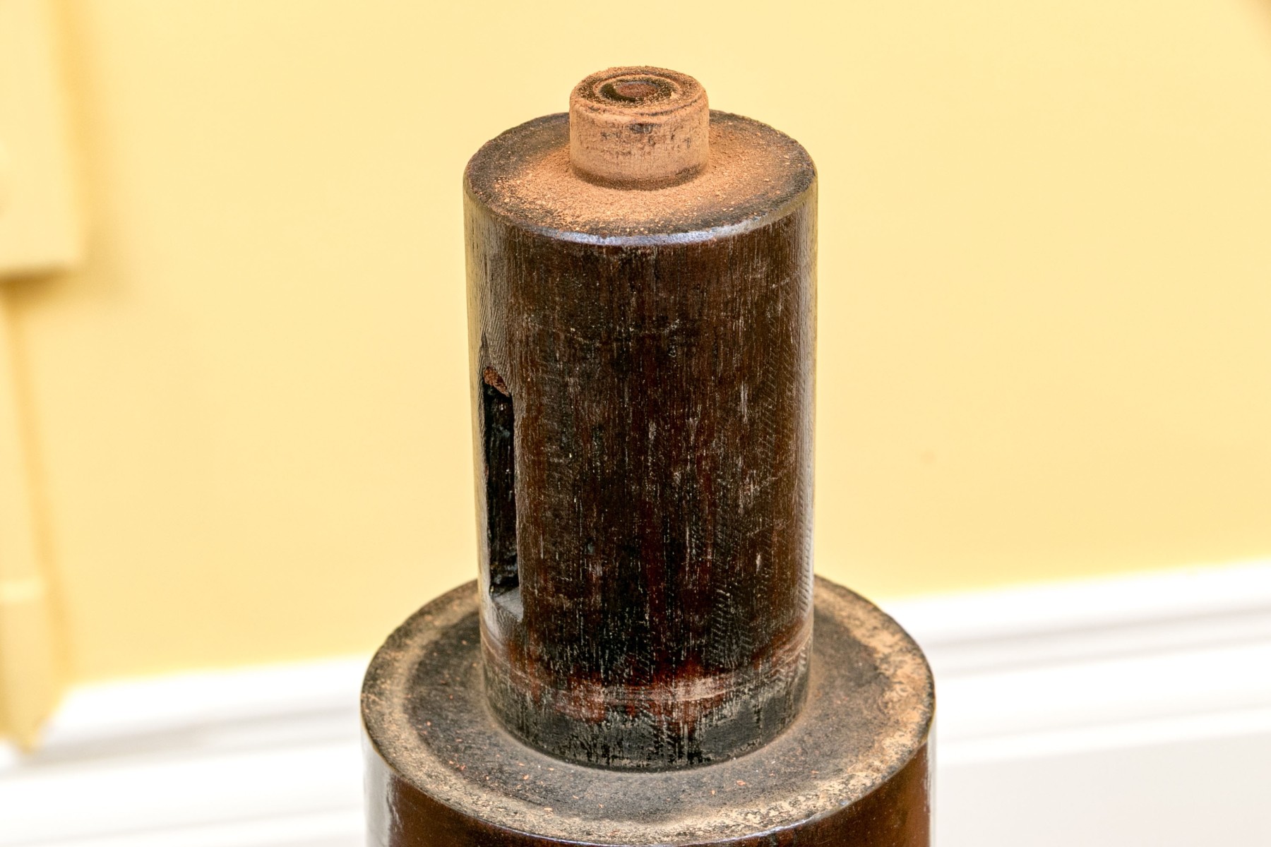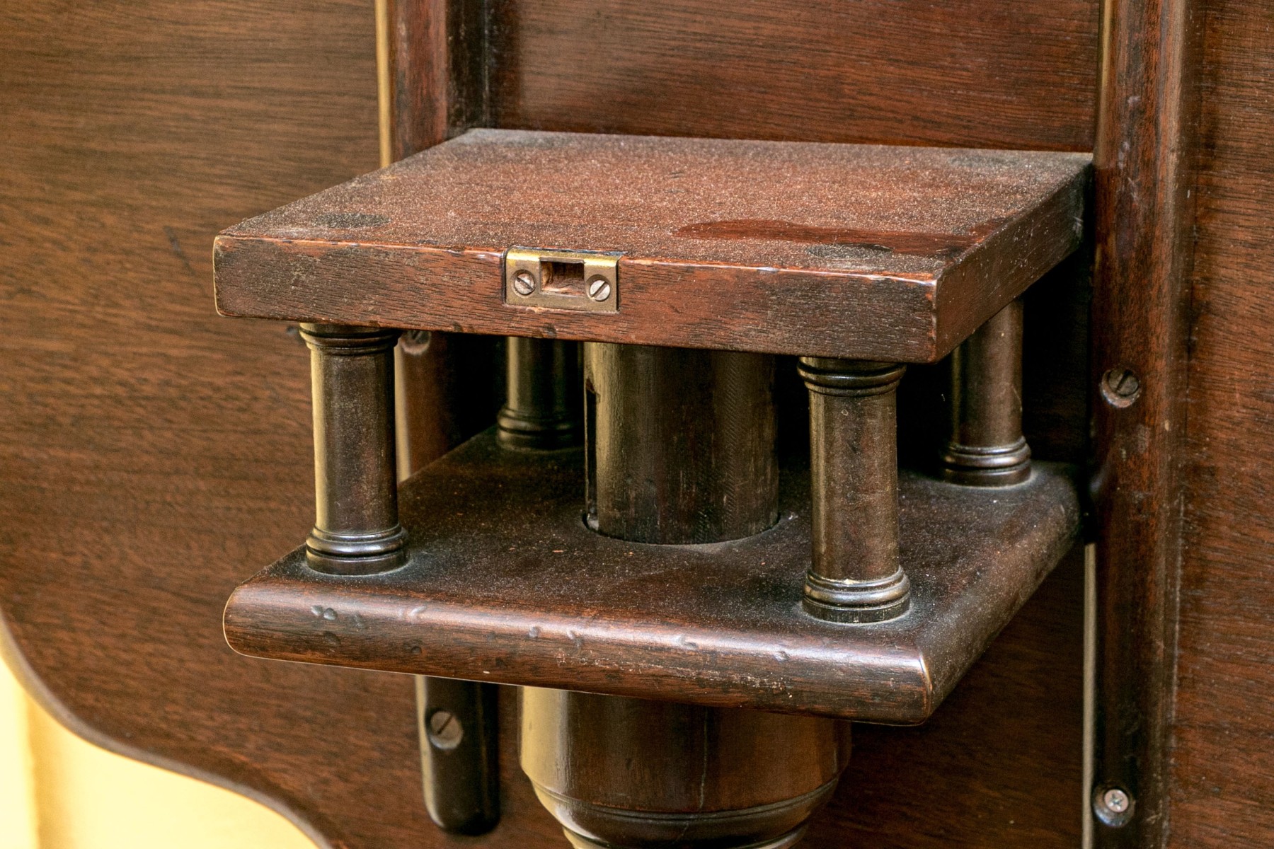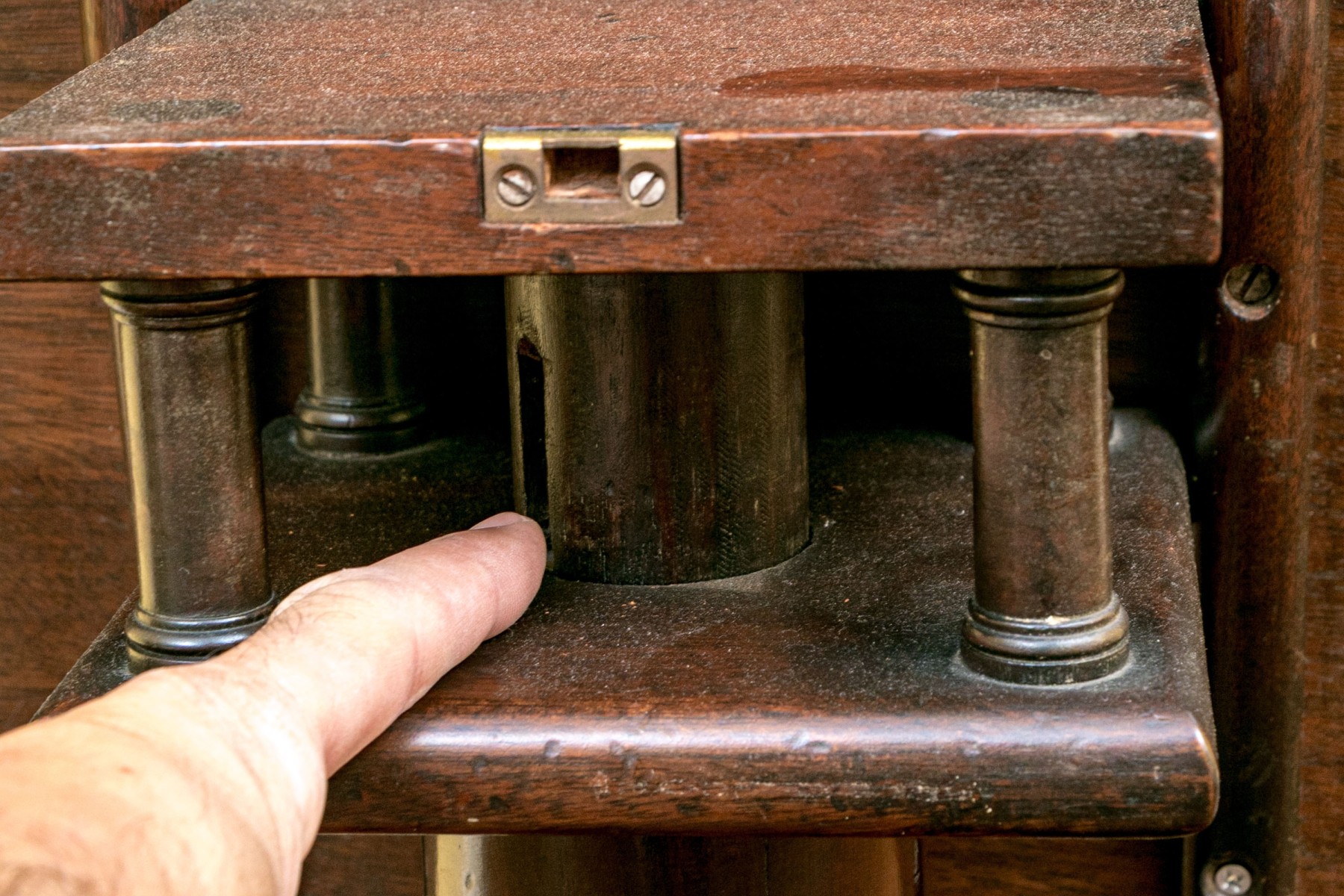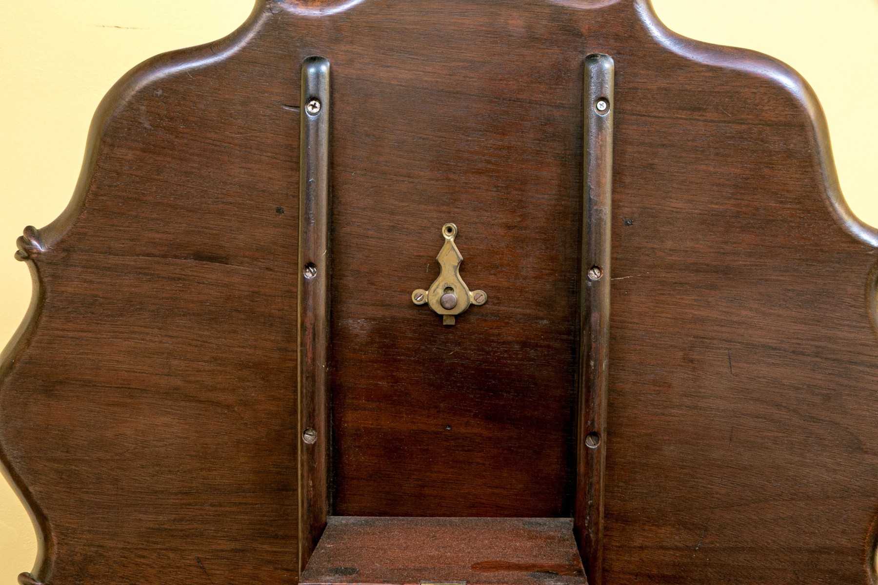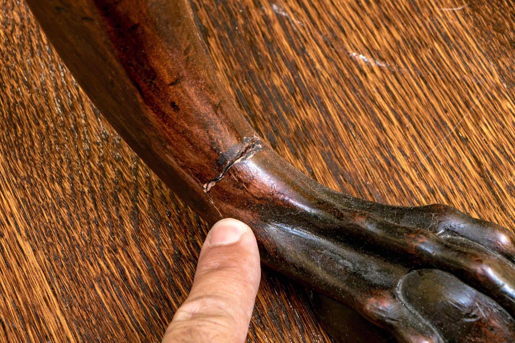 Missing locking mechanism and peg to keep table top affixed to the pedestal. A crack or past repair to one foot. Despite wear still a very handsome piece.