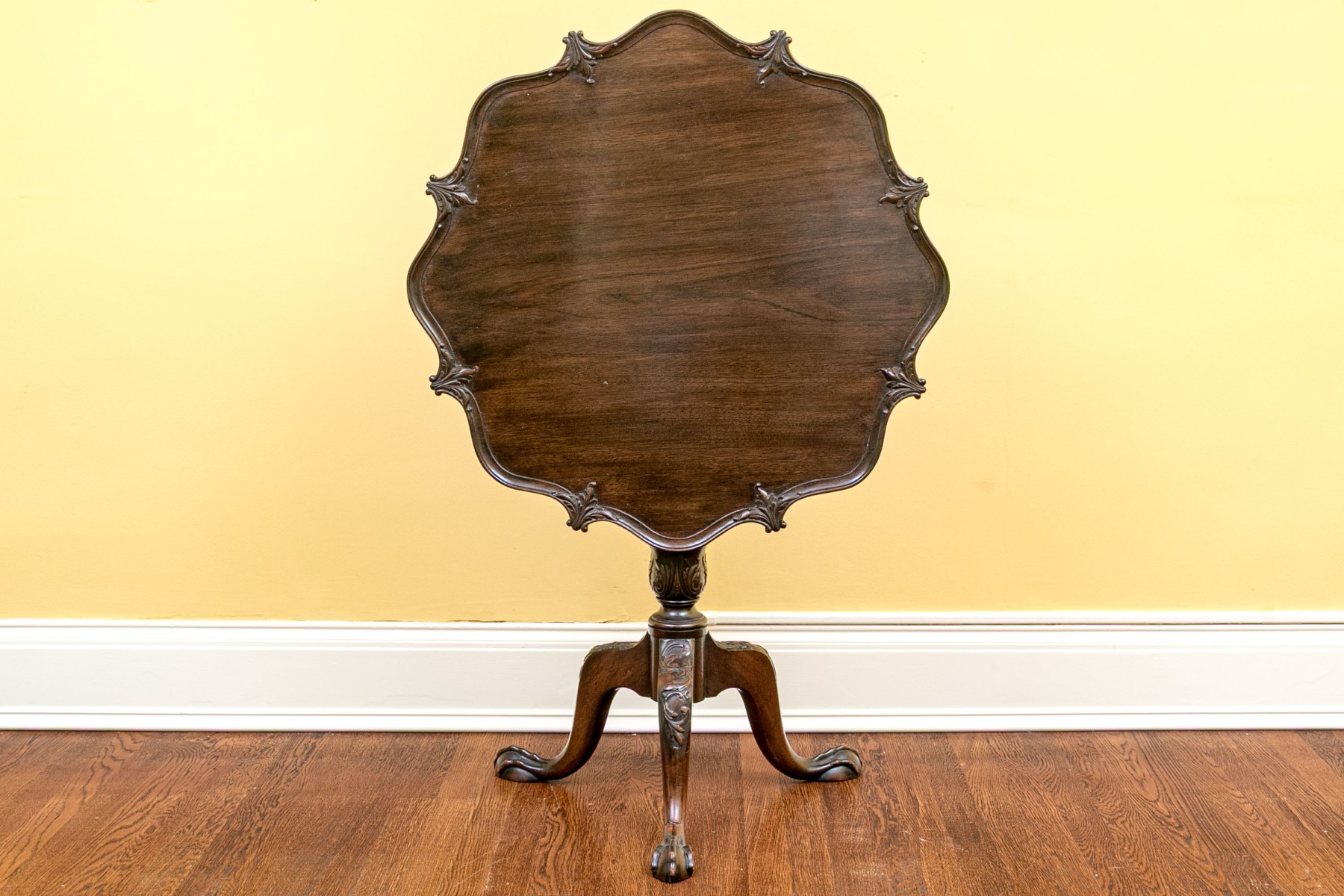 A gorgeous George III style tilt top table crafted in rich, medium-dark brown mahogany with an elegantly carved and scalloped trim around the top. Raised on a classic pedestal with a tripod of cabriole legs terminating with ball and claw feet.