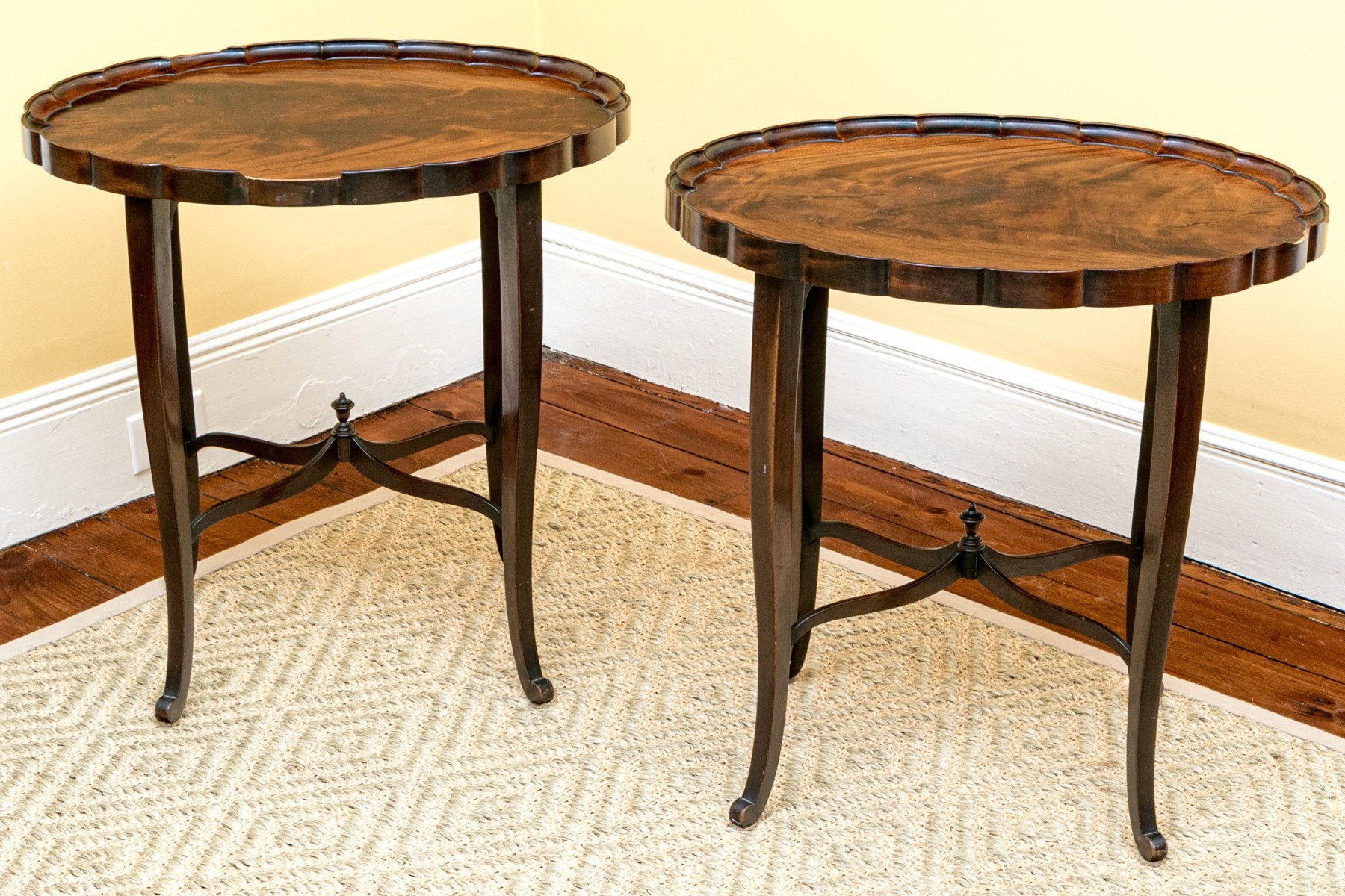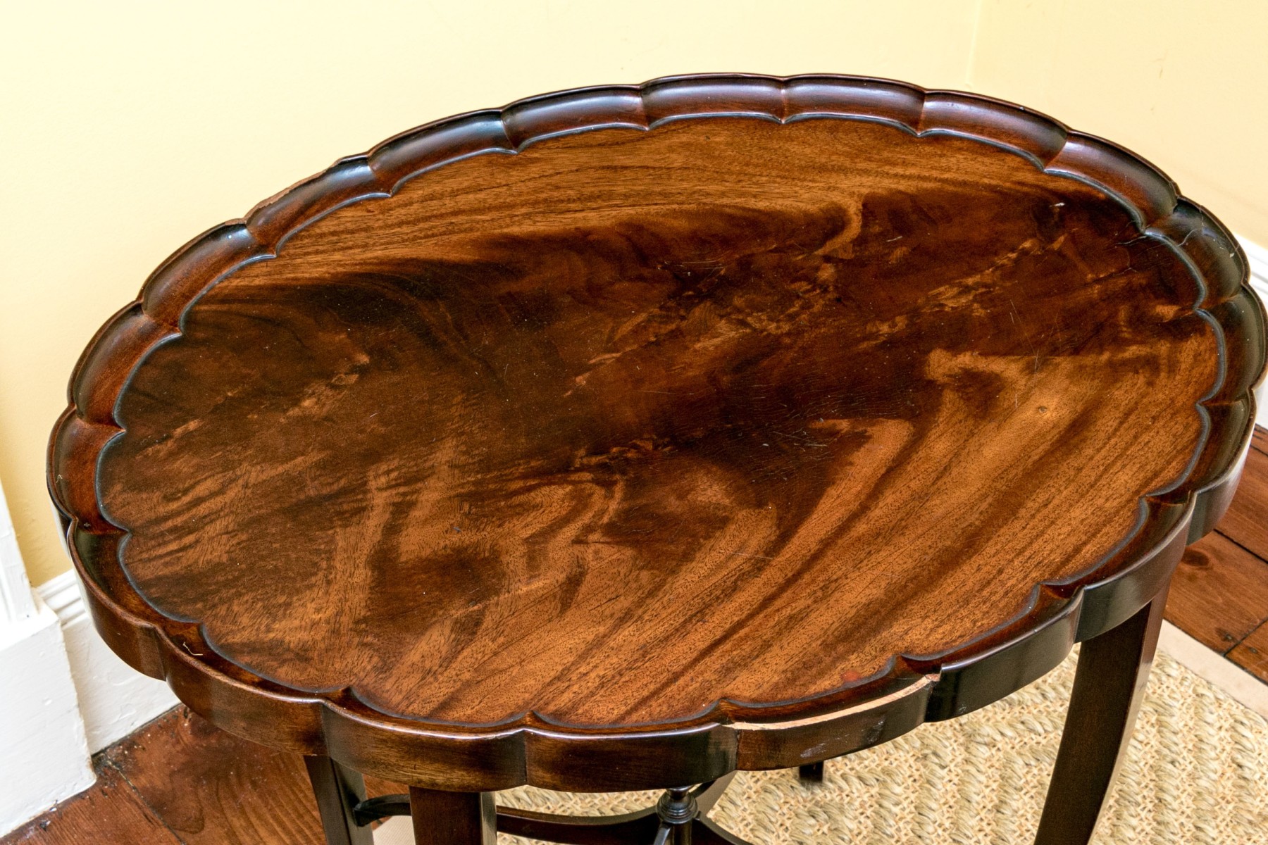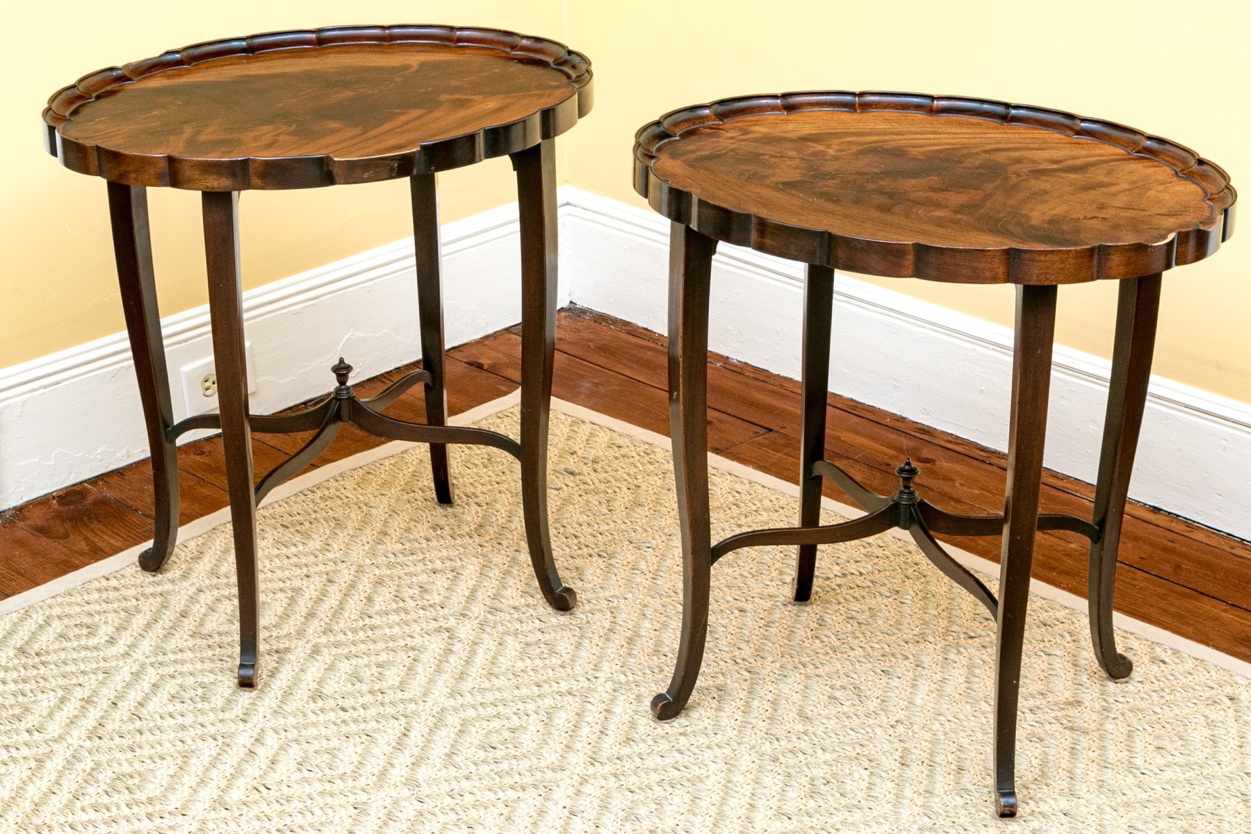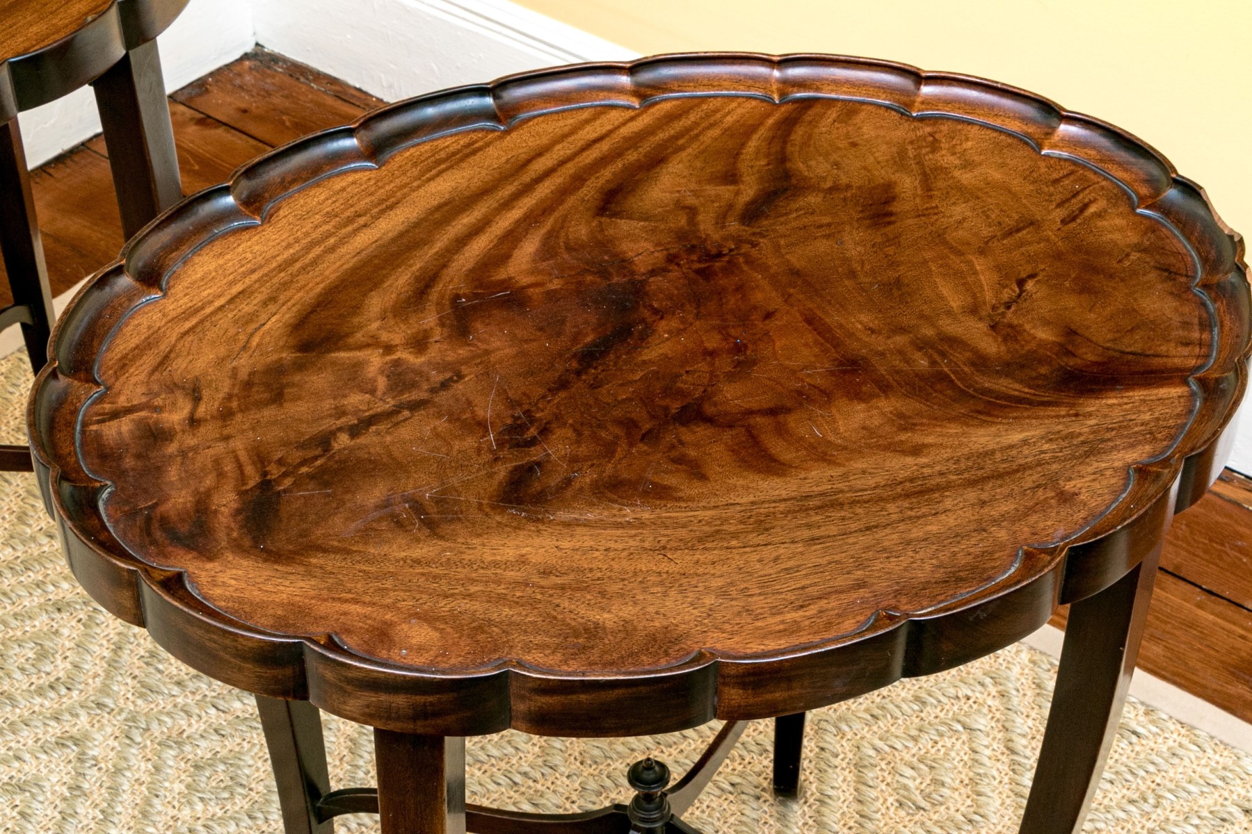 Both are raised upon four cabriole legs with carved X form stretcher supports with urn finials. Above are the oval form pie crust scalloped trimmed table tops with magnificent flame mahogany veneered table tops.