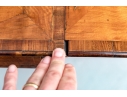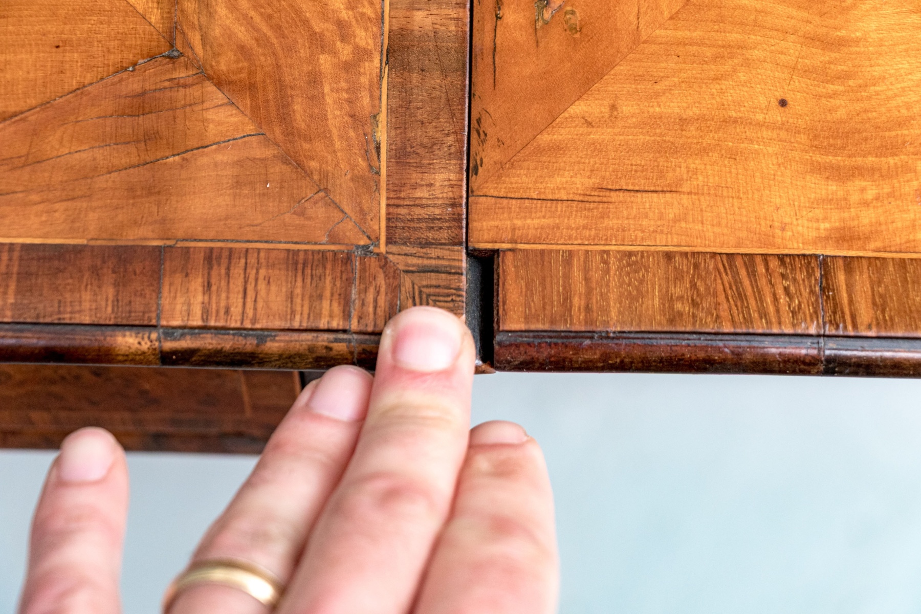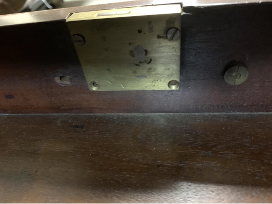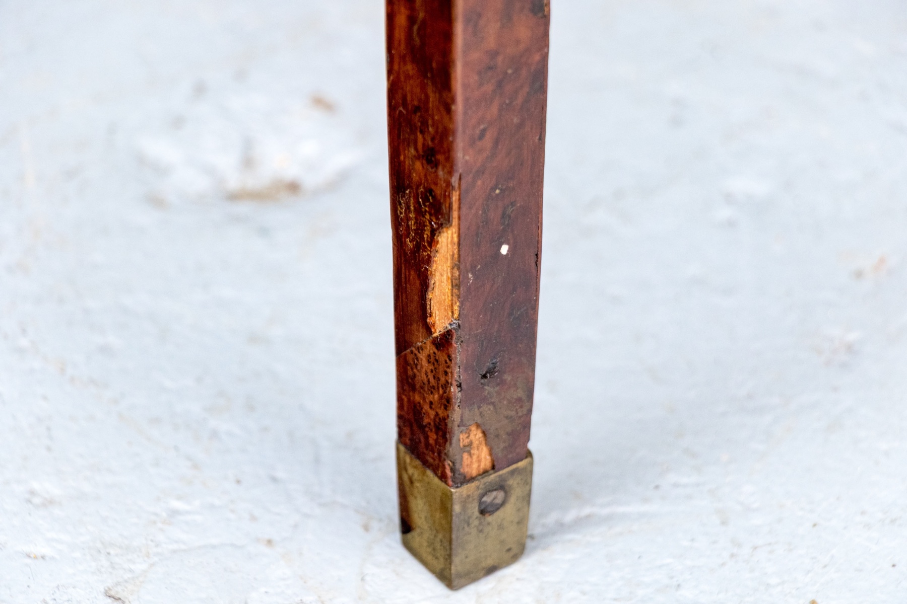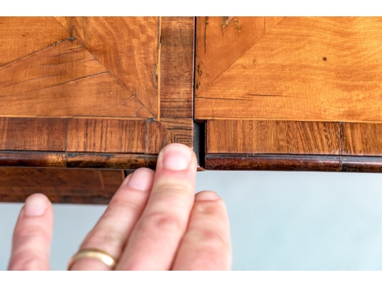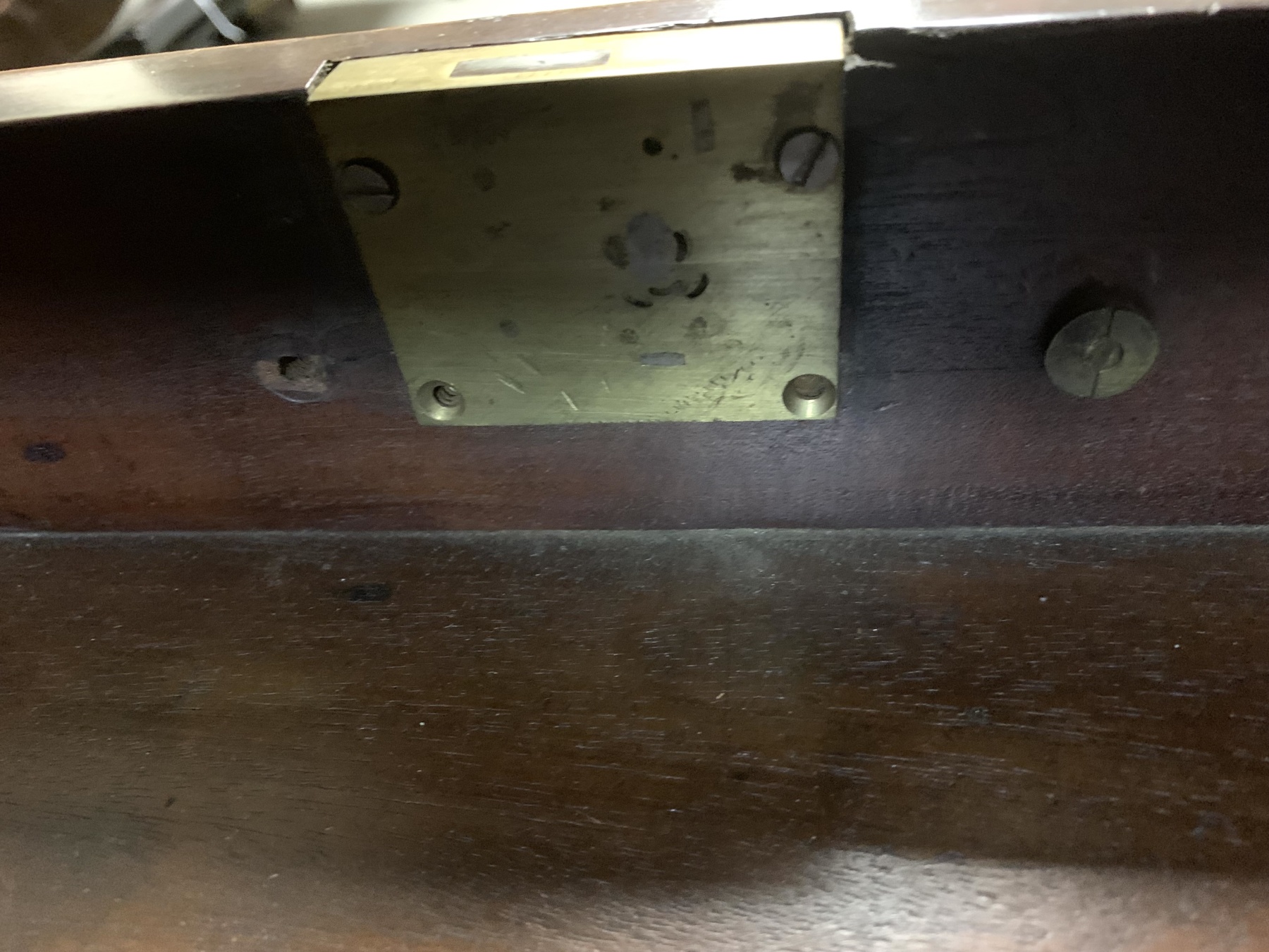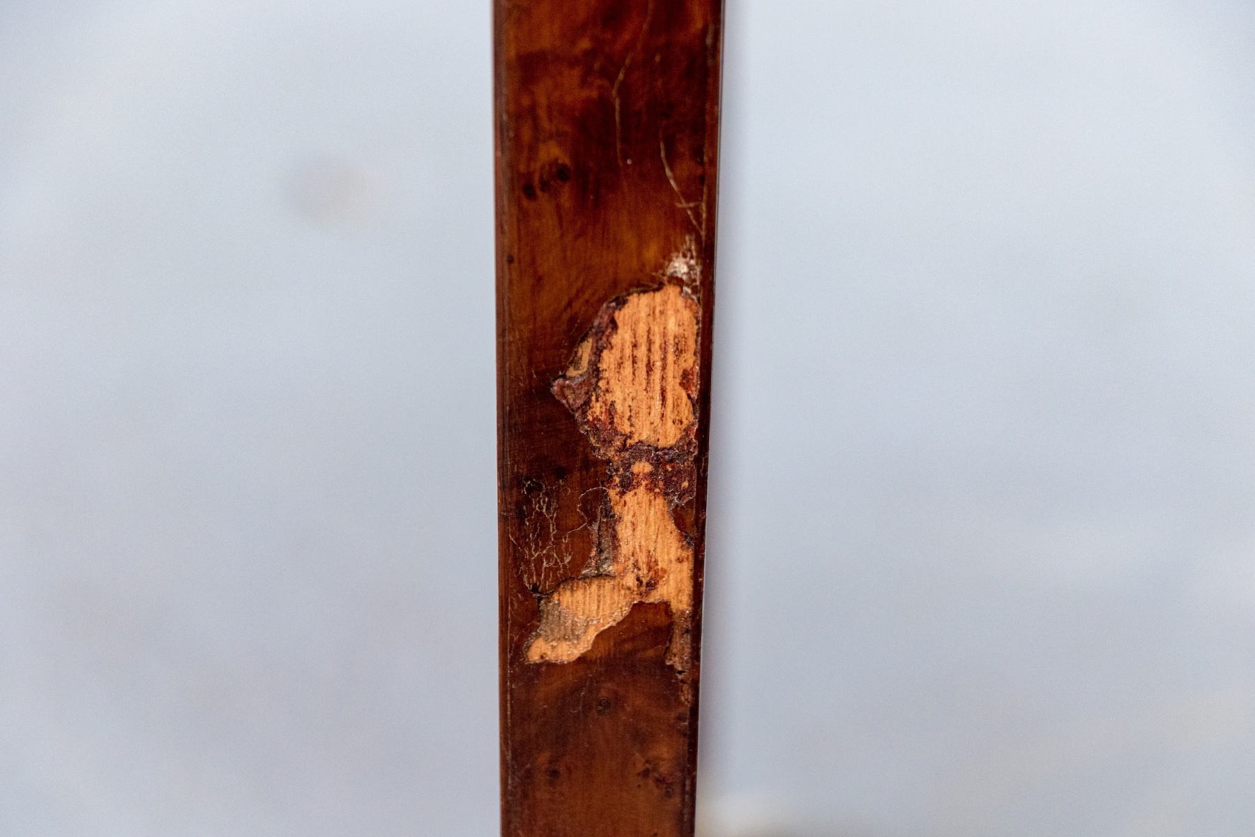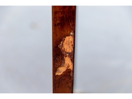 Condition: areas of loss, flaking, some veneer lifting, wood loss to the edge of right wing, tightening nut missing behind handle, small gouge to lower right leg. Lock mechanism is missing. Please see photos for details of condition.