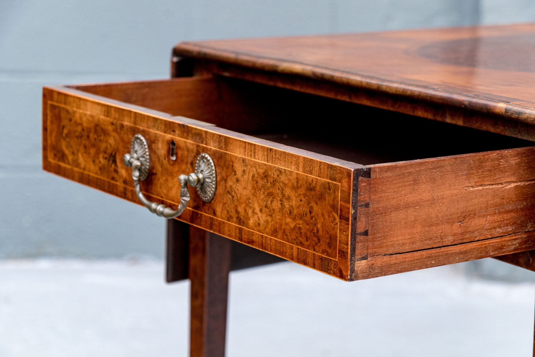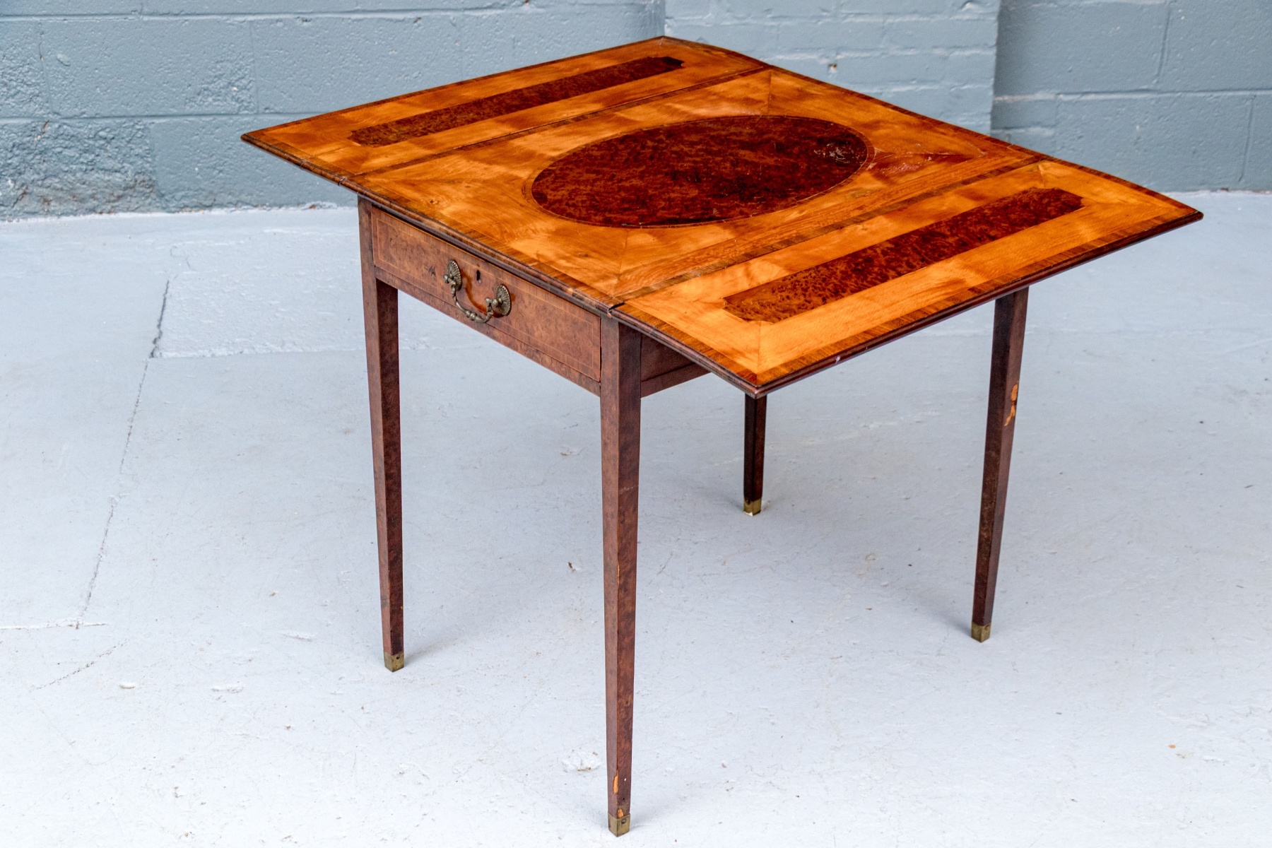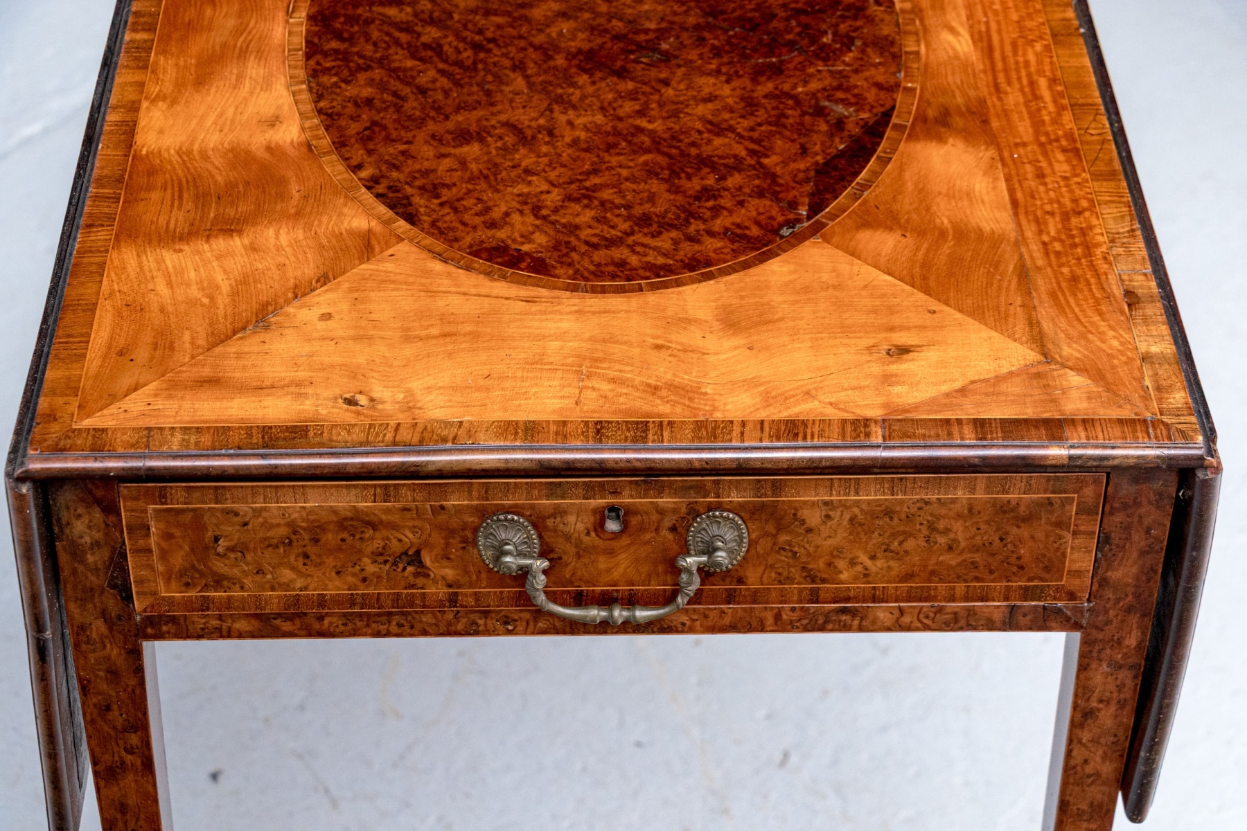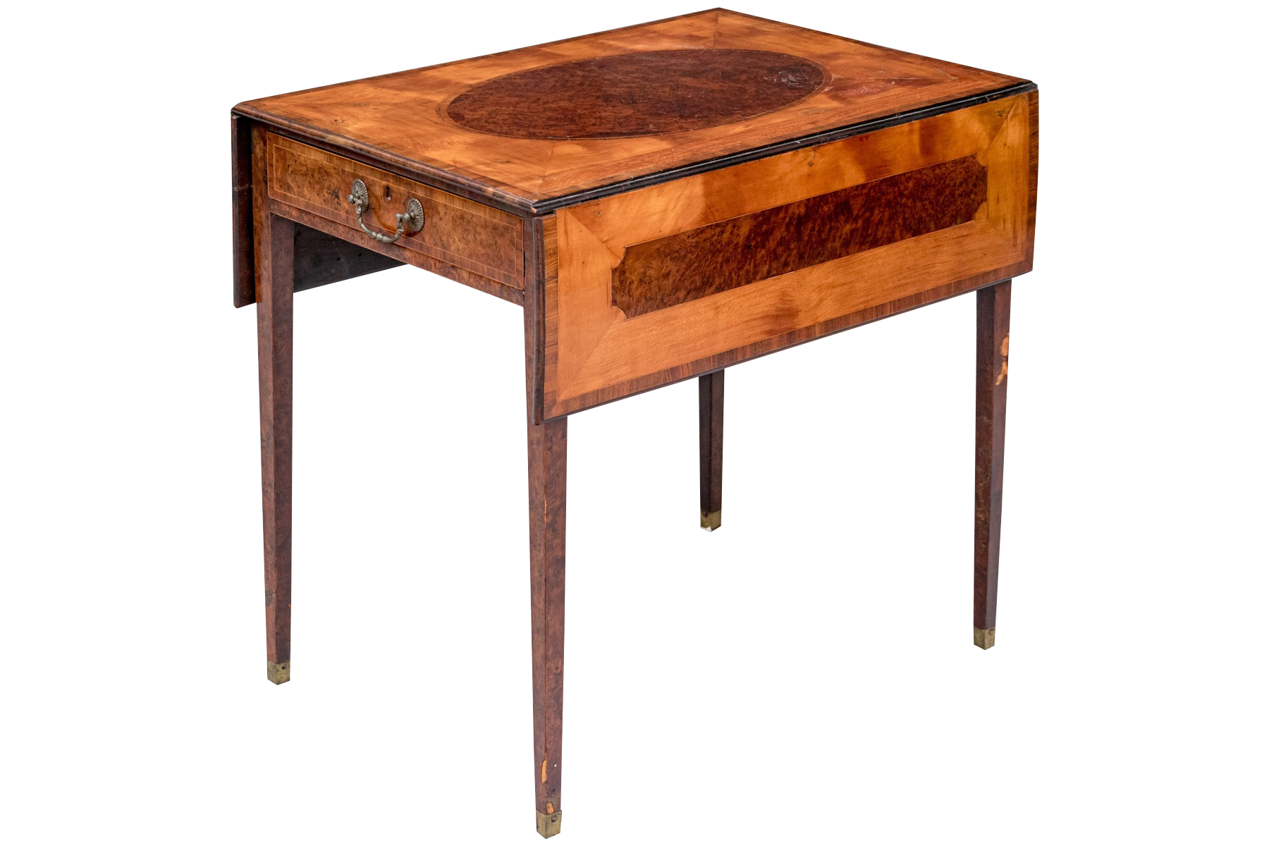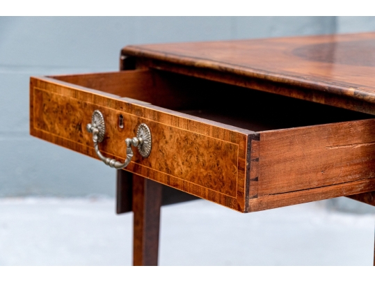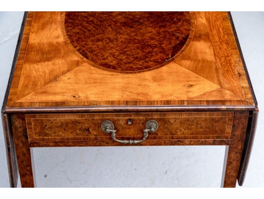A George III style cross banded pembroke table with oval center medallion and shaped vertical side panels all with inlaid banding, string inlay and cross banding. The table with a single frieze drawer, collared tapering legs and ending in brass capped feet. Each wing held by two bracket supports on each side making for a strong even surface.