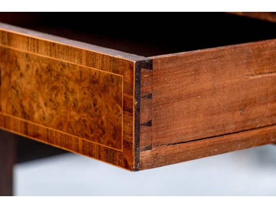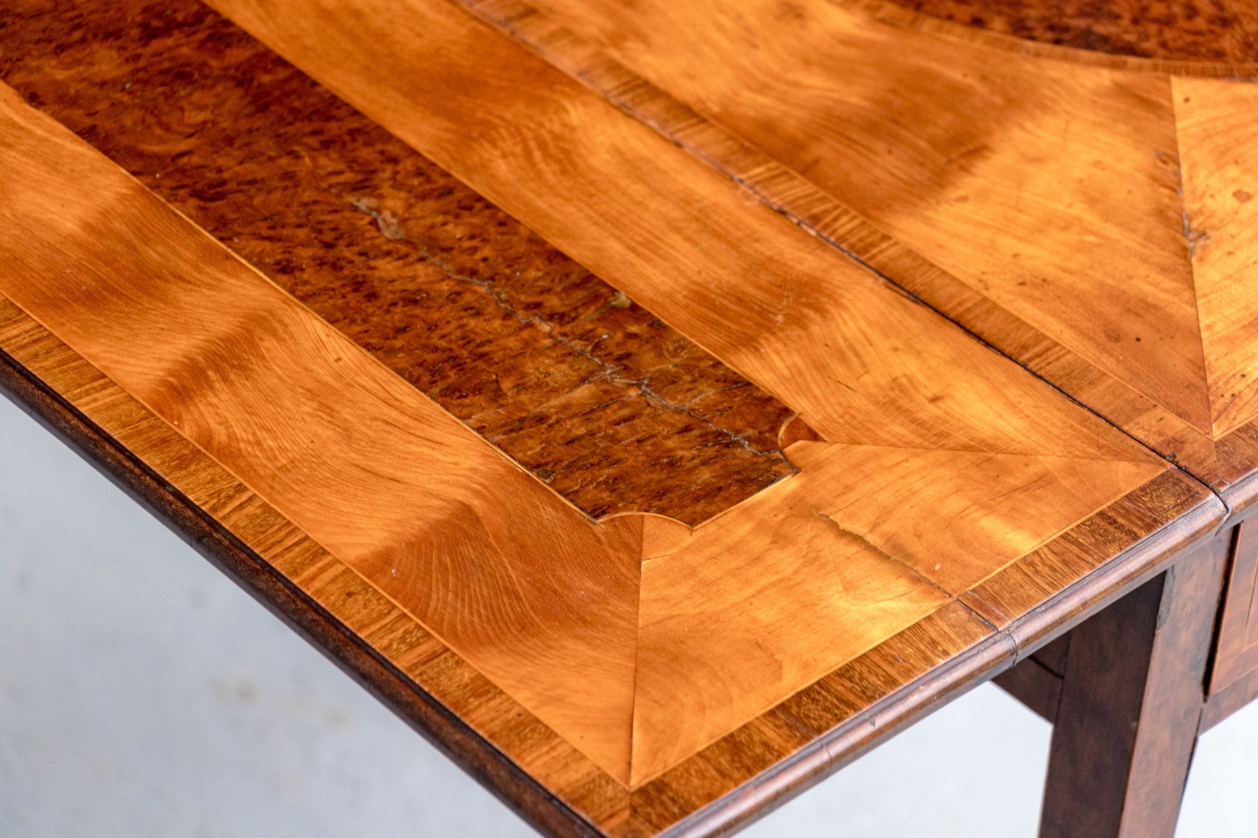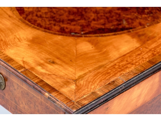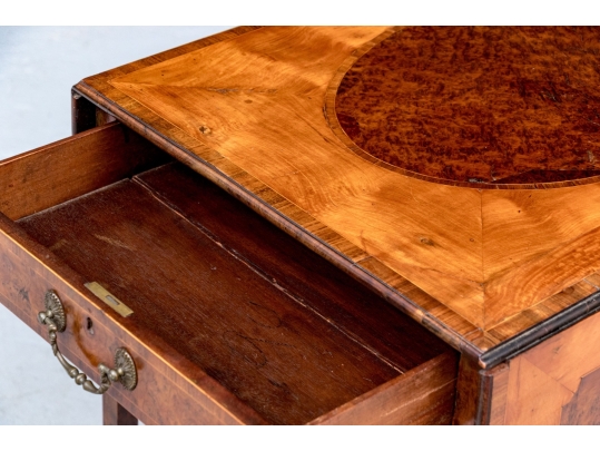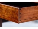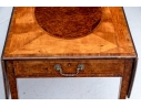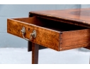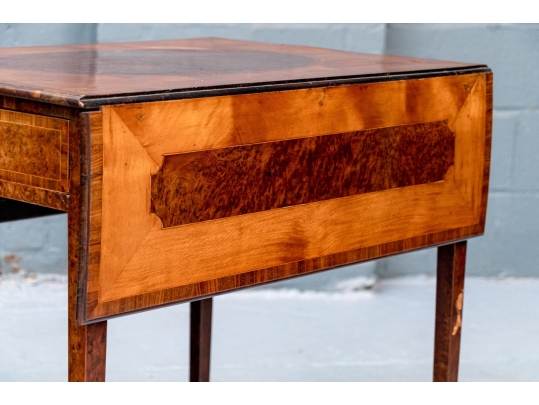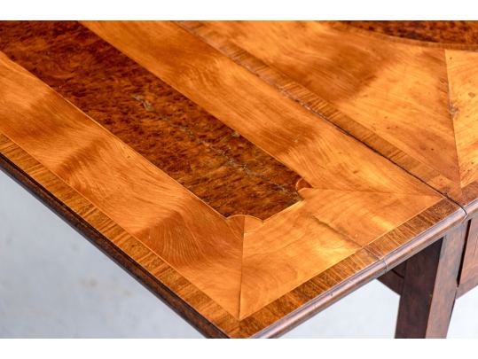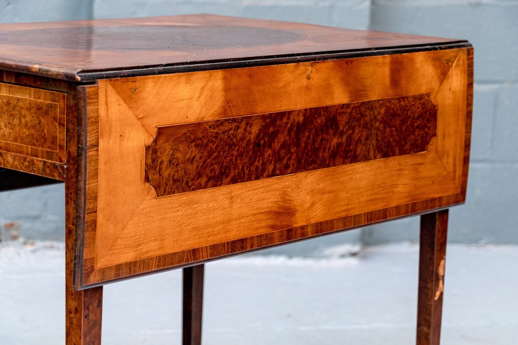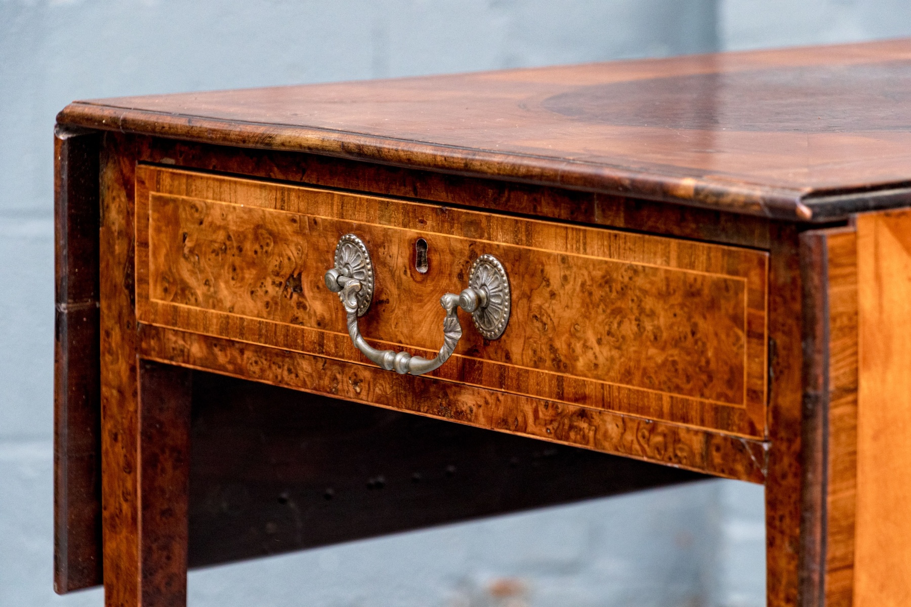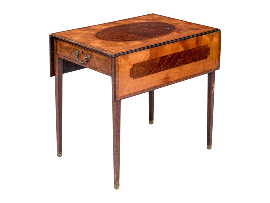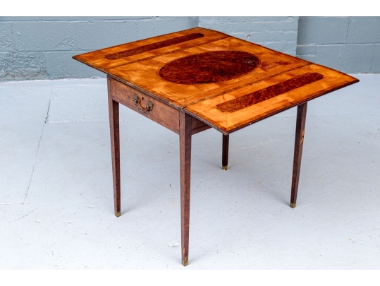 A George III style cross banded pembroke table with oval center medallion and shaped vertical side panels all with inlaid banding, string inlay and cross banding. The table with a single frieze drawer, collared tapering legs and ending in brass capped feet. Each wing held by two bracket supports on each side making for a strong even surface.