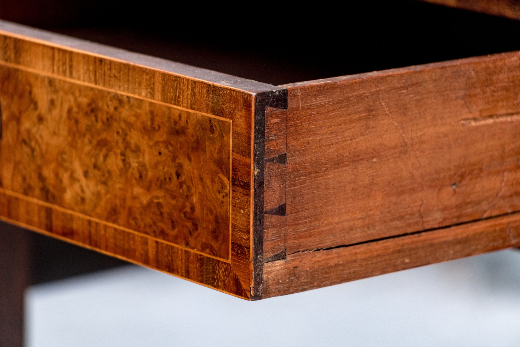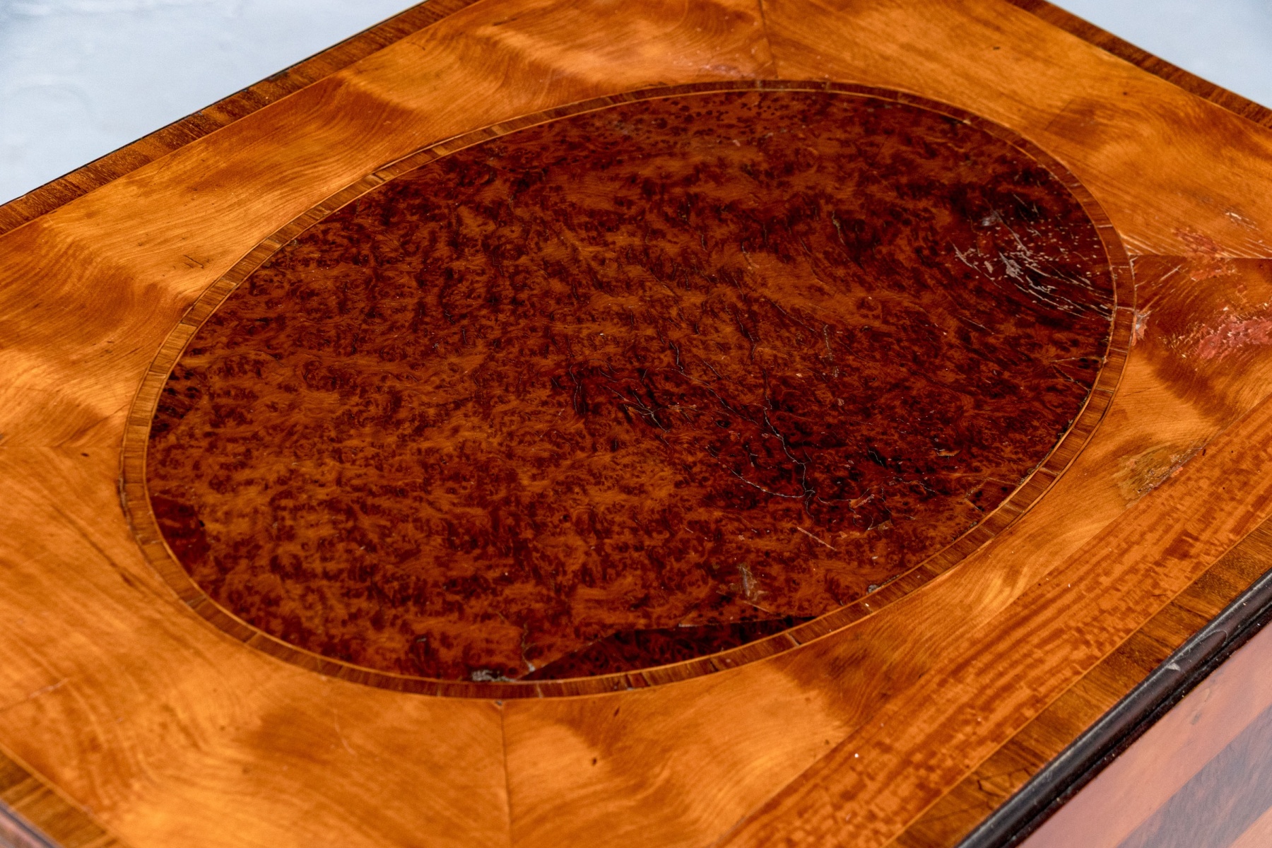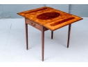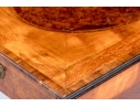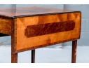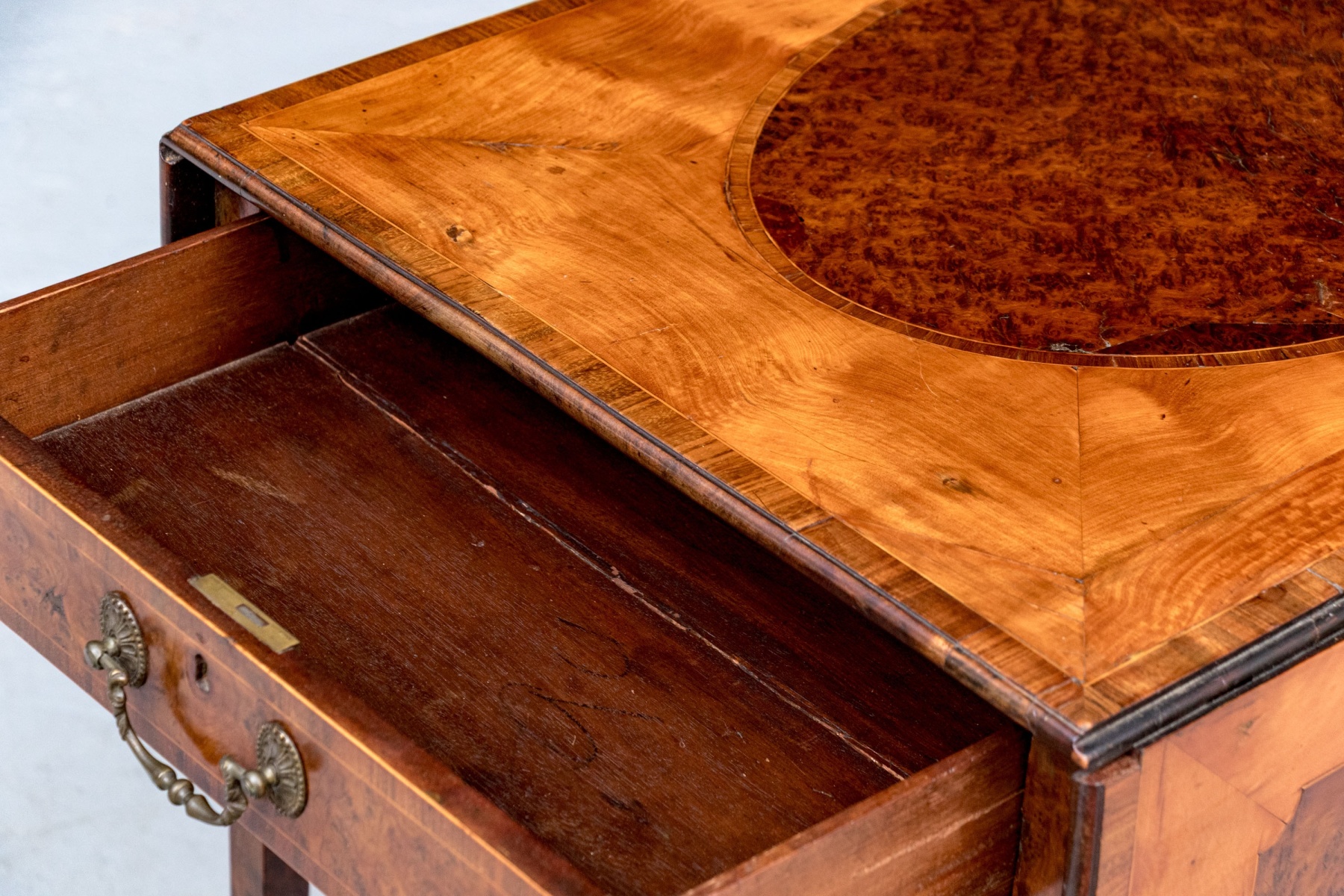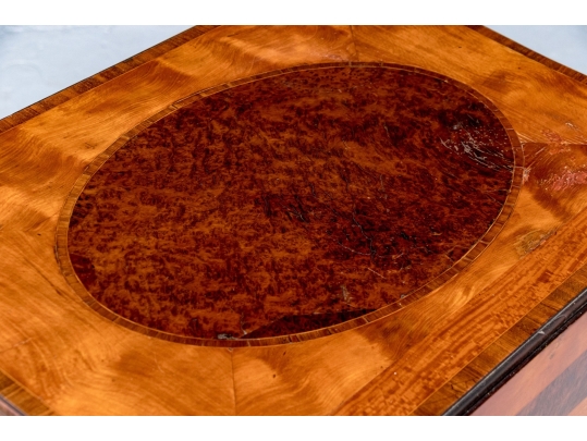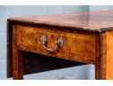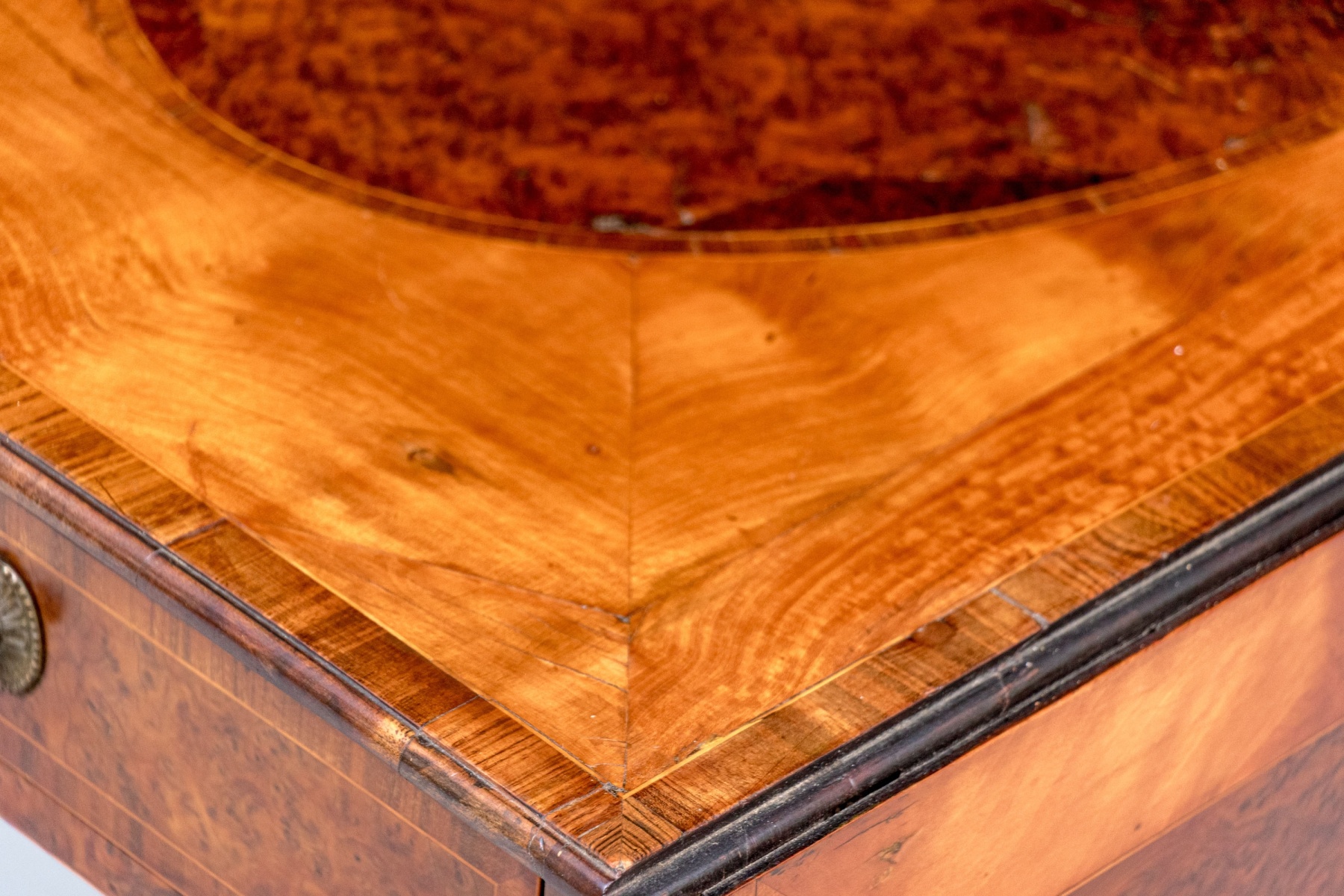 A George III style cross banded pembroke table with oval center medallion and shaped vertical side panels all with inlaid banding, string inlay and cross banding. The table with a single frieze drawer, collared tapering legs and ending in brass capped feet. Each wing held by two bracket supports on each side making for a strong even surface.