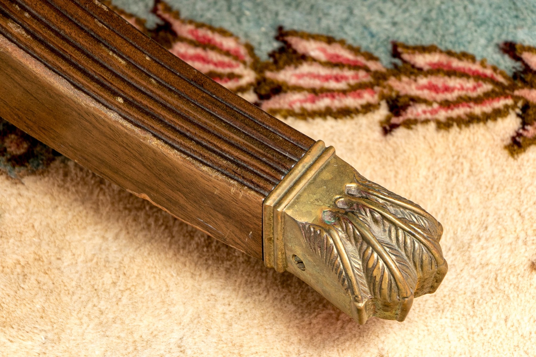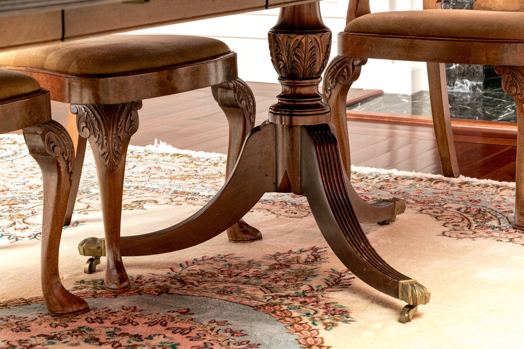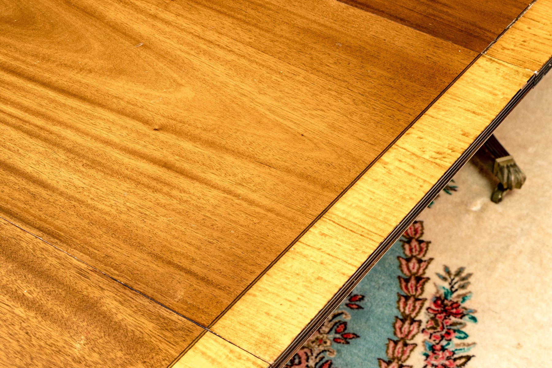 With two extension leaves and brass clips. The table stands on twin carved pedestals, each with three fluted legs terminating in paw form brass toe caps with casters.