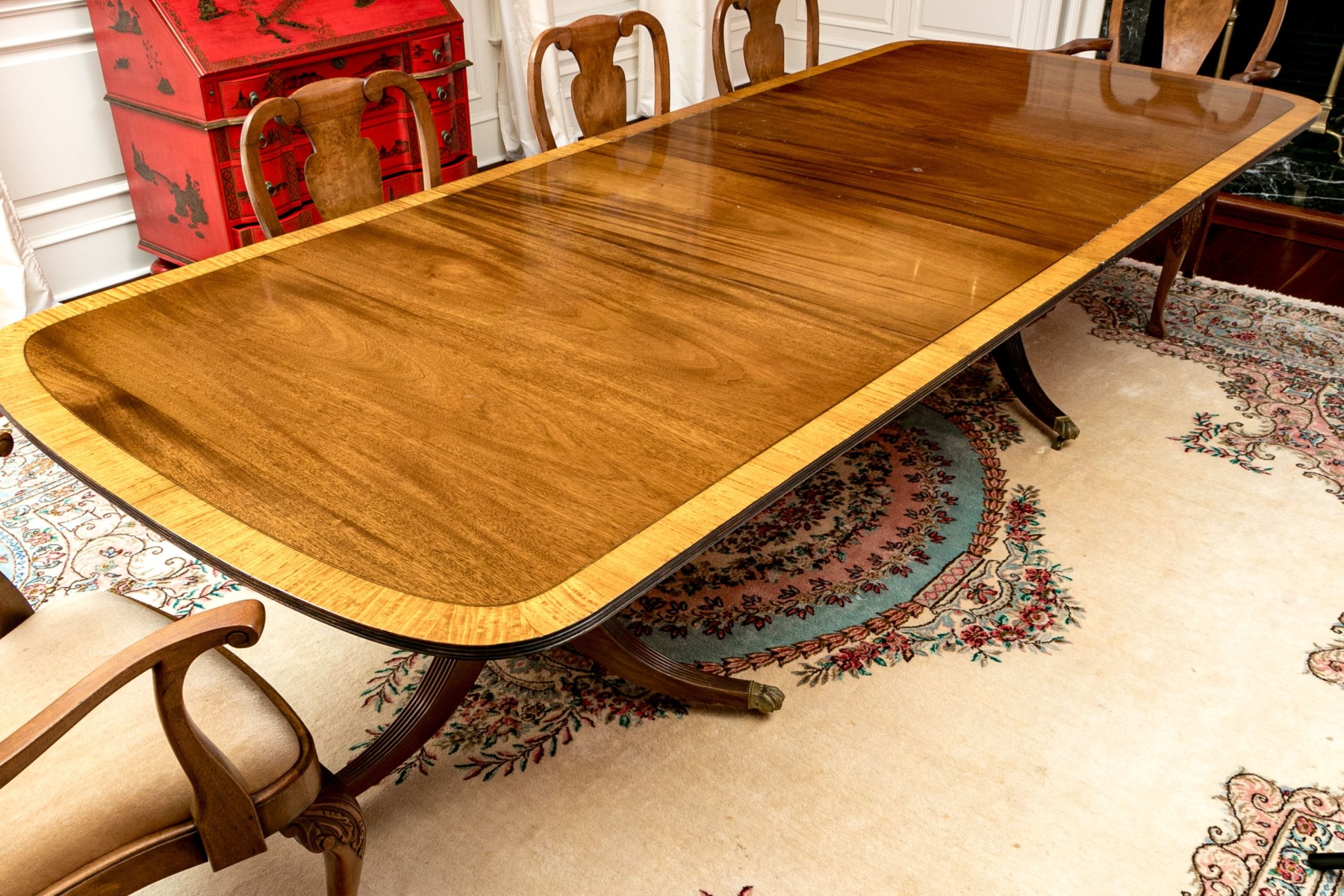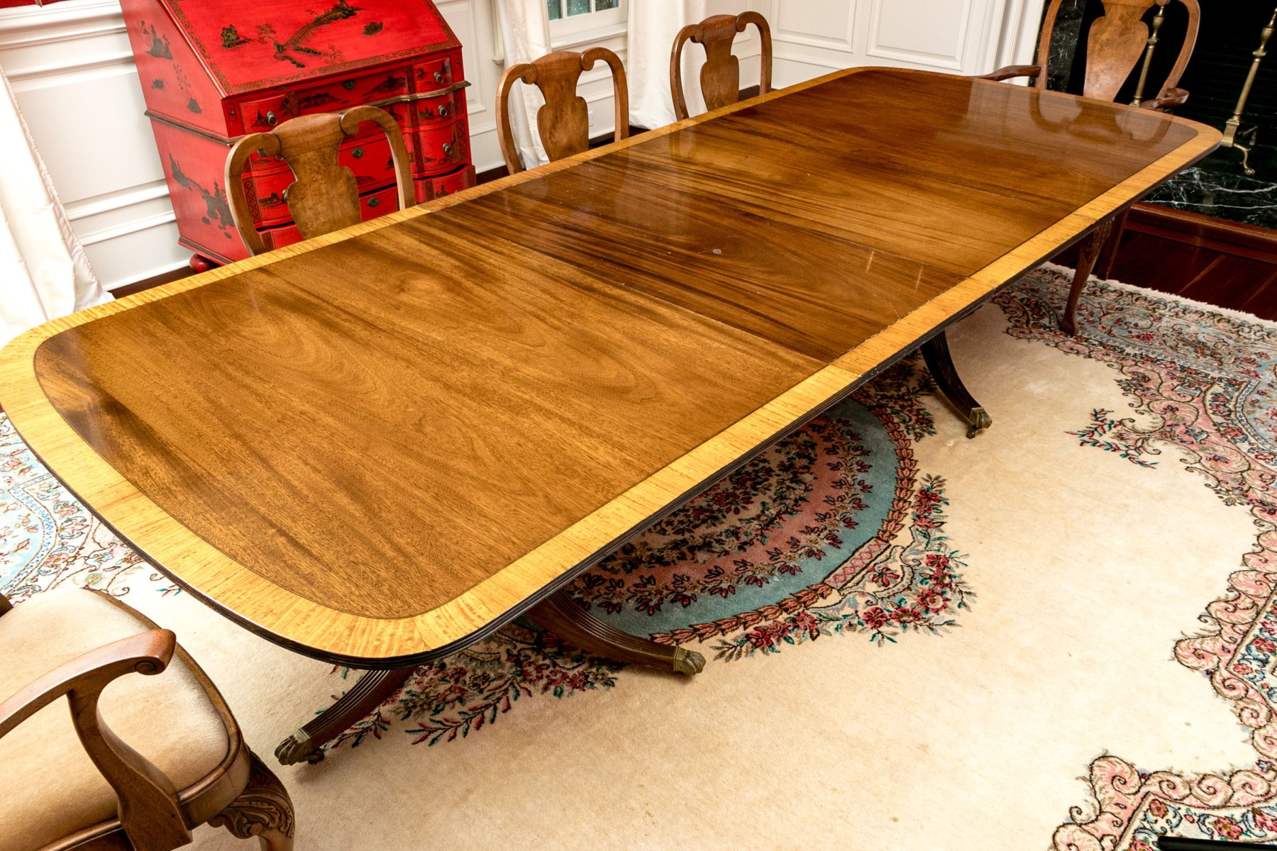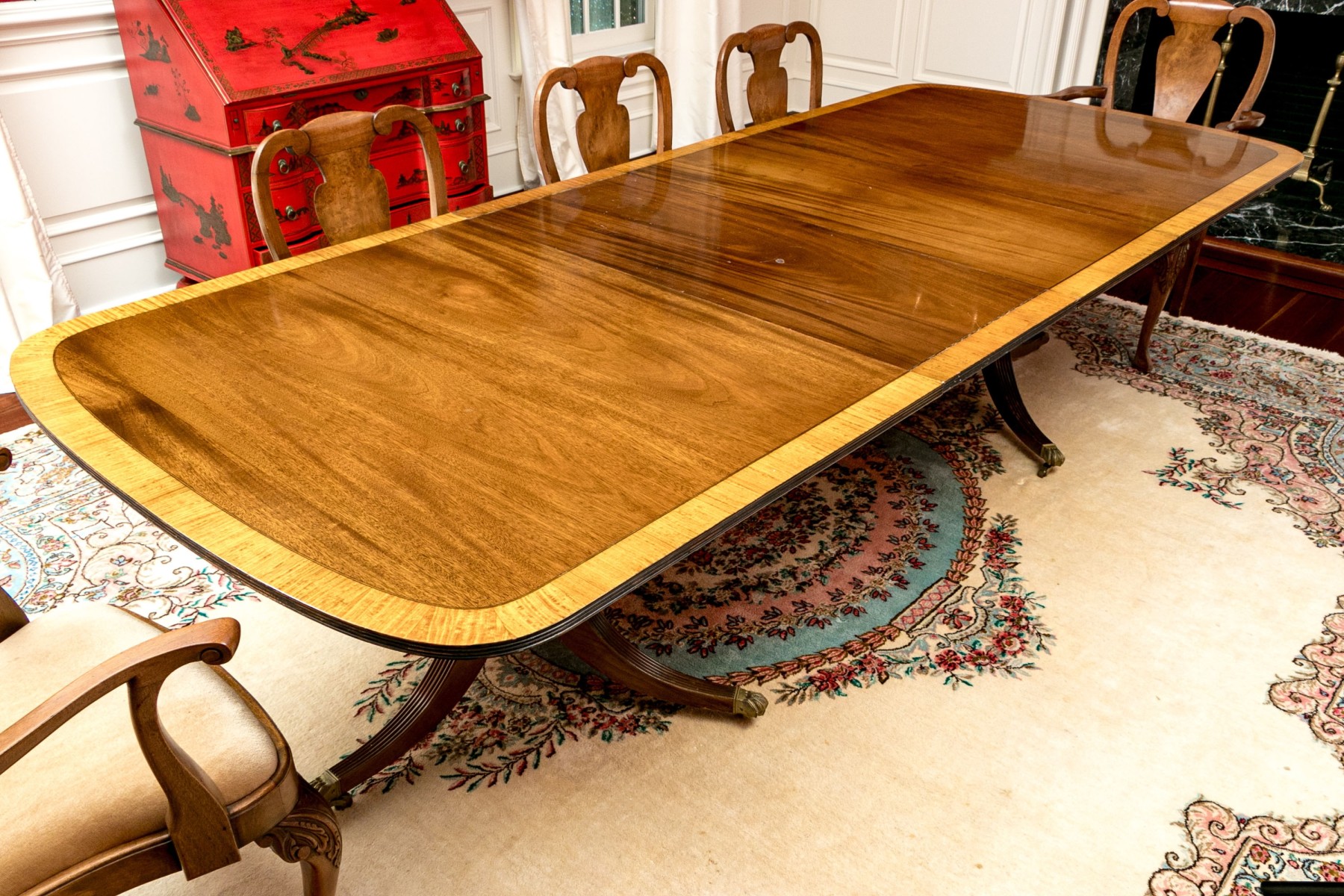 George III Style Twin Pedestal Satinwood Banded Mahogany Dining Table #345702. Black Rock Galleries provides high end estate liquidation services through online estate auctions and a 50,000 sq ft designer showroom. estate liquidator, estate sale, online auction, antiques, fine art, liquidation, clean outs, auction, consignment, interior design, fine jewelry, collectibles, appraisals, estate appraisals, estate services, decor, furniture, furniture consignment, antique center, consignment shop. We offer appraisal services and specialize in fine art, jewelry, antiques and decorative arts. Sell with us. Black Rock Galleries is the tri-state's largest estate liquidator serving New England and the greater New York City area. We are the trusted source for expert appraisals, auction services, estate sales, and consignments. Black Rock Galleries is the east coast's largest and most trusted estate liquidator, with locations in Connecticut, greater Boston, MA and Raleigh, NC, Fairfield, Southport, Apex, TX. We are the best source for expert appraisals, auction services, estate sales and consignments. We have served thousands of families and estates with compassion, professionalism and expertise. BRG works with attorneys, executors, realtors and families to bring the greatest return on personal and estate property in the current market. Our unique combination of services make us the easy choice to get the job done in a timely and stress-free manner. We are with you from the initial consultation to the final clean out. Our house-built online auction software platform offers clients a dynamic approach to liquidating their personal property. This venue is most successful in bringing the best return with the least amount of disruption for our clients. See our services page for a complete description of this offering. George III Style Twin Pedestal Satinwood Banded Mahogany Dining Table #345702