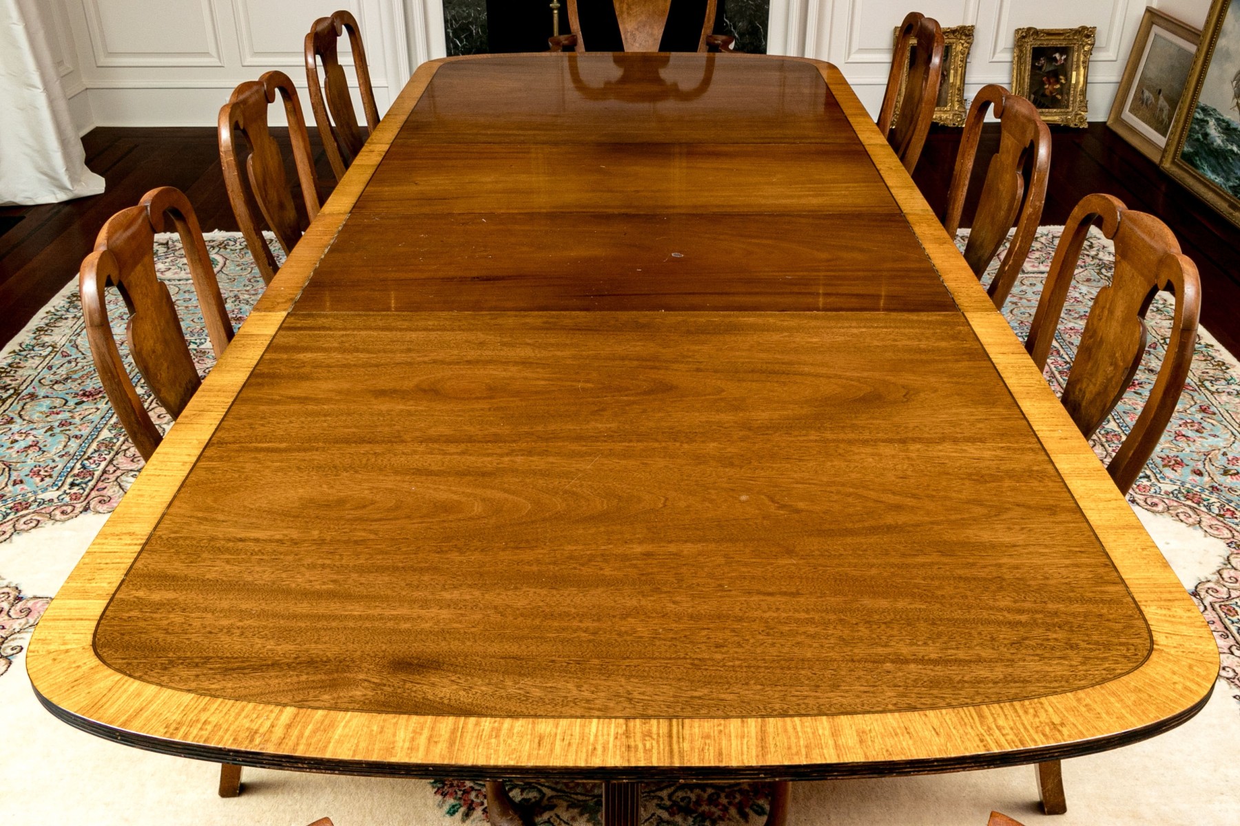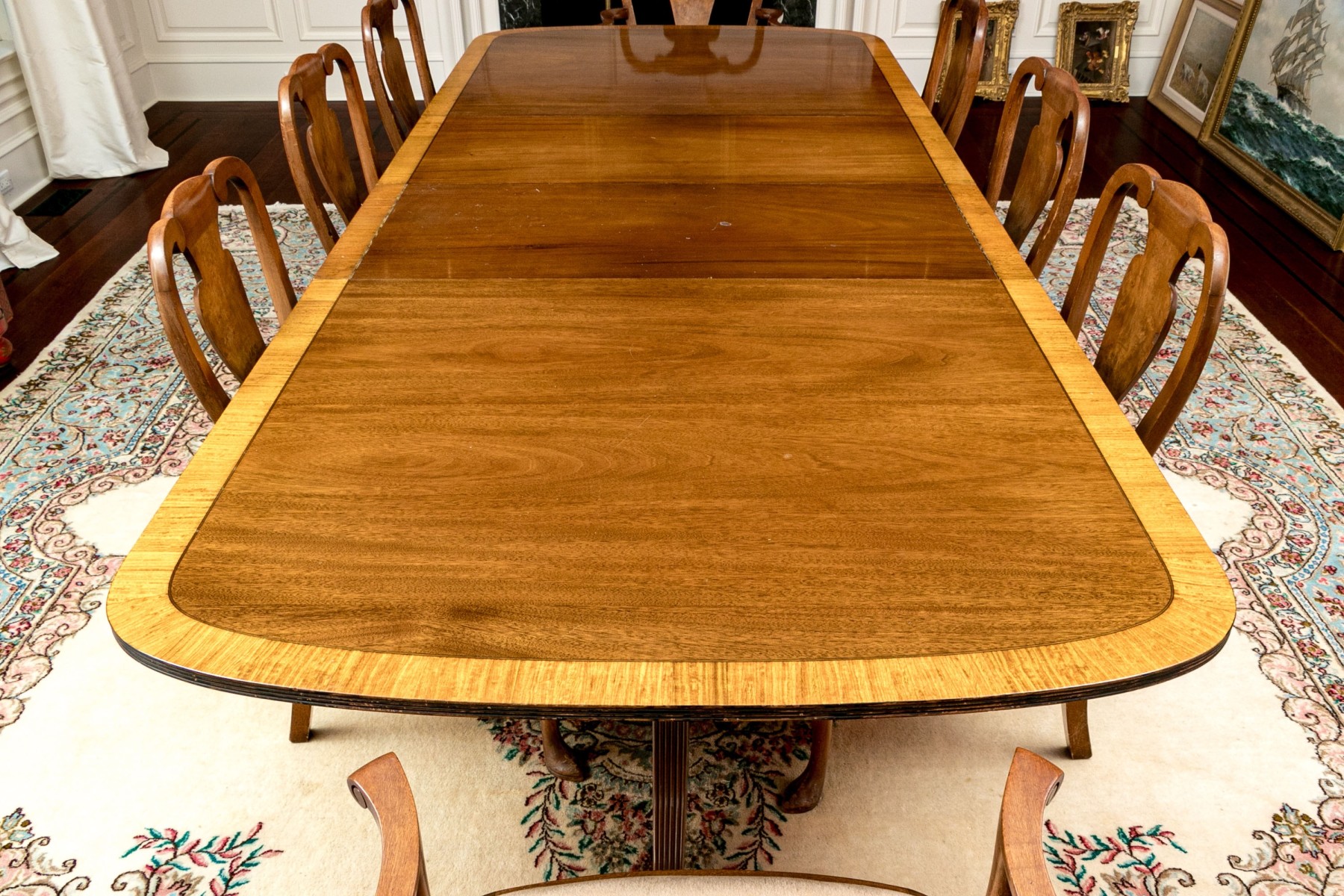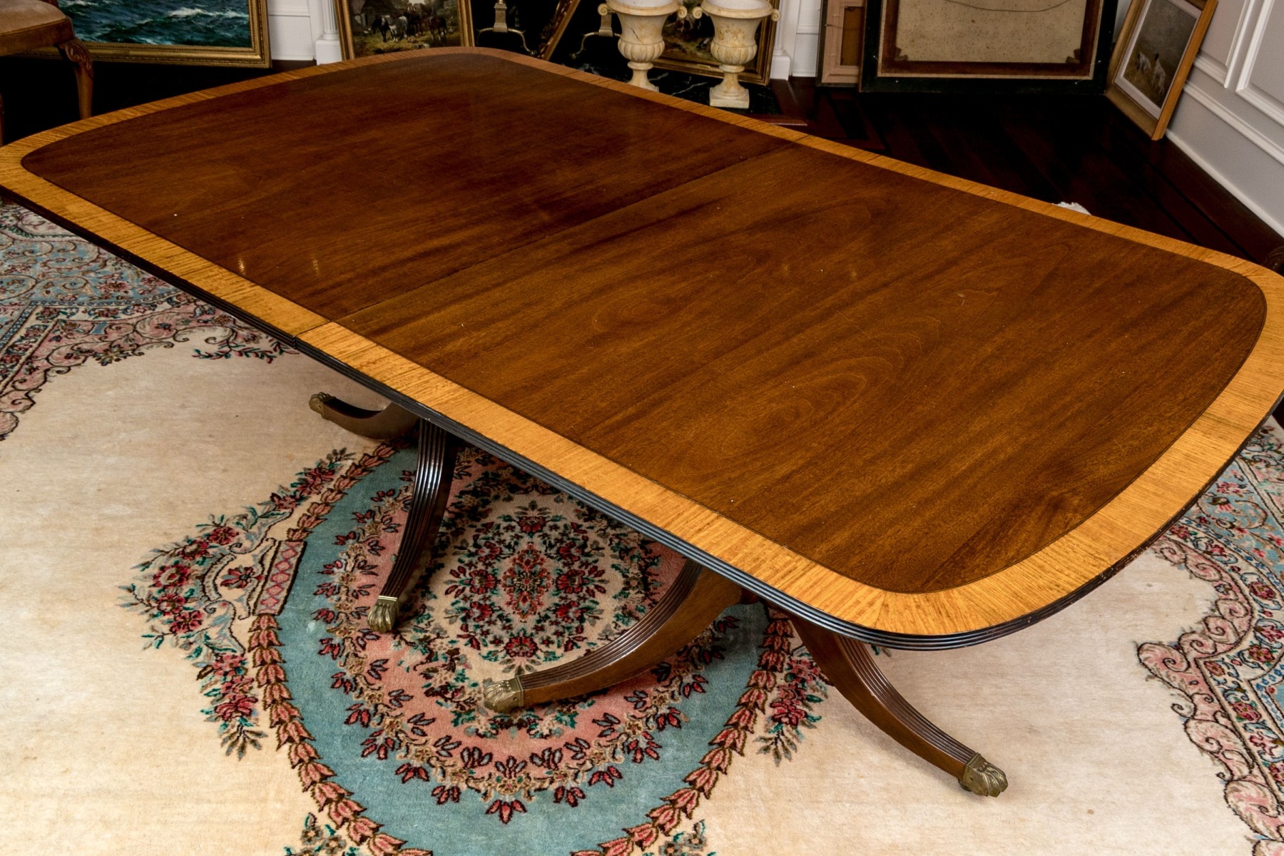 George III Style Twin Pedestal Satinwood Banded Mahogany Dining Table #345702. Black Rock Galleries provides high end estate liquidation services through online estate auctions and a 50,000 sq ft designer showroom. estate liquidator, estate sale, online auction, antiques, fine art, liquidation, clean outs, auction, consignment, interior design, fine jewelry, collectibles, appraisals, estate appraisals, estate services, decor, furniture, furniture consignment, antique center, consignment shop. We offer appraisal services and specialize in fine art, jewelry, antiques and decorative arts. Sell with us. Black Rock Galleries is the tri-state's largest estate liquidator serving New England and the greater New York City area. We are the trusted source for expert appraisals, auction services, estate sales, and consignments. Black Rock Galleries is the east coast's largest and most trusted estate liquidator, with locations in Connecticut, greater Boston, MA and Raleigh, NC, Fairfield, Southport, Apex, TX. We are the best source for expert appraisals, auction services, estate sales and consignments. We have served thousands of families and estates with compassion, professionalism and expertise. BRG works with attorneys, executors, realtors and families to bring the greatest return on personal and estate property in the current market. Our unique combination of services make us the easy choice to get the job done in a timely and stress-free manner. We are with you from the initial consultation to the final clean out. Our house-built online auction software platform offers clients a dynamic approach to liquidating their personal property. This venue is most successful in bringing the best return with the least amount of disruption for our clients. See our services page for a complete description of this offering. George III Style Twin Pedestal Satinwood Banded Mahogany Dining Table #345702