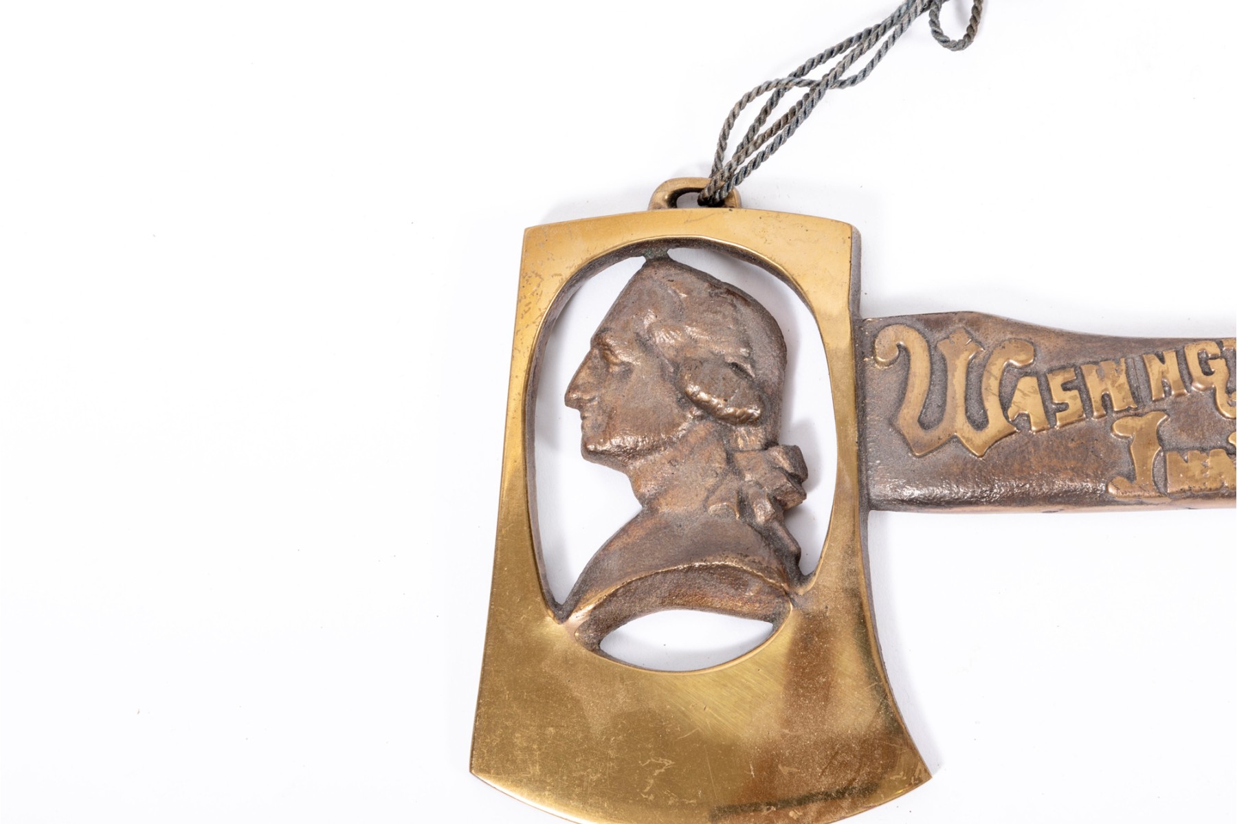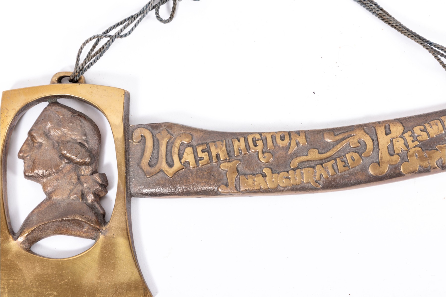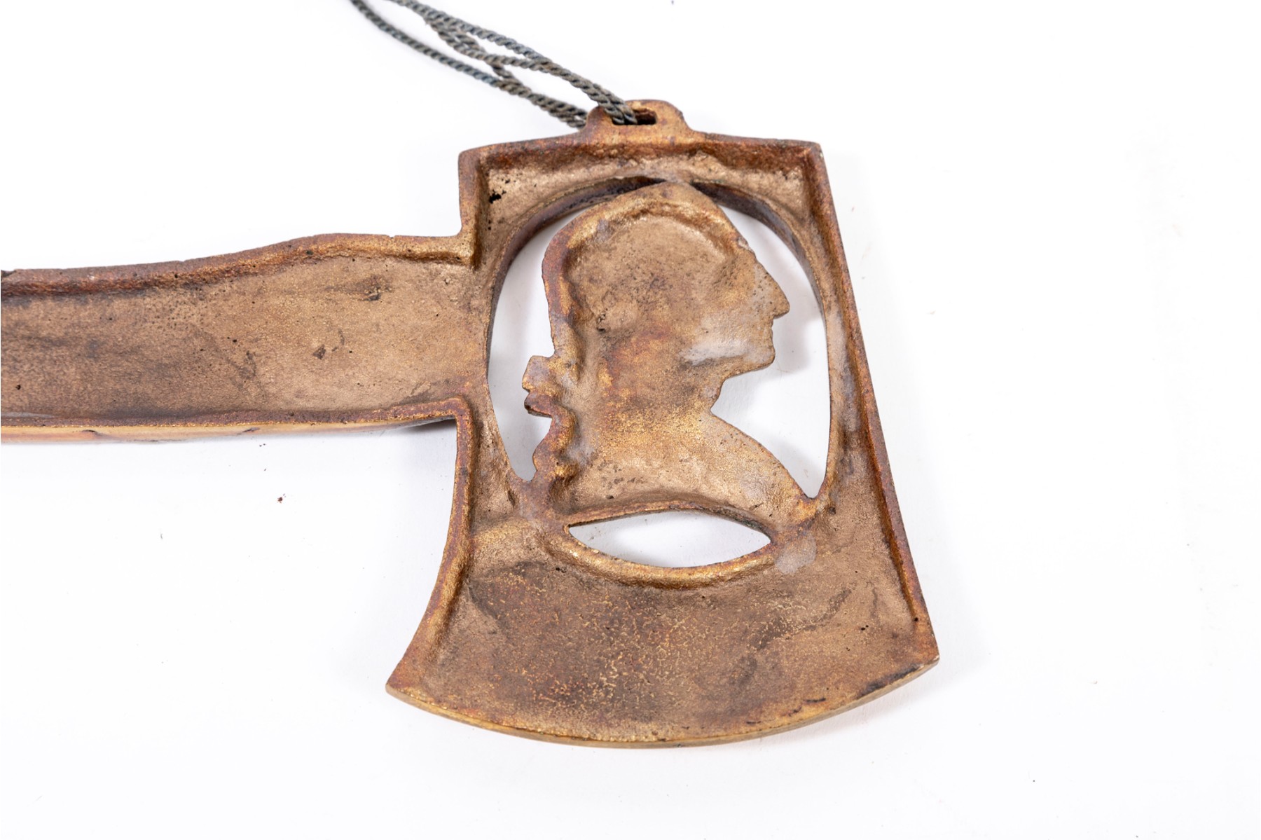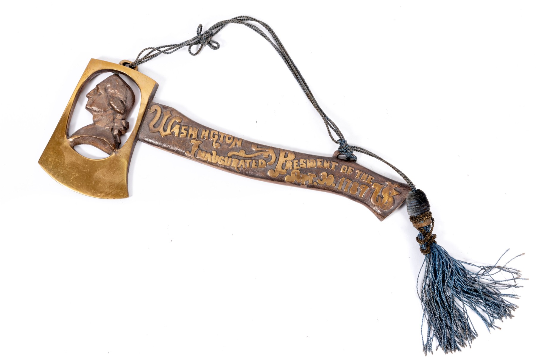 An 11.5" decorative vintage hatchet-shaped wall plaque commemorating the inauguration of George Washington. A bust of his likeness is set in relief within the cheek of the hatchet blade.