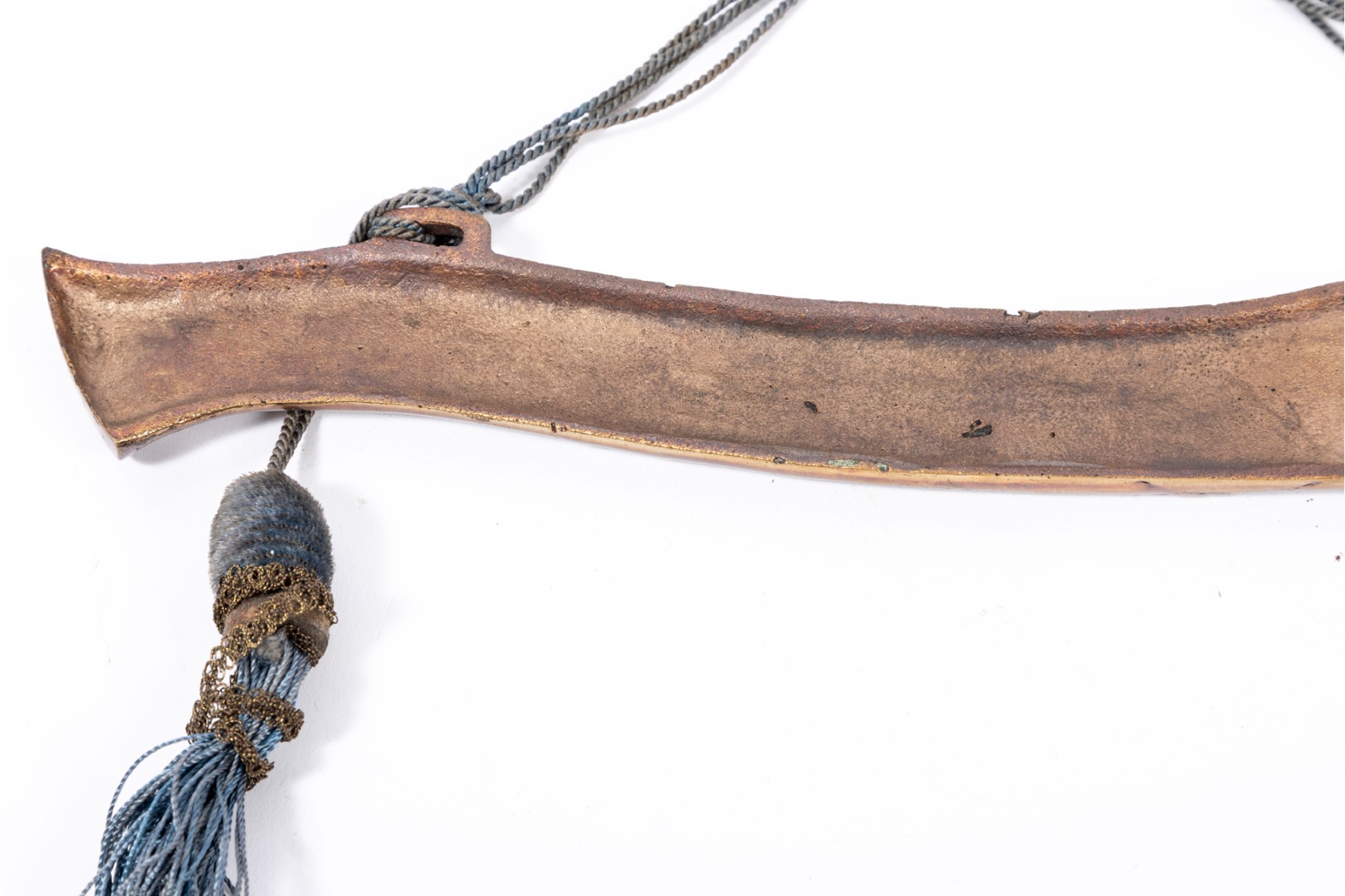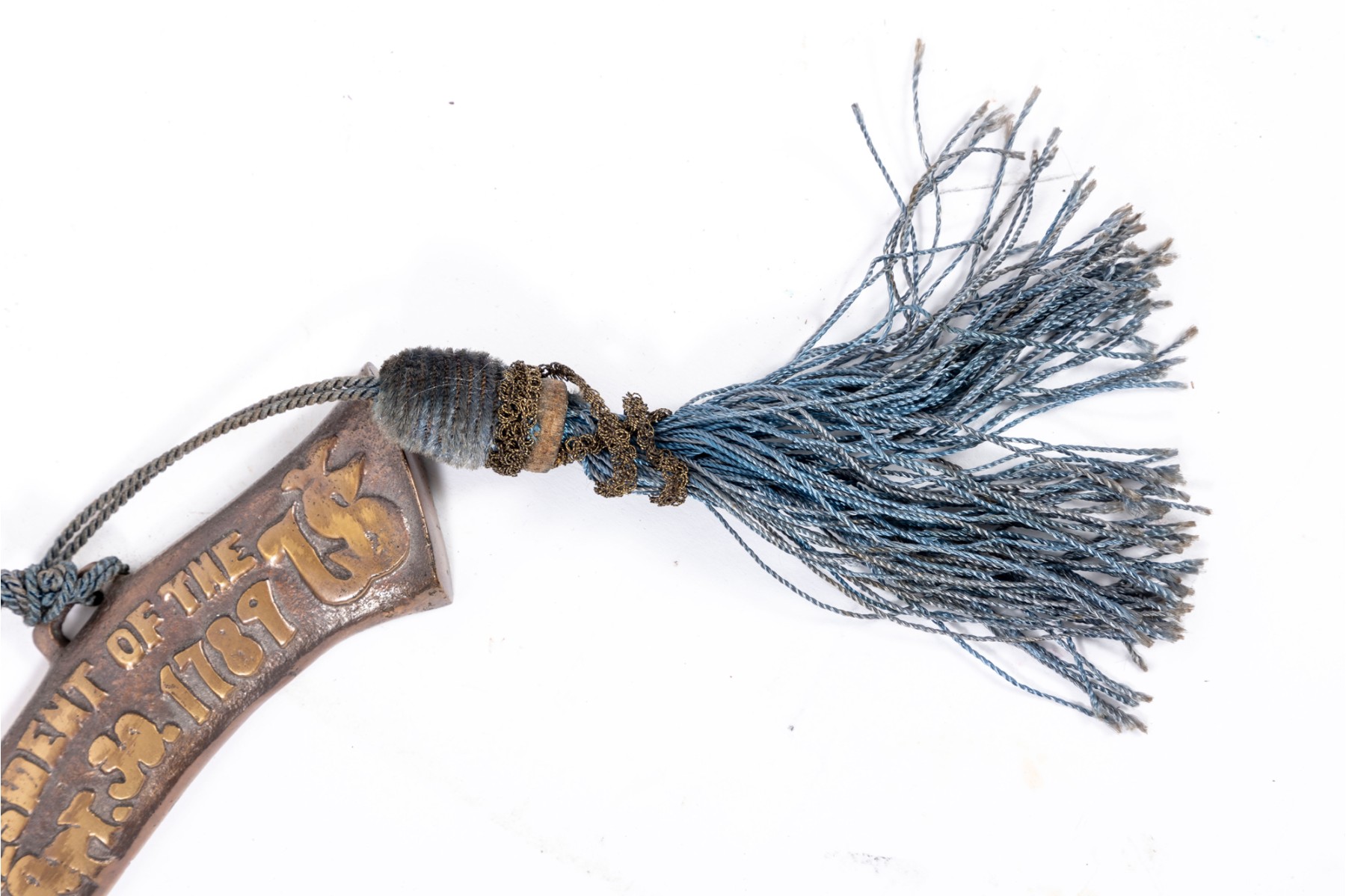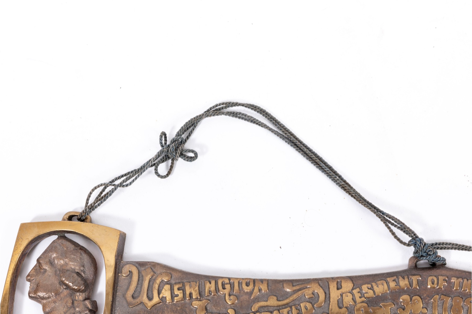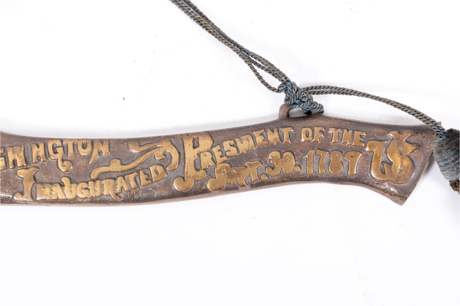 An 11.5" decorative vintage hatchet-shaped wall plaque commemorating the inauguration of George Washington. A bust of his likeness is set in relief within the cheek of the hatchet blade.