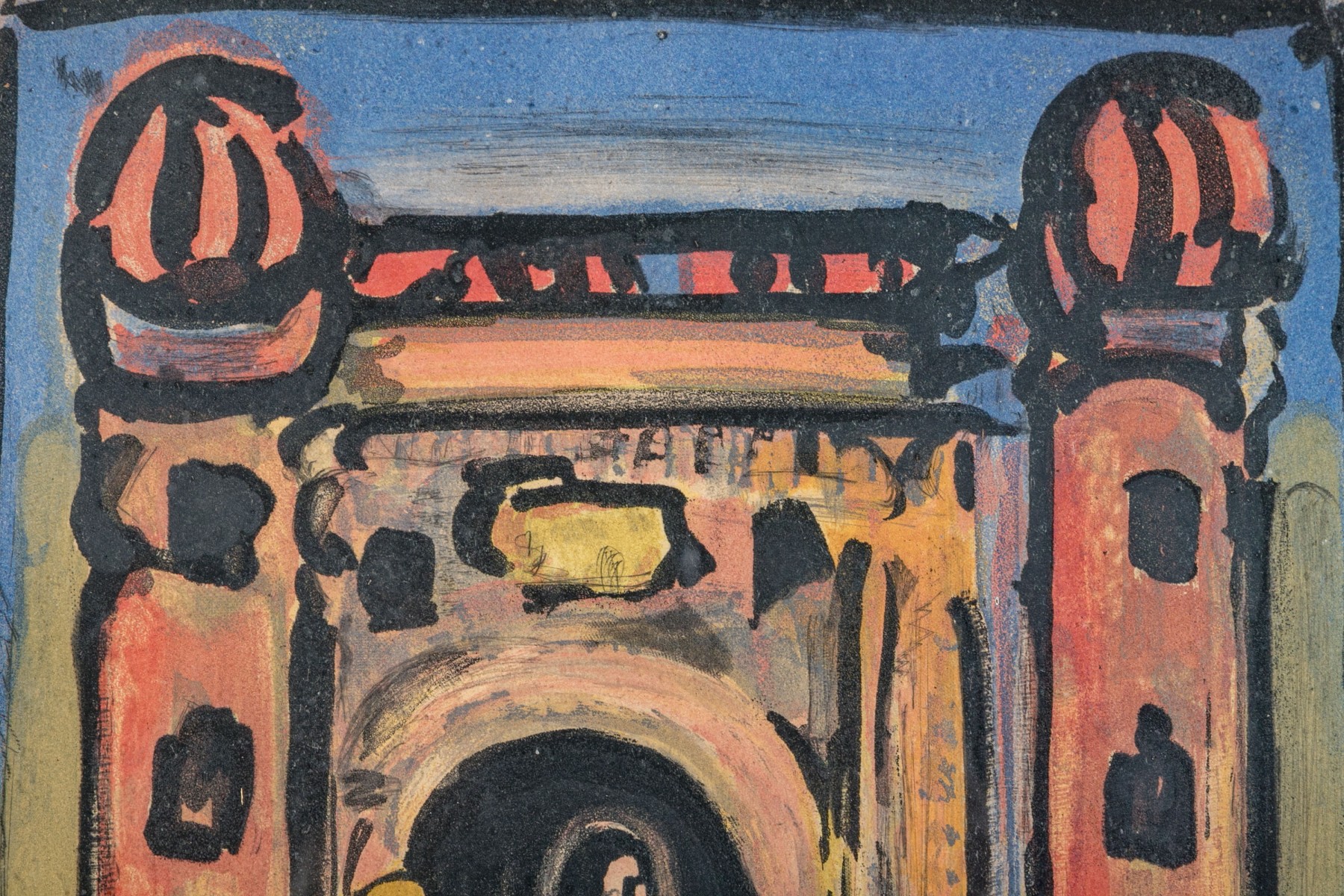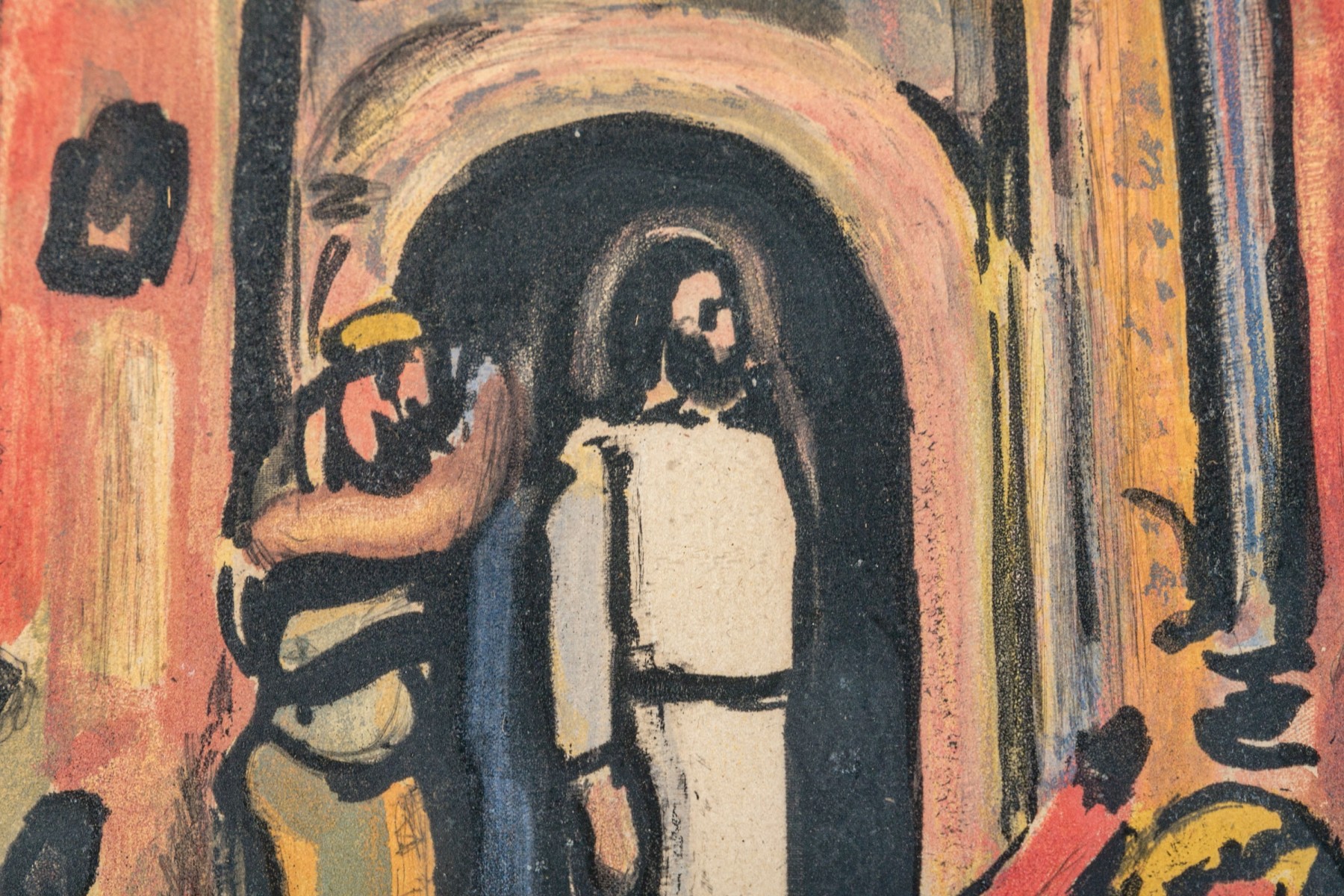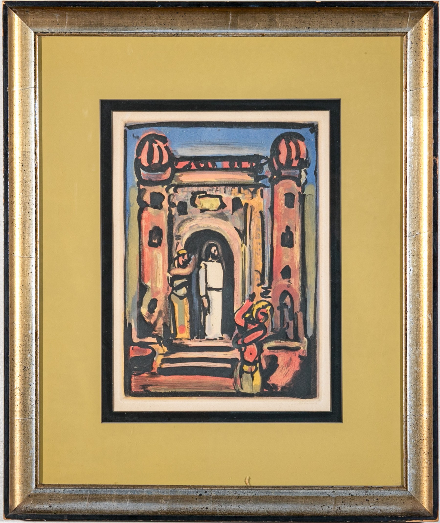 Rouault was the artist for the publication by Andre Suares, 1939. Here Christ is shown in on the steps of the gateway of the city. Presented in a fine black and gilt frame with glass.
