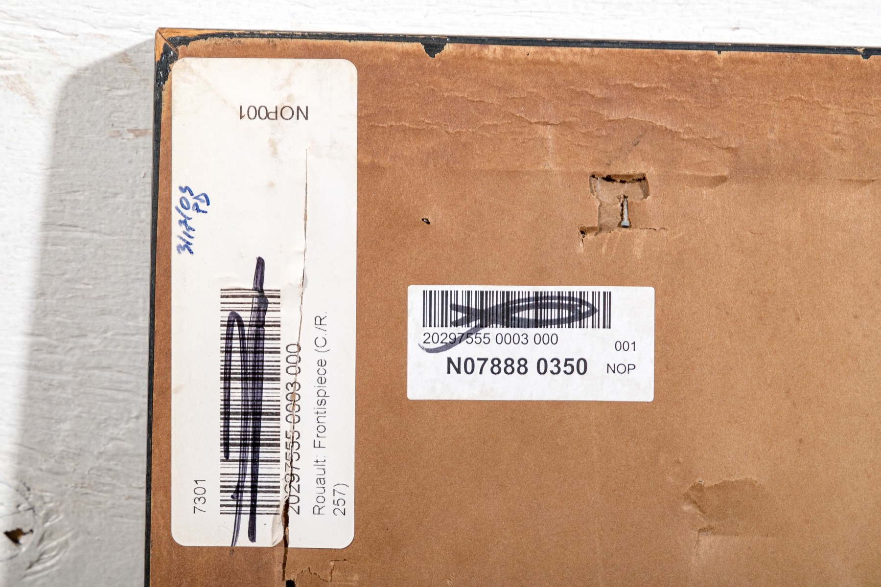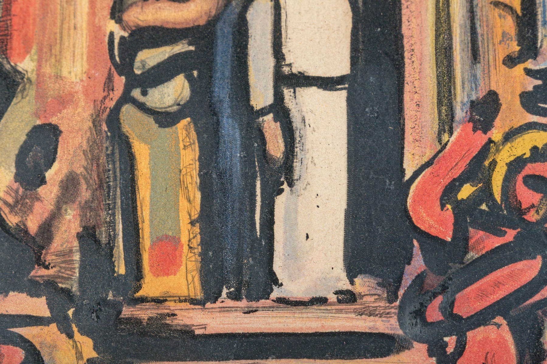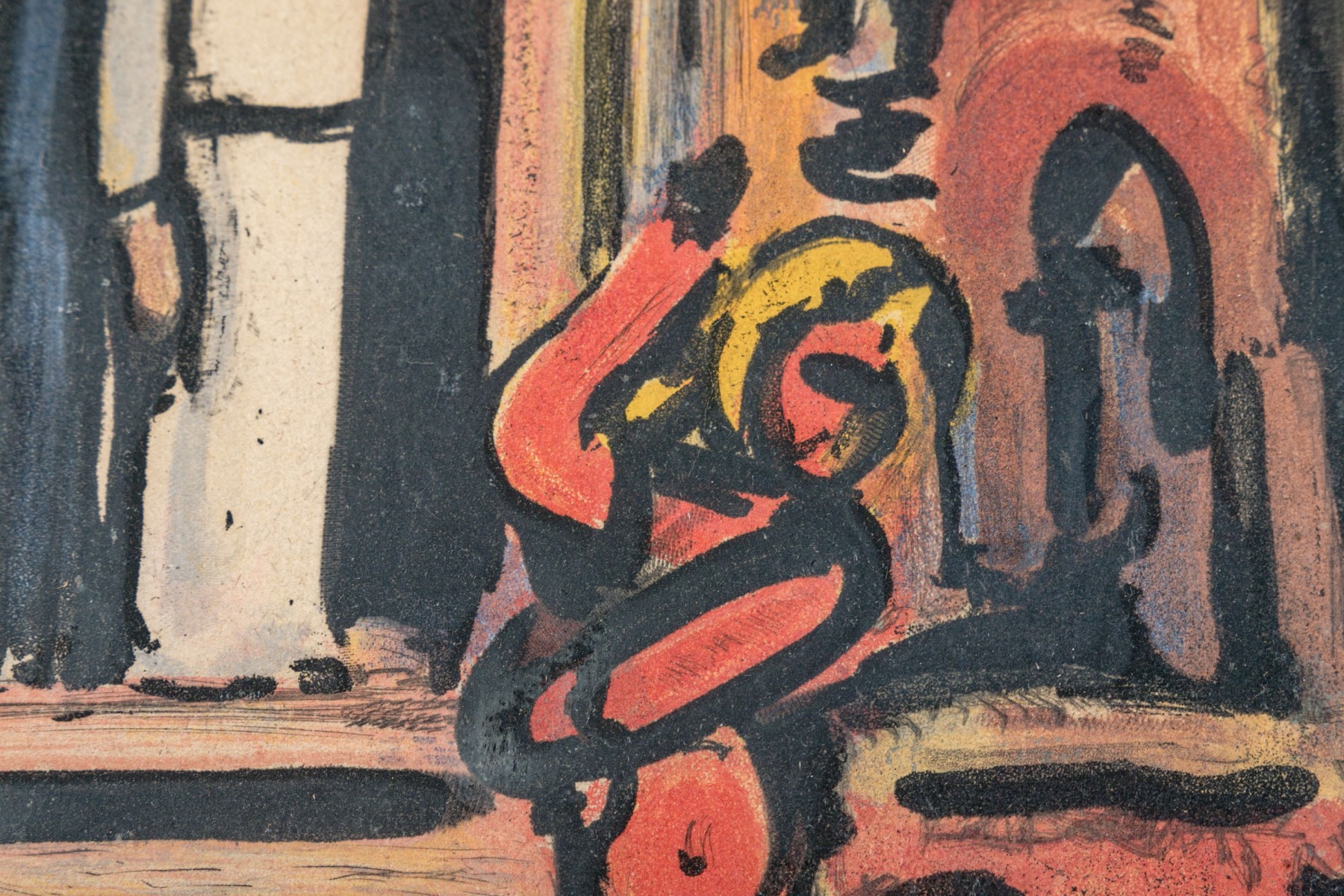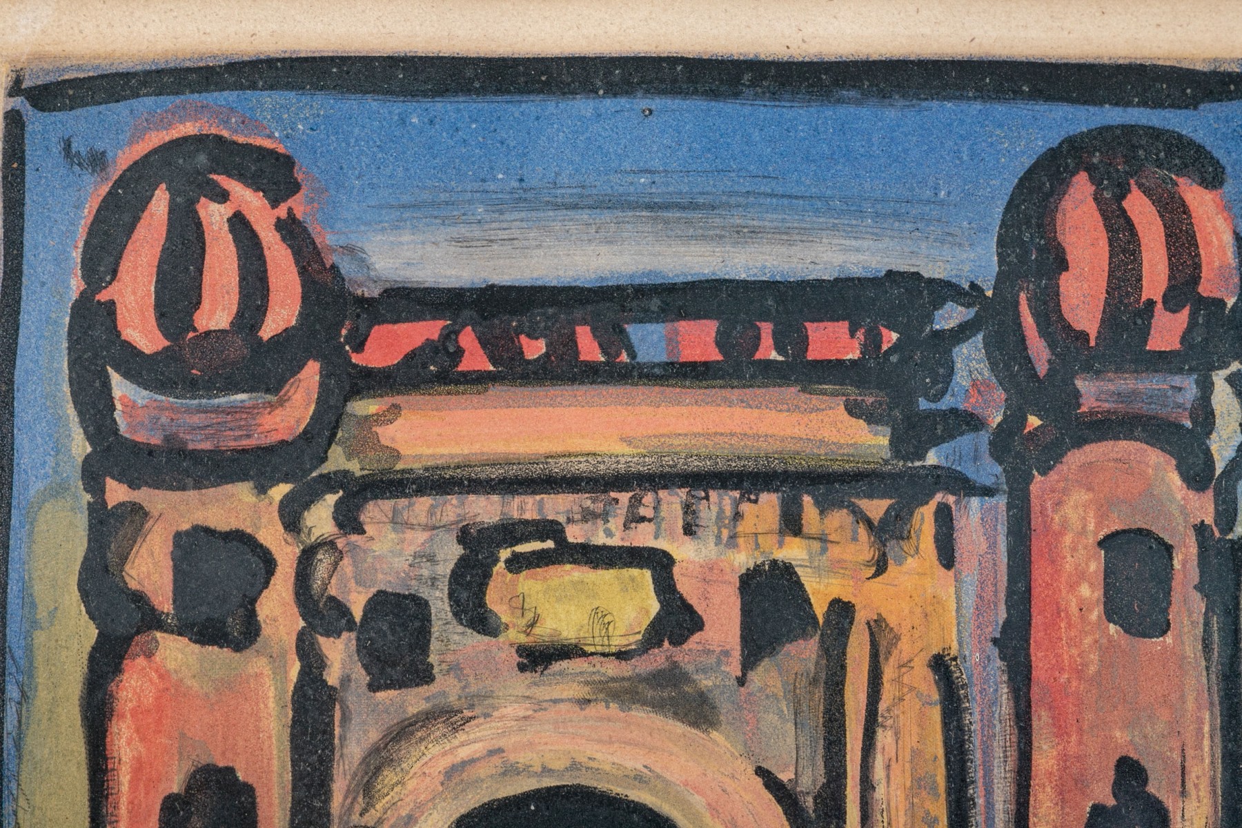 Rouault was the artist for the publication by Andre Suares, 1939. Here Christ is shown in on the steps of the gateway of the city. Presented in a fine black and gilt frame with glass.