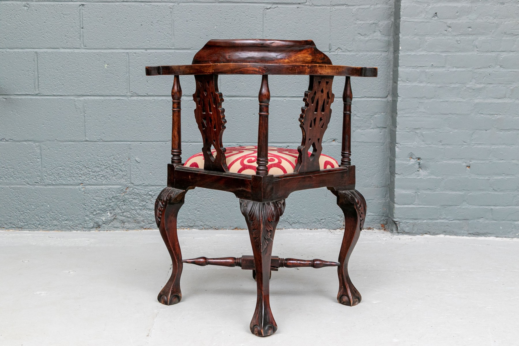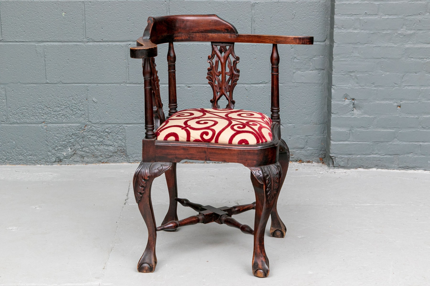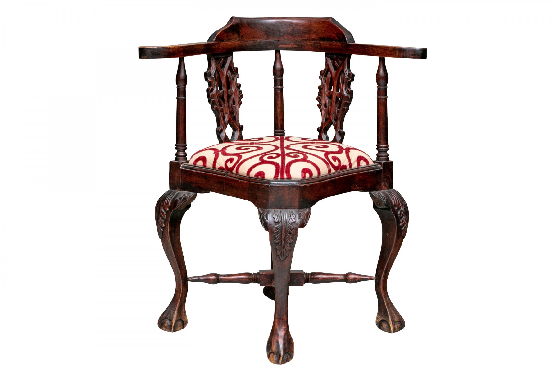 A well carved Antique Corner Chair in Rosewood or rosewood stained mahogany. Classic carved corner chair with scrolled arm ends, raised crest rail and openwork interlaced design splats. Raised on heavy cabriole legs with carved acanthus leaf knees and ball- and- claw feet with turned X stretcher. The seat upholstered in a cut red velvet on pale tan fabric in a swirl pattern.
