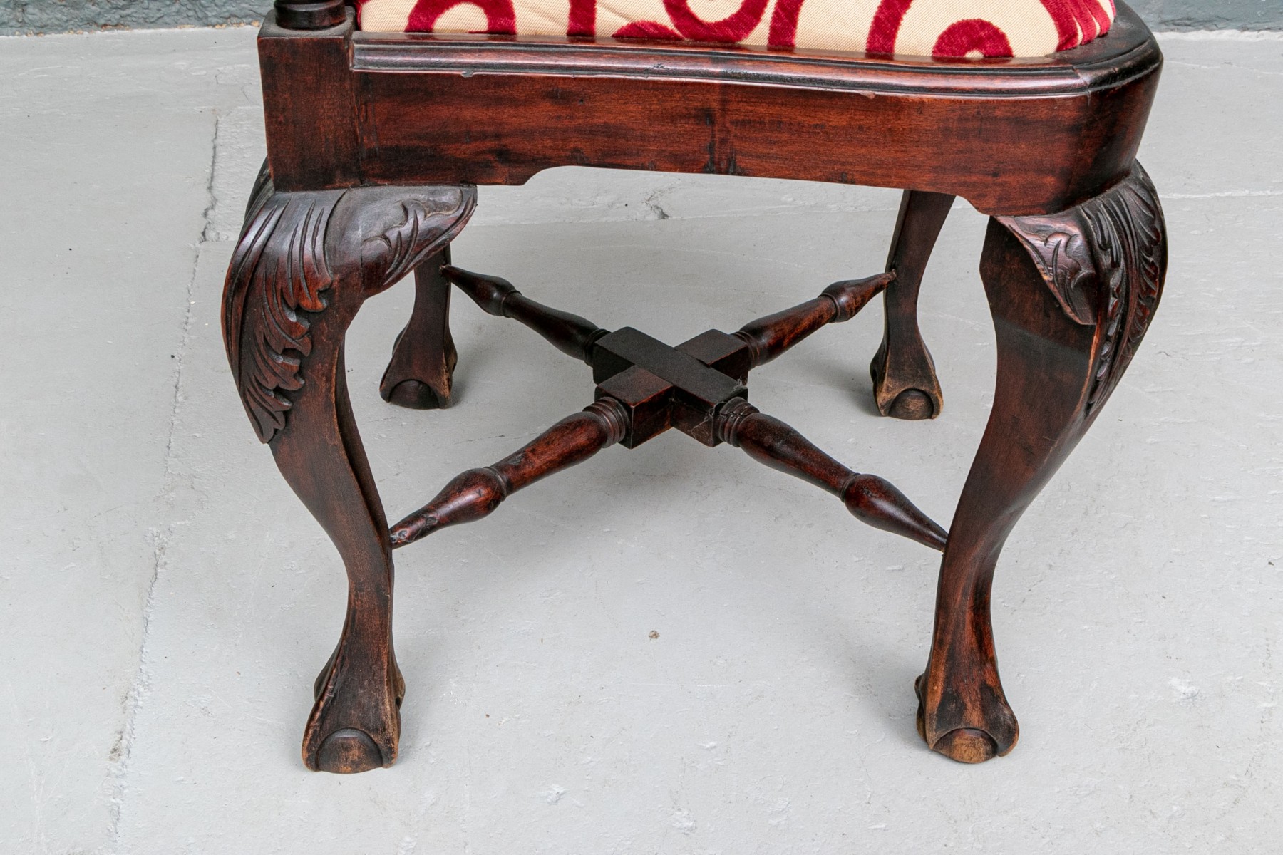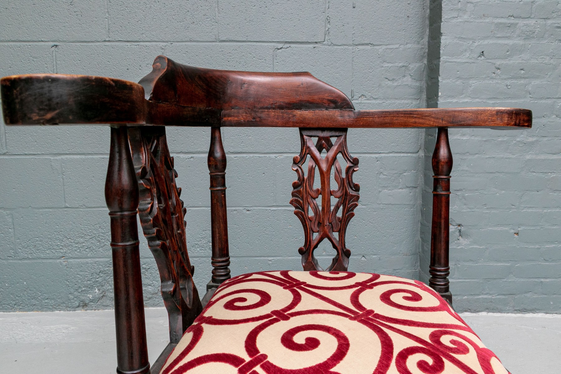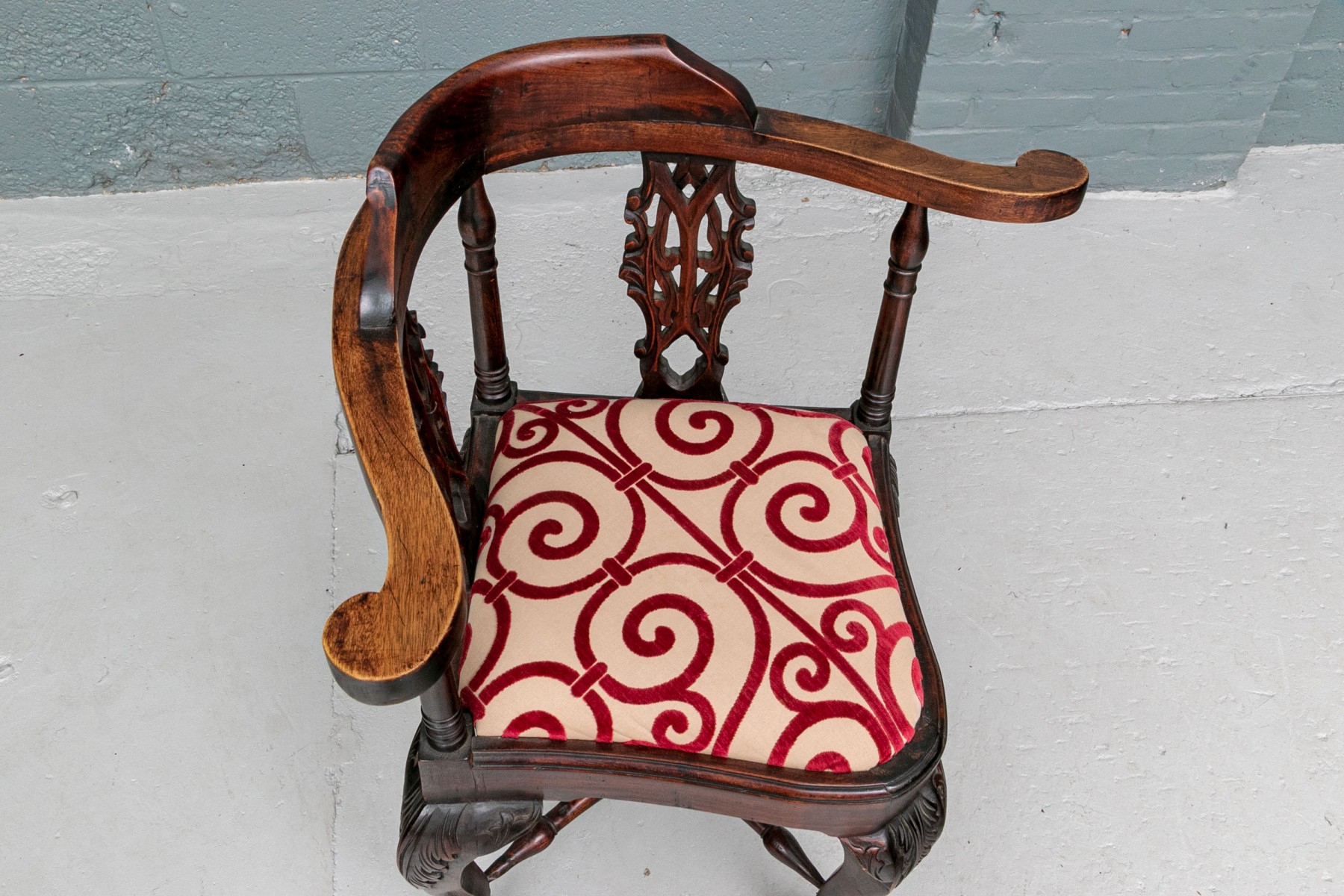 A well carved Antique Corner Chair in Rosewood or rosewood stained mahogany. Classic carved corner chair with scrolled arm ends, raised crest rail and openwork interlaced design splats. Raised on heavy cabriole legs with carved acanthus leaf knees and ball- and- claw feet with turned X stretcher. The seat upholstered in a cut red velvet on pale tan fabric in a swirl pattern.