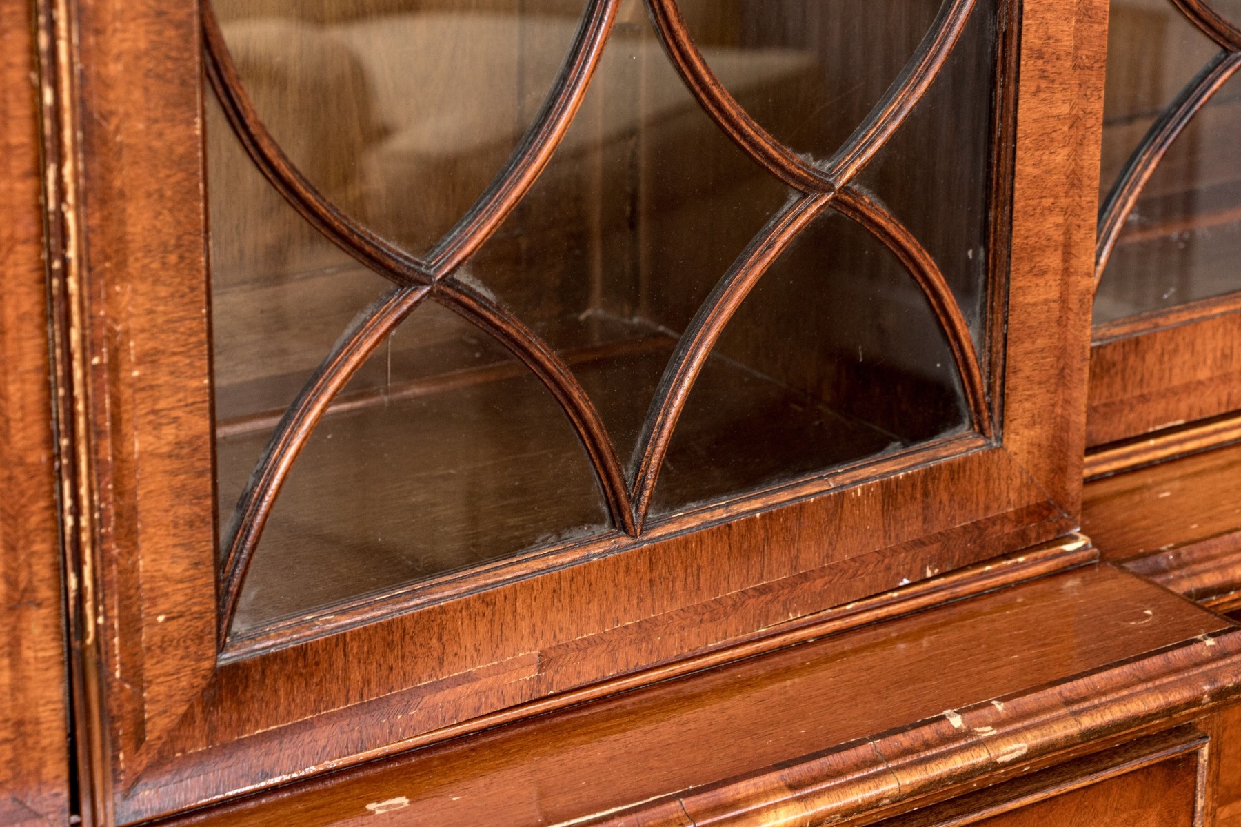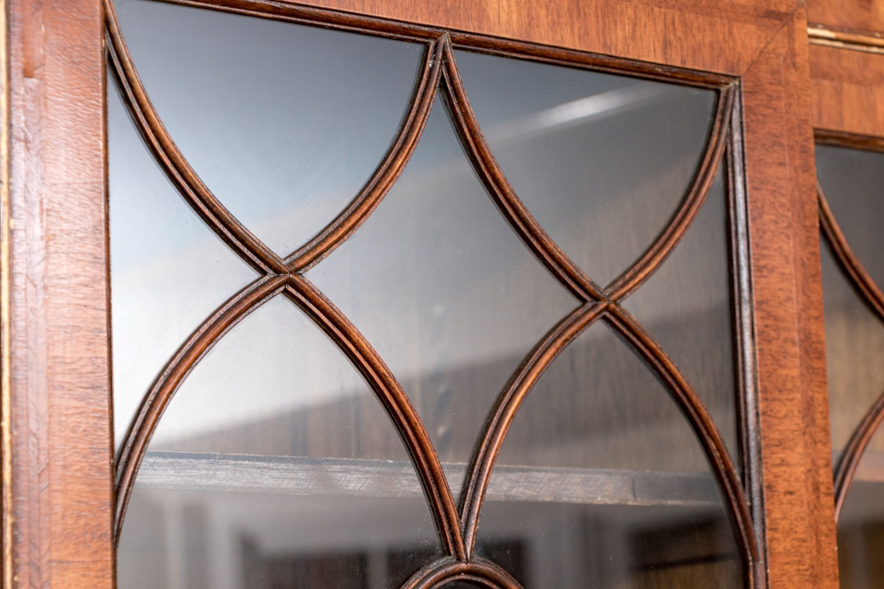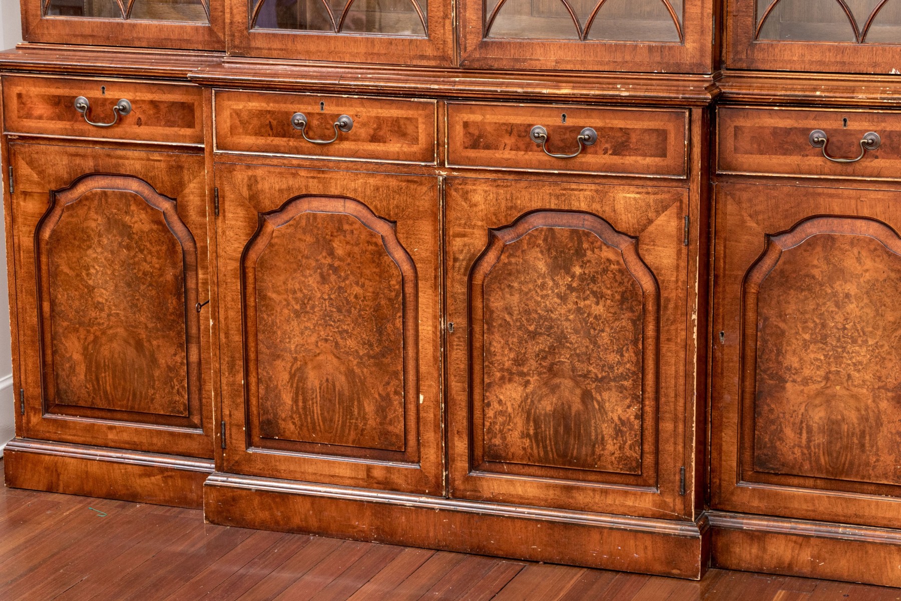 A stunning Georgian style breakfront cabinet sporting a stepped crown moulded top with a decorative trim, four glass paned doors with elegant curved overlays and oval center medallions, and adjustable wood shelving within. The lower case sports four drawers with patinaed brass bail handles over arched burlwood veneered panels, finishing with a flat foot.