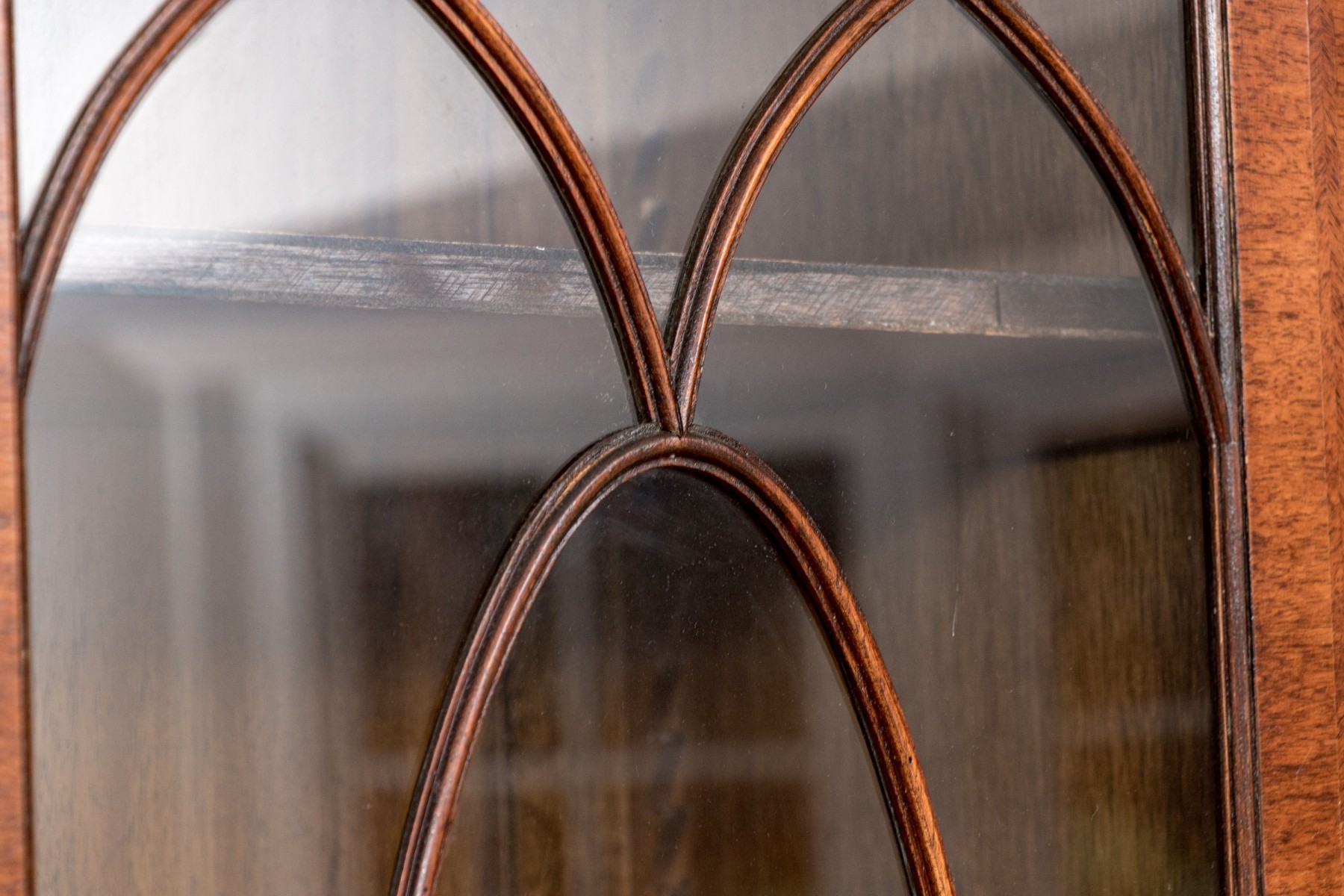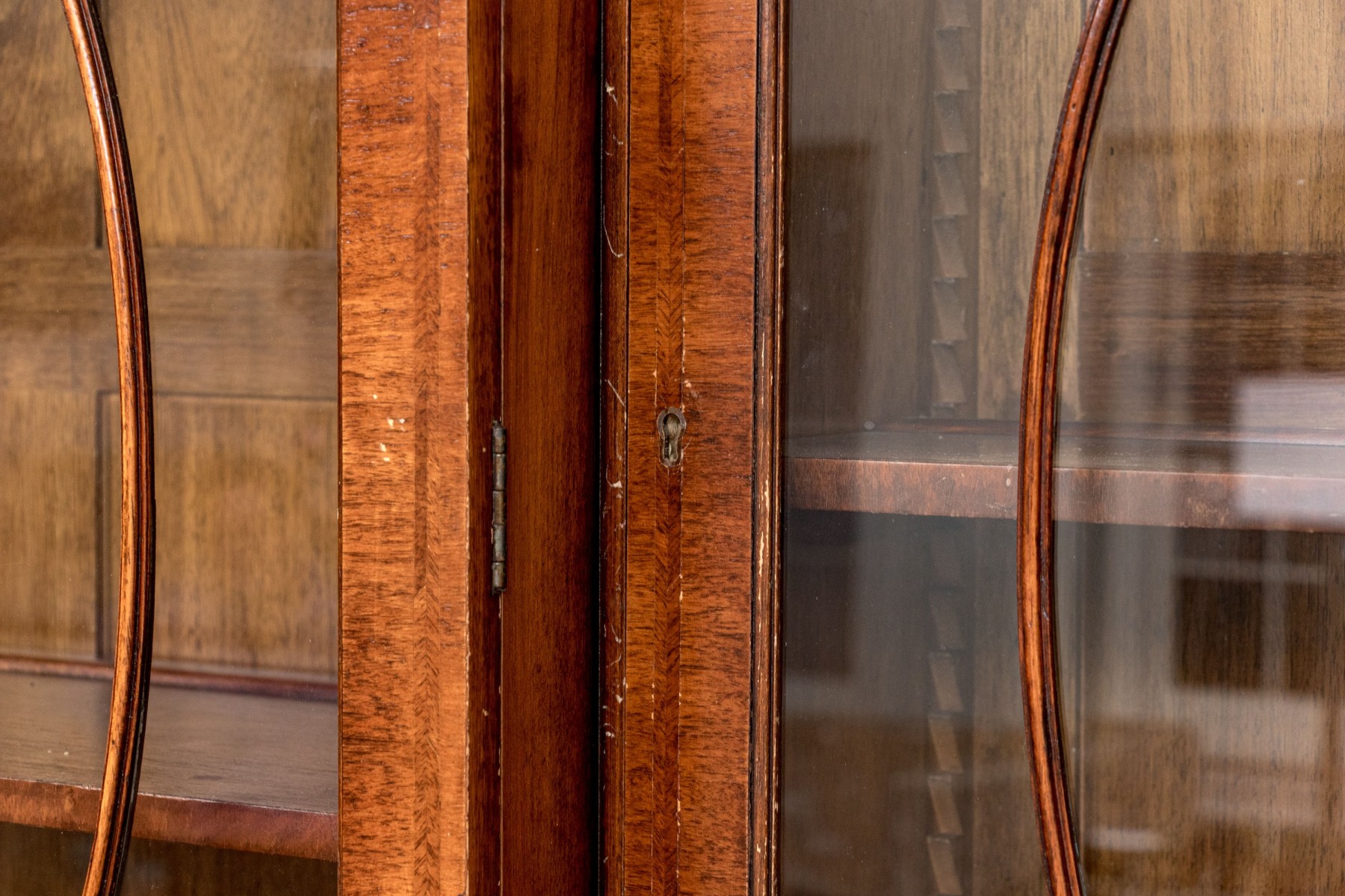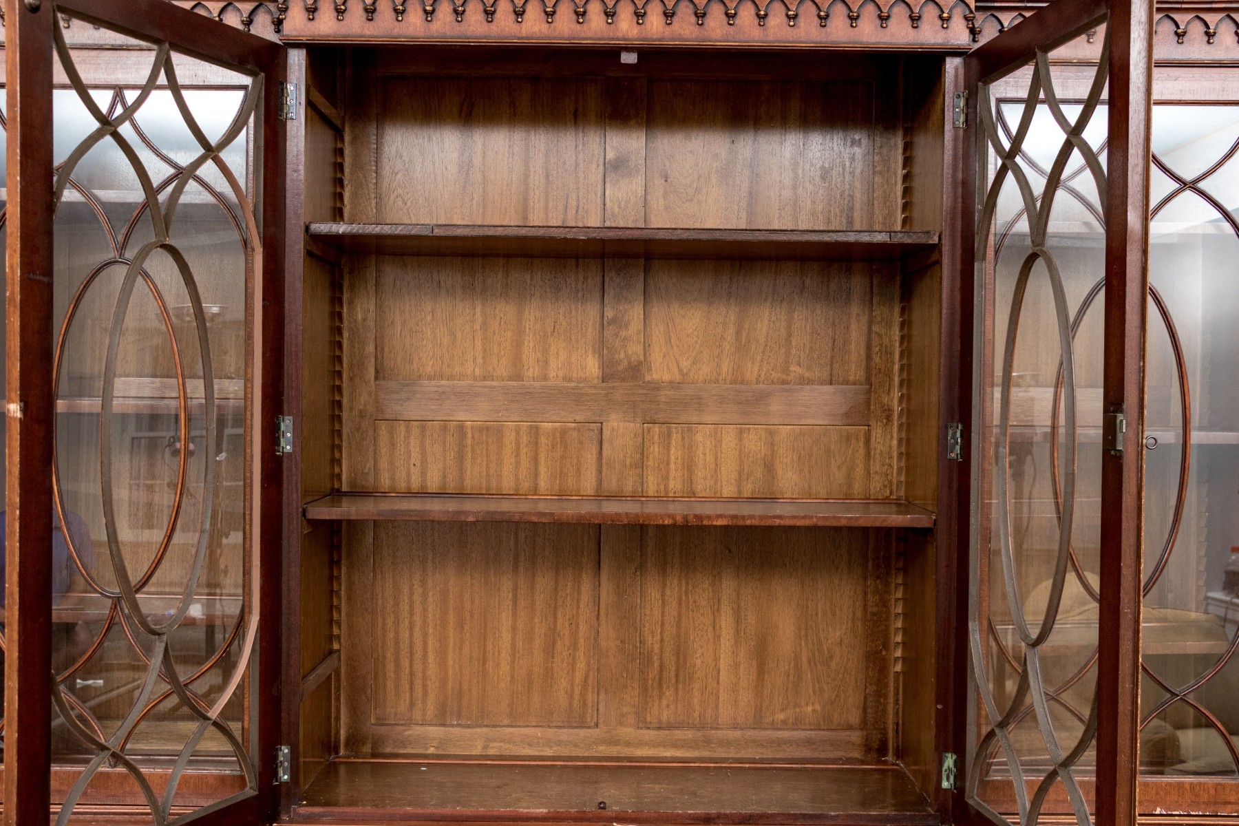 A stunning Georgian style breakfront cabinet sporting a stepped crown moulded top with a decorative trim, four glass paned doors with elegant curved overlays and oval center medallions, and adjustable wood shelving within. The lower case sports four drawers with patinaed brass bail handles over arched burlwood veneered panels, finishing with a flat foot.