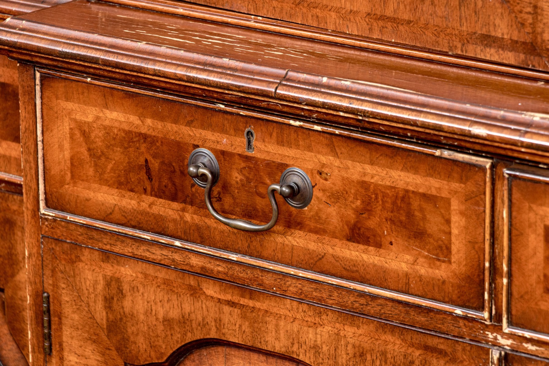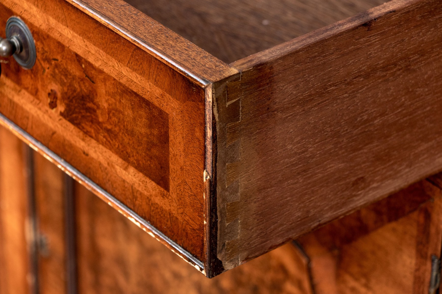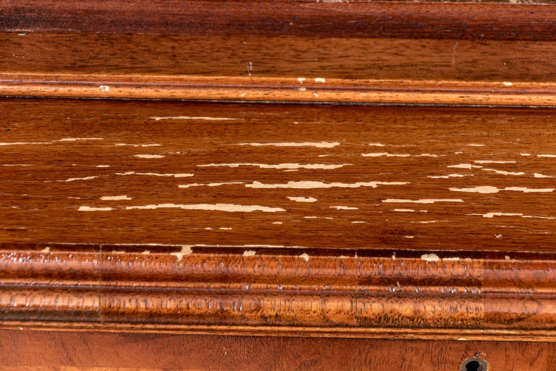A gorgeous piece with heavy wear commensurate with some age and use including some rubbed finish wear/finish loss around the edges, nics, and veneer checking.