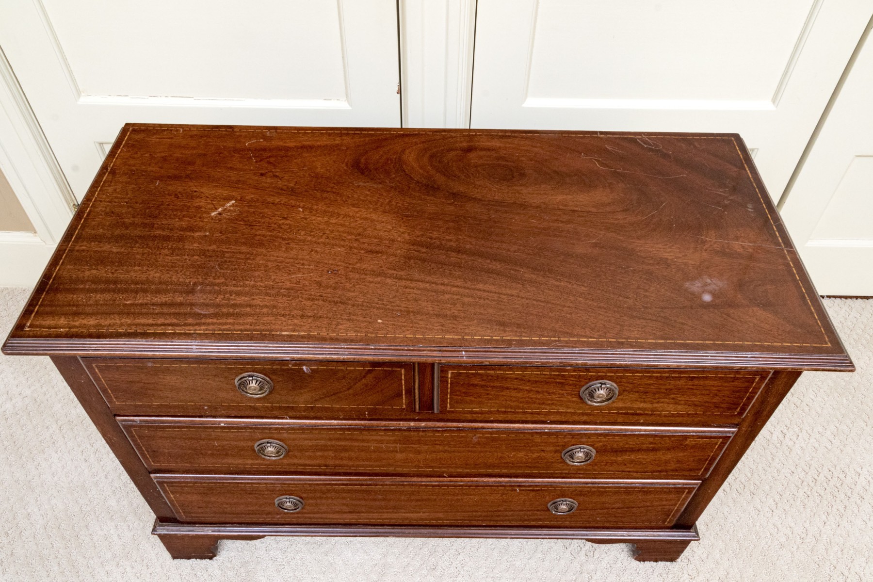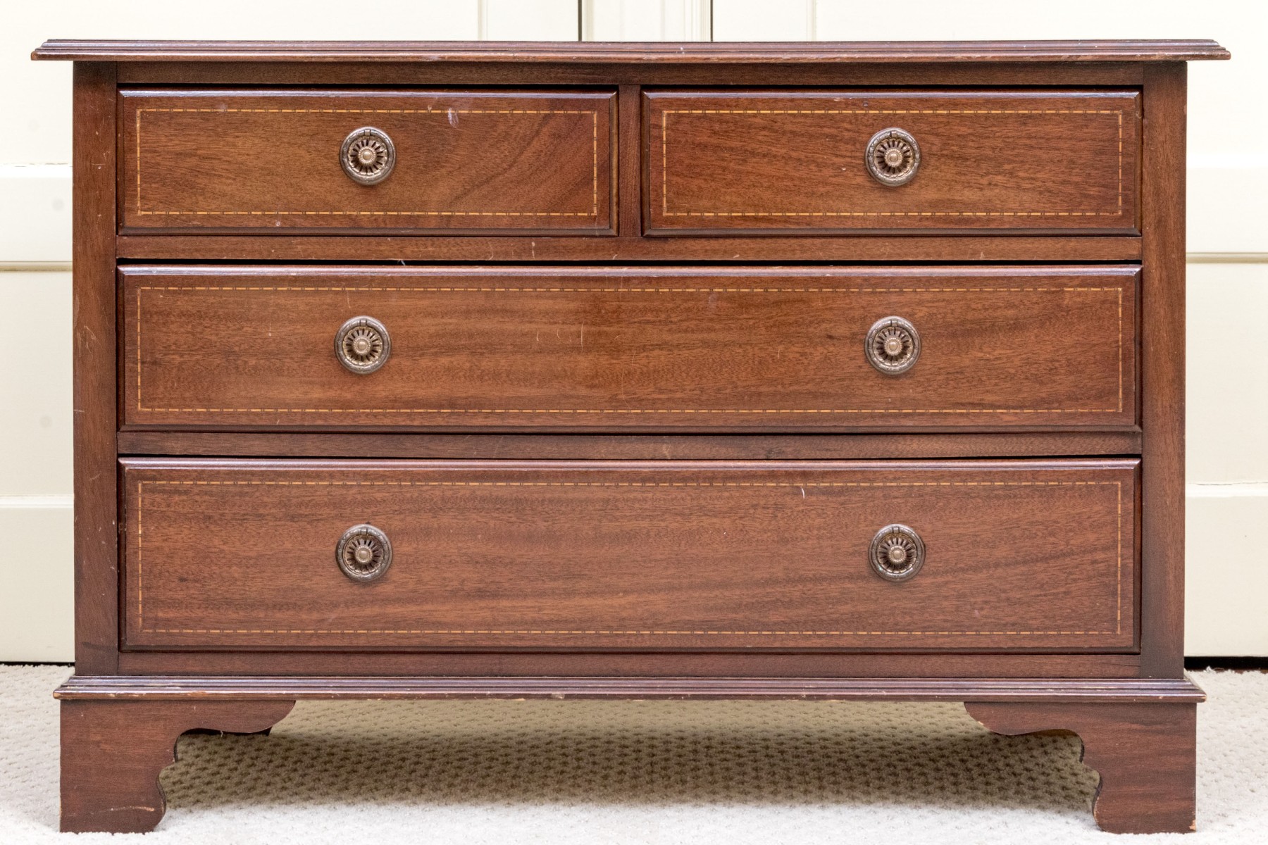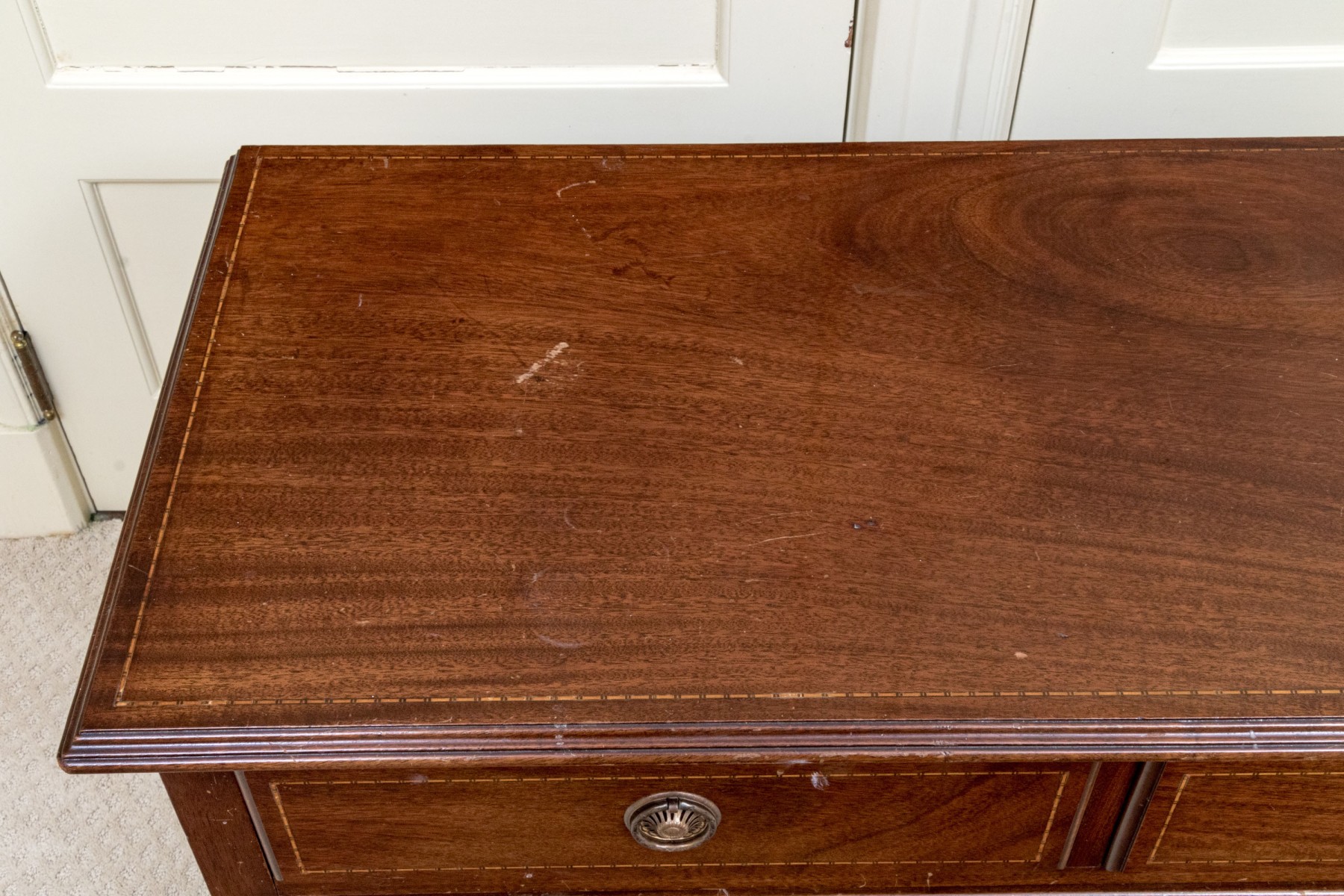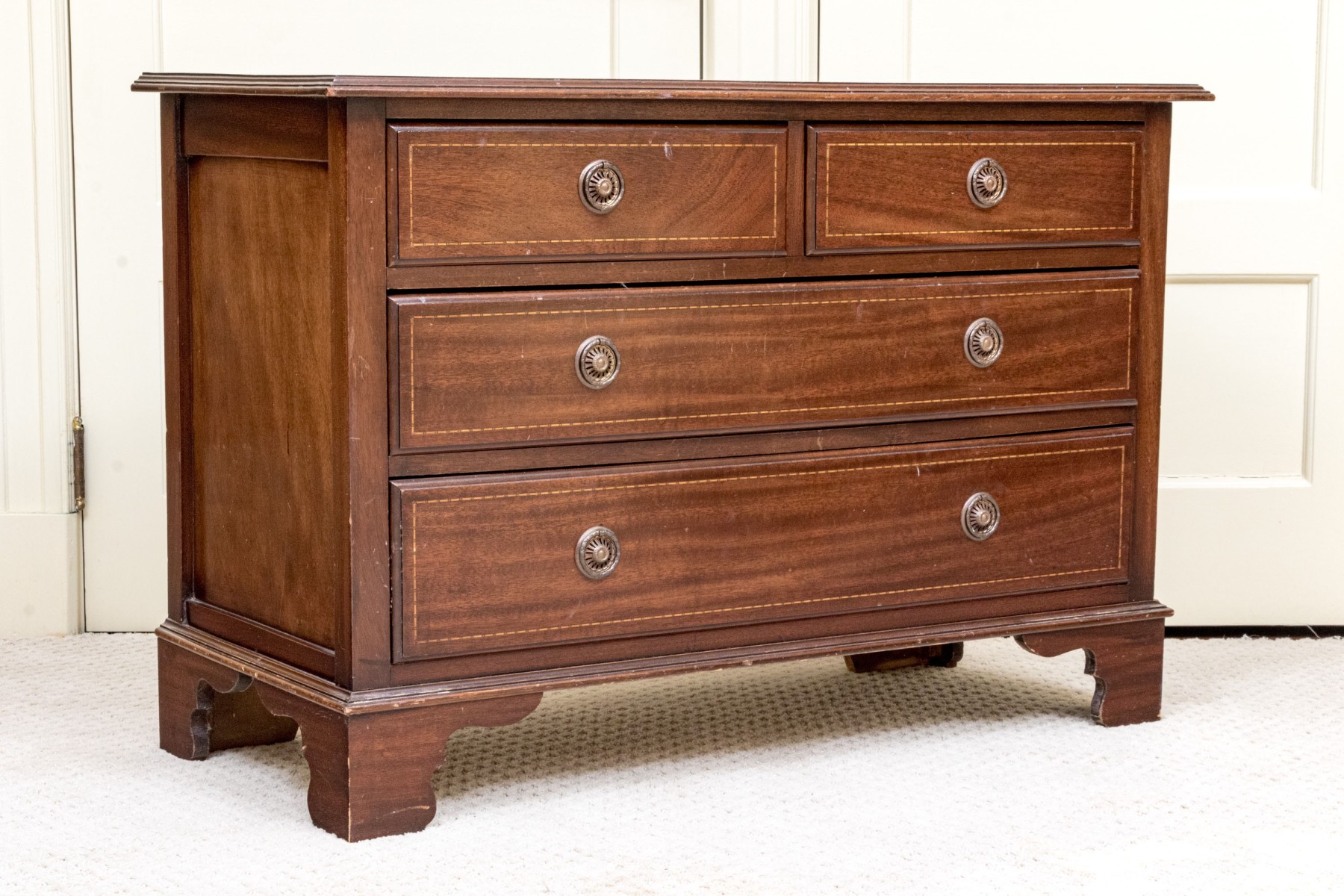 A handsome Georgian style dresser in warm-toned medium brown, featuring a two-over-two arrangement of drawers with fine parquetry trims and brass loop handles.