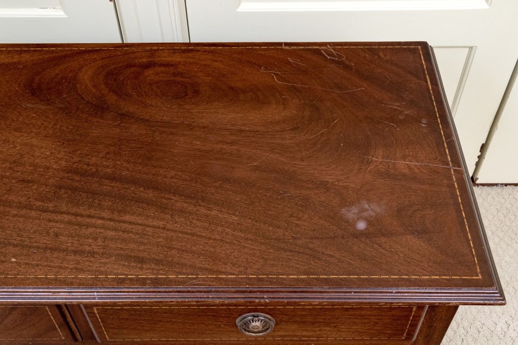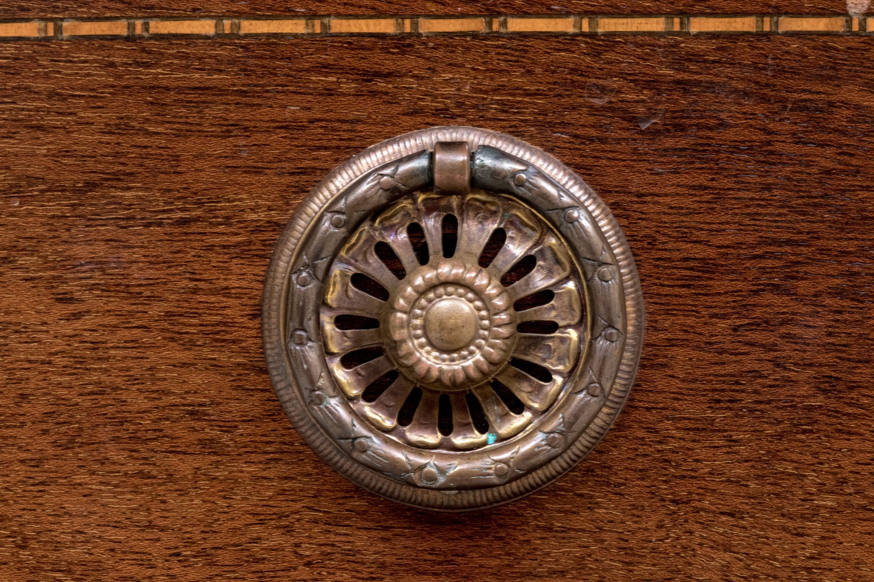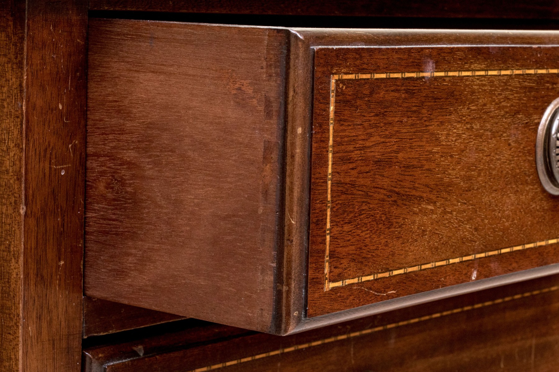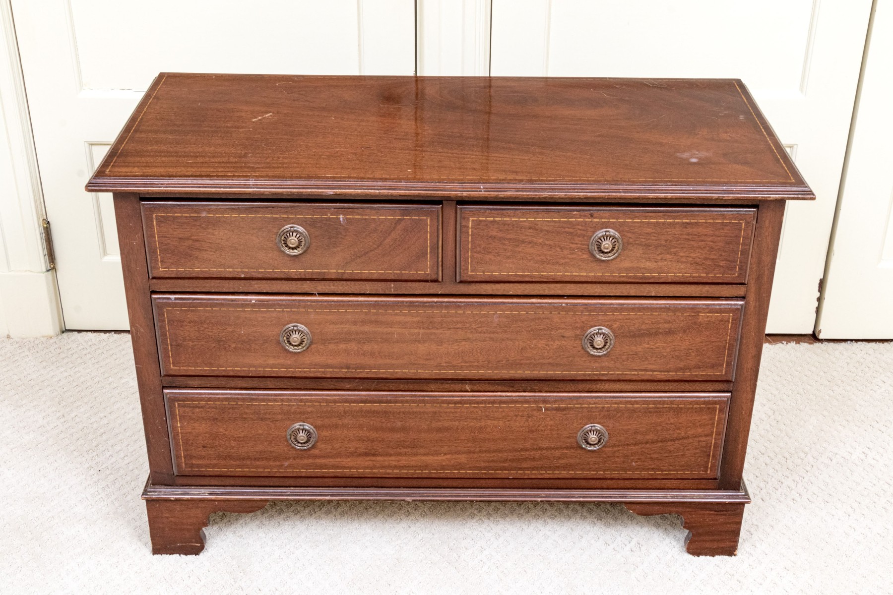 A handsome Georgian style dresser in warm-toned medium brown, featuring a two-over-two arrangement of drawers with fine parquetry trims and brass loop handles.