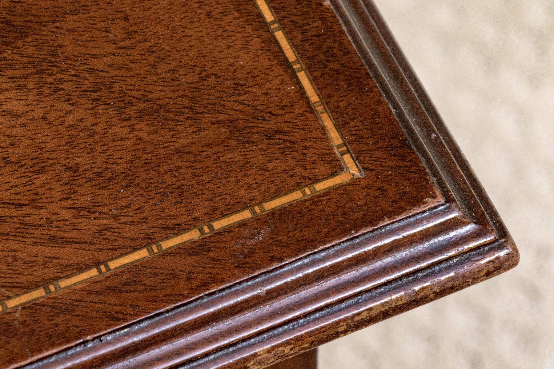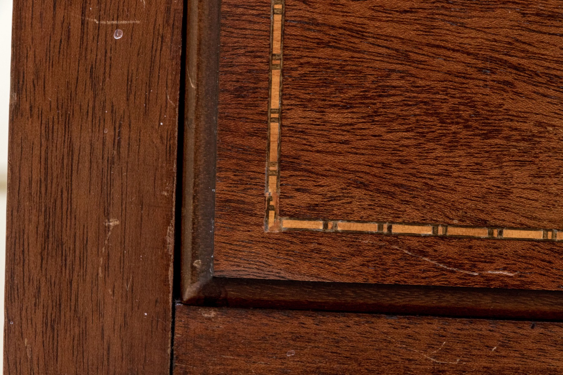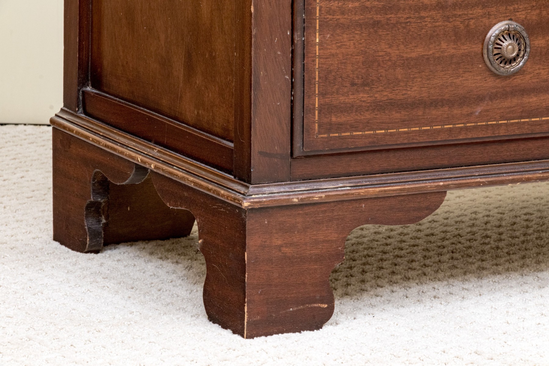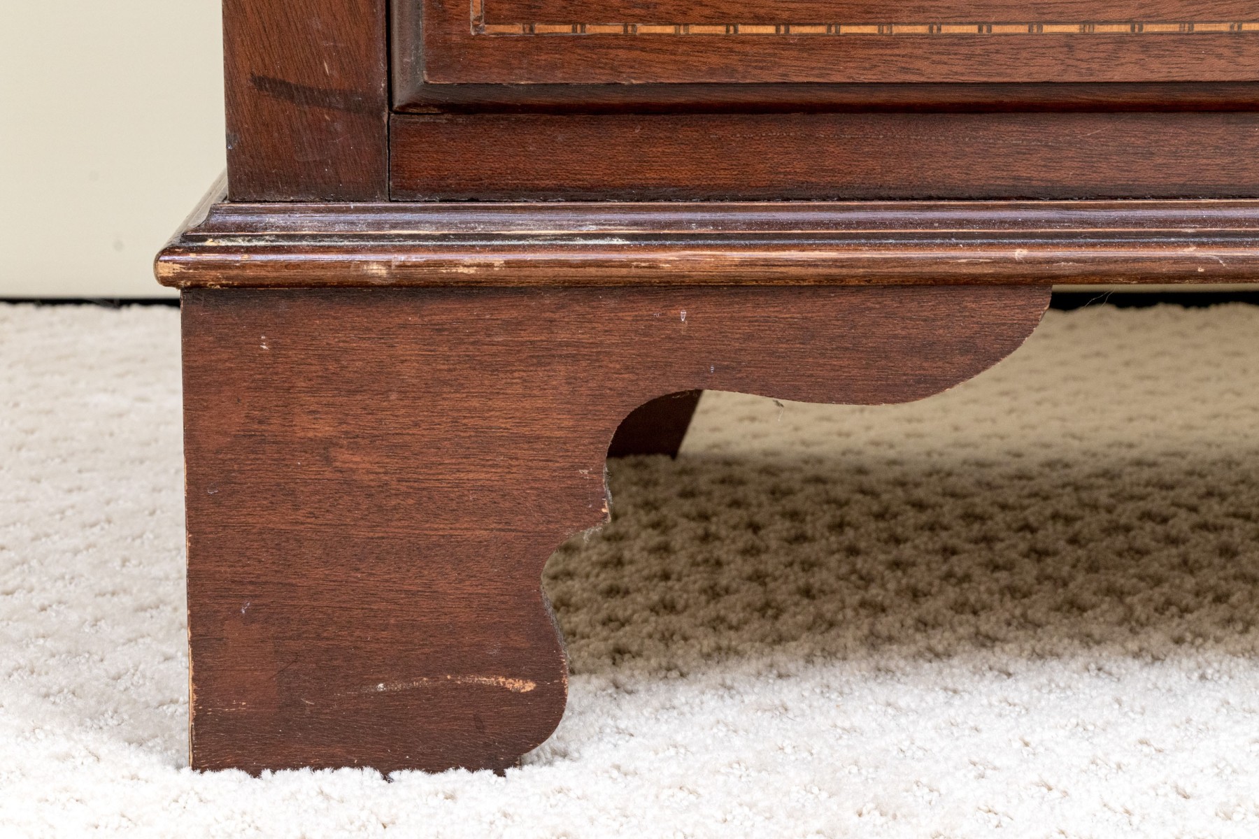 A handsome Georgian style dresser in warm-toned medium brown, featuring a two-over-two arrangement of drawers with fine parquetry trims and brass loop handles.
