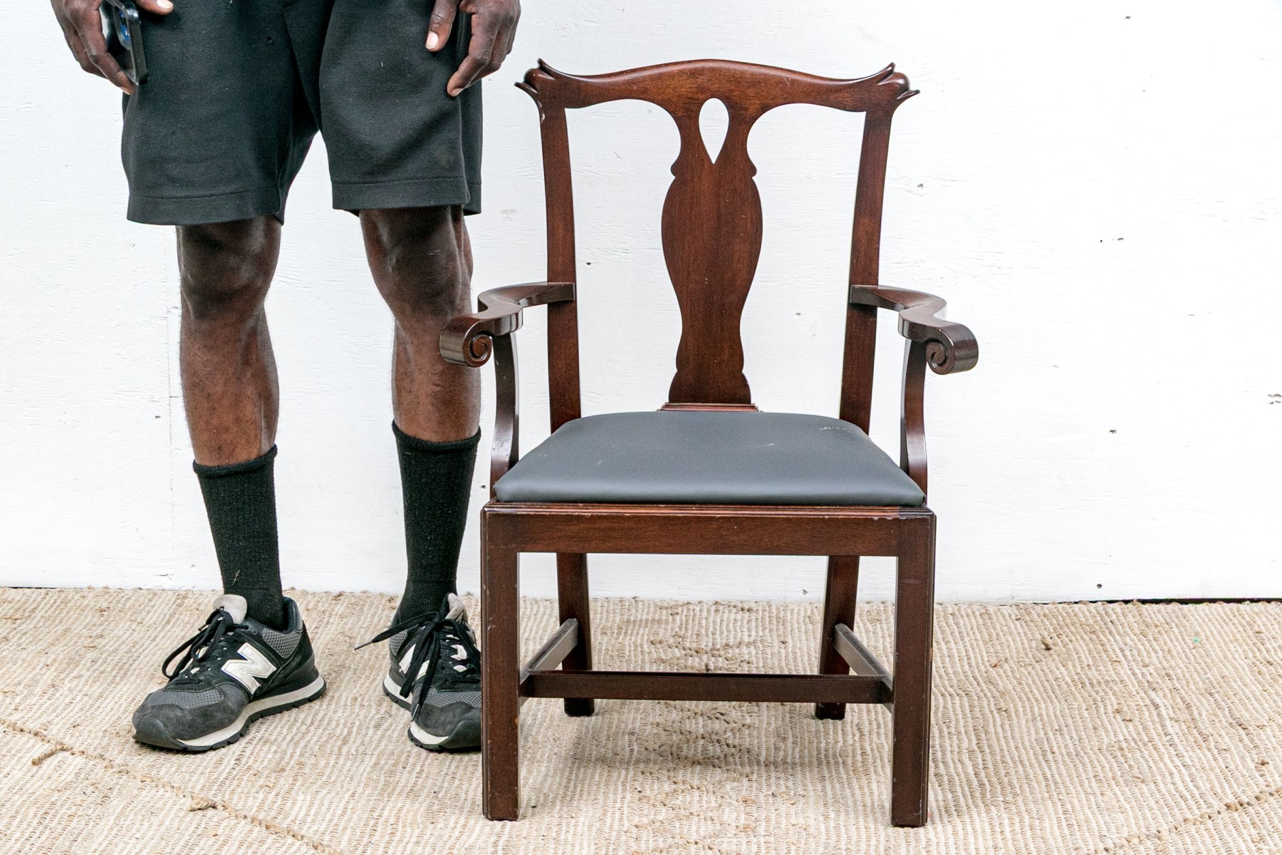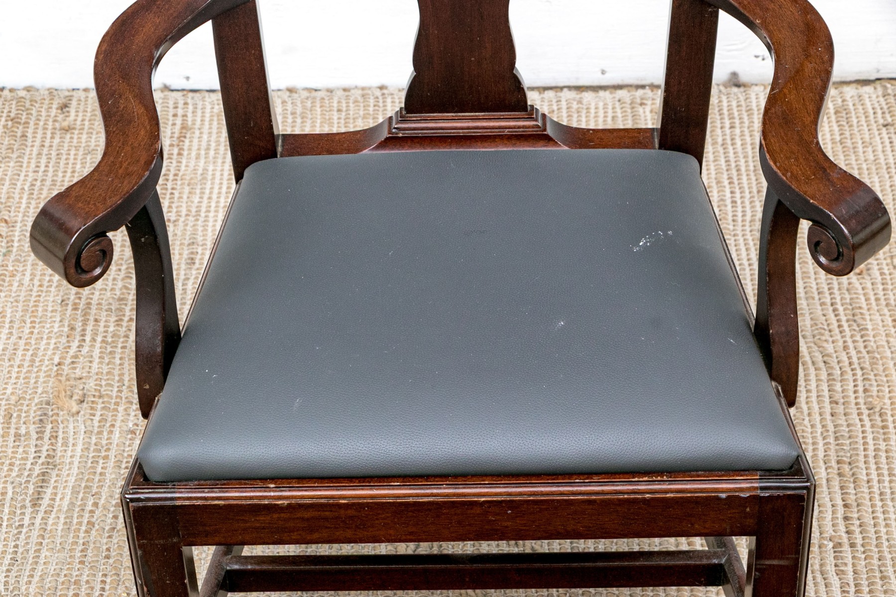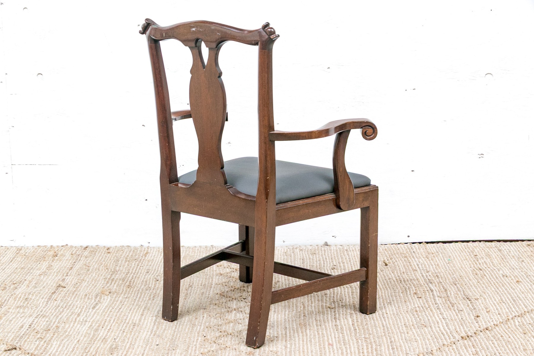 A classic mahogany Georgian style armchair for a child. The curved crest rail with scrolled ends, vasiform splat and curved arms switch scrolled ends. Raised on square legs with an H stretcher. The seat upholstered in gray faux leather.