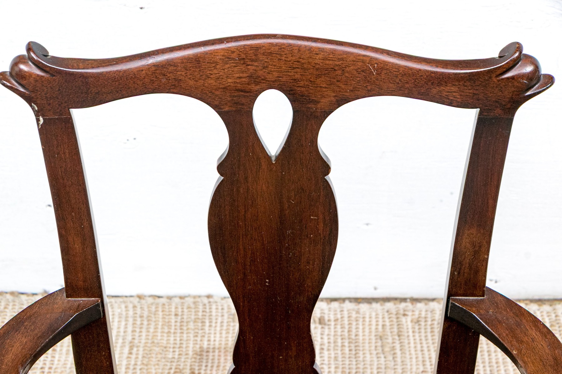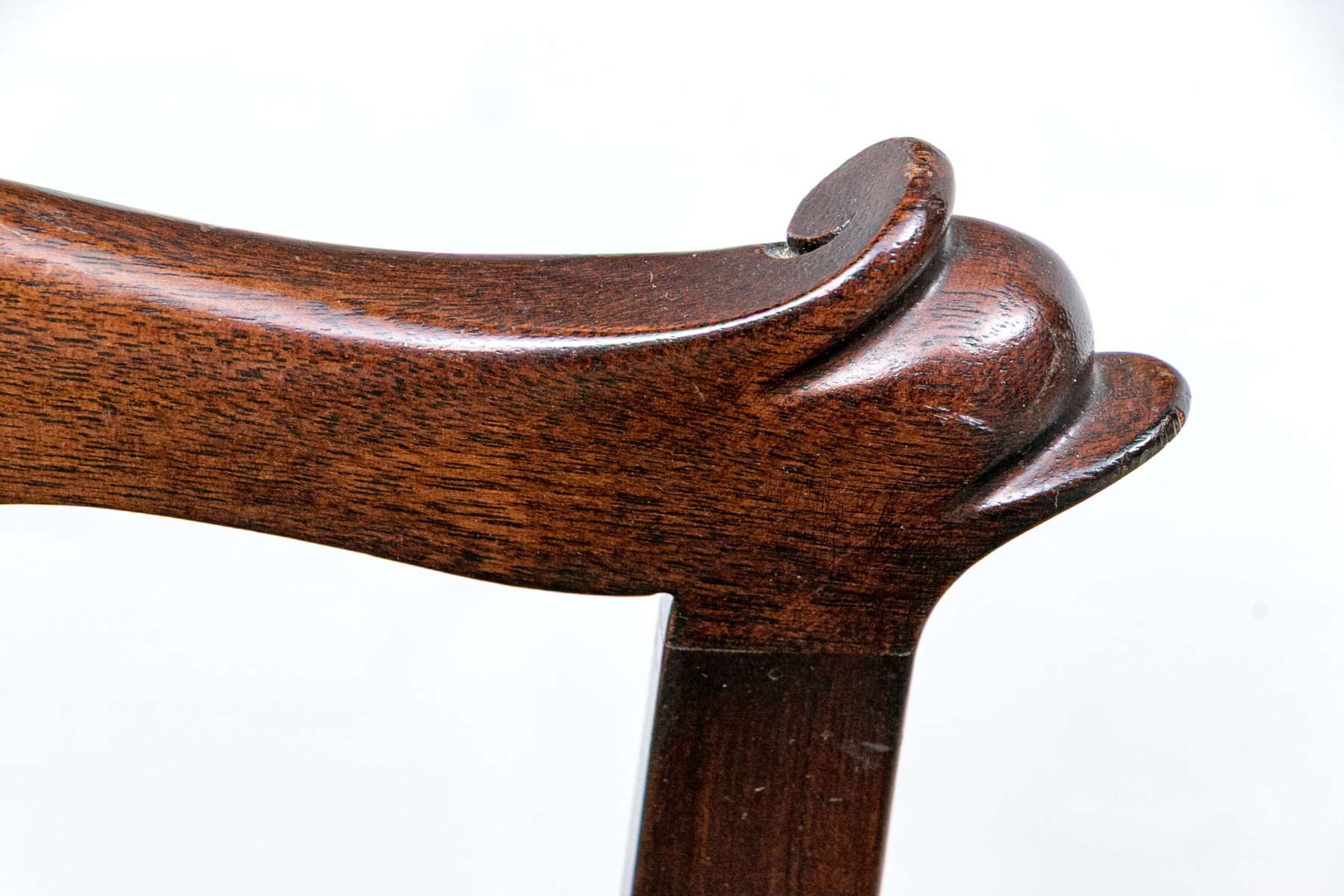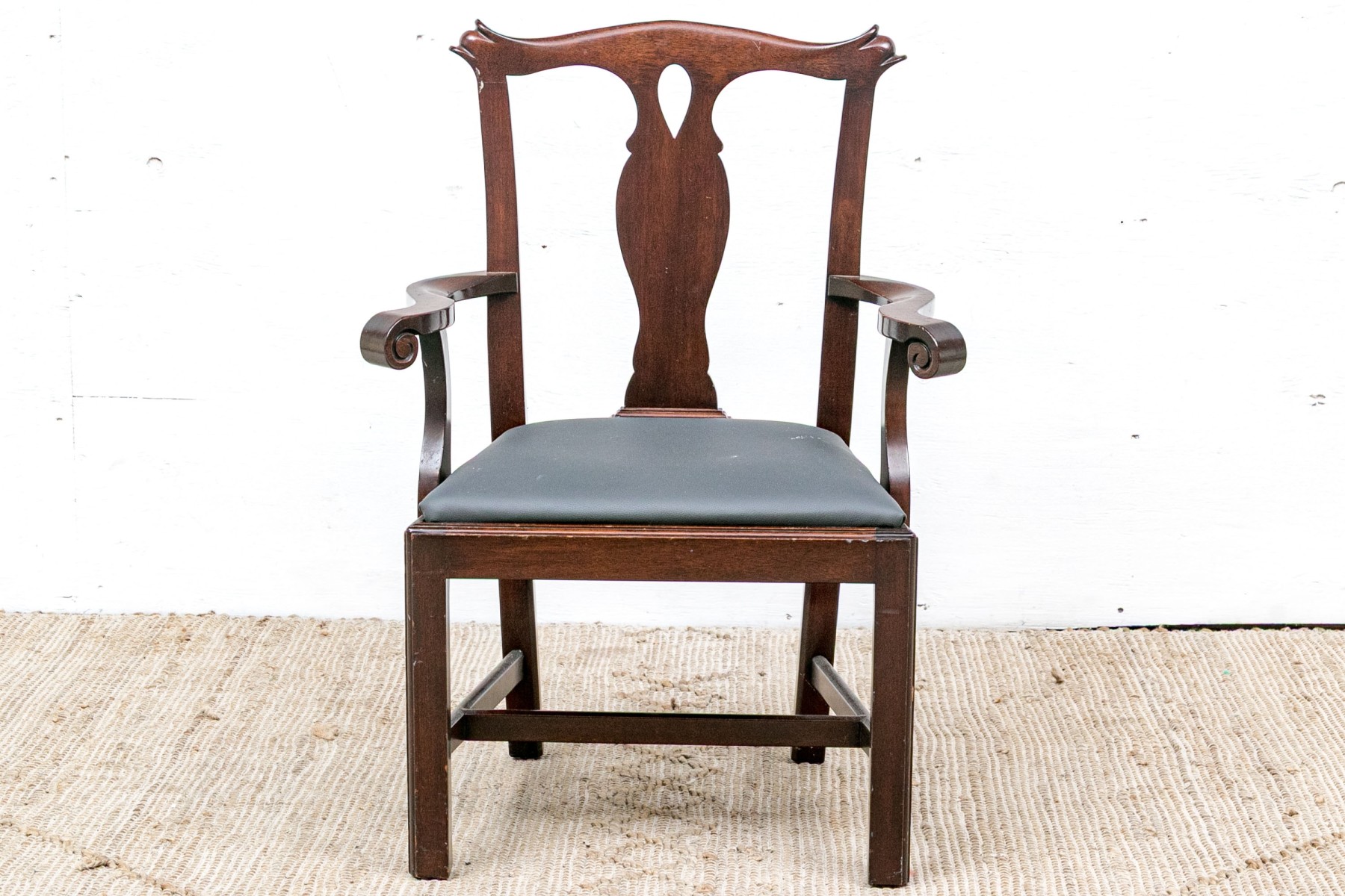 A classic mahogany Georgian style armchair for a child. The curved crest rail with scrolled ends, vasiform splat and curved arms switch scrolled ends. Raised on square legs with an H stretcher. The seat upholstered in gray faux leather.