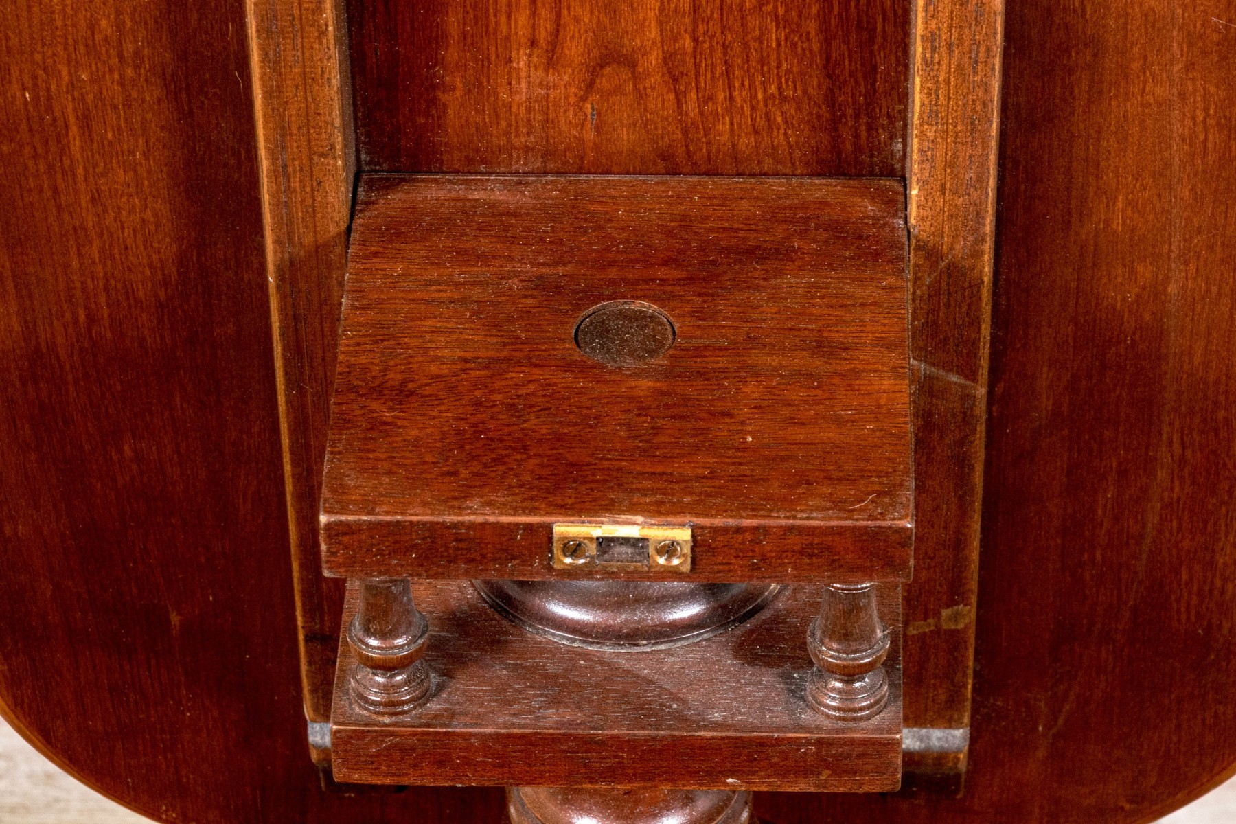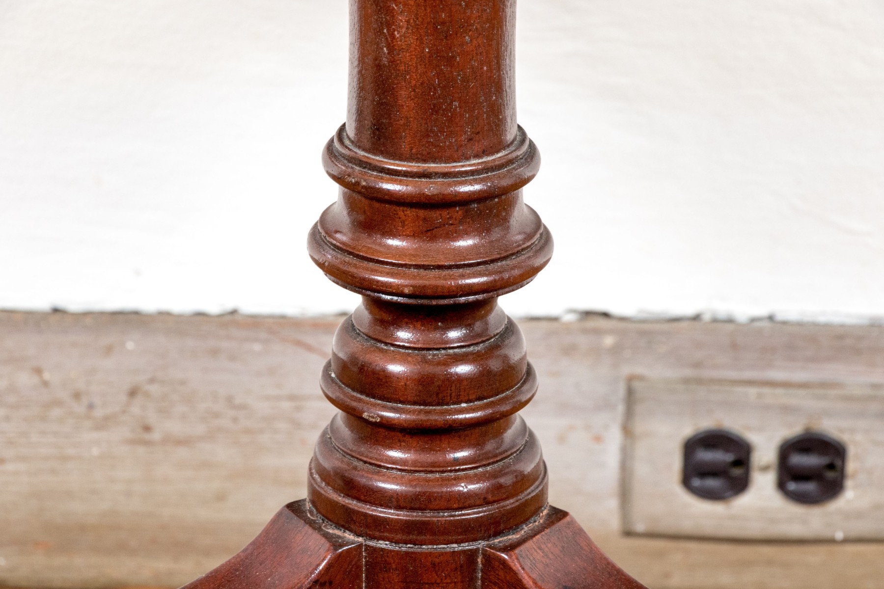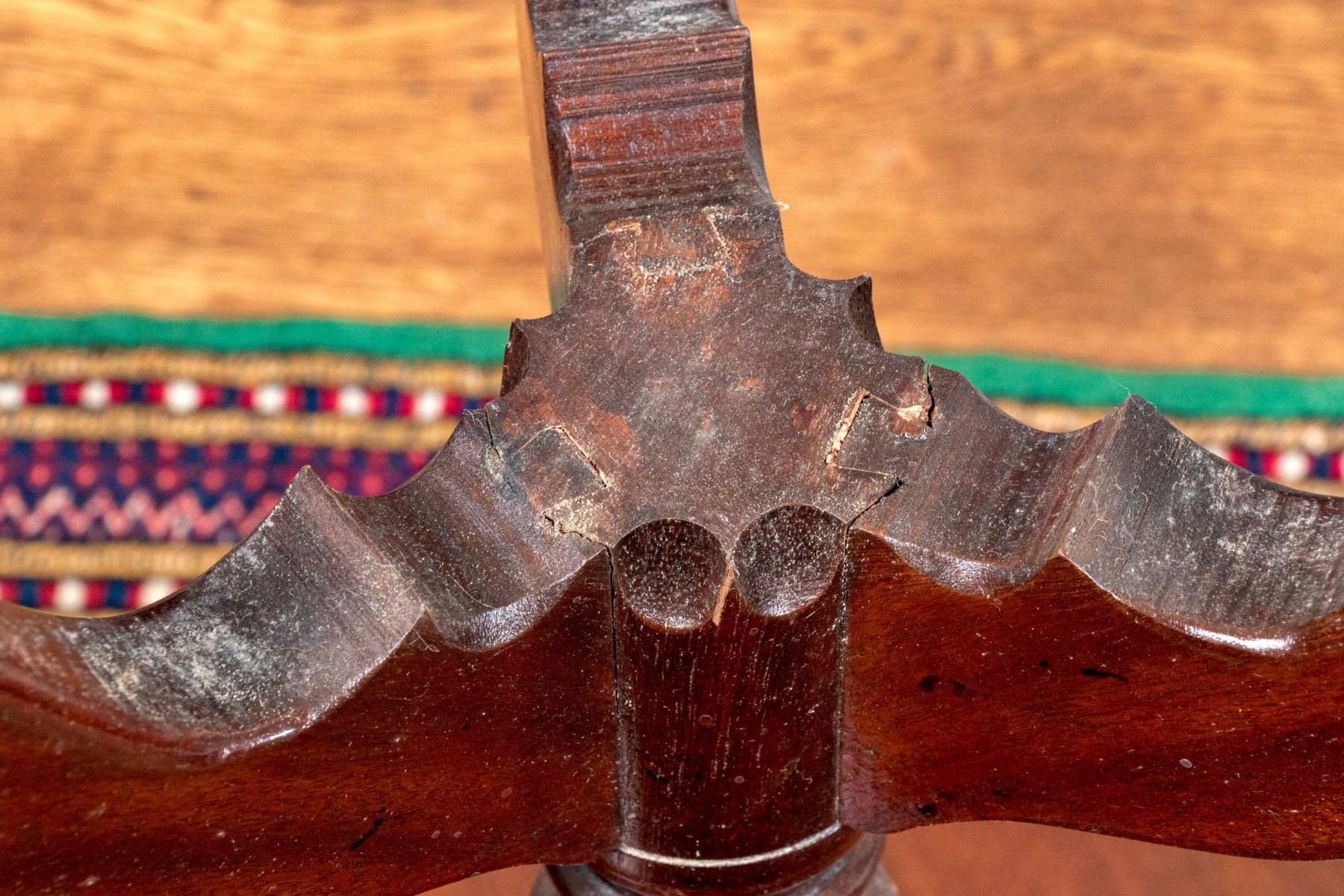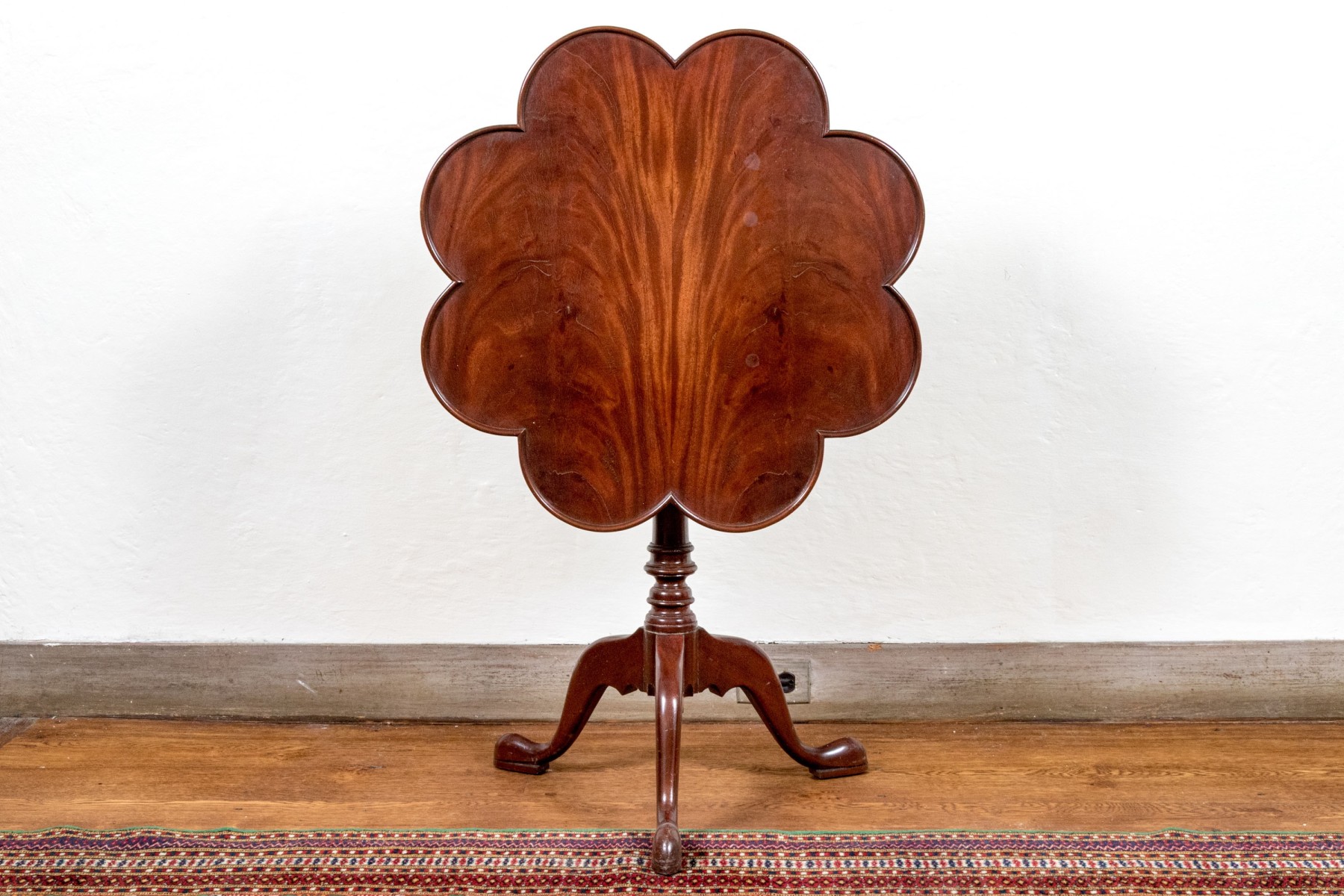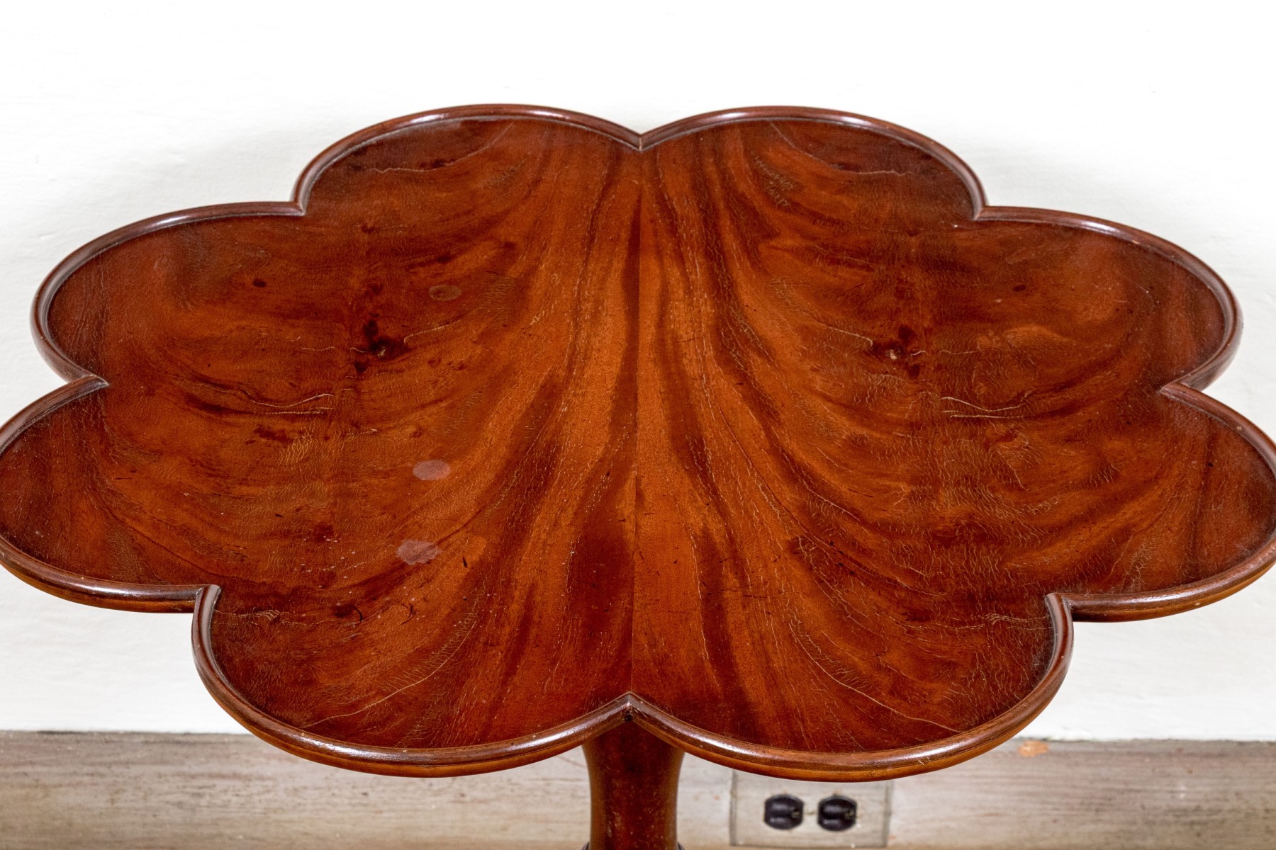 The Georgian style Mahogany clover form tilt top wine stand has a clover form, scalloped table top with low gallery around the trim.