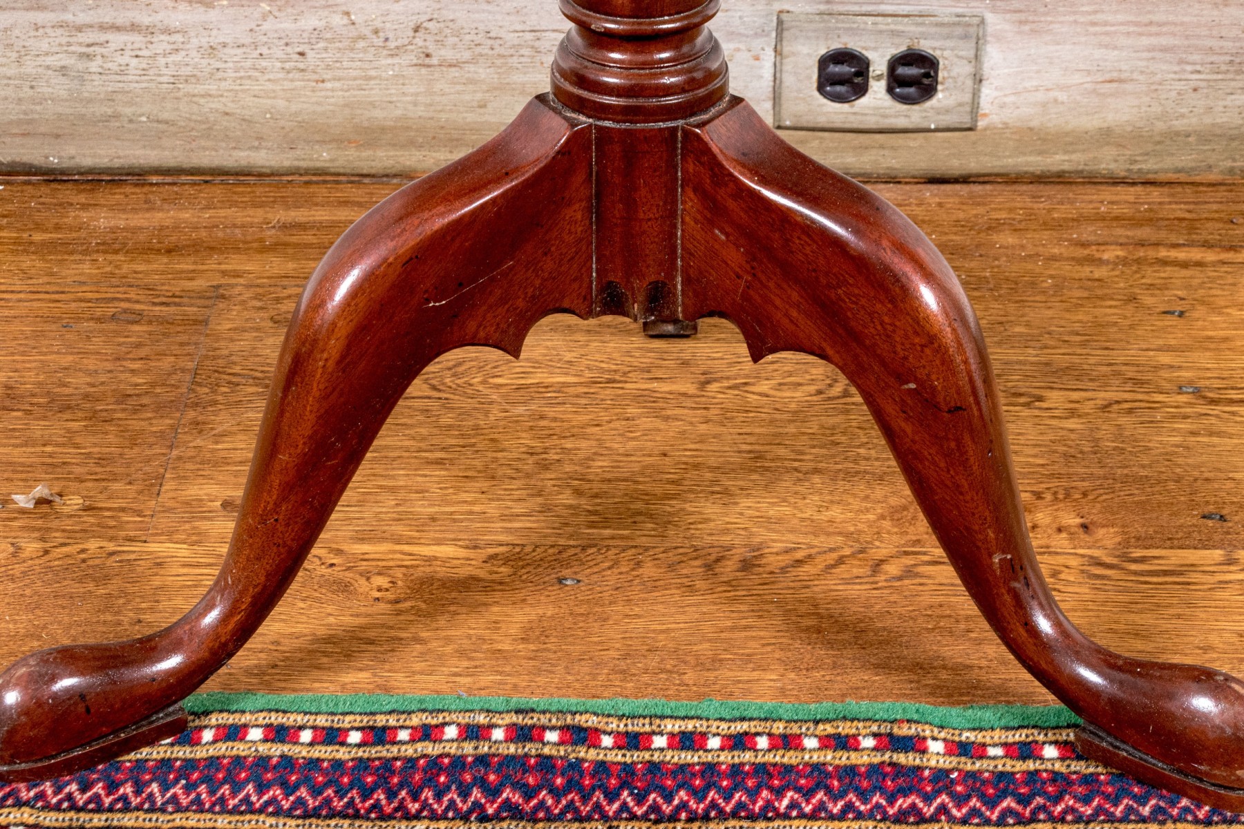 The clover form mahogany wine stand has a bird cage tilt top mechanism on a baluster form pedestal with three elegantly carved and finished legs with slipper form feet.