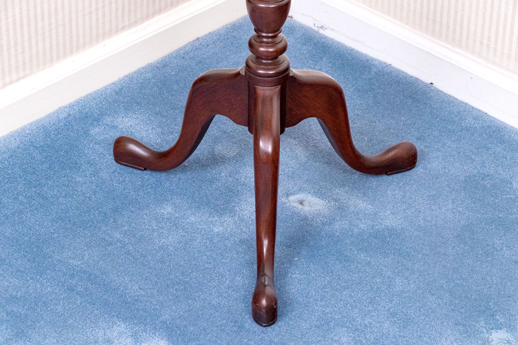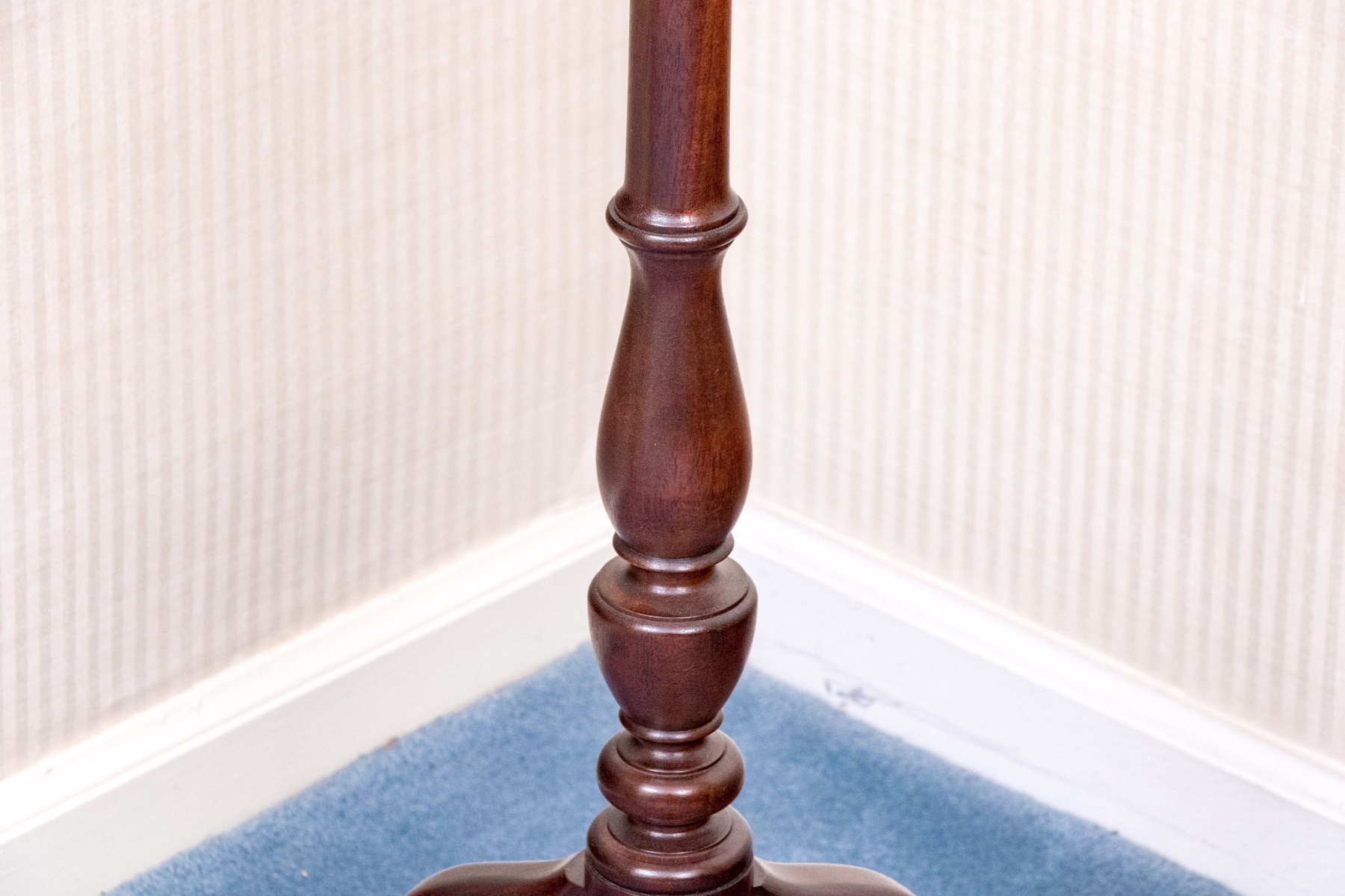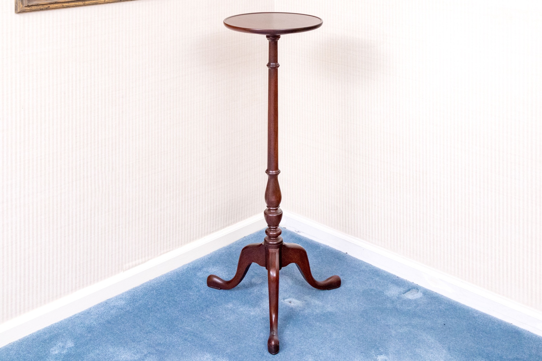 Raised upon three carved cabriole legs with slipper feet, the stand with carved post with tapered cylindrical section and baluster form section with circular top having moulded trim around the perimeter.