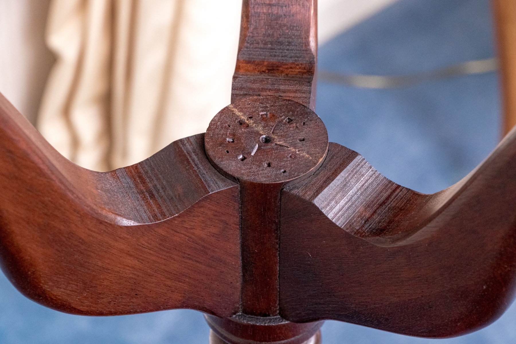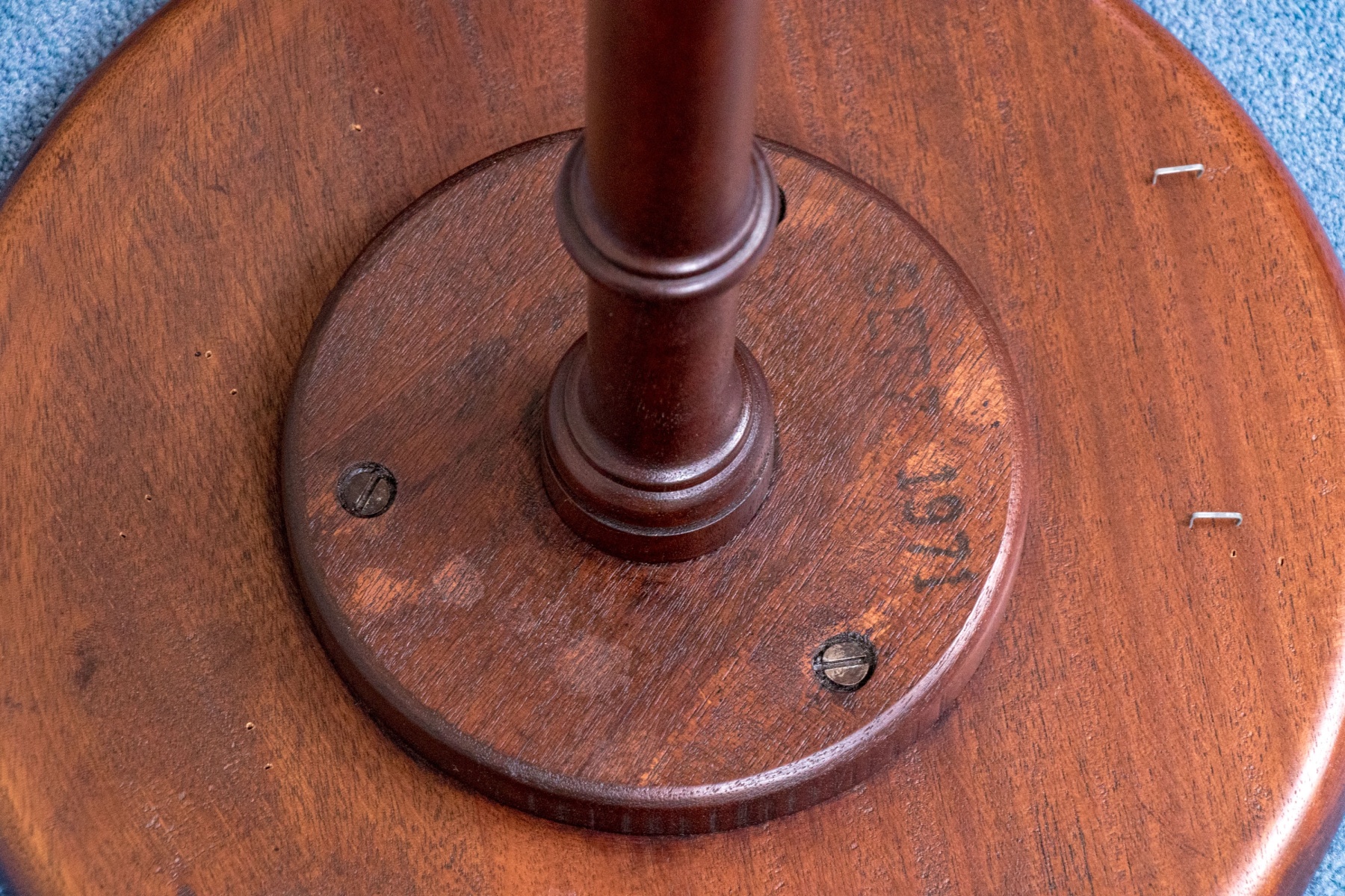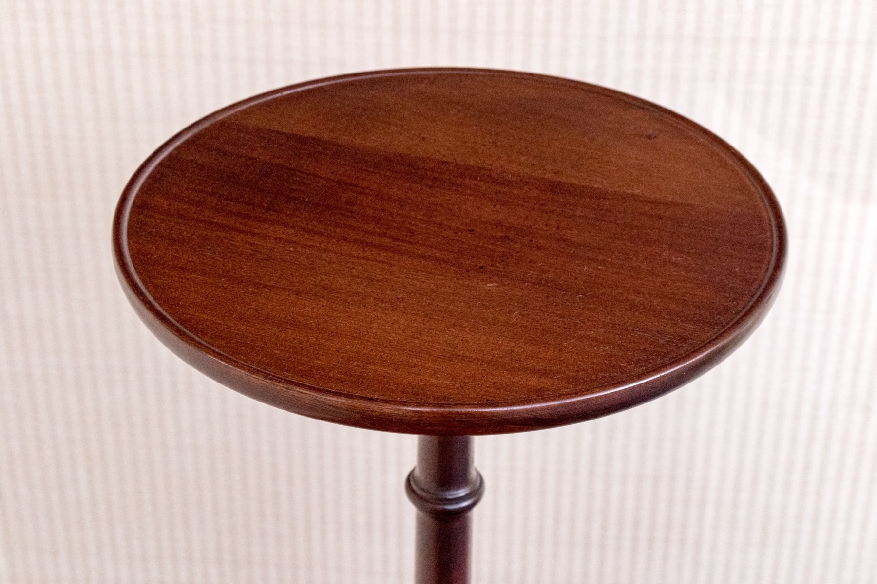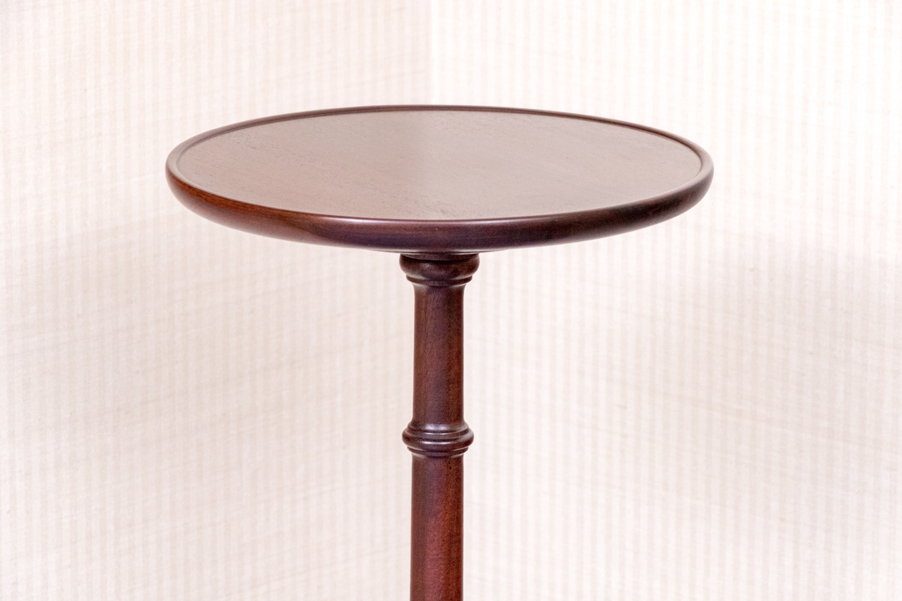 Raised upon three carved cabriole legs with slipper feet, the stand with carved post with tapered cylindrical section and baluster form section with circular top having moulded trim around the perimeter.