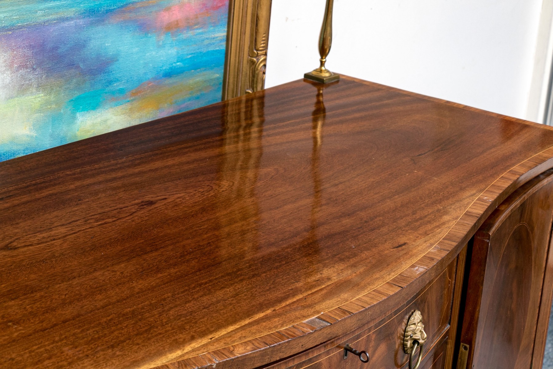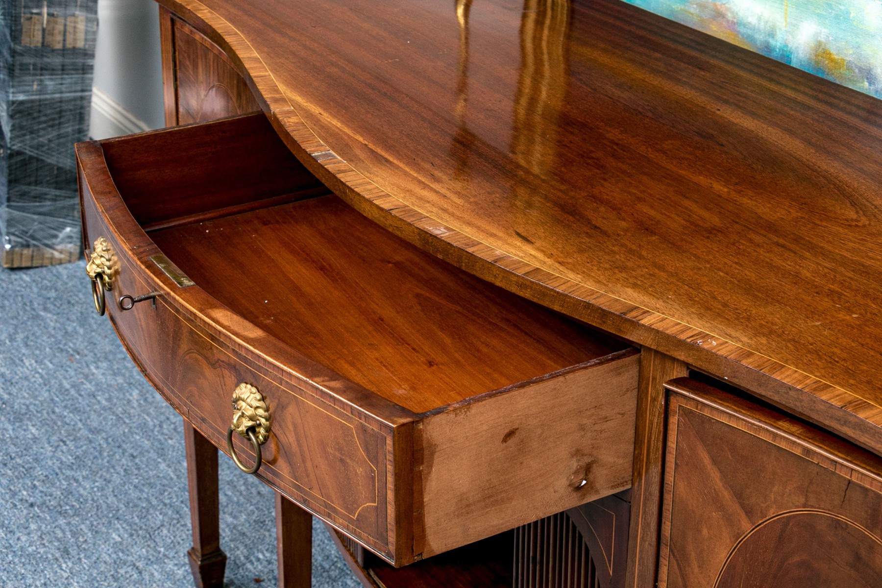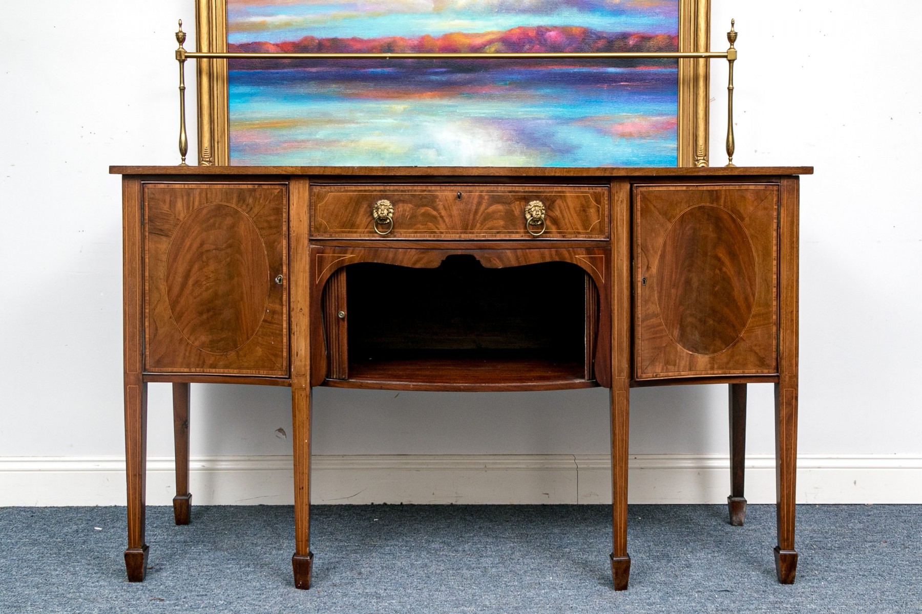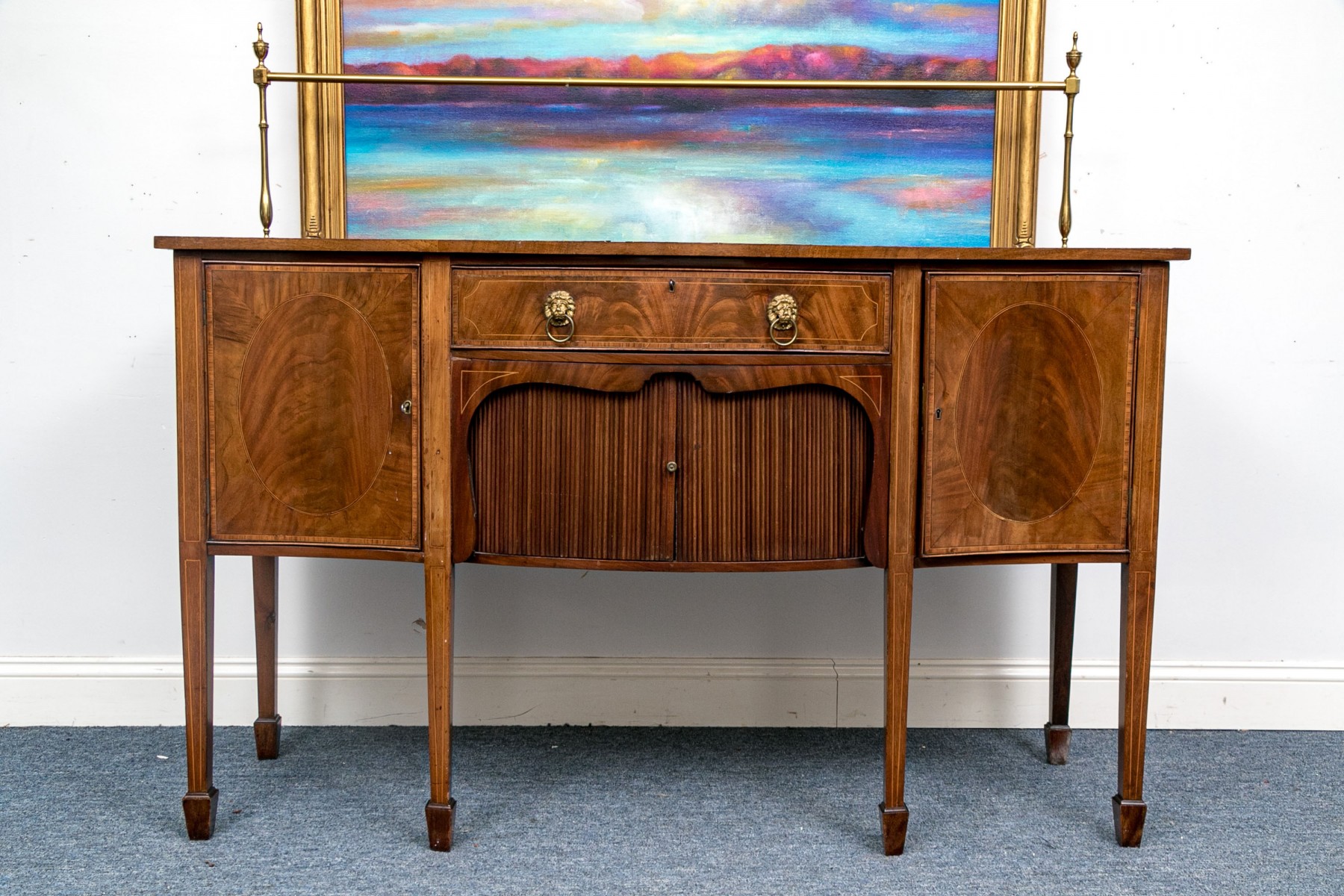 A handsome Georgian style mahogany veneered sideboard with refined finishes including the oval inlaid highly figured mahogany veneer and classic brass back gallery.