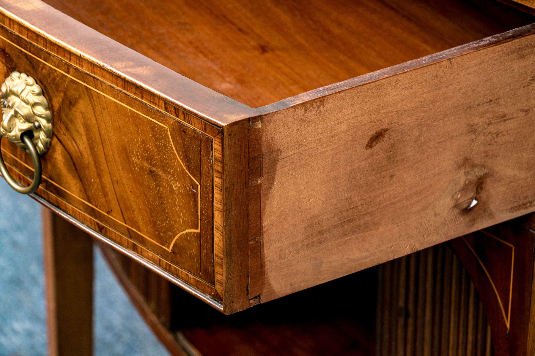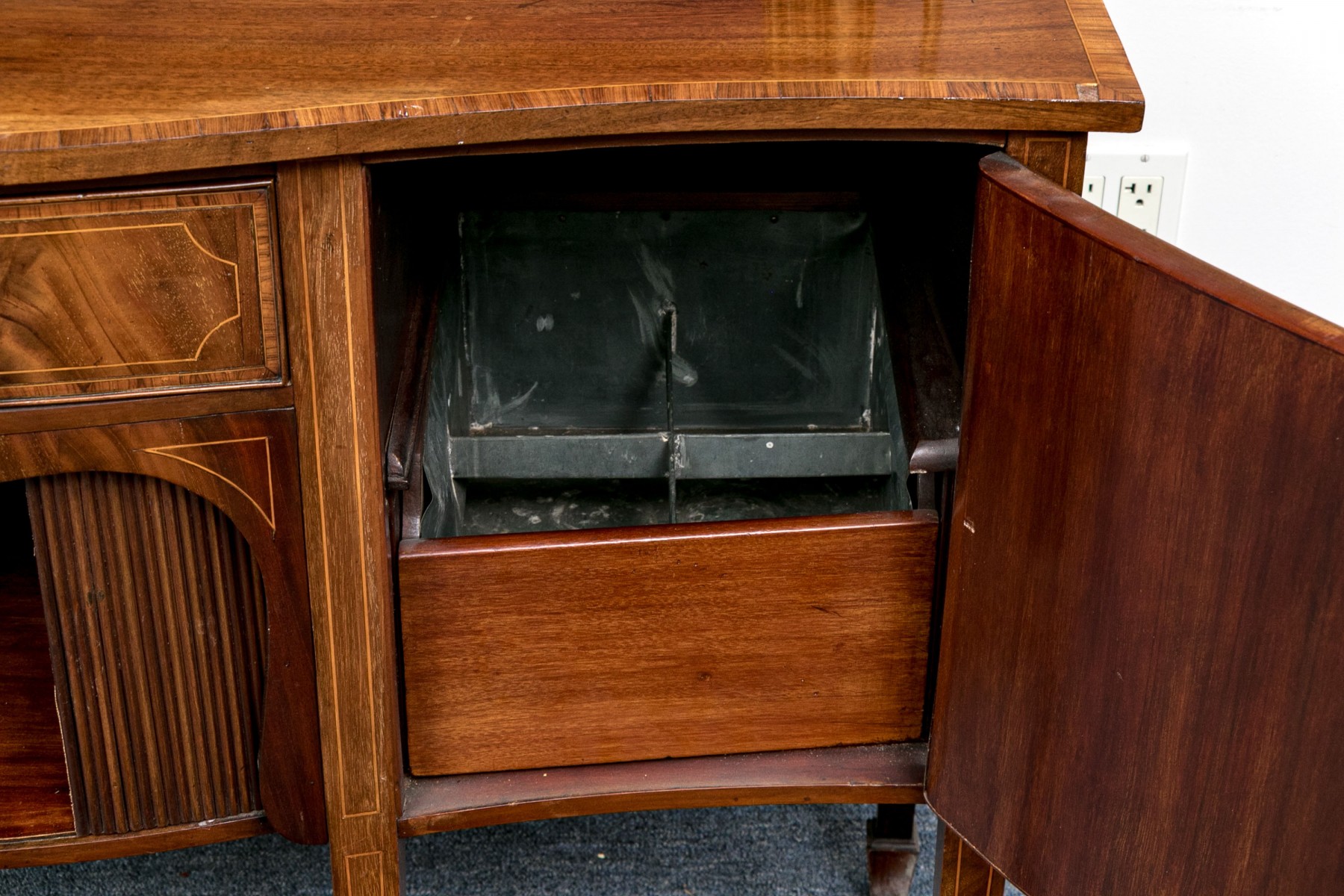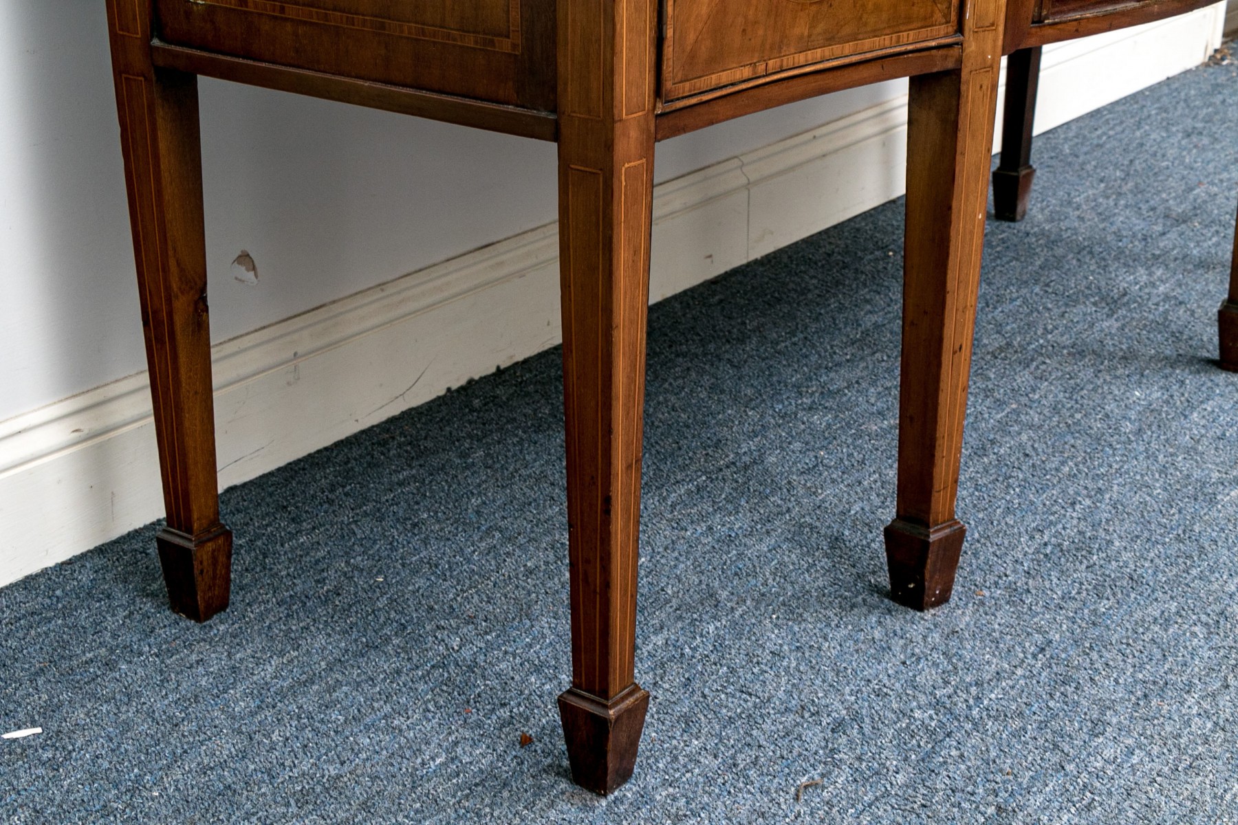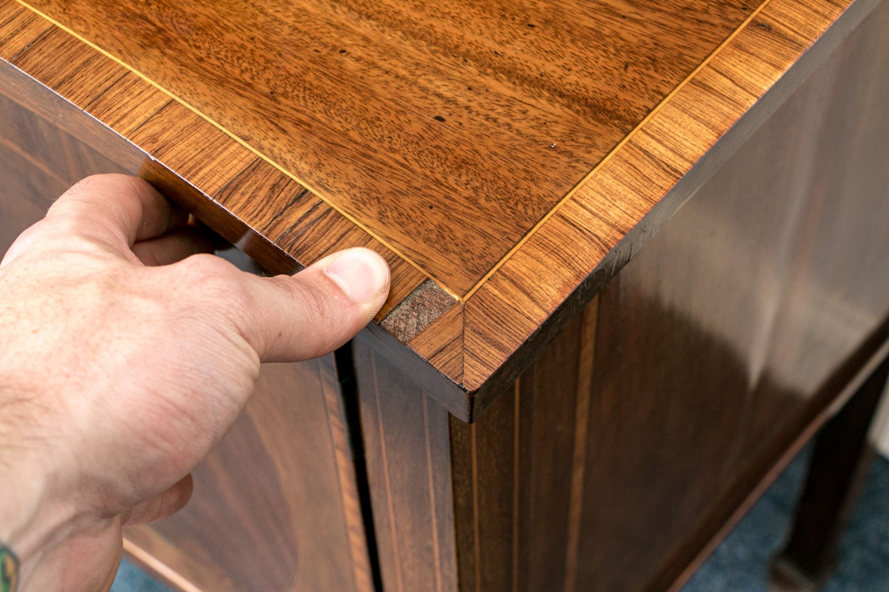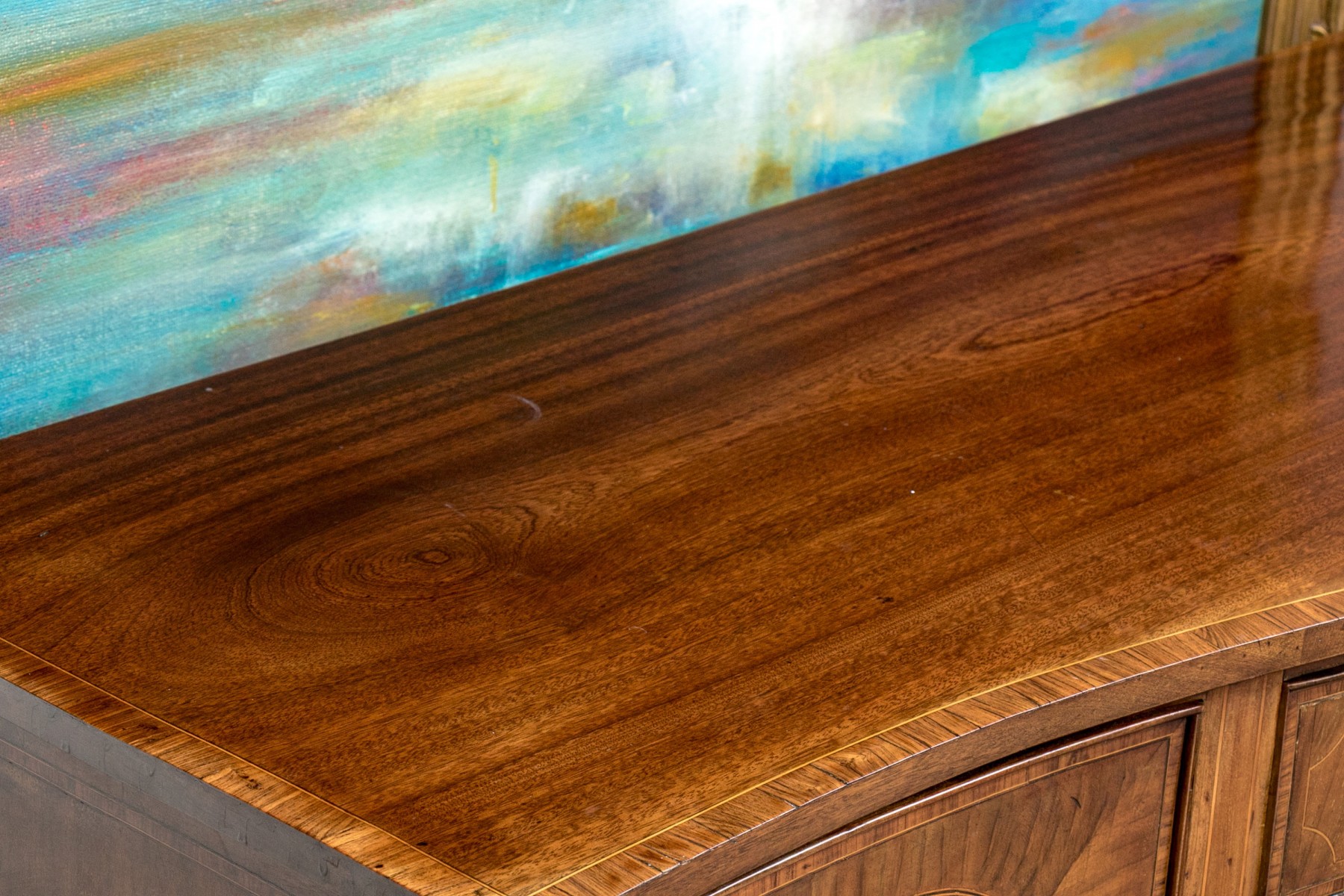 A handsome Georgian style mahogany veneered sideboard with refined finishes including the oval inlaid highly figured mahogany veneer and classic brass back gallery.