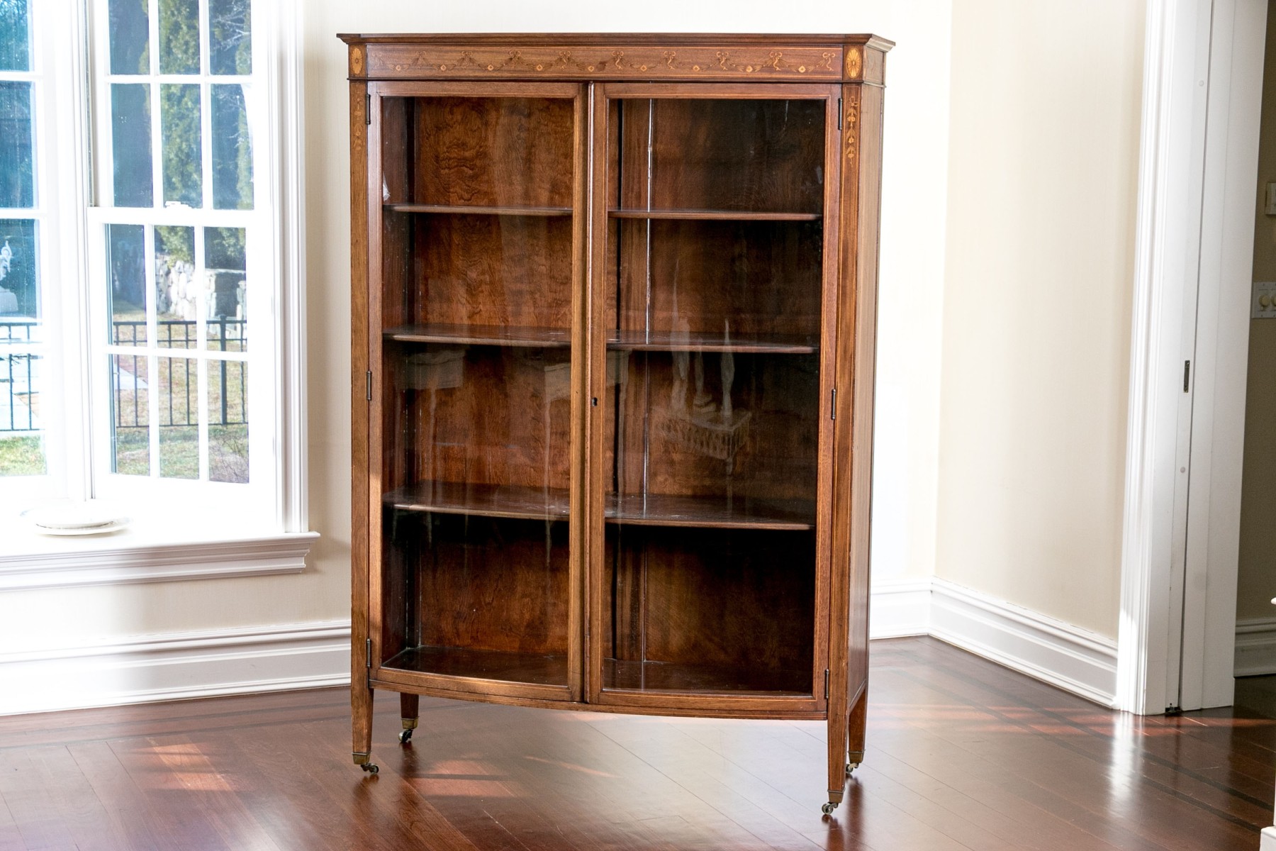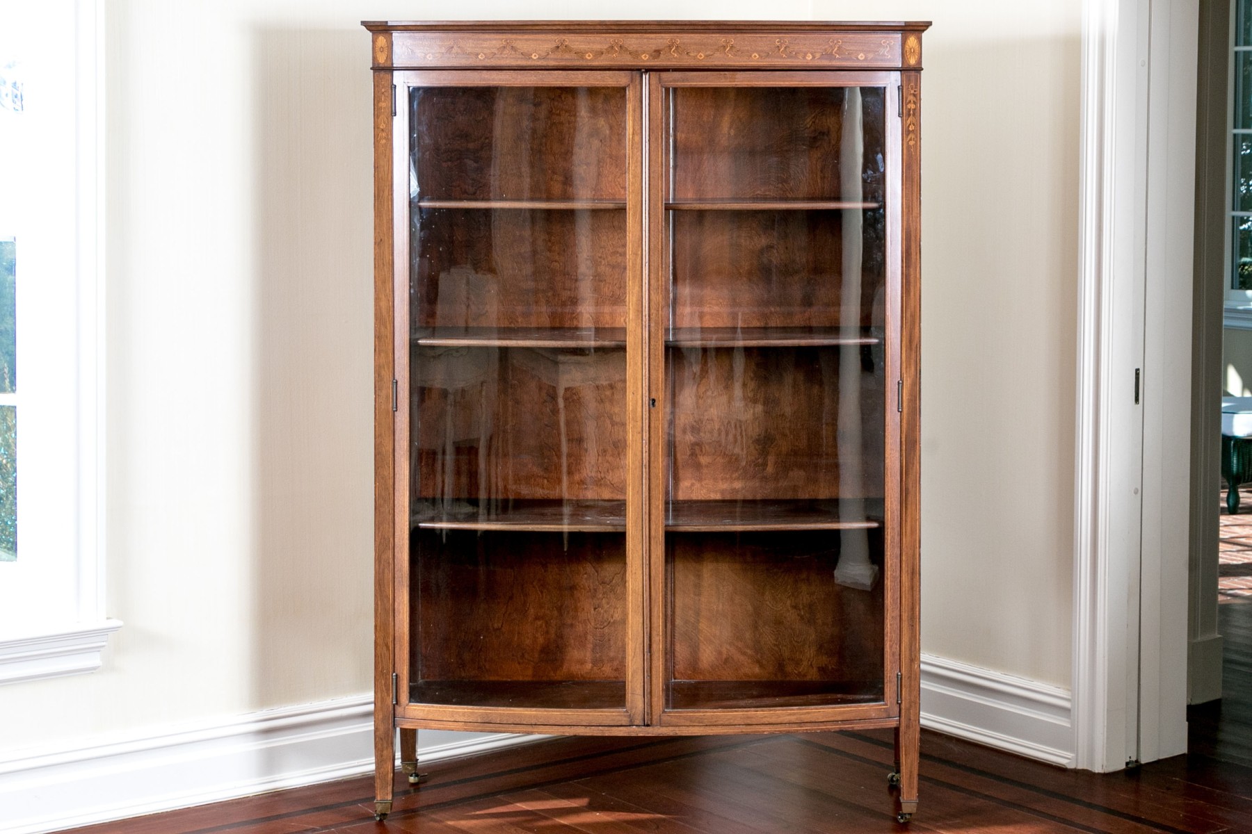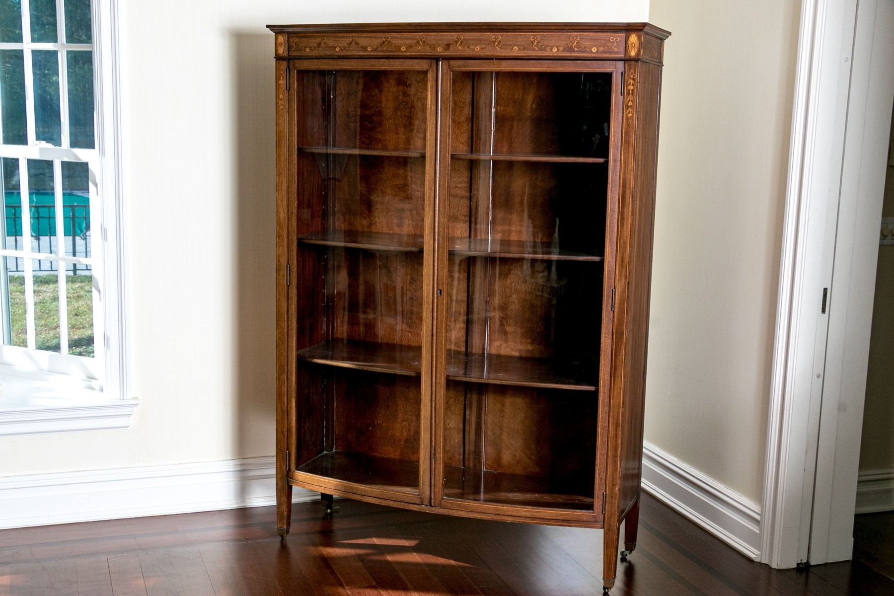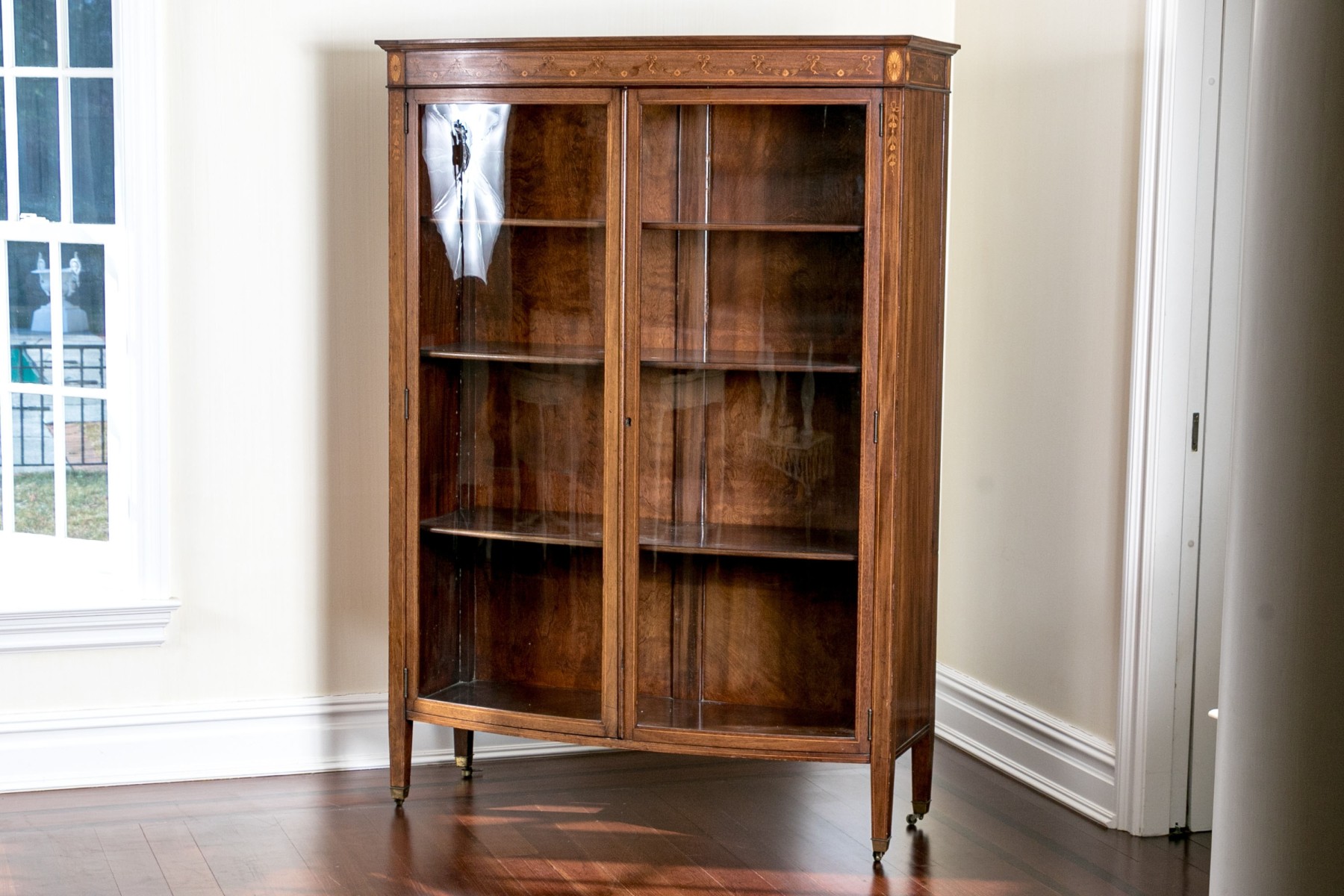On four square tapered legs with brass toecaps and casters. The case is raised with two hinged doors, each with glass panels. Interior fitted with three shelves. Ornately inlaid with satinwood to the upper trim with oval fans to either end below the top.