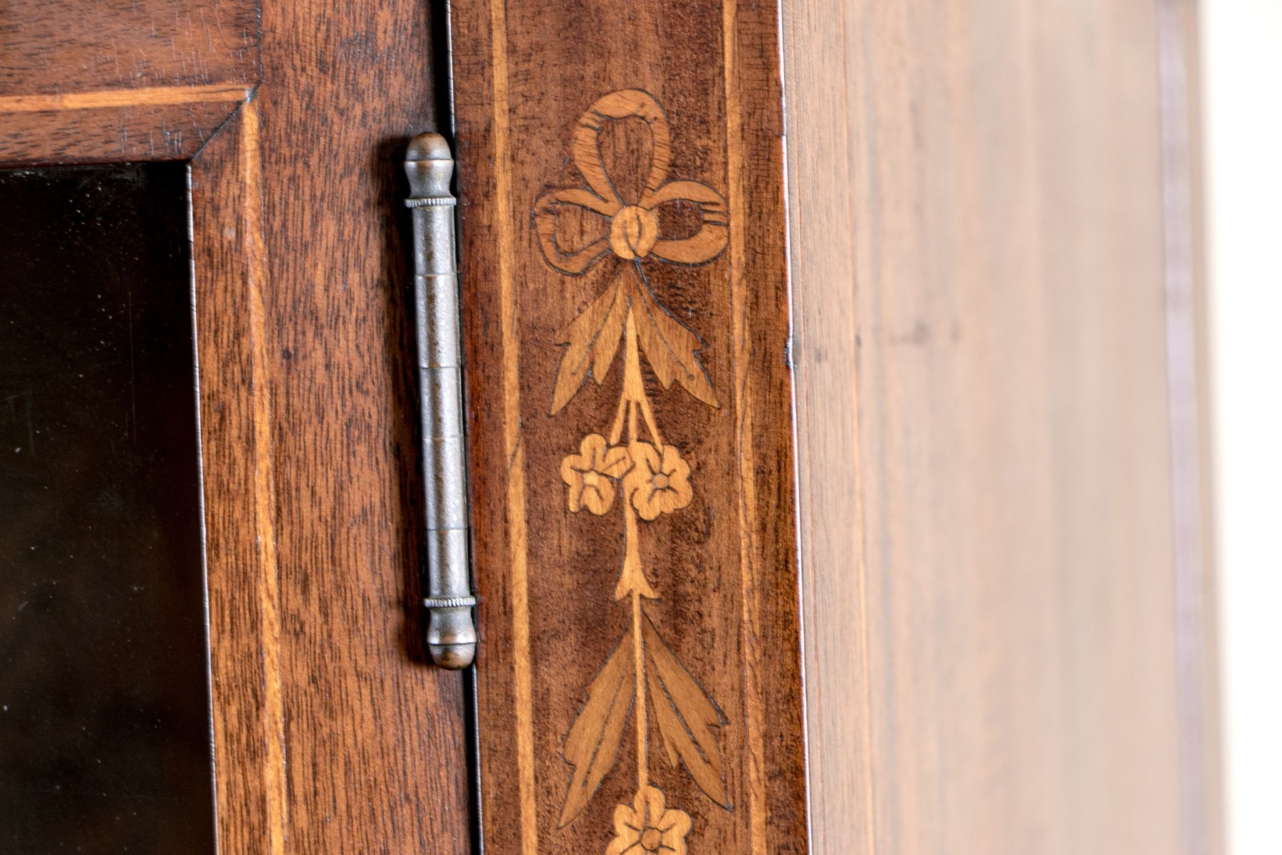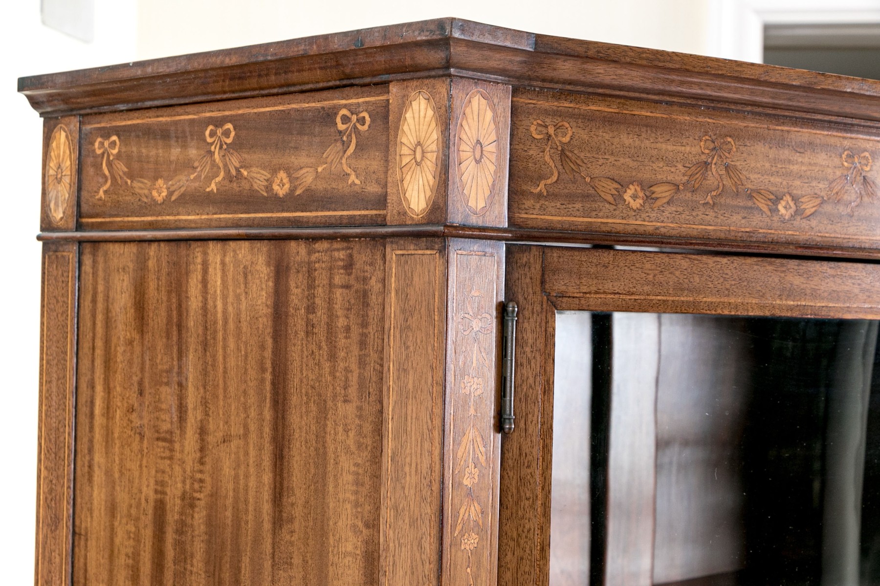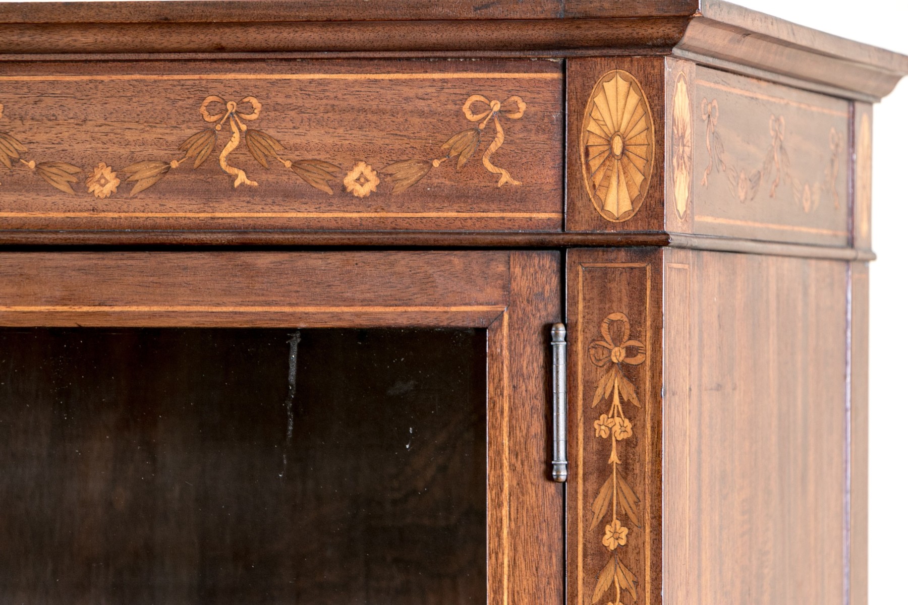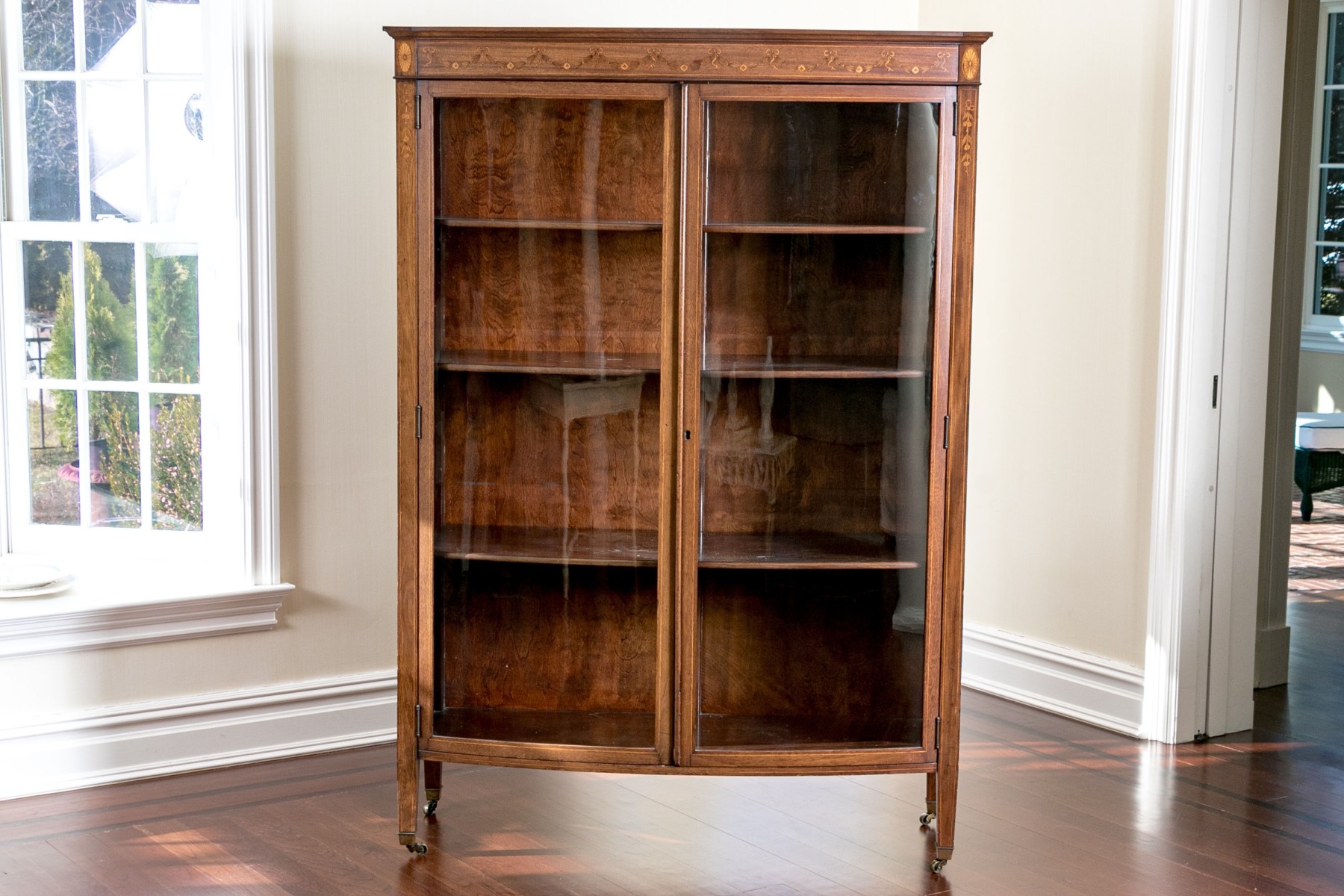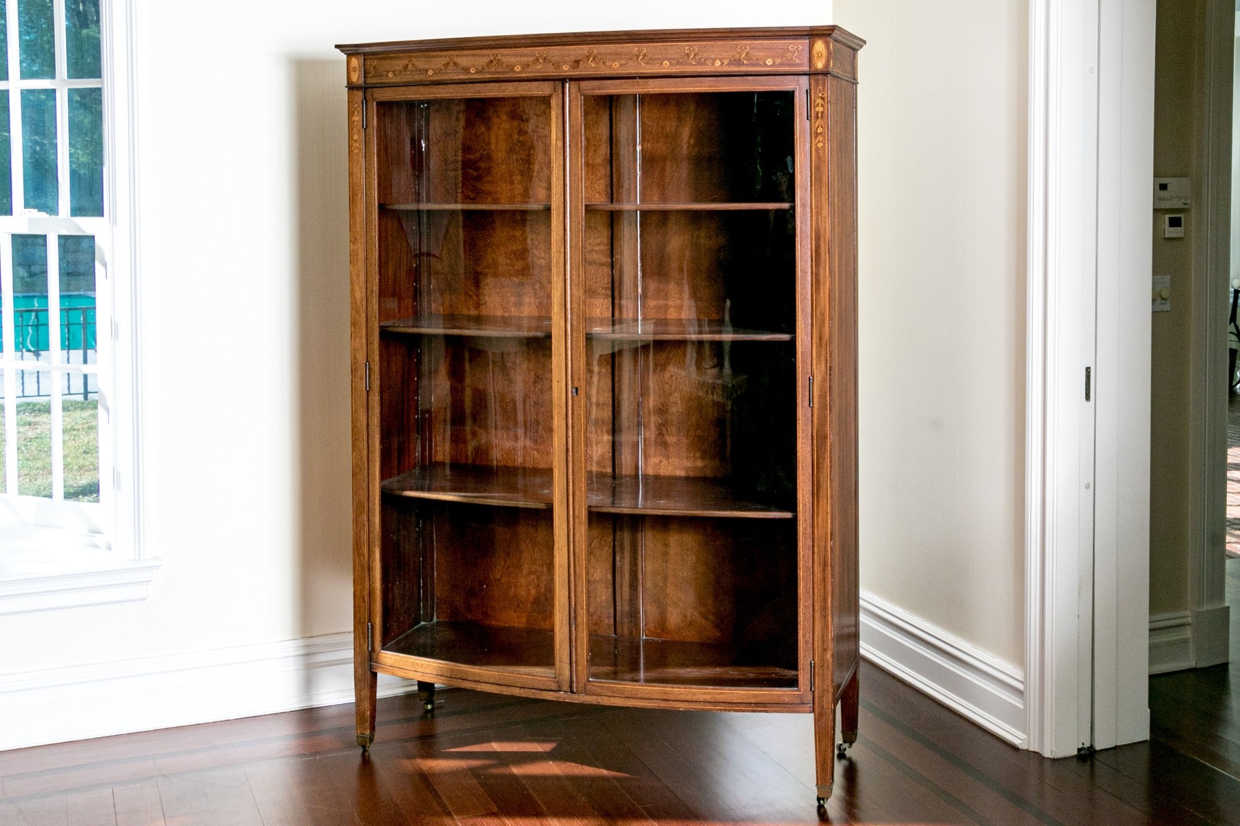 On four square tapered legs with brass toecaps and casters. The case is raised with two hinged doors, each with glass panels. Interior fitted with three shelves. Ornately inlaid with satinwood to the upper trim with oval fans to either end below the top.