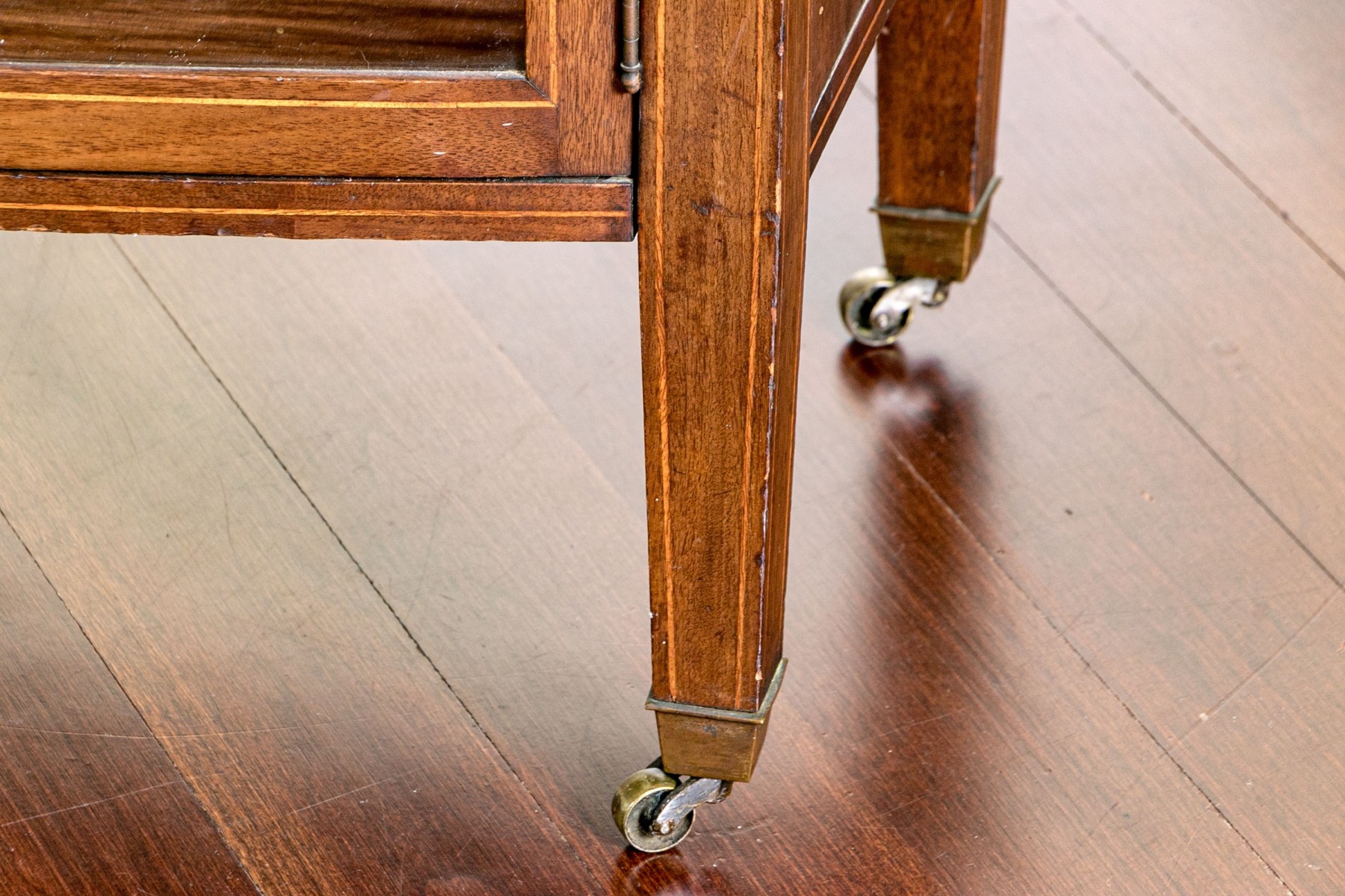 One of the casters slips out of the brass toe cap when moved. Warping to the shelves. Slight wear around the finish with minute and gentle wear but overall presents well.