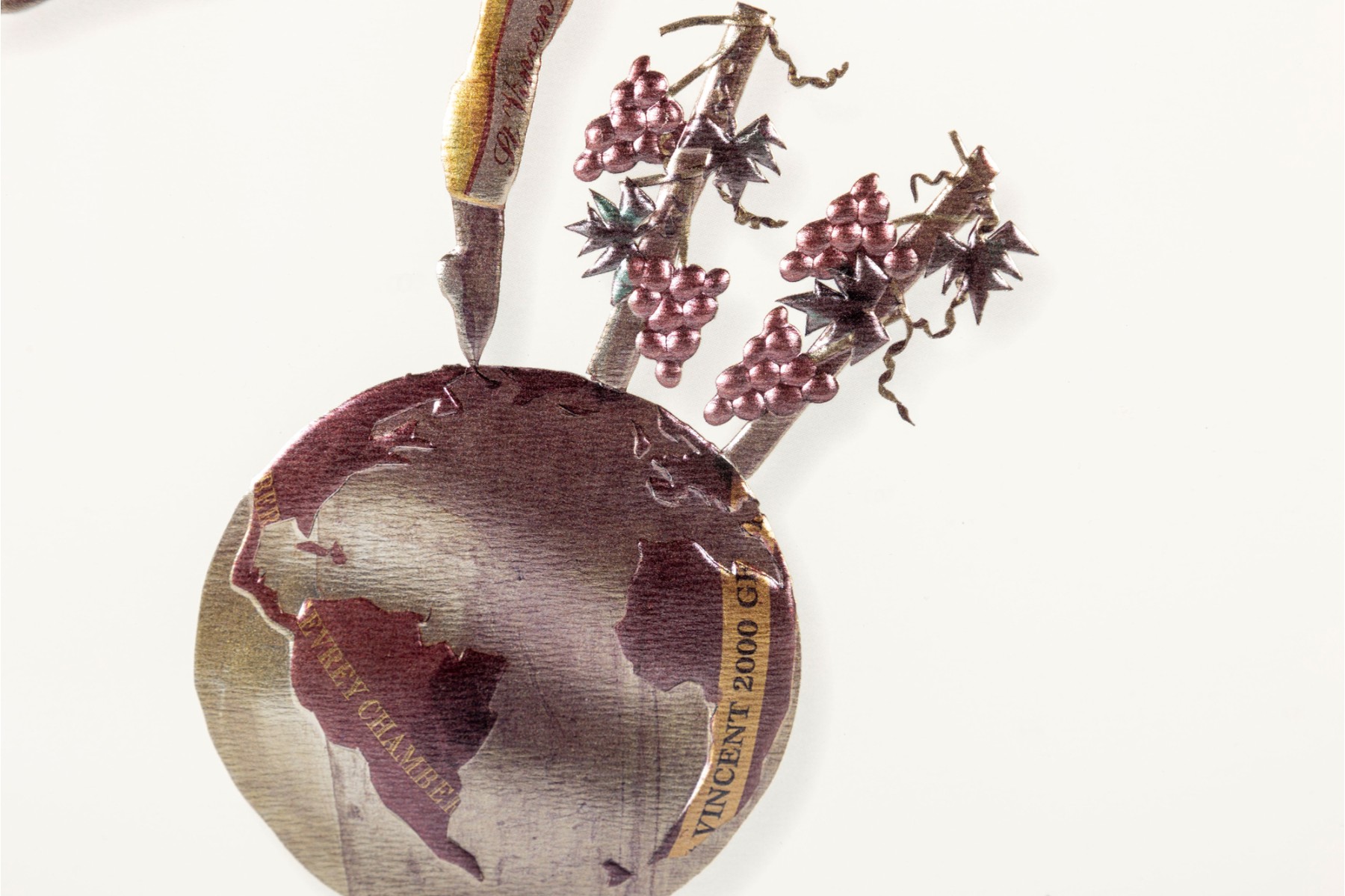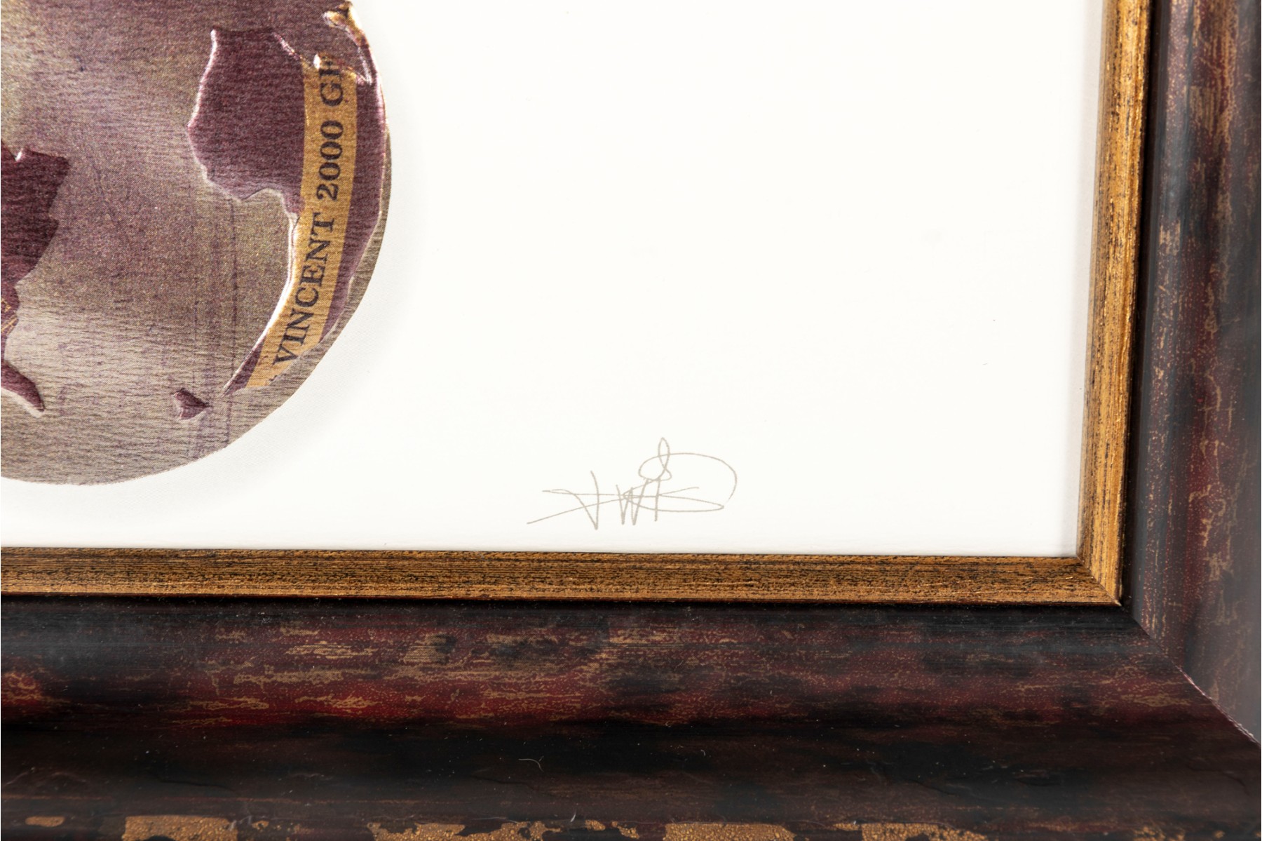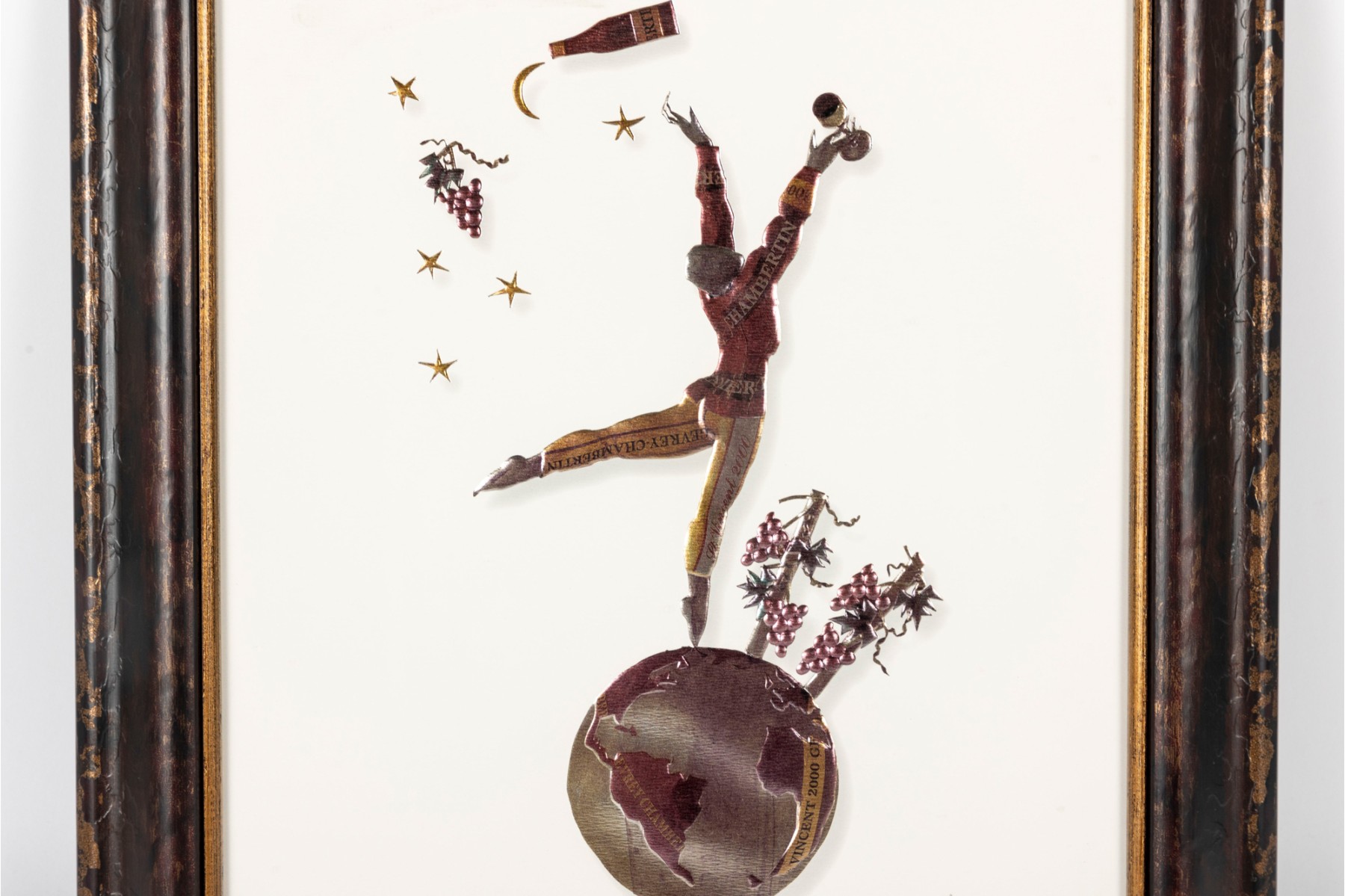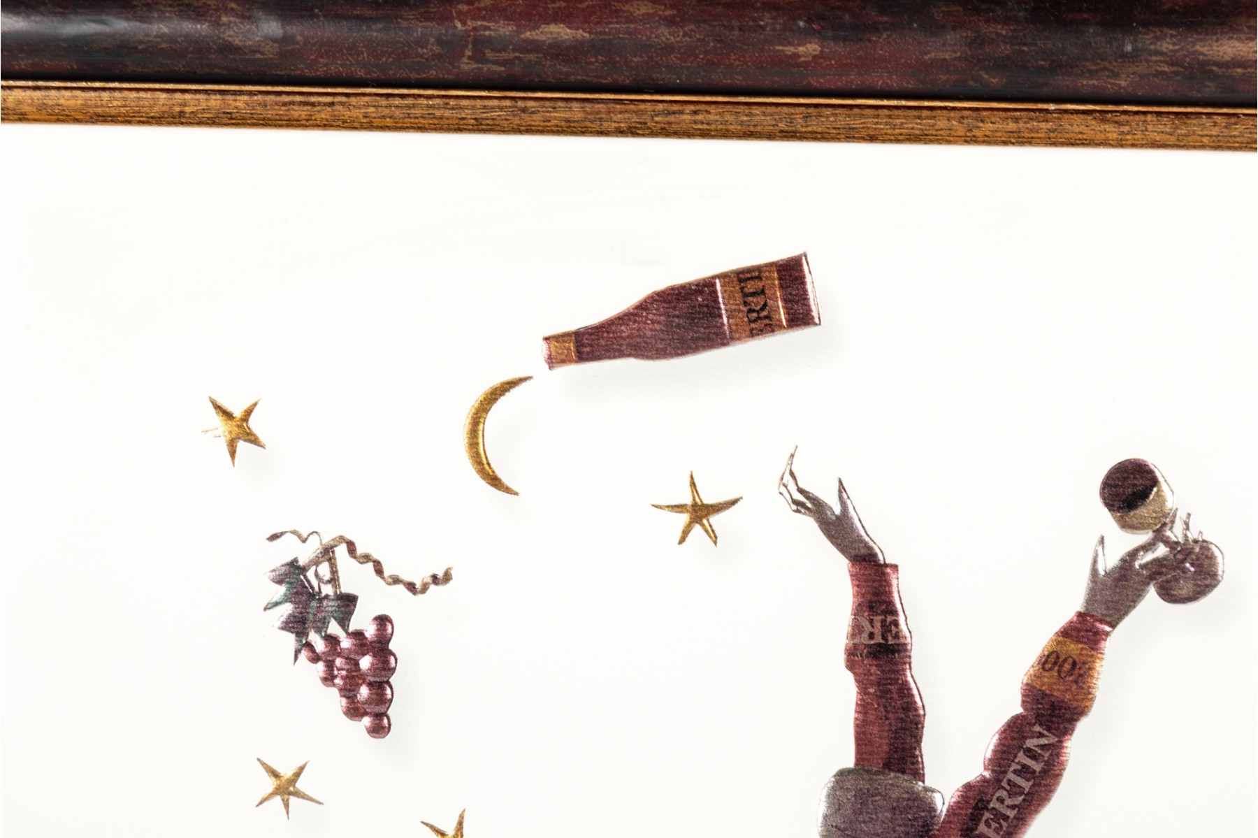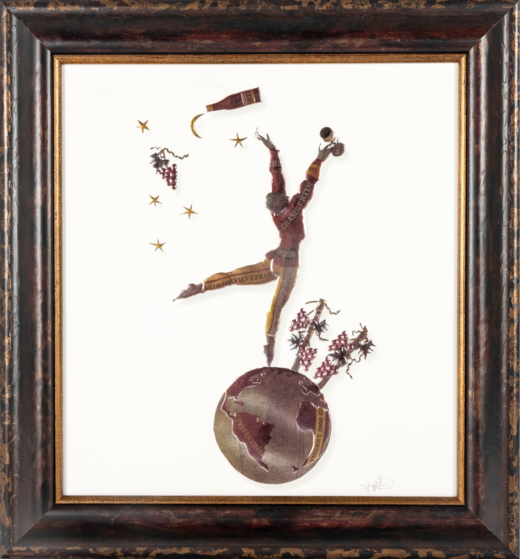 Gerard Puvis (French, b. 1950) mixed media wine bottle foil on paper depicting a figure holding a cup while reaching for a bottle of wine among the stars, posing delicately over a globe with a trellis of grapes. Signed lower right. Information about the artist and art is affixed to the back of the frame. Displayed behind glass in a distressed gilt and red-brown frame.