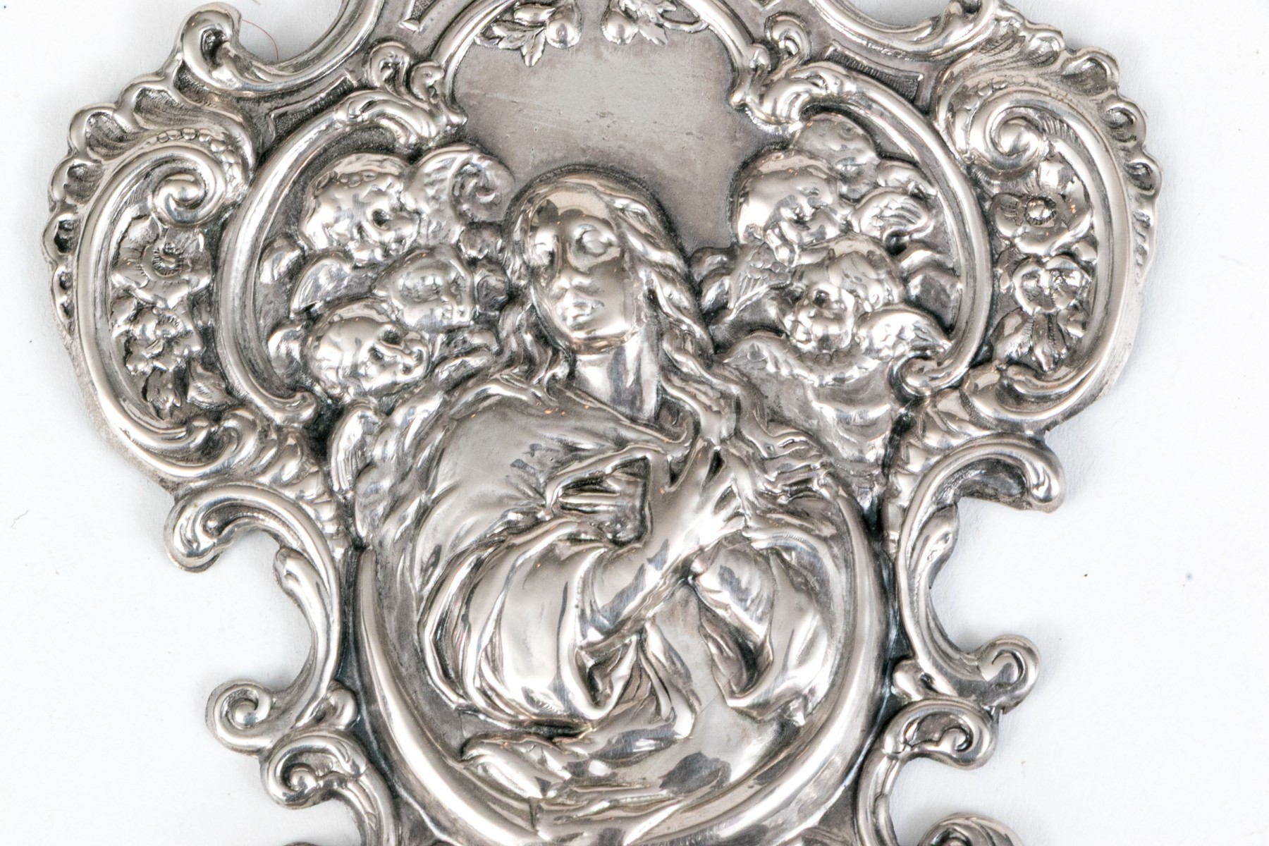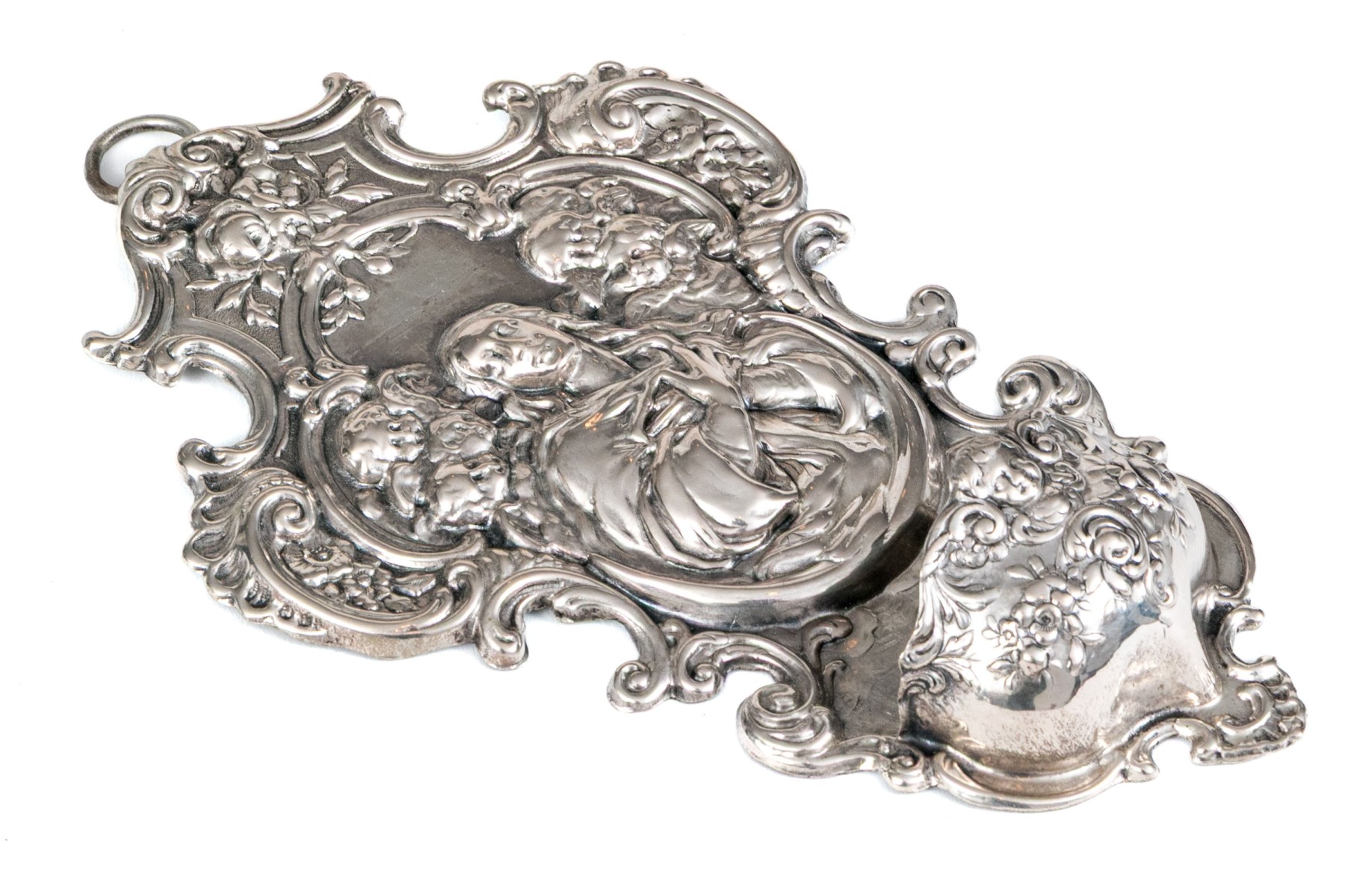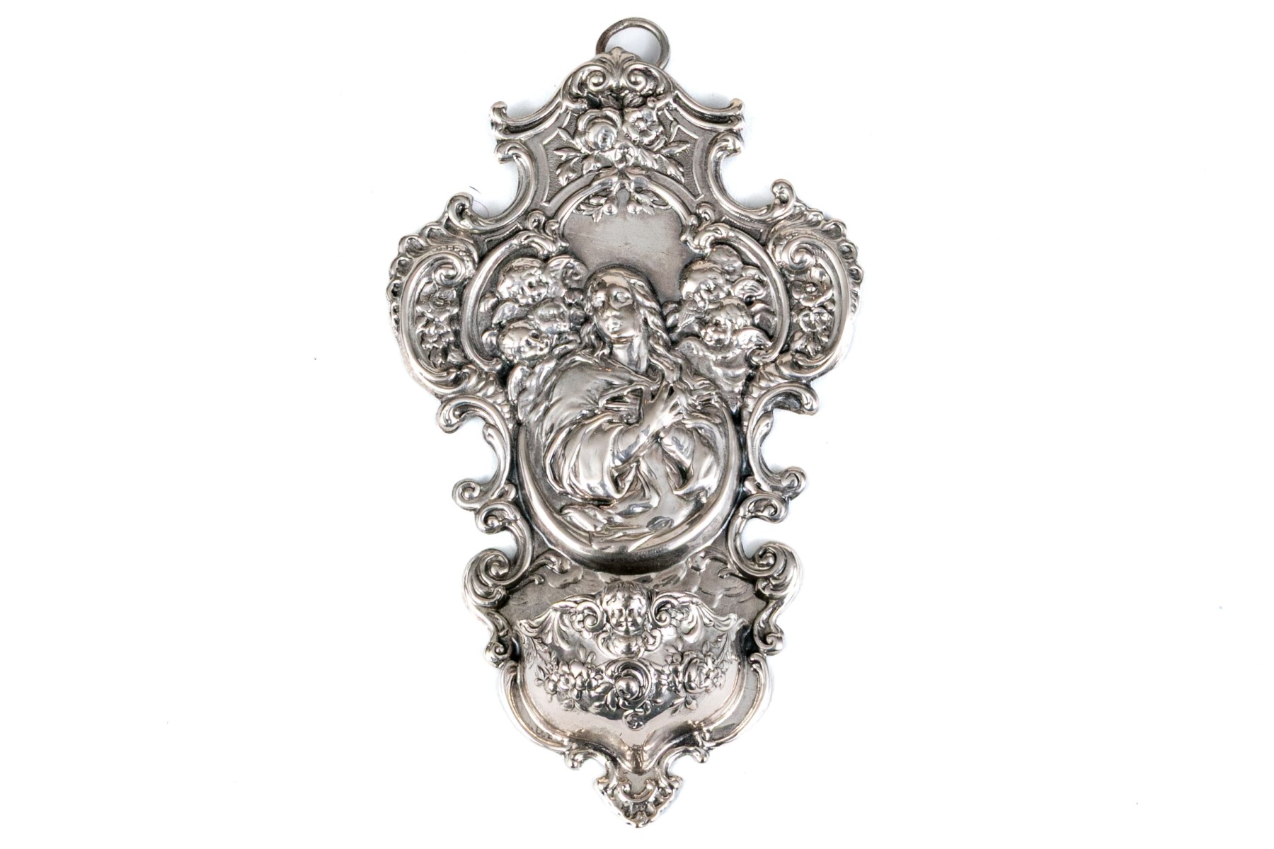 A lavish coin silver wall hanging stoup showcasing a shapely tapering form with repousse scrolled relief around the edges surrounding a central scene of a figure with cherubs and a lower basin for holy water below. Marked on the verso.