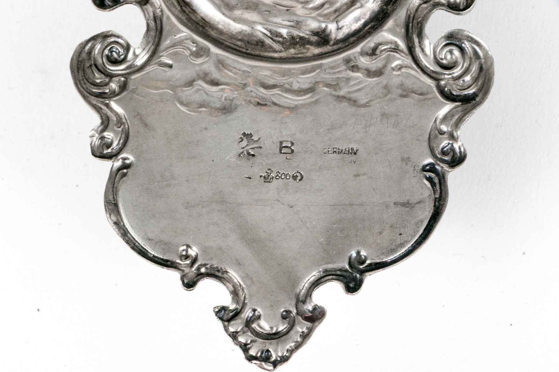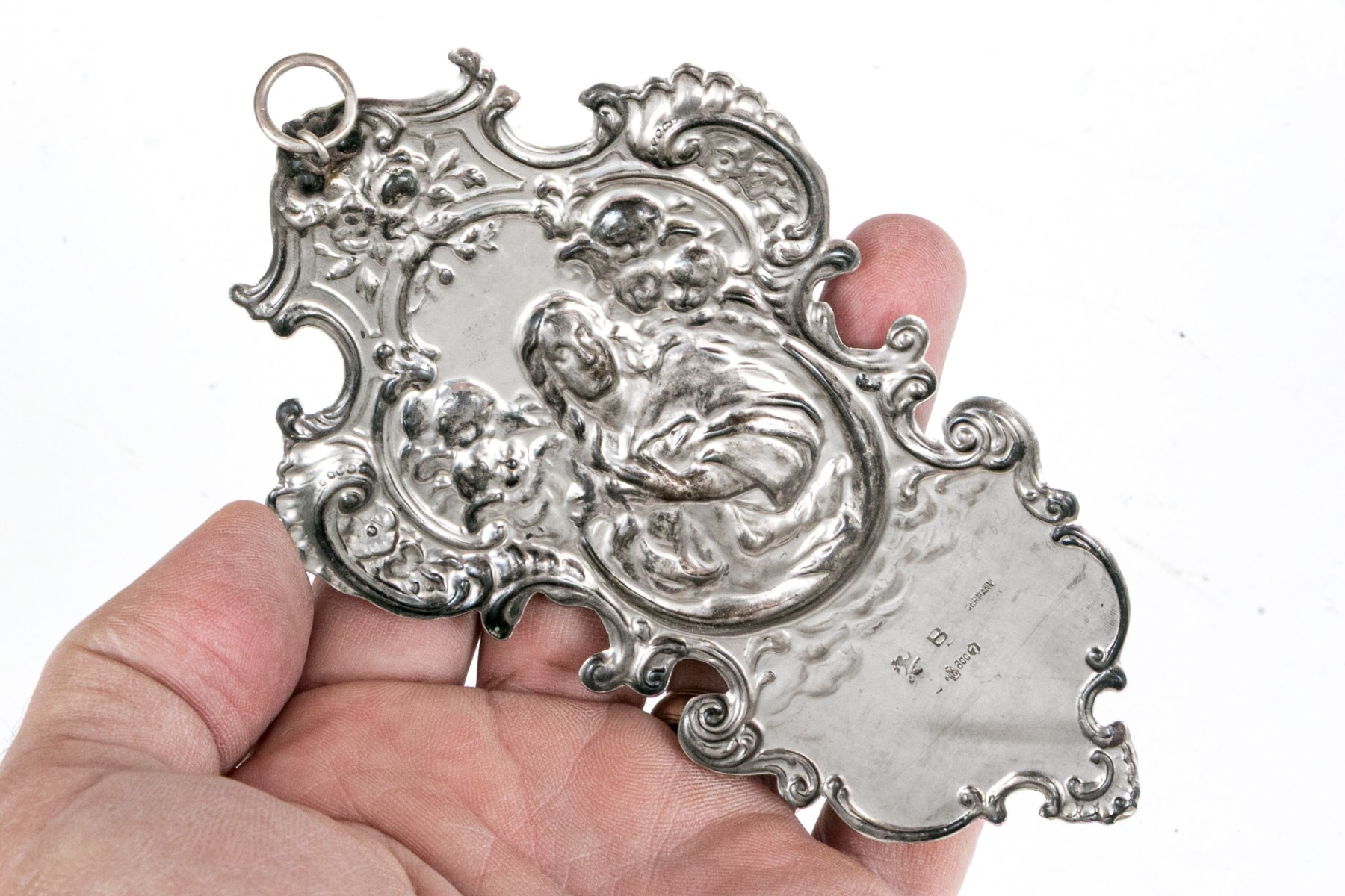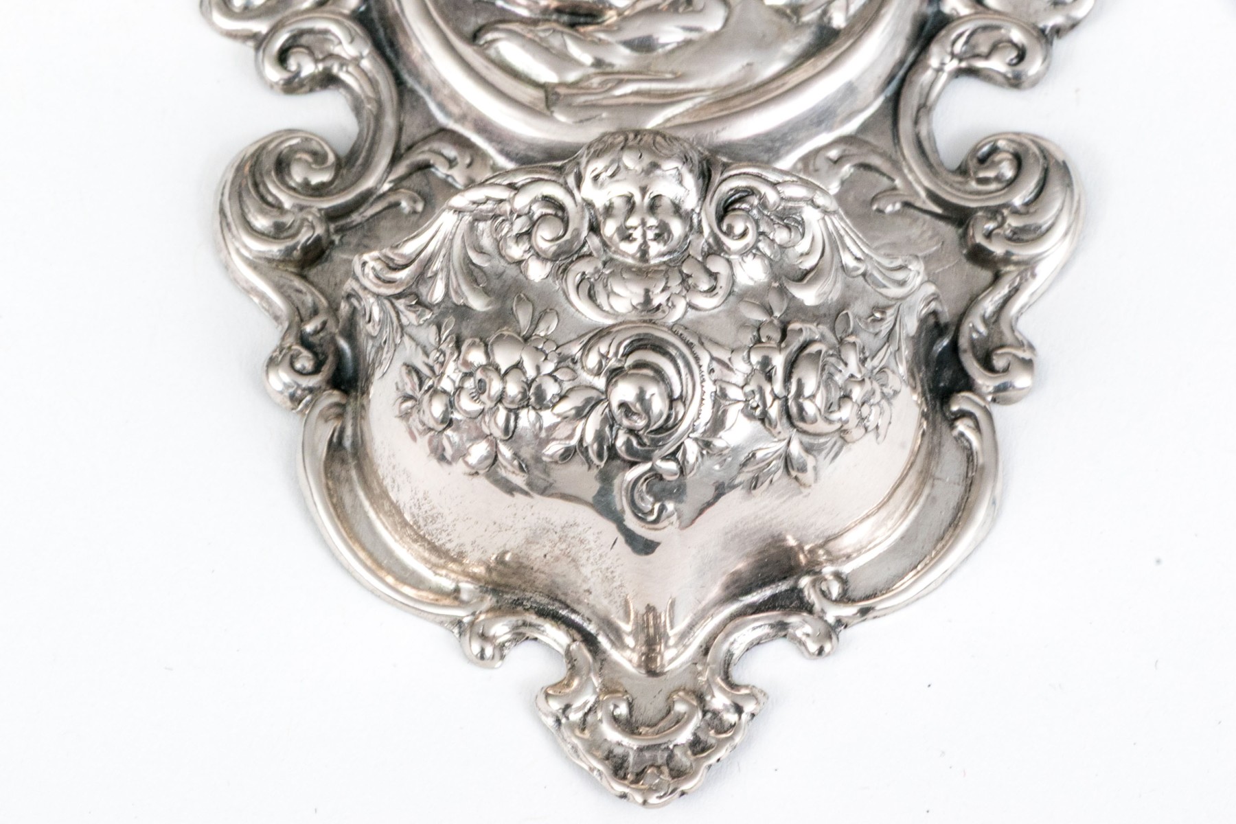 A lavish coin silver wall hanging stoup showcasing a shapely tapering form with repousse scrolled relief around the edges surrounding a central scene of a figure with cherubs and a lower basin for holy water below. Marked on the verso.
