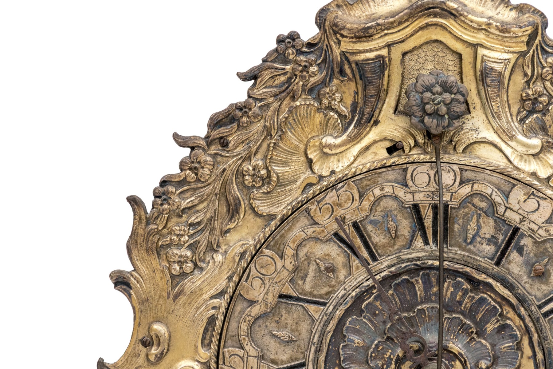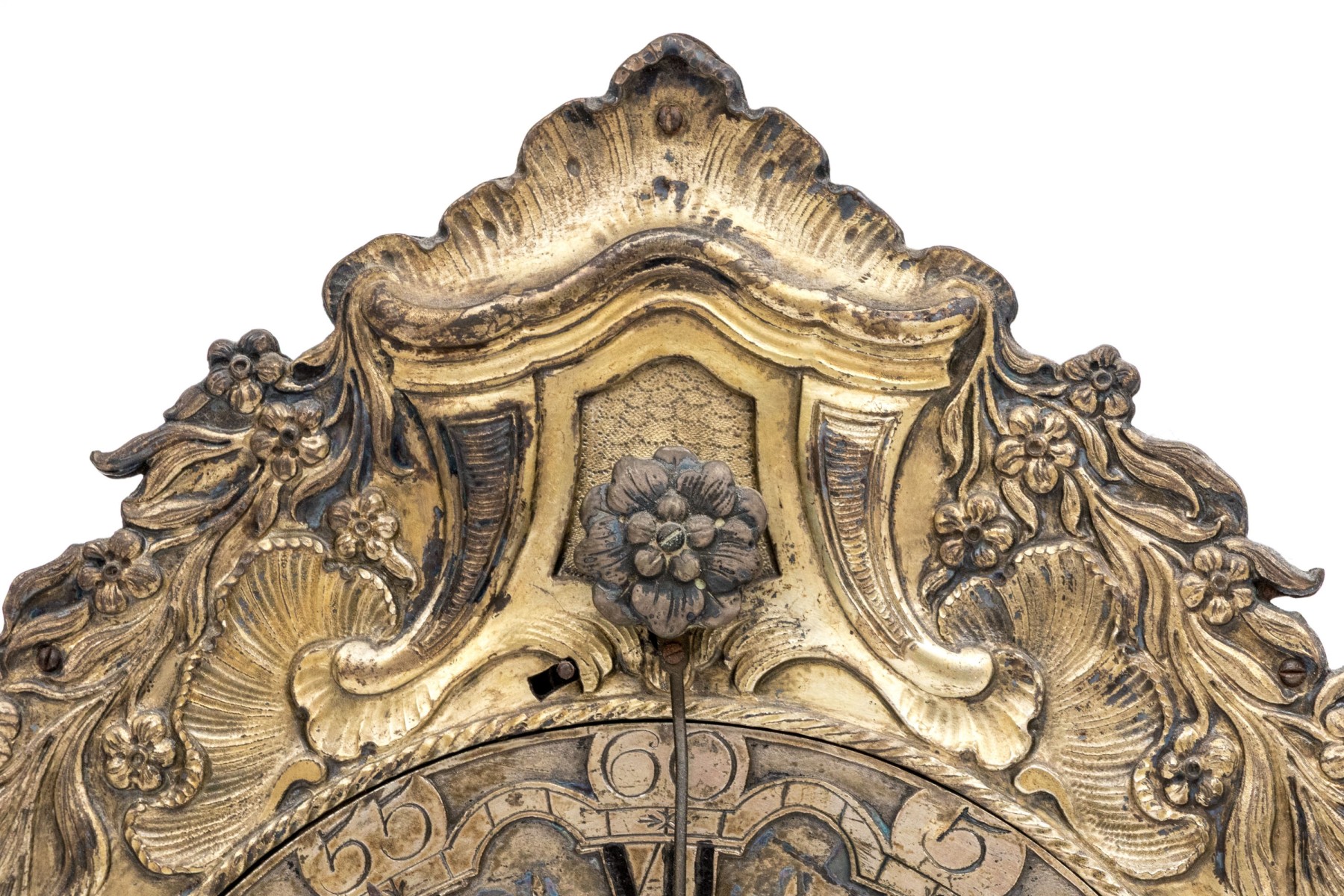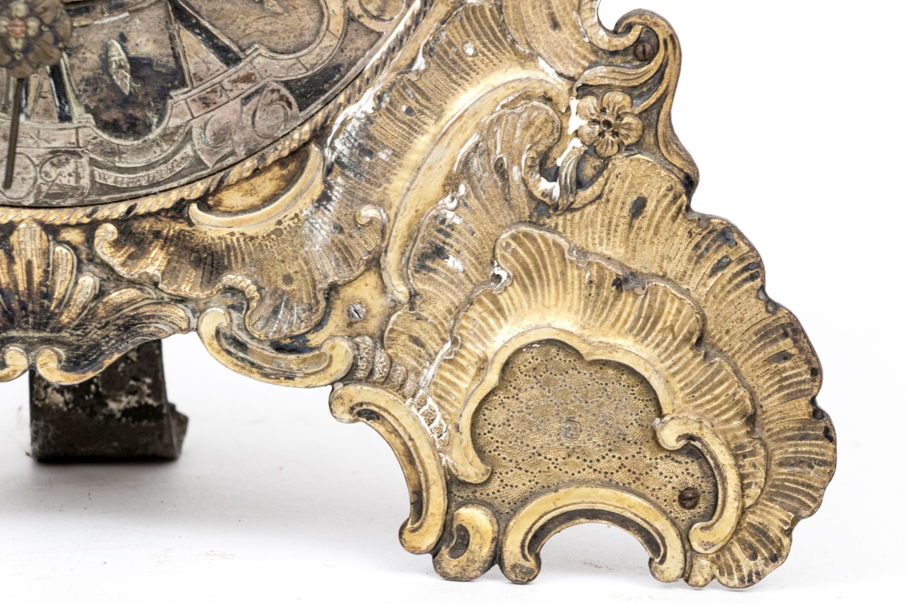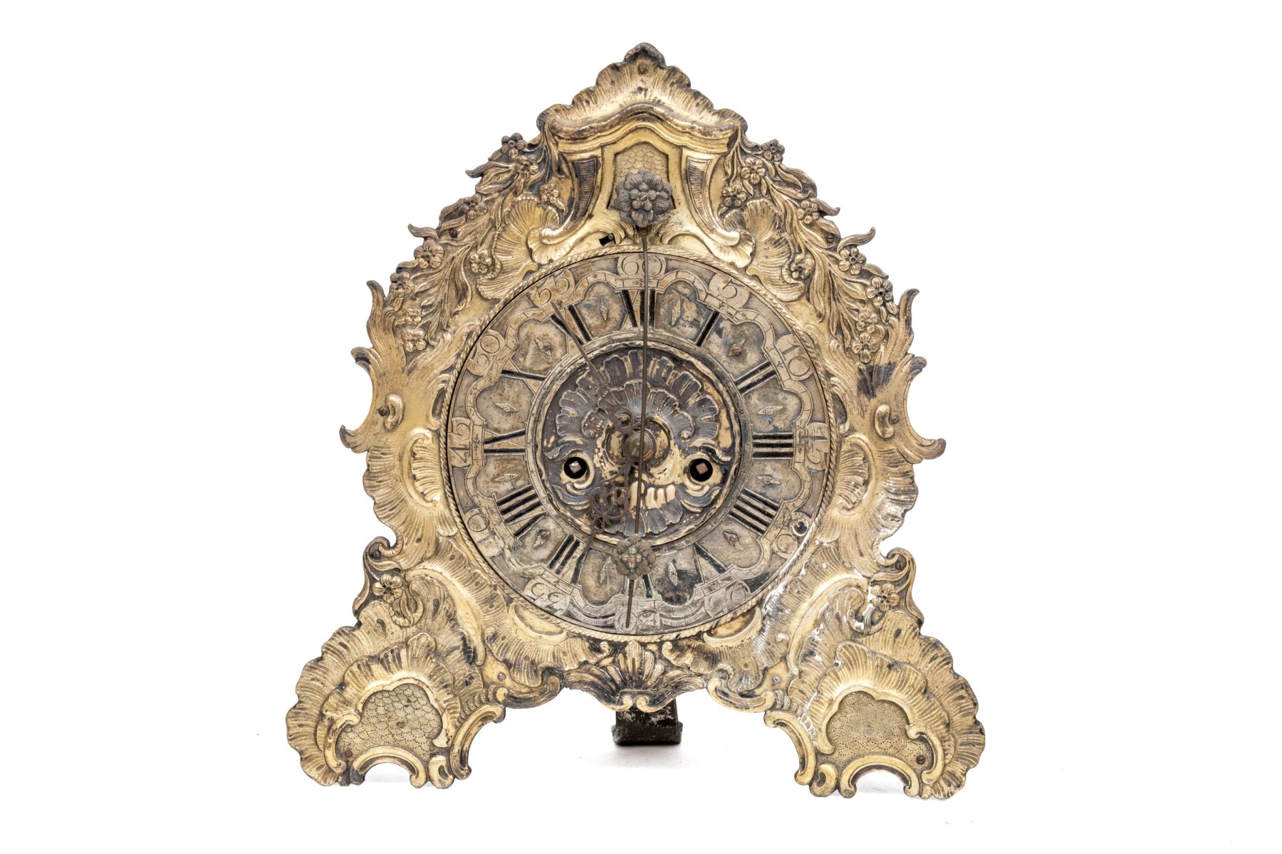 A luxurious antique brass table clock in German Rococo style, showcasing a circular dial with a floral center surrounded by black Roman numerals with fine Arabic numerals along a scalloped border. The case is elaborately designed with fanned flourishes and lush foliate garlands leading to two fanned front legs supported by a prong leg at the back.