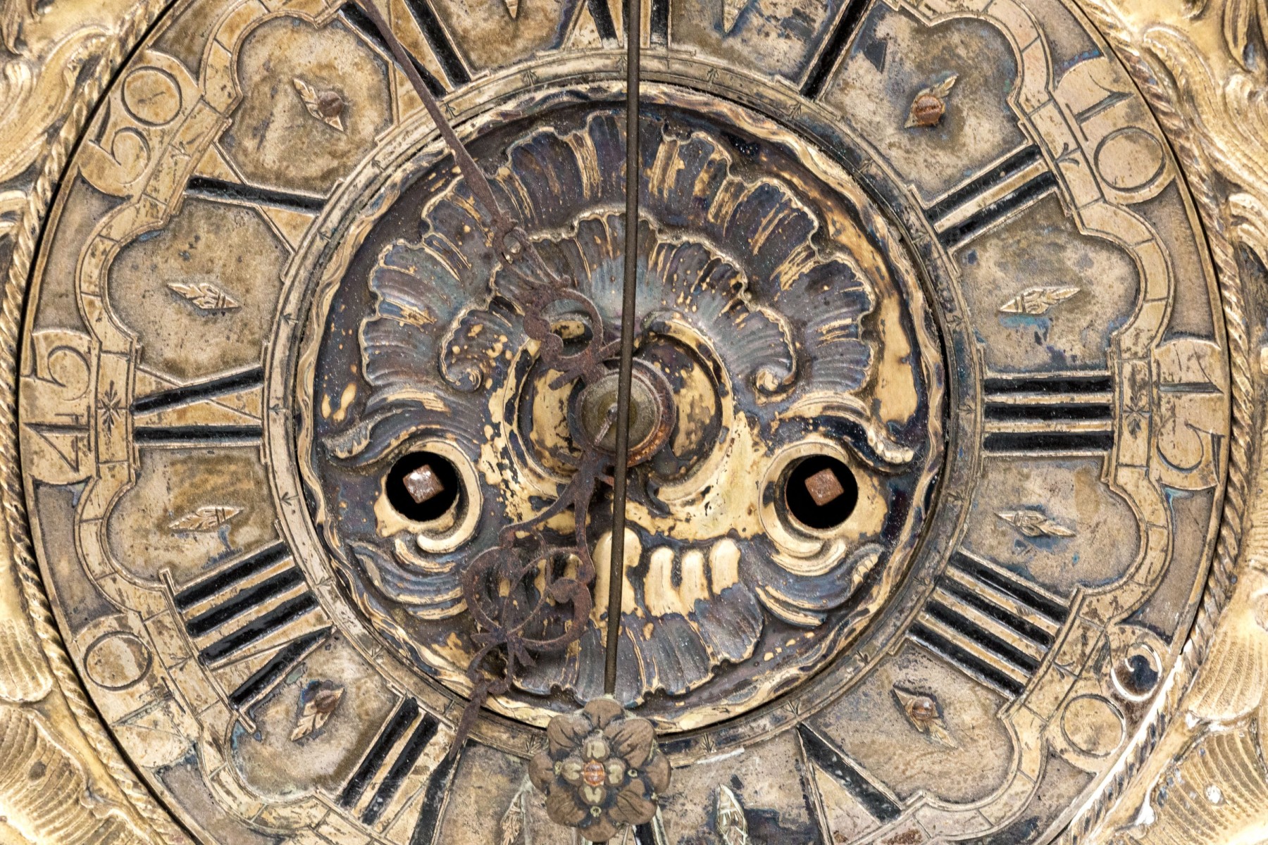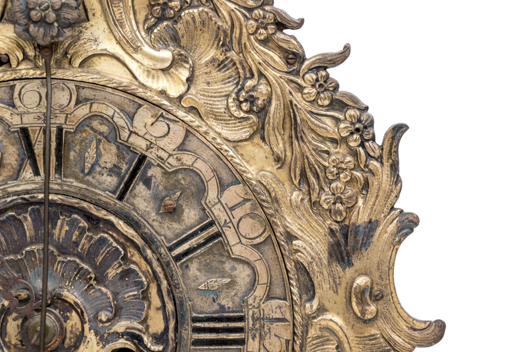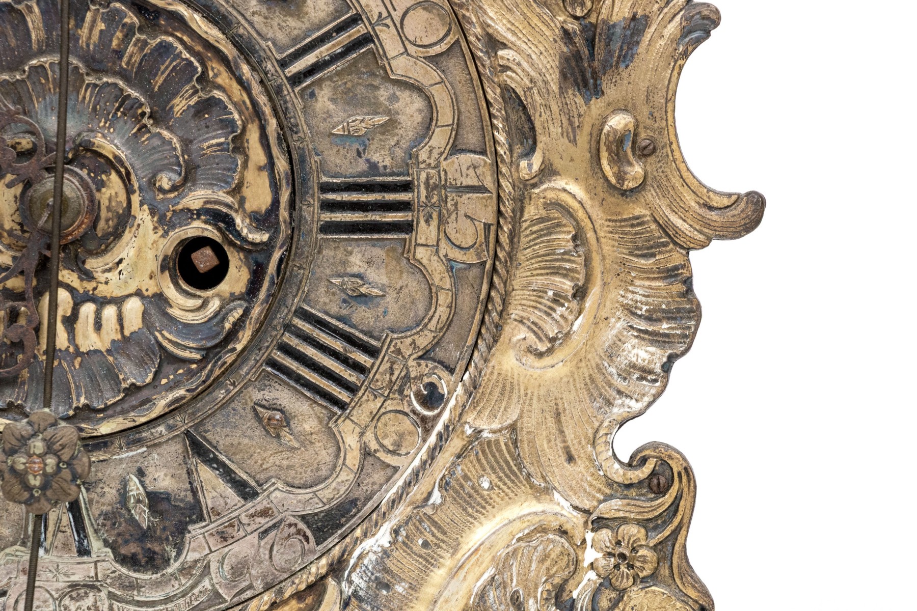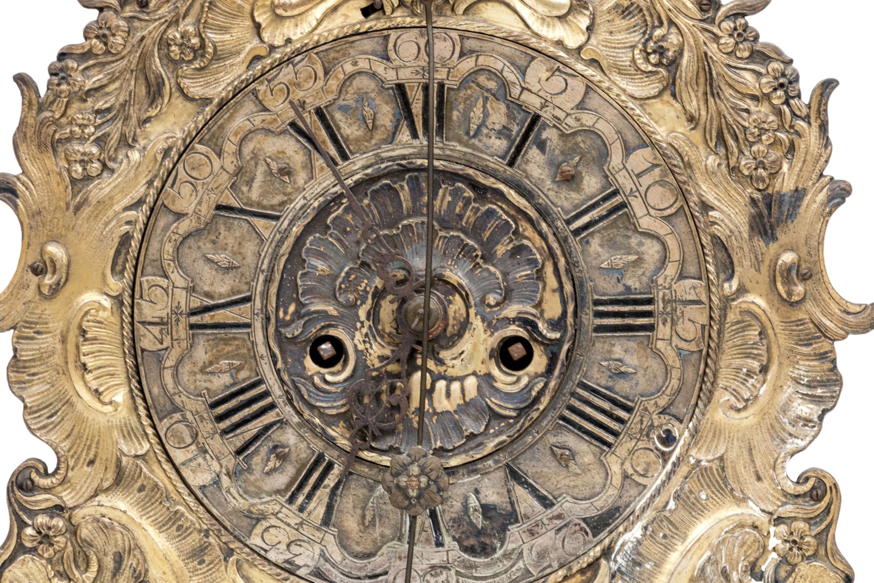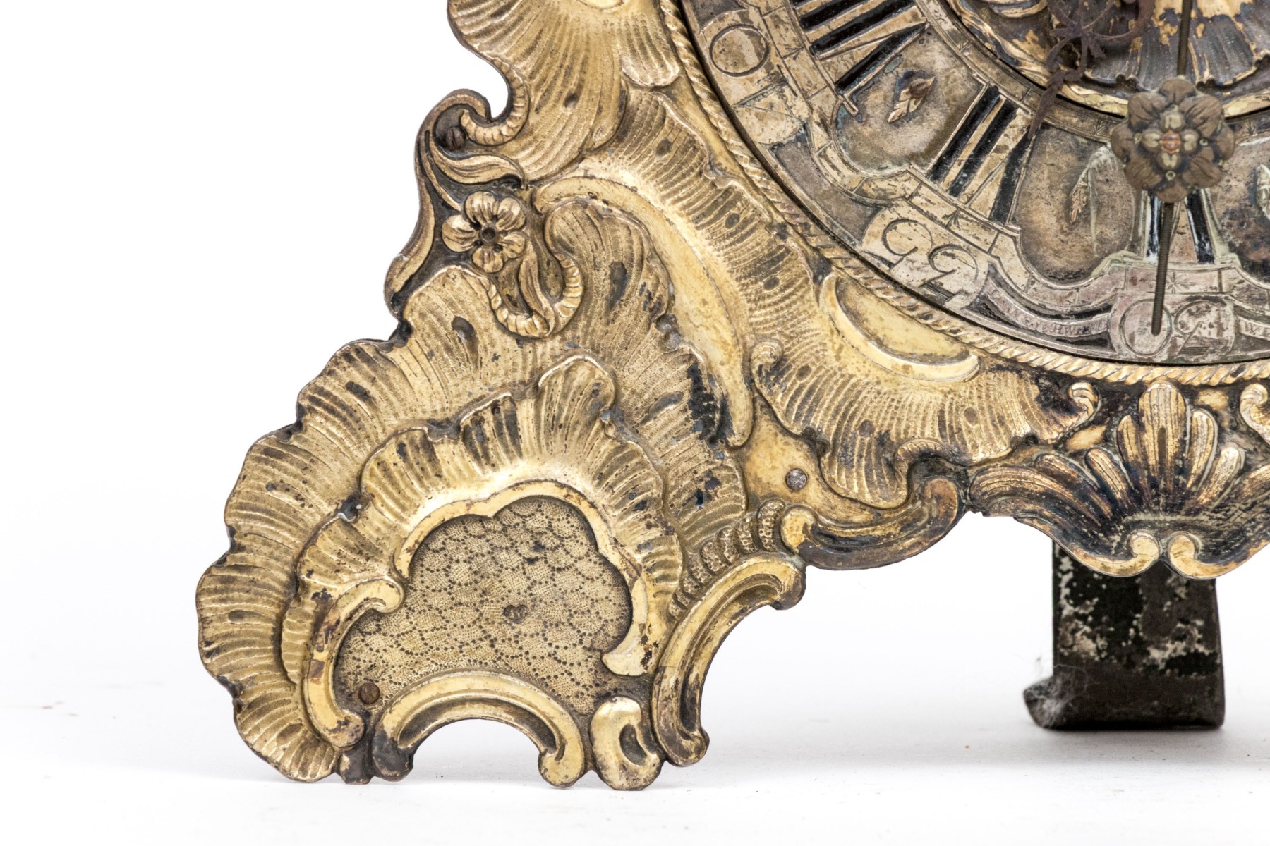 A luxurious antique brass table clock in German Rococo style, showcasing a circular dial with a floral center surrounded by black Roman numerals with fine Arabic numerals along a scalloped border. The case is elaborately designed with fanned flourishes and lush foliate garlands leading to two fanned front legs supported by a prong leg at the back.
